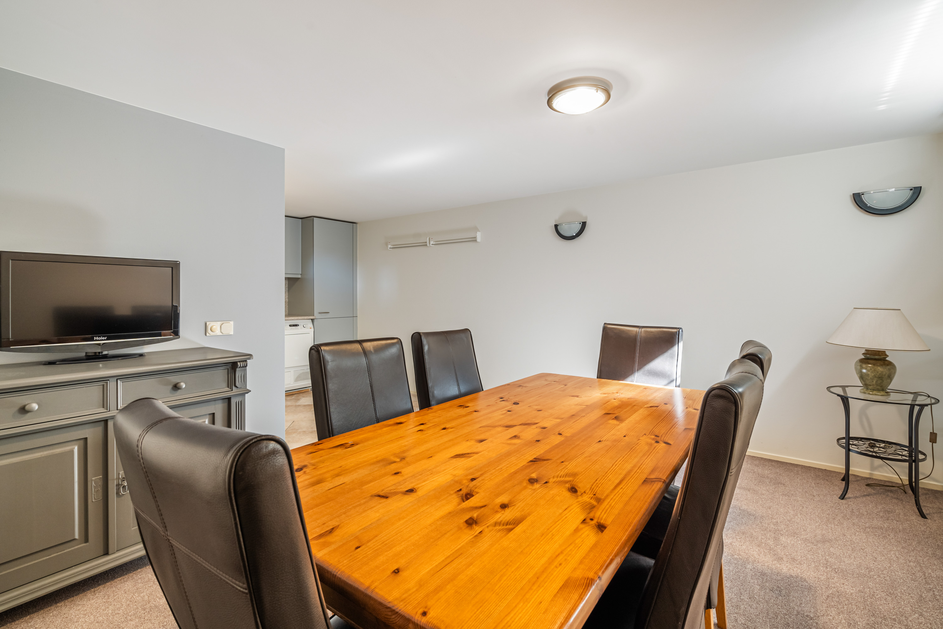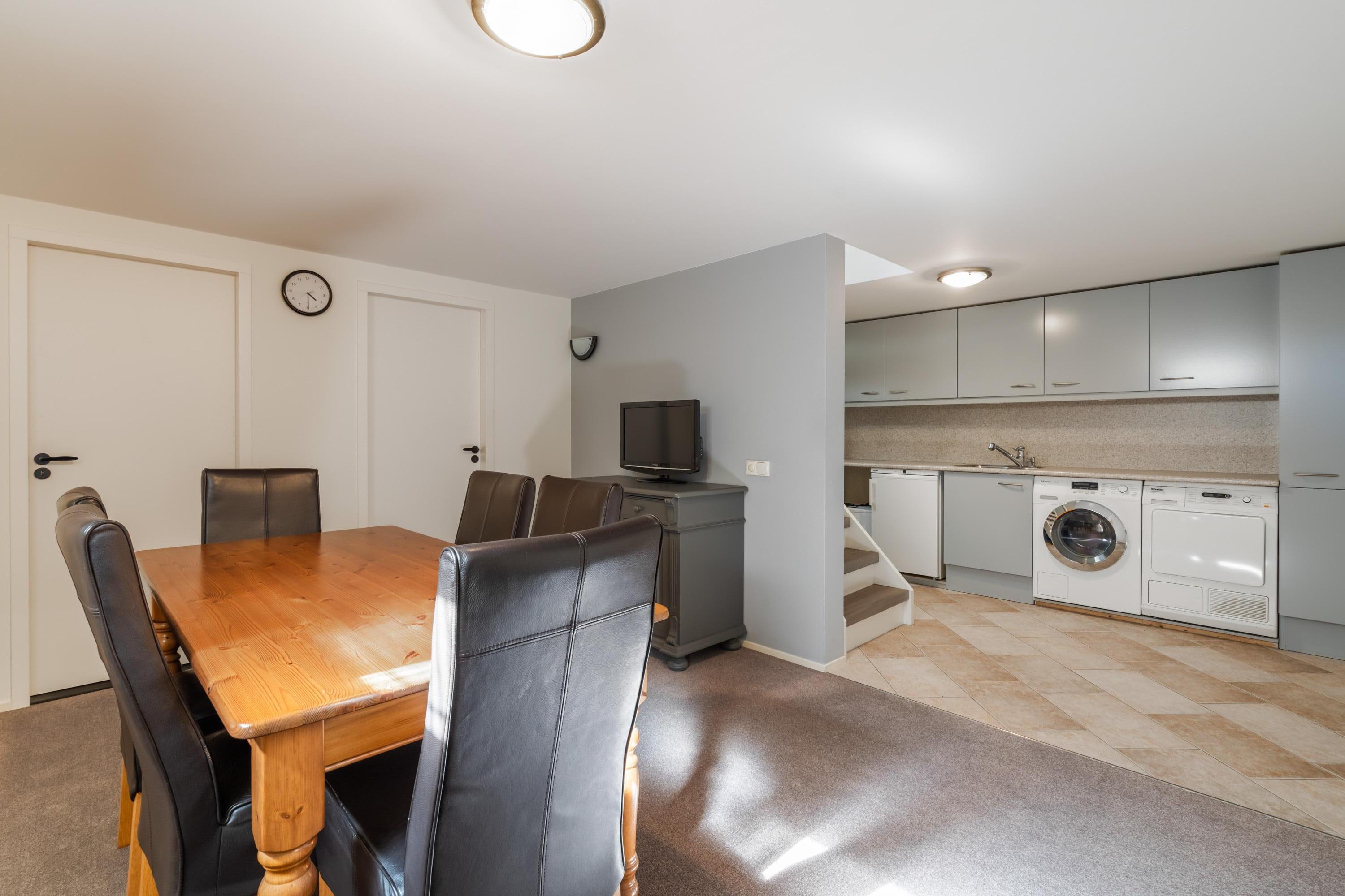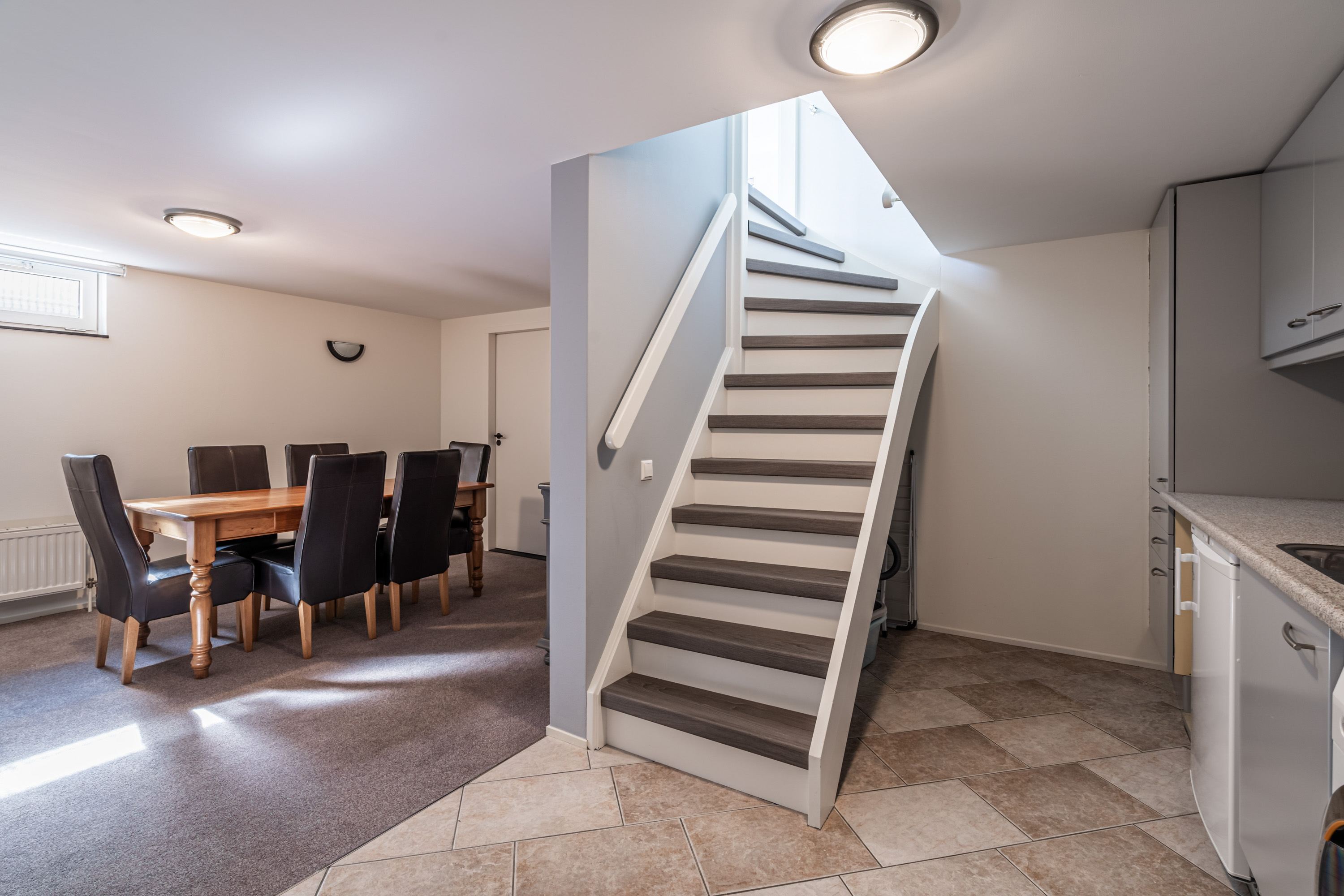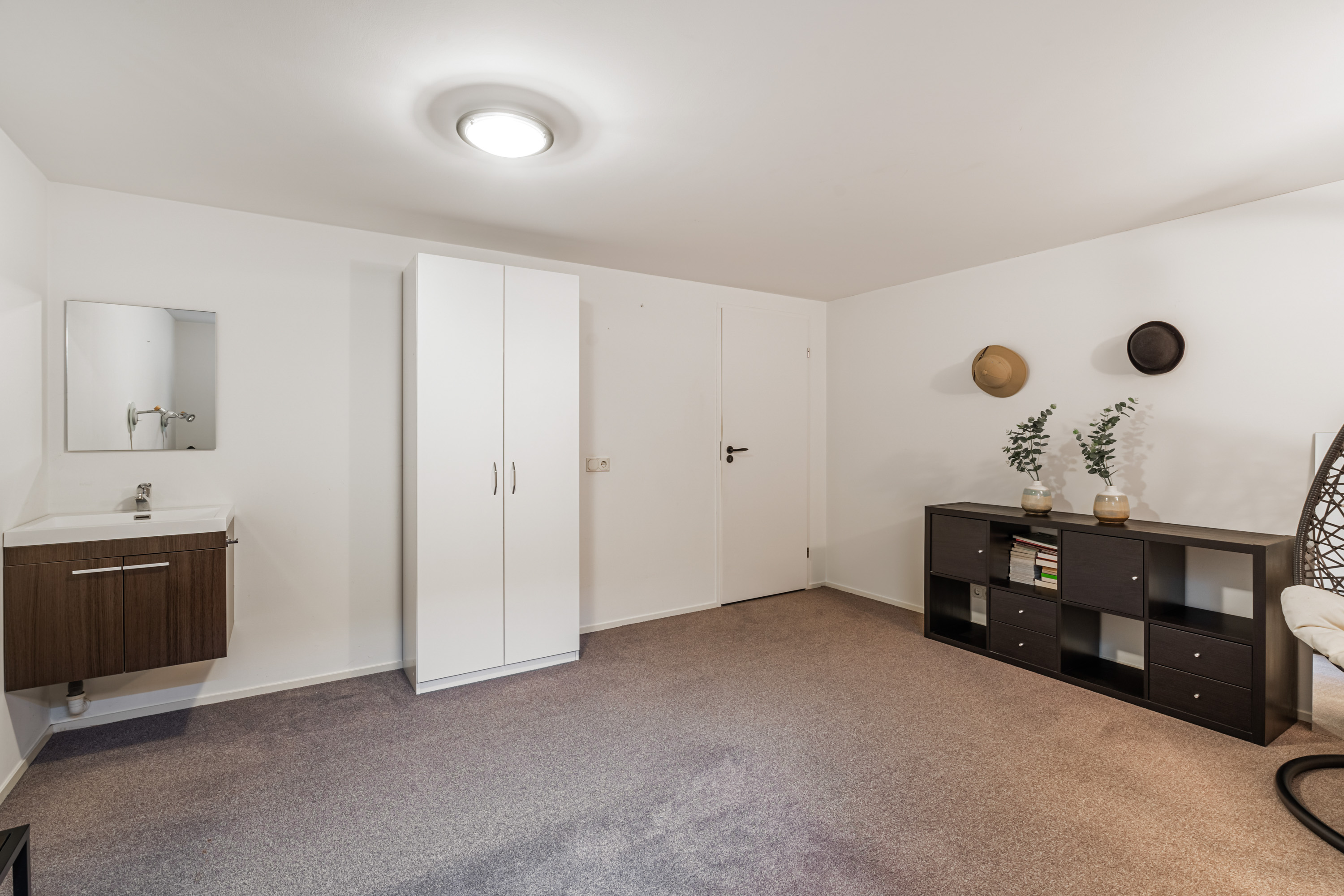 A fixed staircase (in the same style as the main stairway) leads to the basement. Here you’ll find a large laundry area with tiled floor, connections for washer and dryer, a kitchenette, and a freezer. There’s also a lounge with carpet and a spacious bedroom with washbasin, radiator, and window. This level offers many possibilities – ideal for guests, teenagers, or as a self-contained studio.
