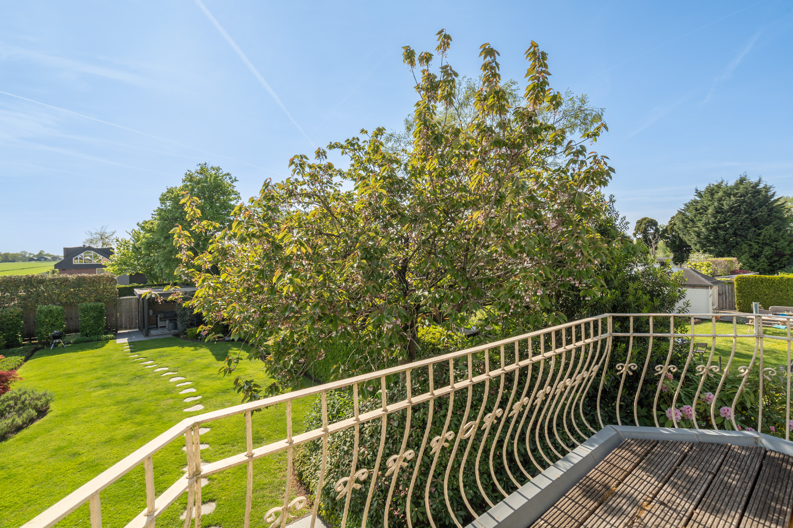 The master bedroom at the rear includes air conditioning (2021), shutters, TV connection, a walk-in closet with custom cabinetry, and access to a balcony with beautiful views over the garden.