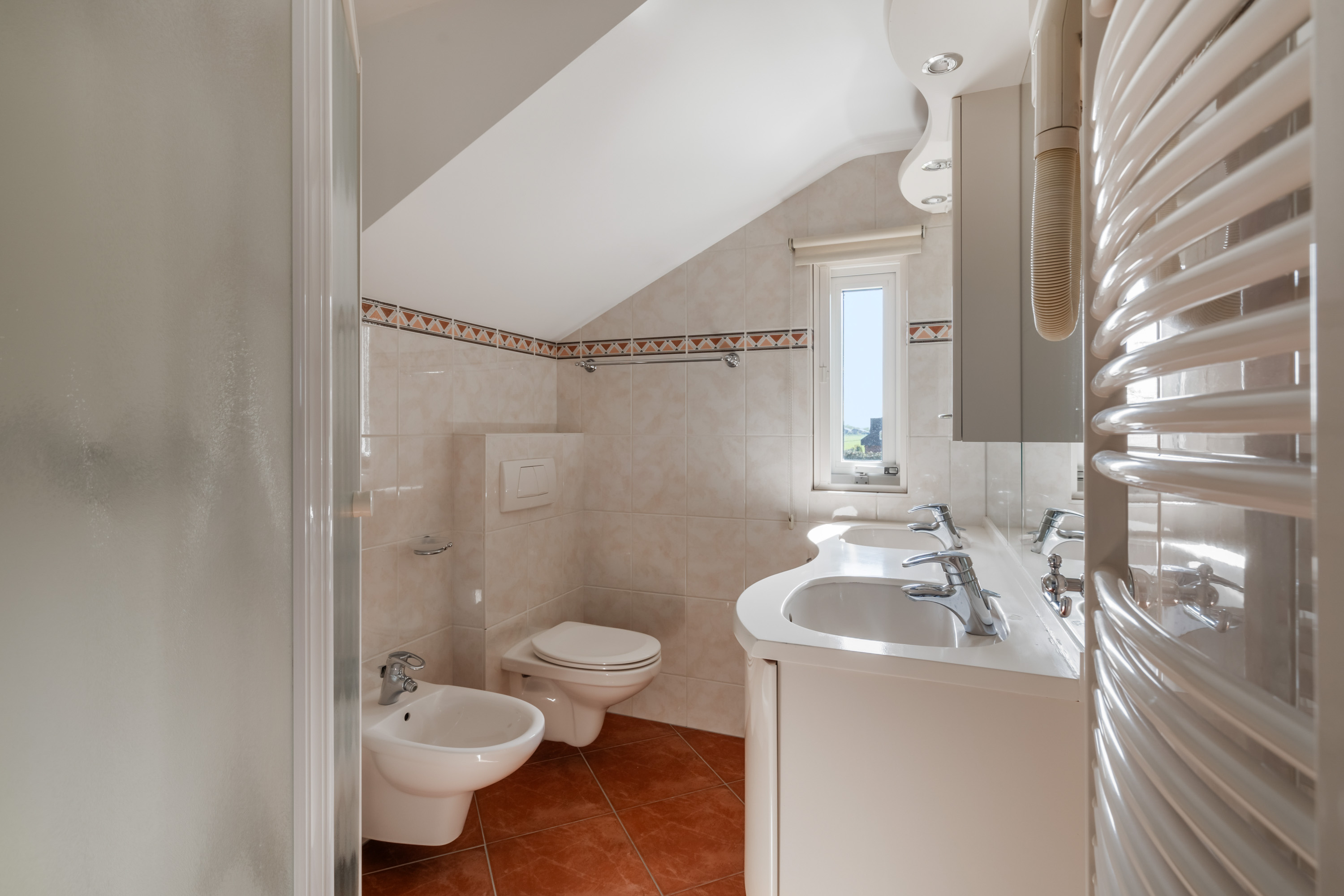 The bathroom is light and spacious and features a wall-mounted toilet, bidet, double sink with large vanity, hairdryer, shower cabin, and a window with screen. Both natural and mechanical ventilation ensure a pleasant indoor climate.
