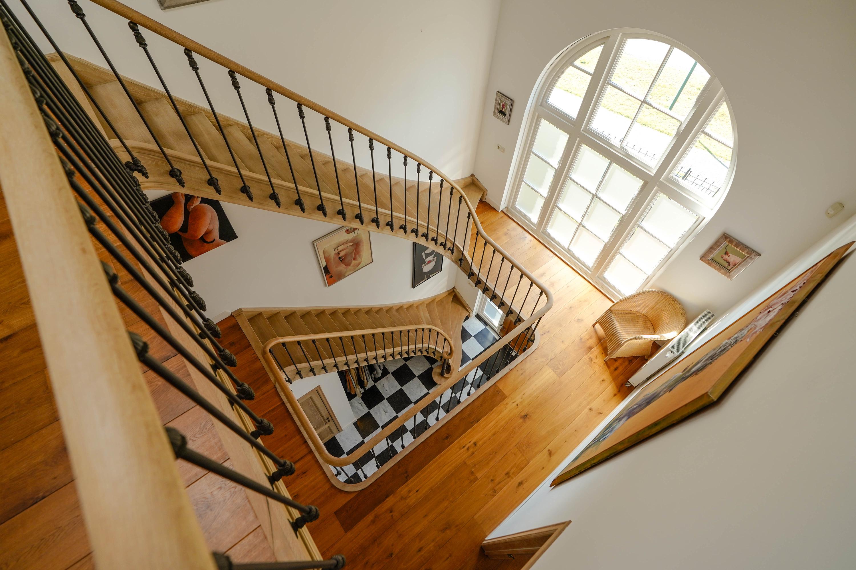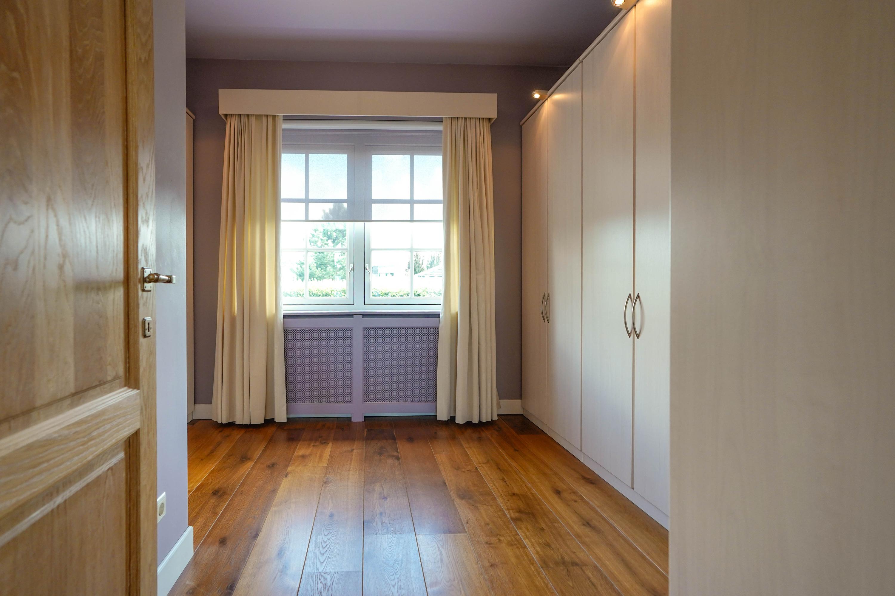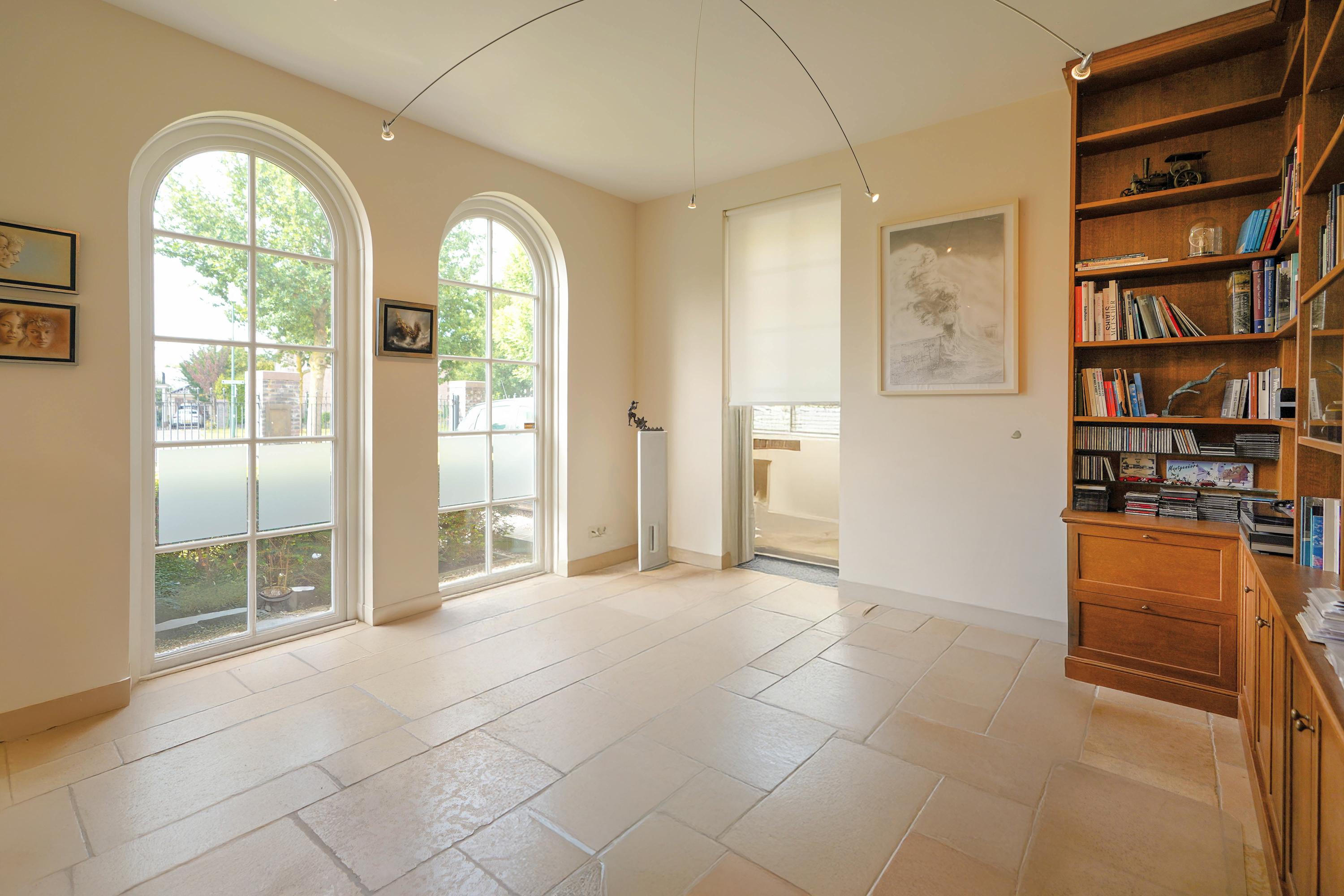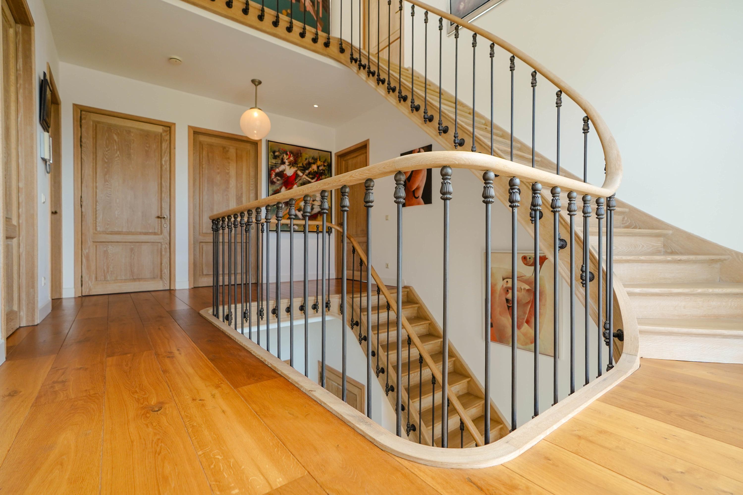 Los detalles arquitectónicos otorgan a esta villa un carácter verdaderamente distintivo: cuatro ventanales arqueados, una fachada central acristalada curva, ladrillos formados a mano y una robusta puerta principal de roble con herrajes forjados a medida. El interior está impregnado de materiales cuidadosamente seleccionados, realzados por una escalera escultórica de roble diseñada por Luc Steels, suelos macizos de madera y una transición fluida entre los espacios habitables. La luz irradia a través de tragaluces y amplias fachadas acristaladas, creando una atmósfera luminosa en toda la casa.