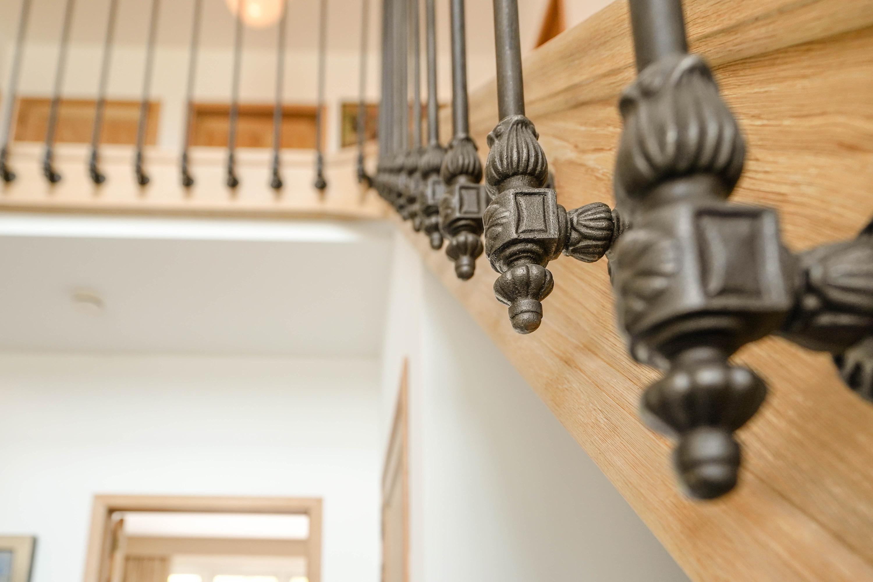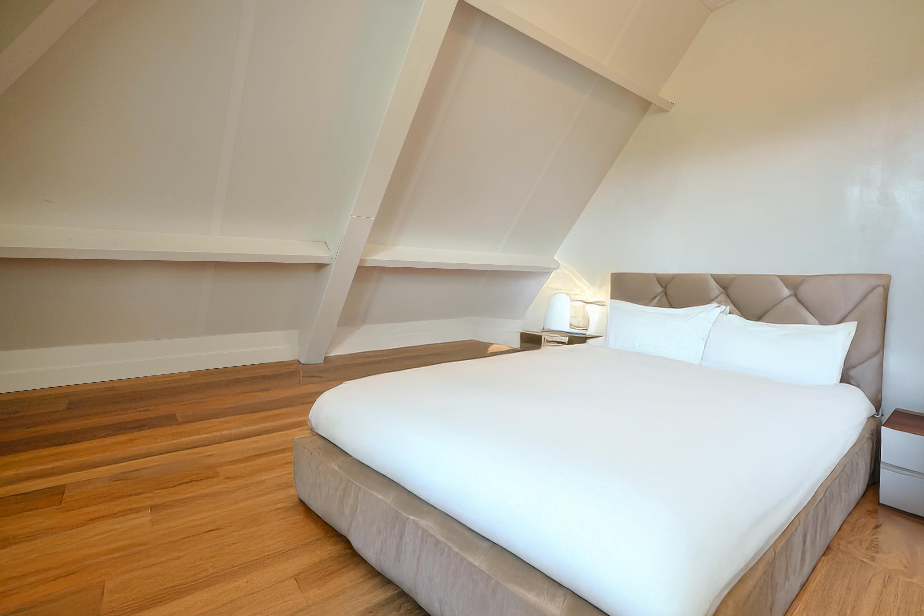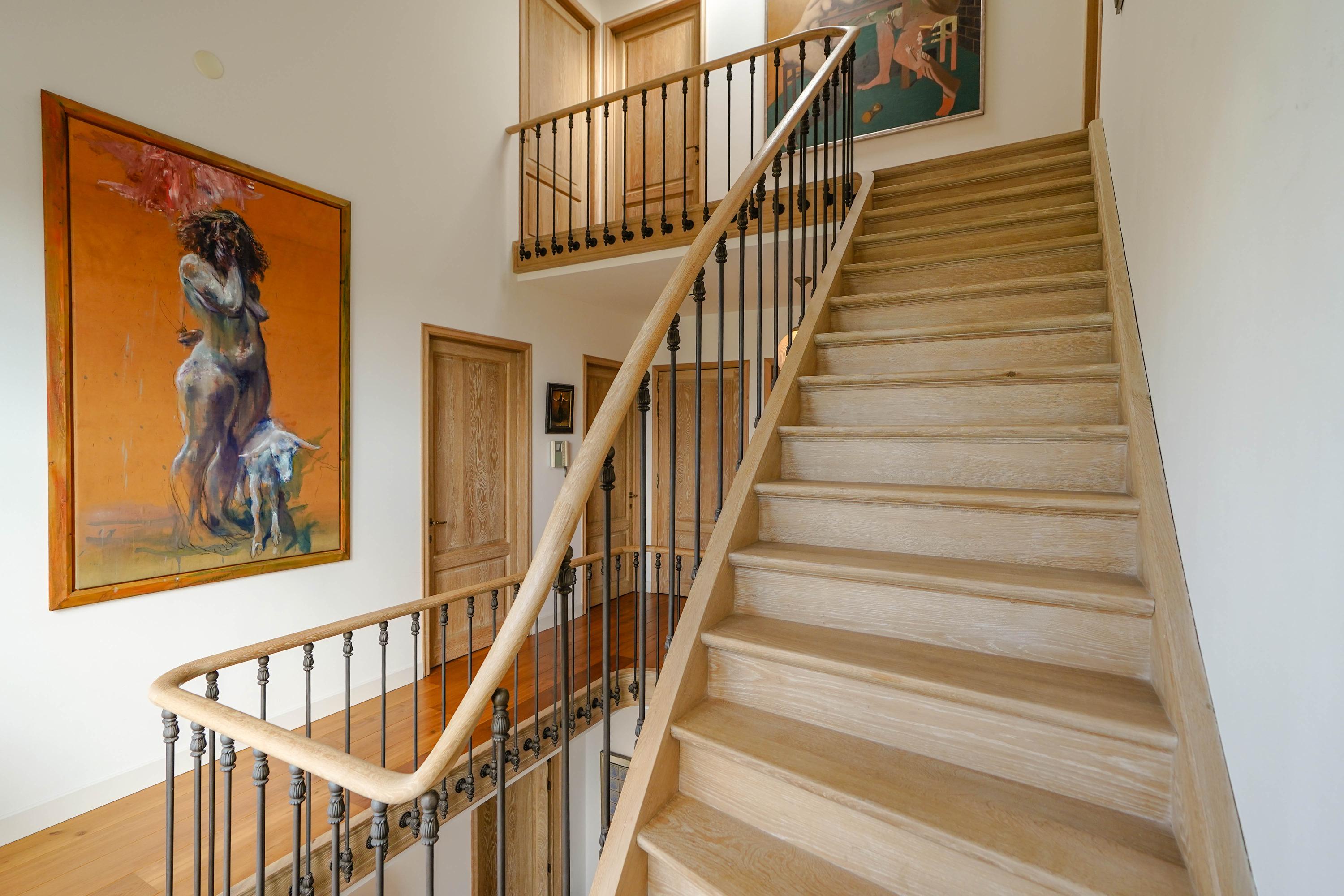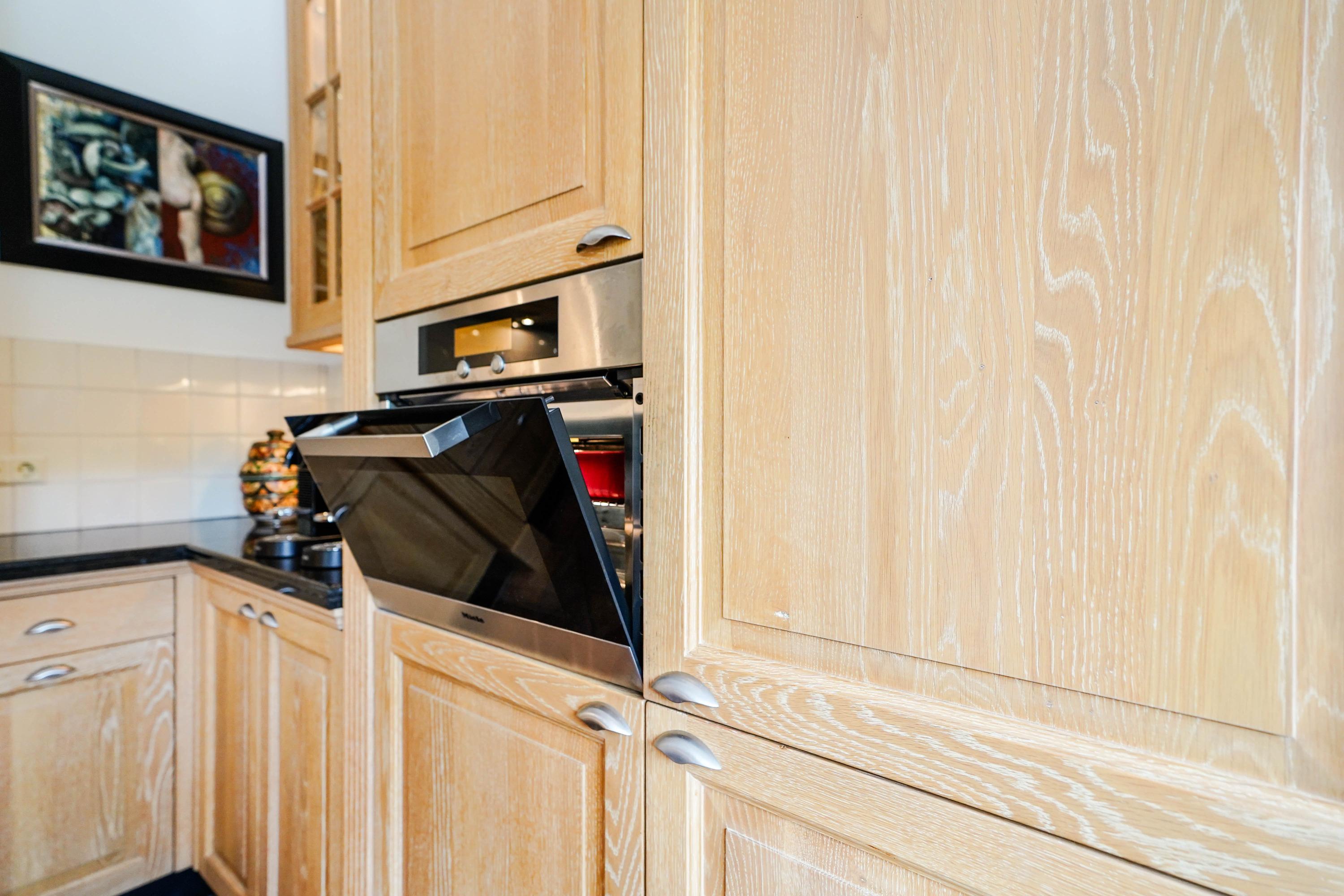 Los detalles arquitectónicos otorgan a esta villa un carácter verdaderamente distintivo: cuatro ventanales arqueados, una fachada central acristalada curva, ladrillos formados a mano y una robusta puerta principal de roble con herrajes forjados a medida. El interior está impregnado de materiales cuidadosamente seleccionados, realzados por una escalera escultórica de roble diseñada por Luc Steels, suelos macizos de madera y una transición fluida entre los espacios habitables. La luz irradia a través de tragaluces y amplias fachadas acristaladas, creando una atmósfera luminosa en toda la casa.