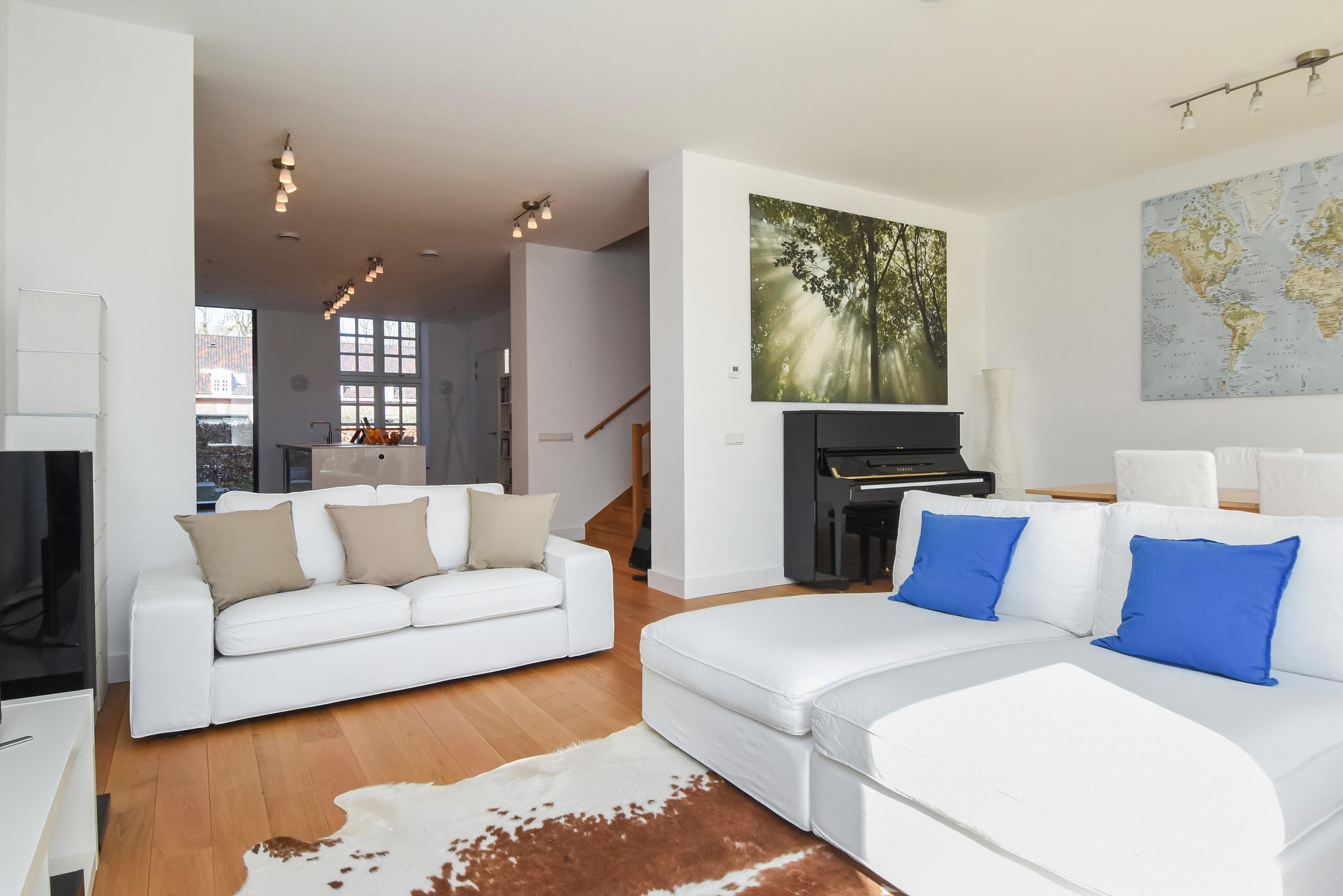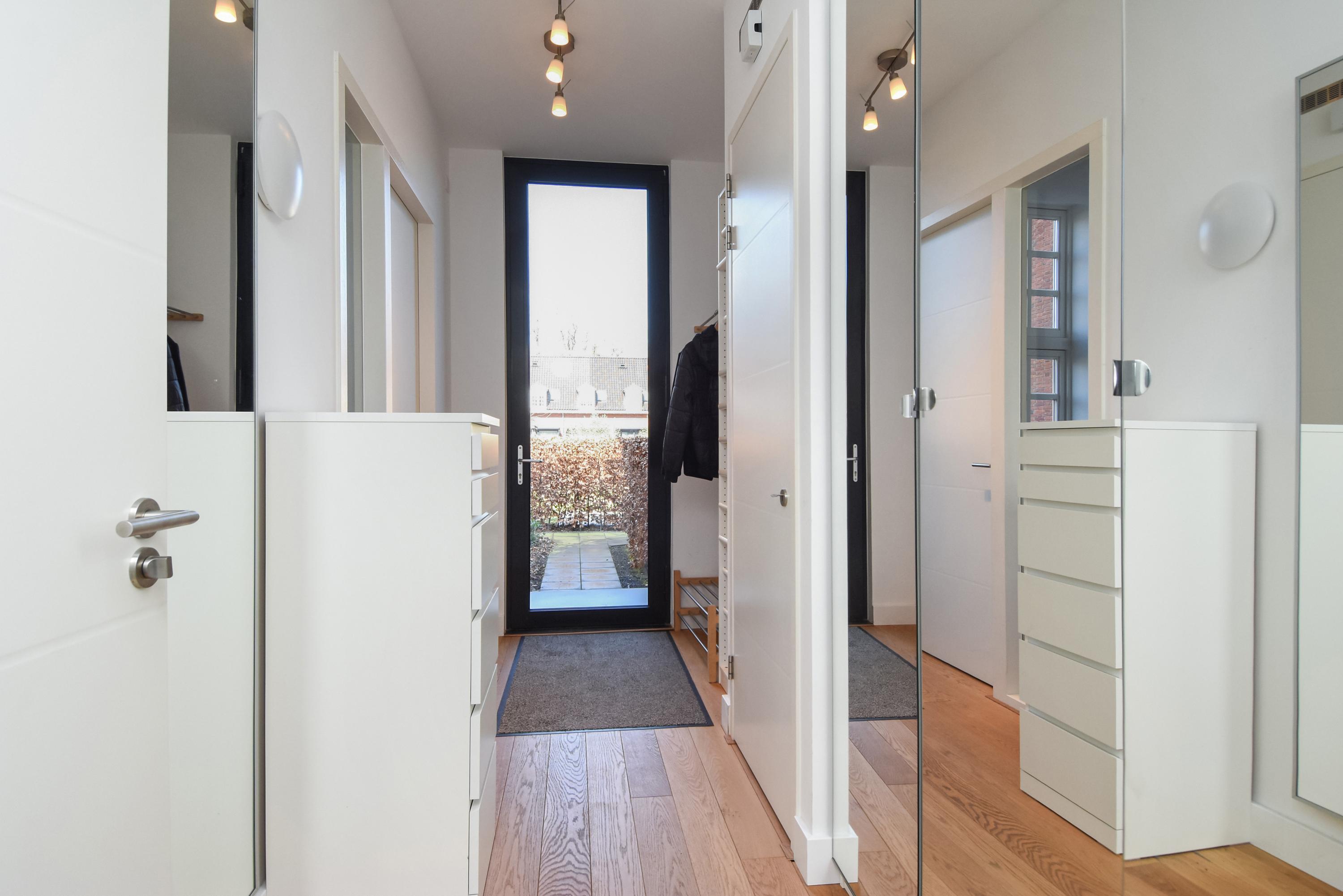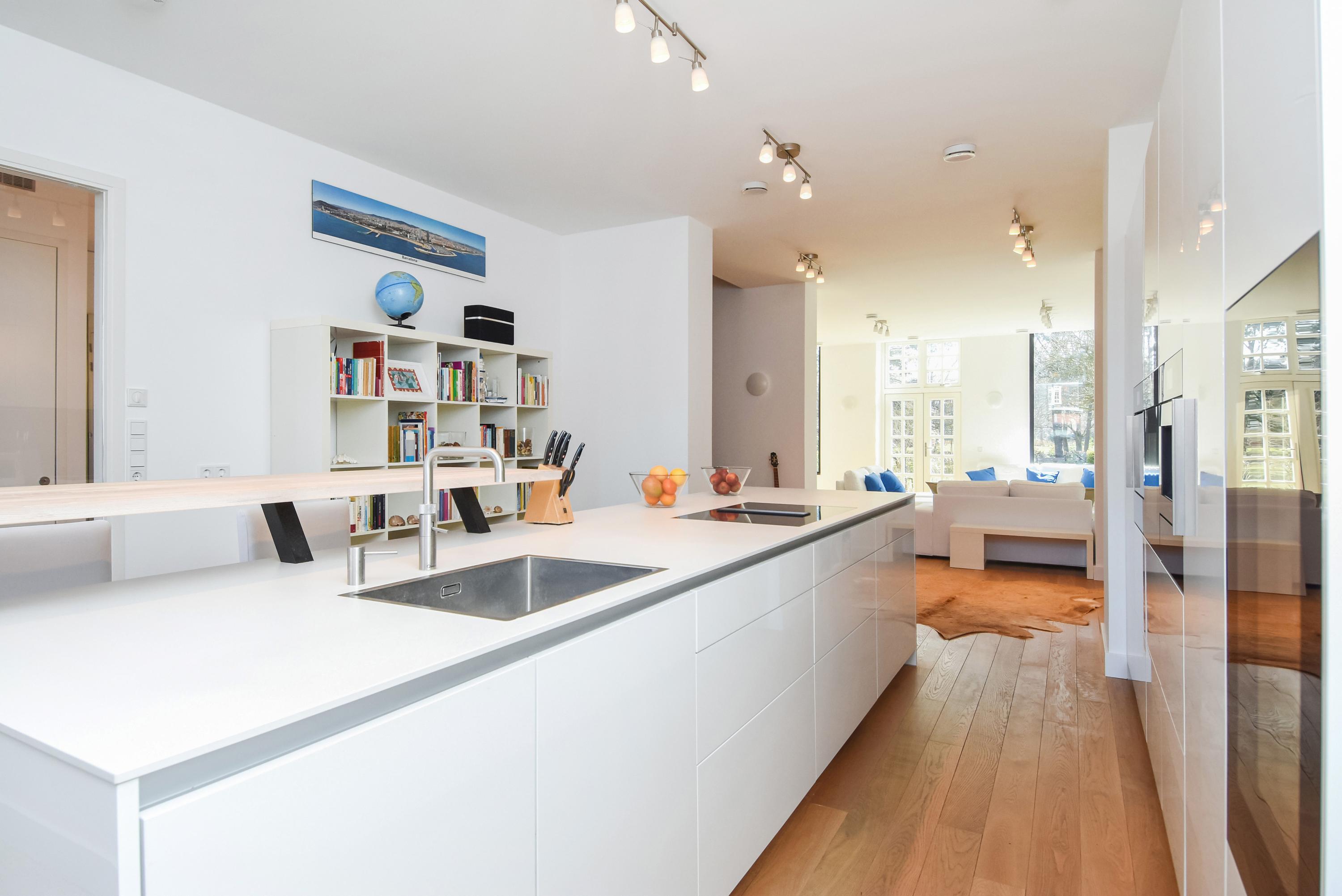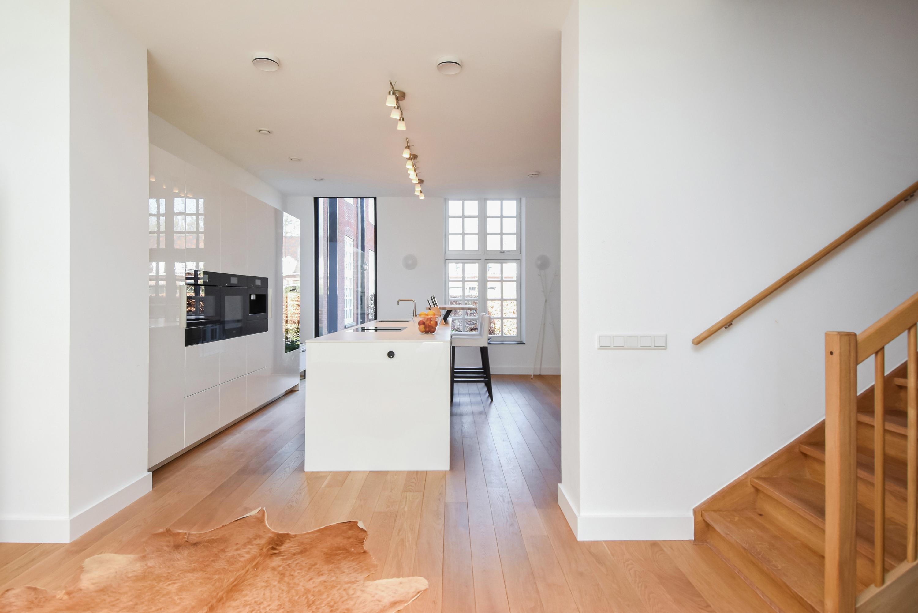 Los ventanales de suelo a techo y los altos techos crean interiores luminosos, mientras el suelo de roble macizo y la calefacción por suelo radiante aportan una comodidad sensorial. Las puertas dobles del área principal de estar se abren a un jardín orientado al sureste de aproximadamente 58 m², conectado directamente con el parque privado destinado exclusivamente a los residentes. La planta baja y el nivel superior, comunicados por una escalera fija, ofrecen amplios espacios para la vida familiar o la privacidad.