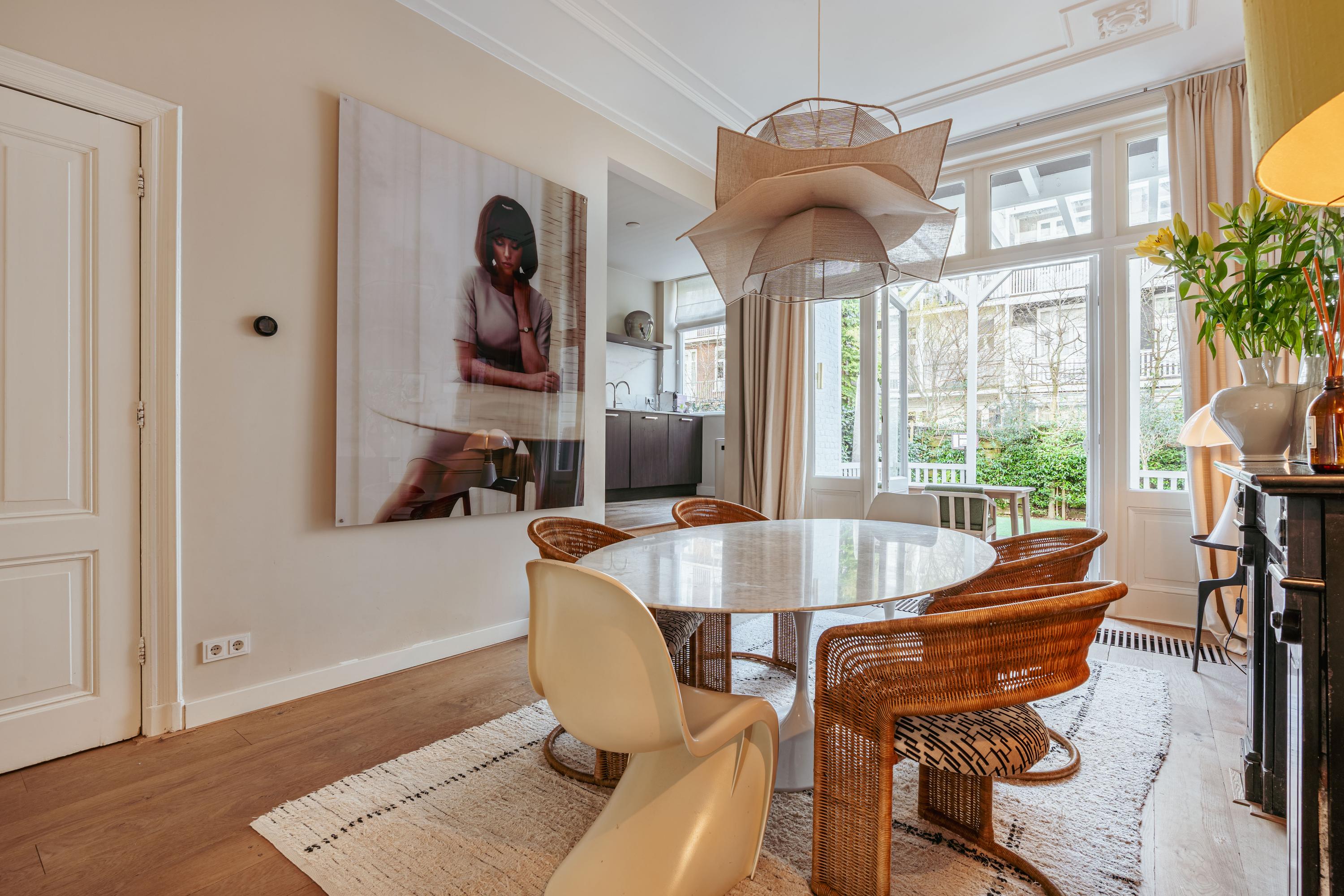 Este apartamento dúplex en planta baja en Ámsterdam combina el carácter clásico con el confort contemporáneo en el corazón de Helmersbuurt. Con una superficie de 124 m², la vivienda destaca detalles auténticos—vidrieras, molduras ornamentadas en el techo, chimeneas y paneles de madera—sin renunciar a las comodidades modernas. La generosa zona de estar y comedor en suite recibe abundante luz natural a través de grandes ventanales y puertas francesas, conectando de manera fluida con un jardín orientado al sureste de 61 m² que incluye una terraza cubierta. La cocina, abierta y elevada, aporta una sensación de amplitud y cuenta con roble oscuro, electrodomésticos integrados y acceso directo al jardín—perfecto para desayunos tranquilos o veladas llenas de ambiente.