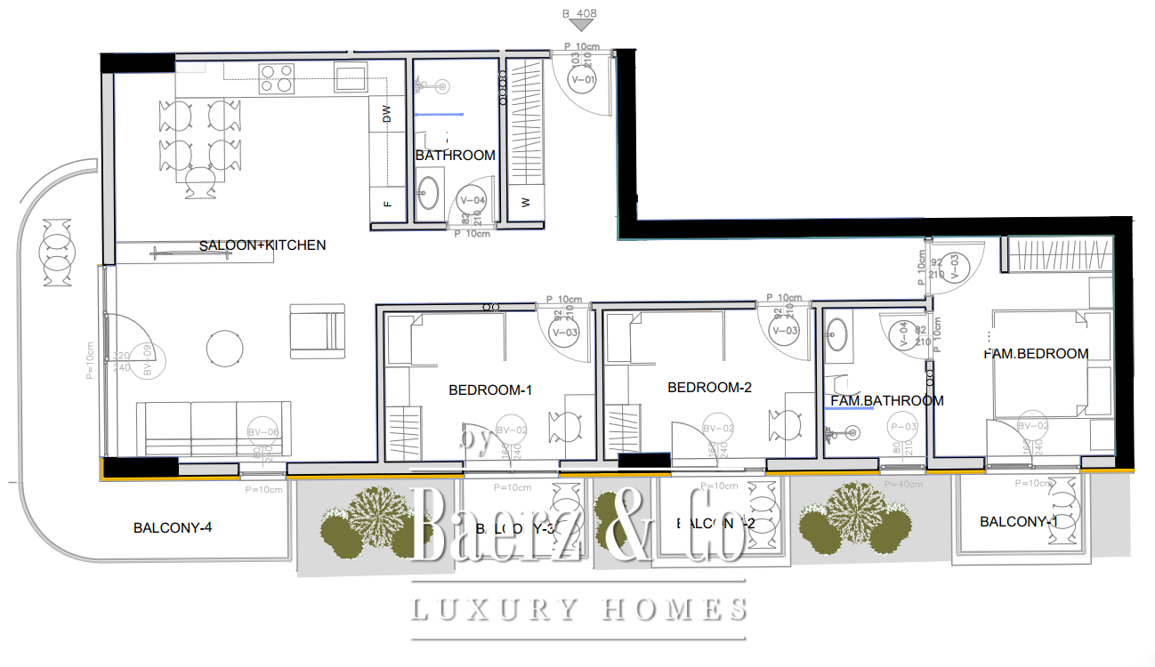 El apartamento dispone de 99 m² de espacios habitables, cuidadosamente distribuidos en vestíbulo, amplio salón, cocina con comedor, tres dormitorios y dos baños. Cuatro terrazas permiten contemplar tanto la línea del mar como las montañas circundantes. Los suelos y azulejos se terminarán con altos estándares, los baños estarán completamente equipados y el clima interior se controlará mediante aire acondicionado. El edificio, con sus diez plantas, ofrece a sus residentes piscina exterior, spa exclusivo y gimnasio, todo conectado por un vial asfaltado y bien cuidado que enlaza con la vía principal.