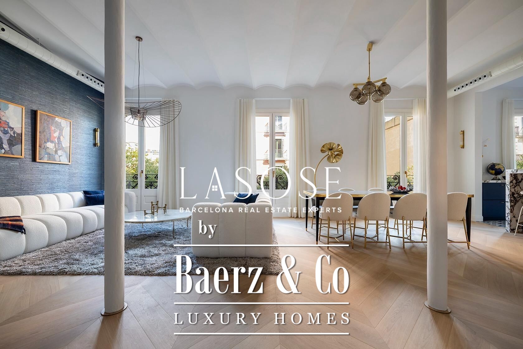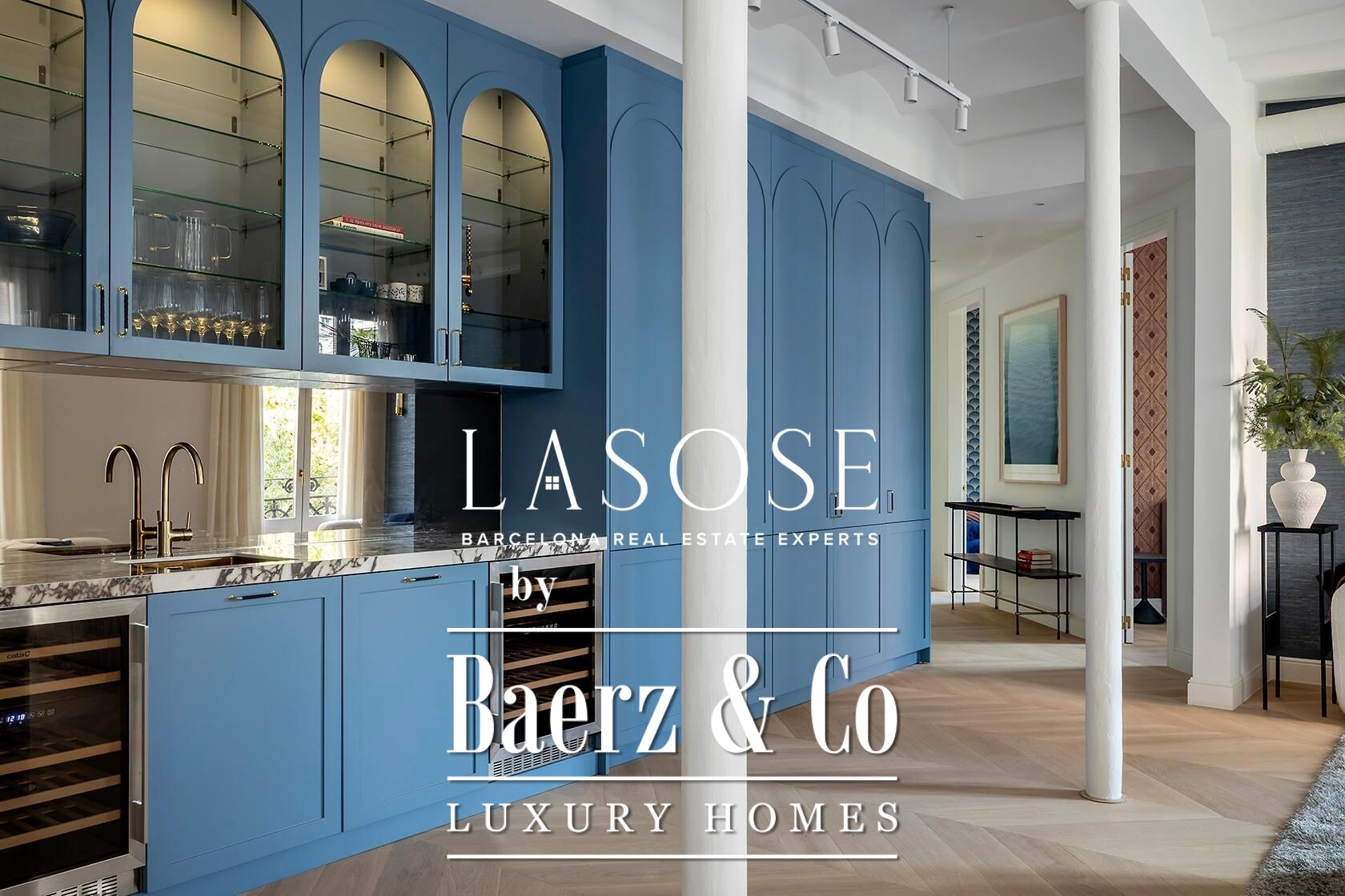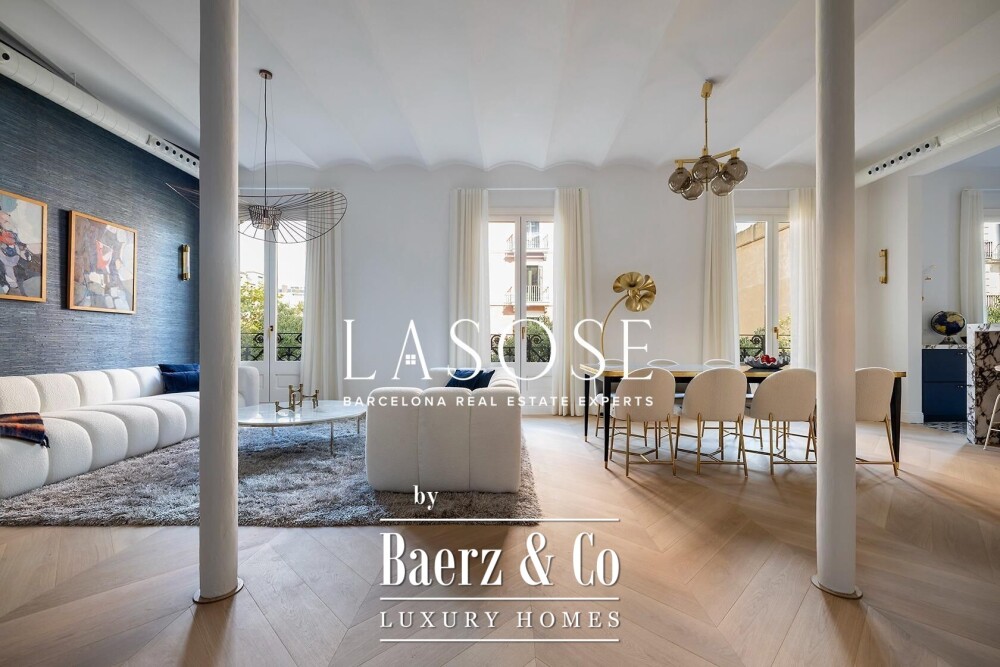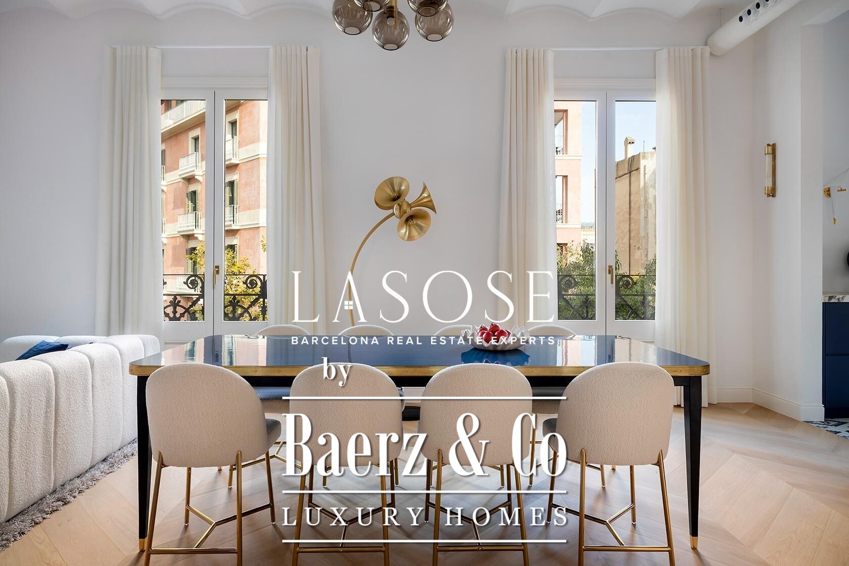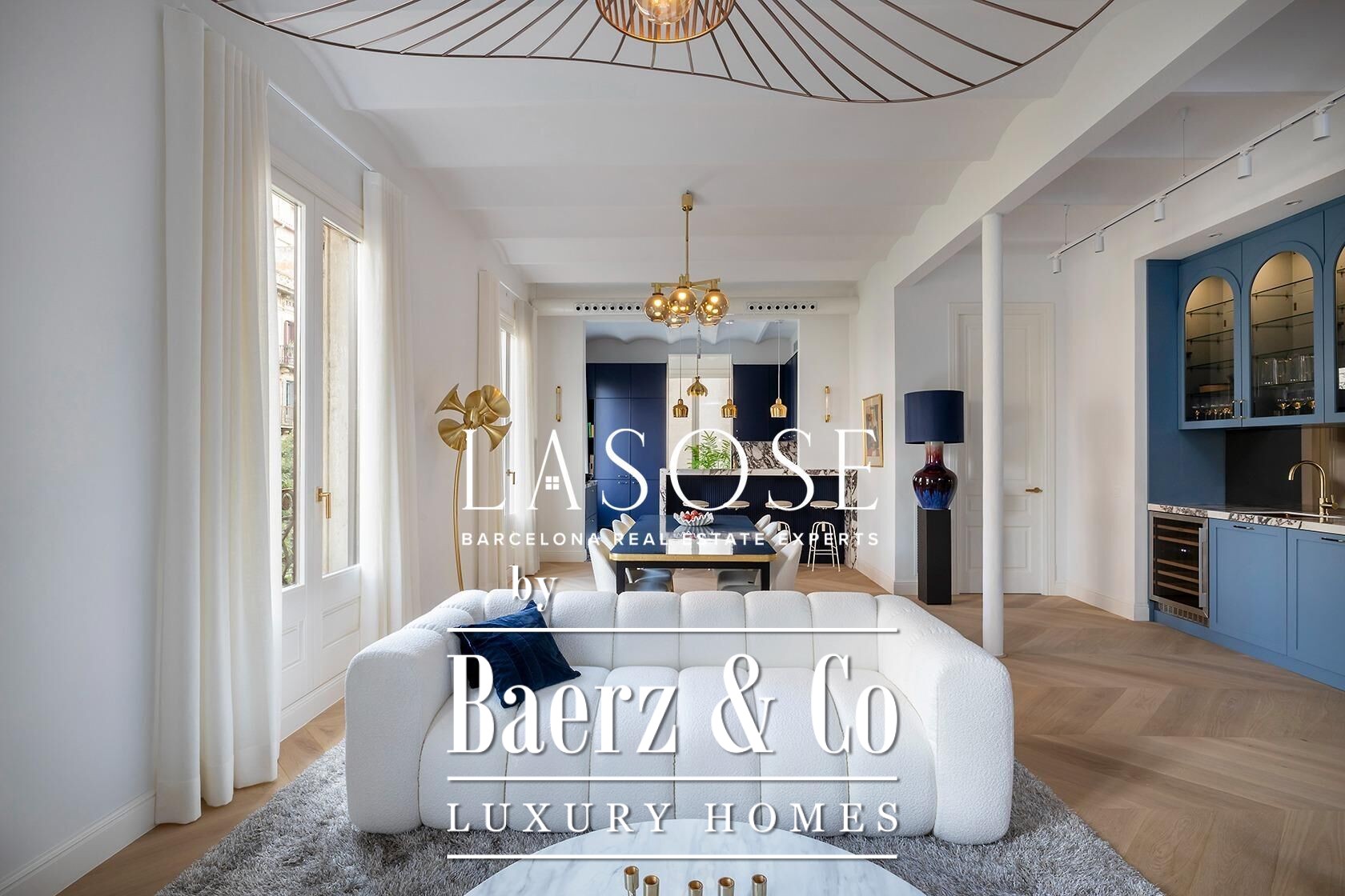 Apartamento Barcelona representa una invitación a la vida urbana refinada. Esta residencia de 199 m², situada en la tercera planta, ha sido recientemente renovada y cuidadosamente diseñada para aprovechar la luz natural; cuenta con cuatro puertas de balcón que se abren sobre la Calle Girona y grandes ventanales que realzan la atmósfera luminosa. La distribución fluye de manera armónica desde la cocina de concepto abierto y el comedor hasta un salón realzado por una barra a medida y una despensa con dos vinotecas y un segundo lavavajillas.