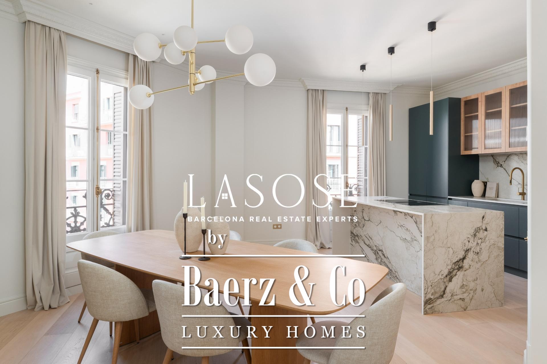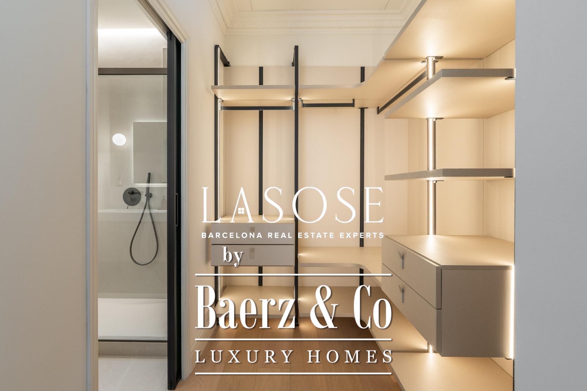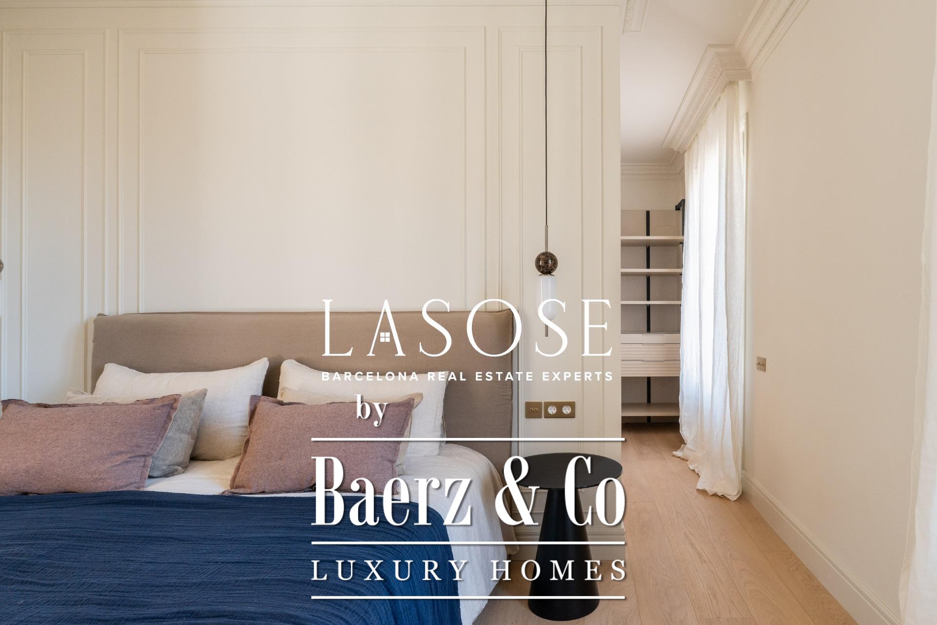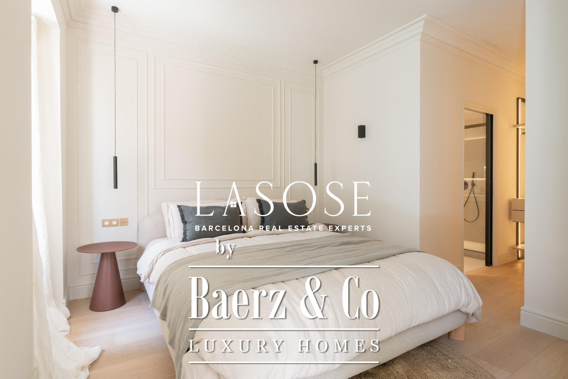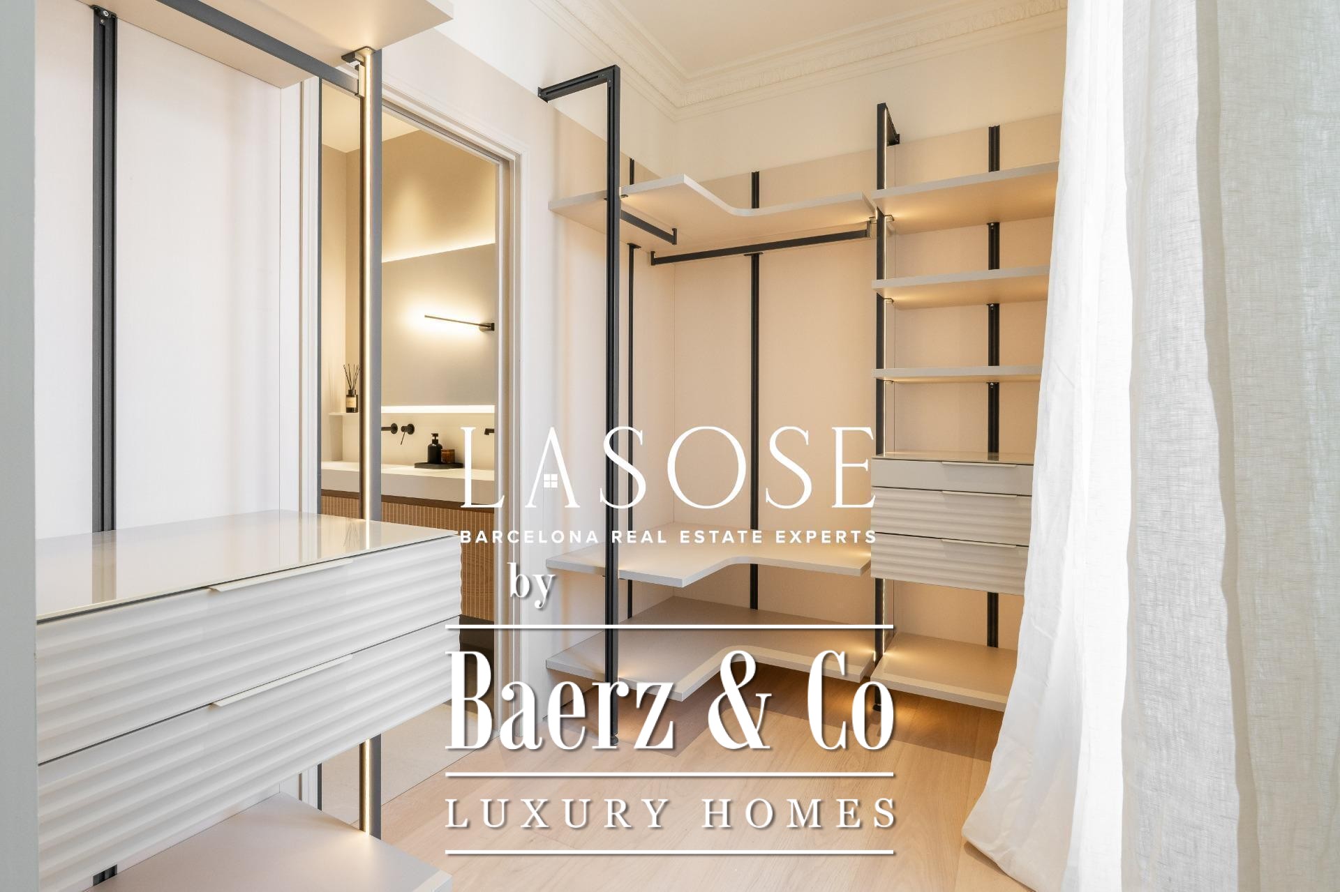 El ático ha sido completamente renovado con materiales de alta gama, conservando elementos originales como los suelos hidráulicos y la carpintería de madera. El interior alberga tres dormitorios dobles (dos de ellos en suite) y tres baños completos. La amplia zona de salón-comedor se define por una cocina de diseño abierta con isla central, electrodomésticos Miele y Liebherr, encimeras Neolith y mobiliario lacado. Balcones, trastero y un espacio de lavandería independiente optimizan la vida diaria. El edificio dispone de ascensor y servicio de conserjería, reafirmando su compromiso con el confort y la seguridad.