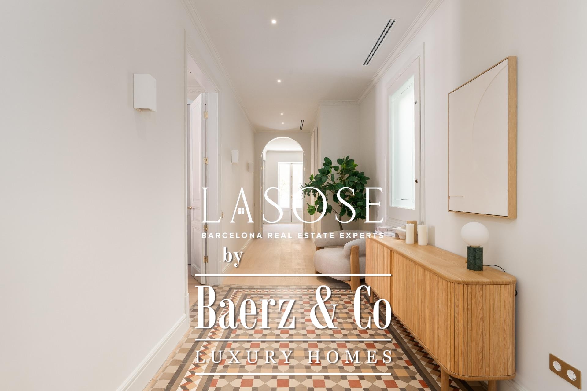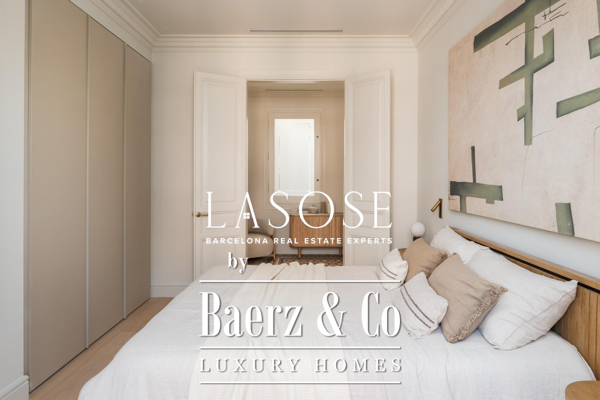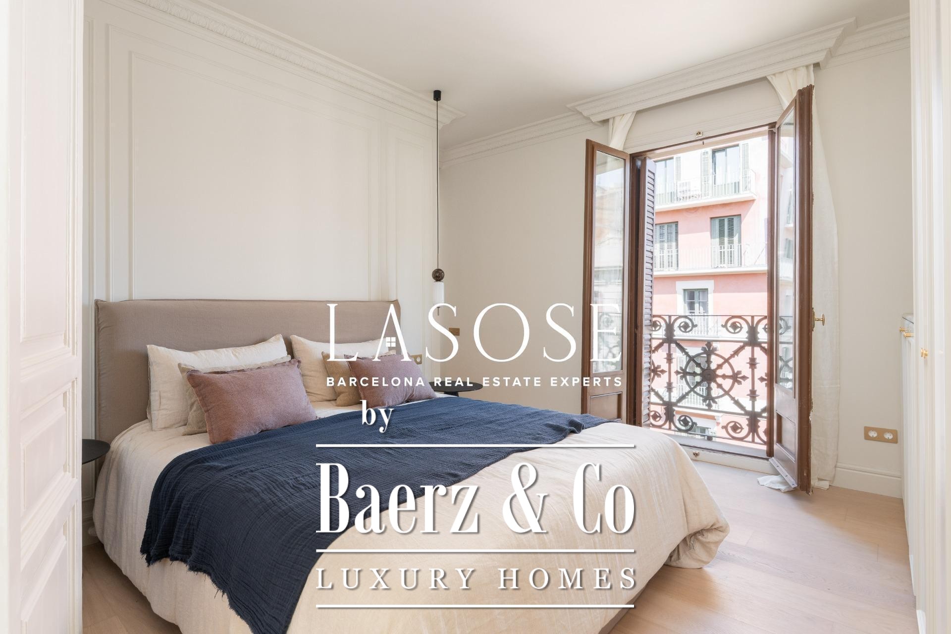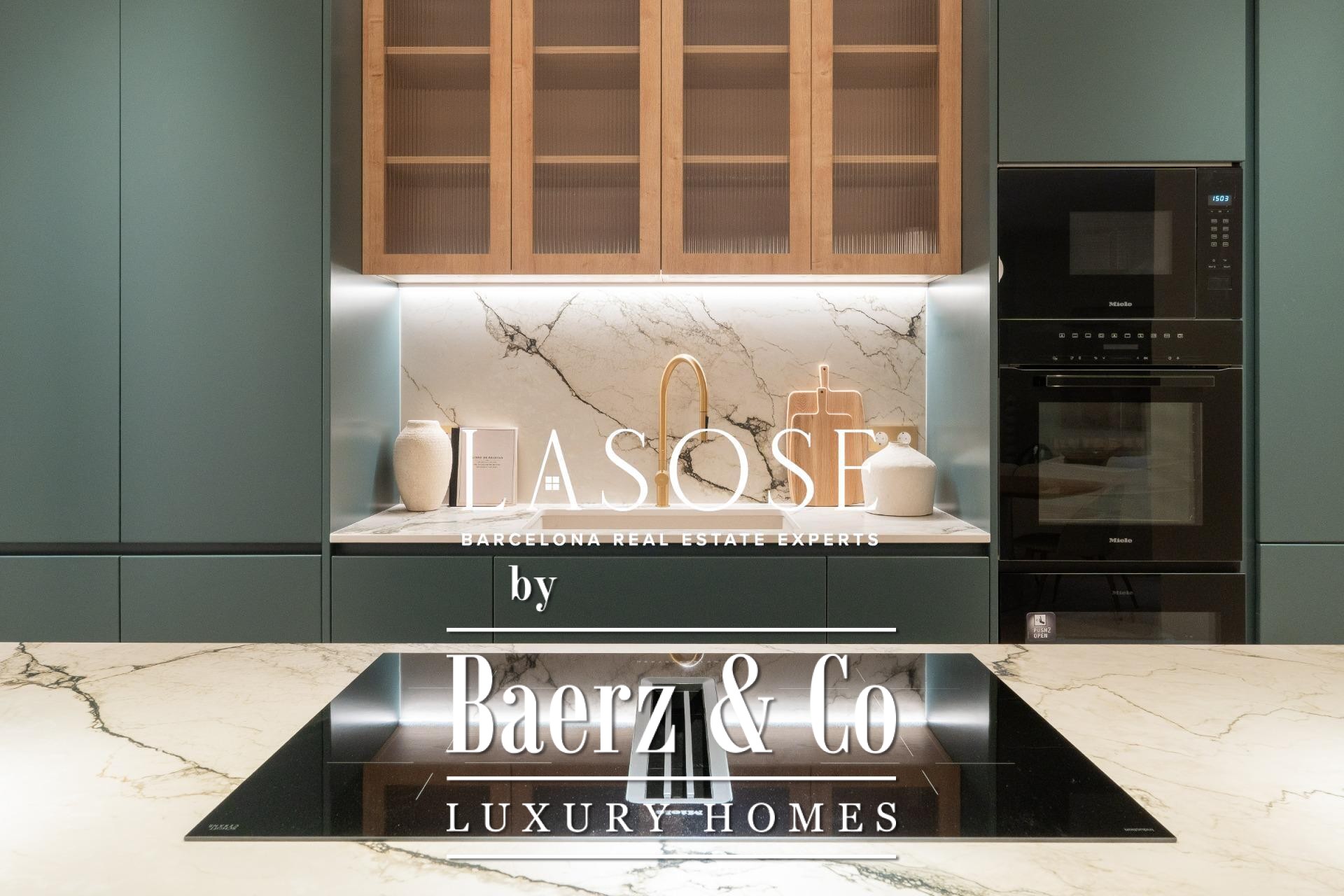 El ático ha sido completamente renovado con materiales de alta gama, conservando elementos originales como los suelos hidráulicos y la carpintería de madera. El interior alberga tres dormitorios dobles (dos de ellos en suite) y tres baños completos. La amplia zona de salón-comedor se define por una cocina de diseño abierta con isla central, electrodomésticos Miele y Liebherr, encimeras Neolith y mobiliario lacado. Balcones, trastero y un espacio de lavandería independiente optimizan la vida diaria. El edificio dispone de ascensor y servicio de conserjería, reafirmando su compromiso con el confort y la seguridad.