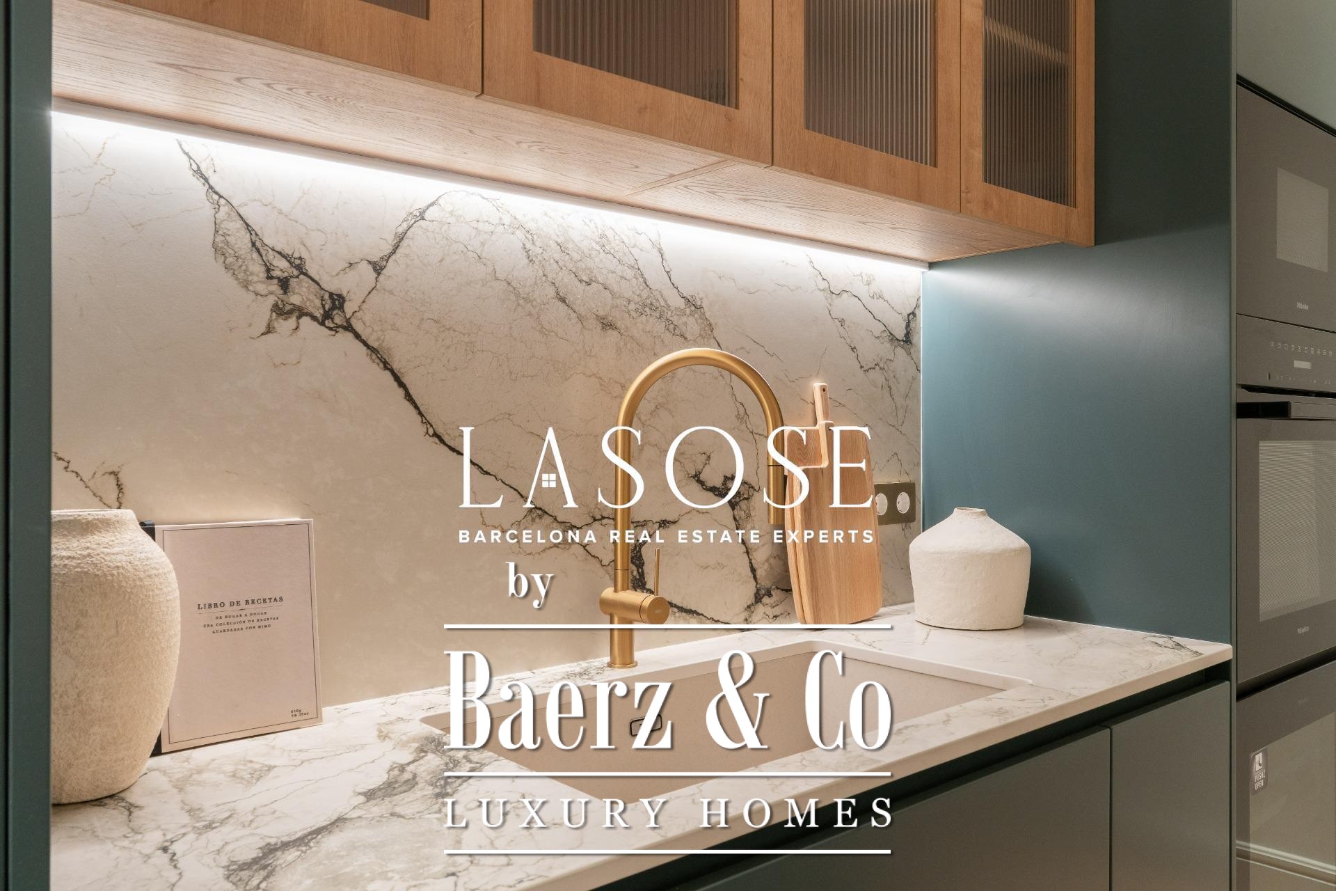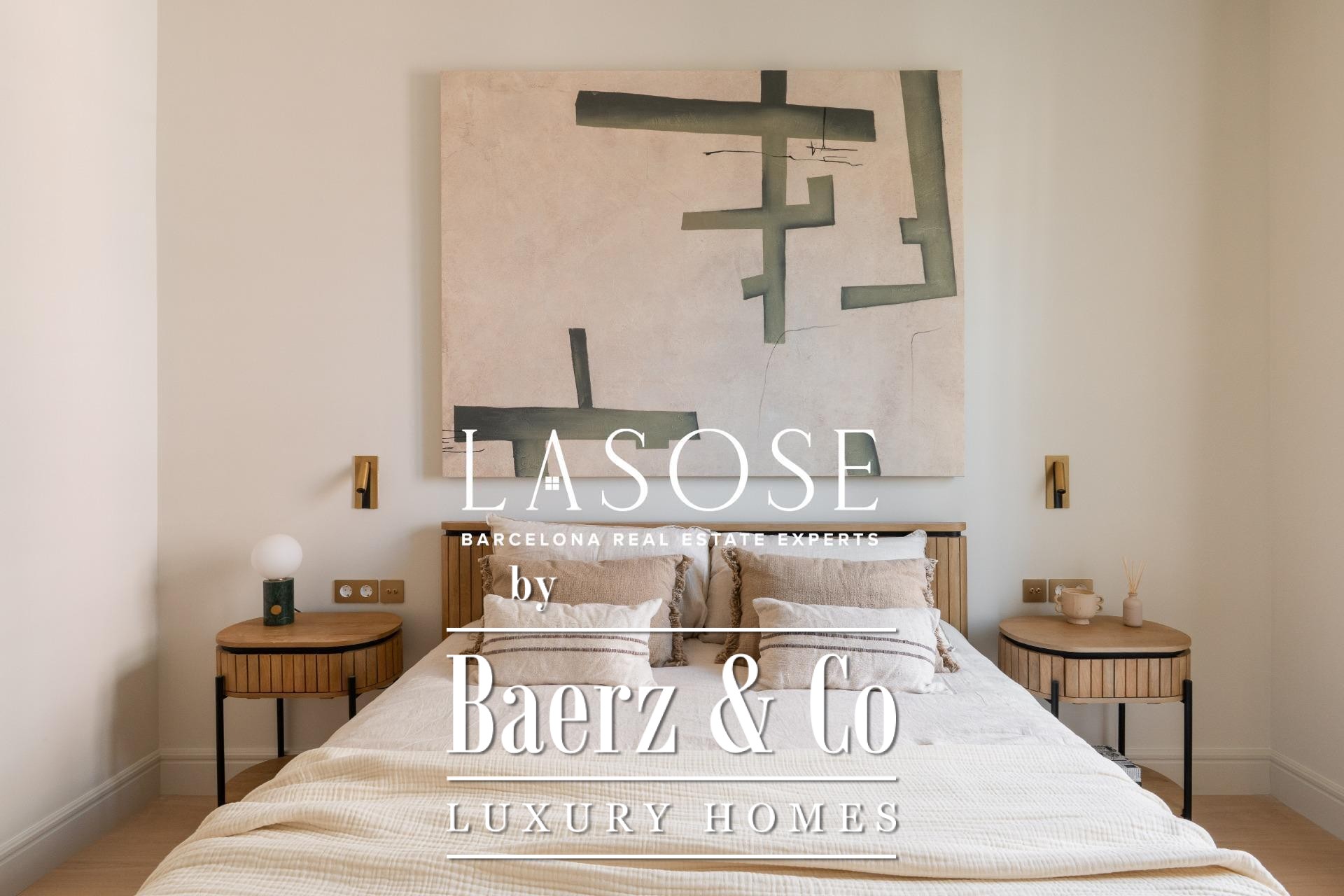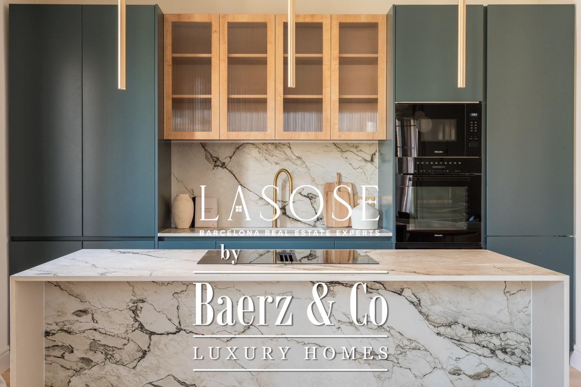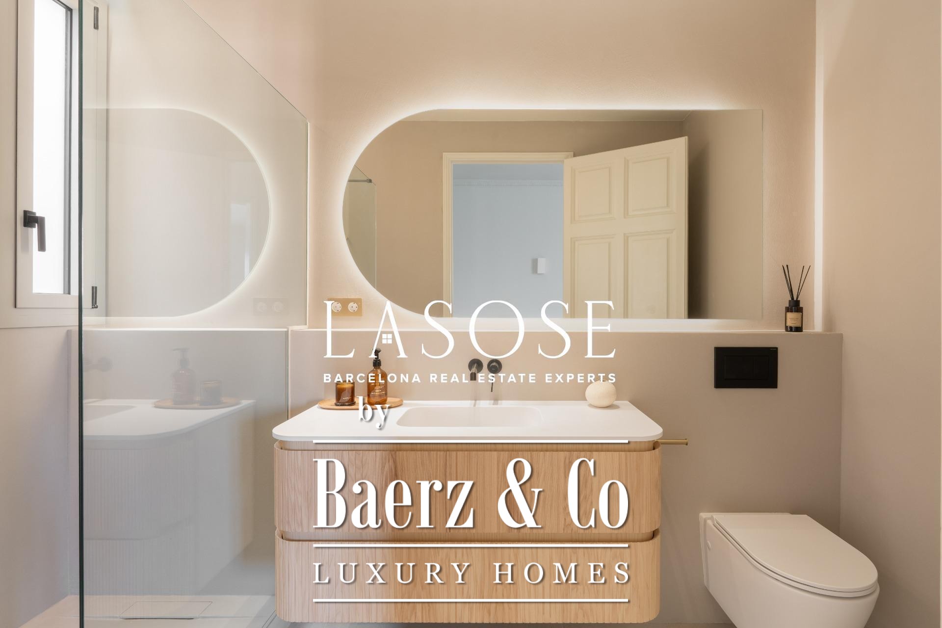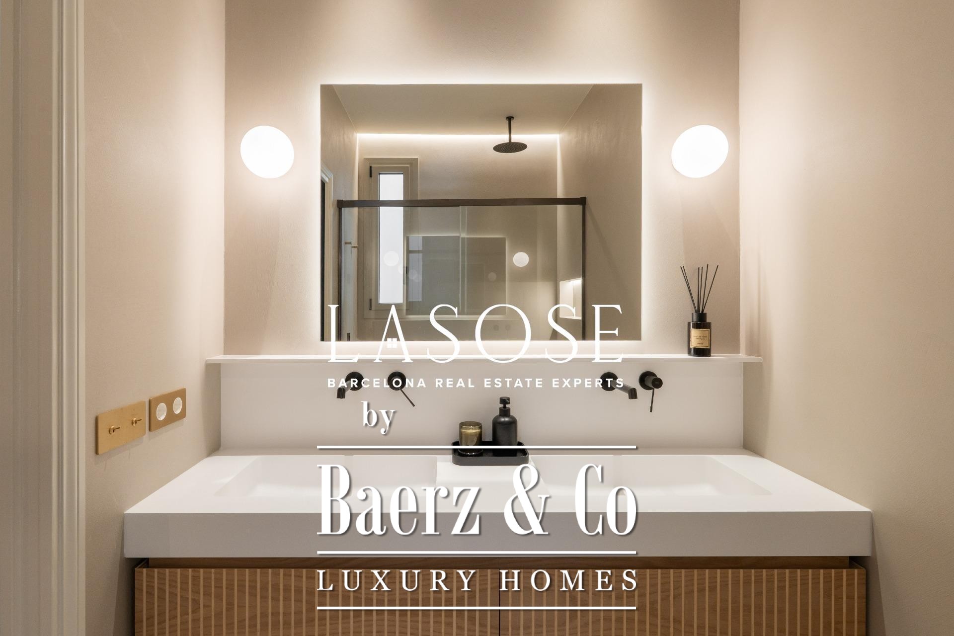 El ático ha sido completamente renovado con materiales de alta gama, conservando elementos originales como los suelos hidráulicos y la carpintería de madera. El interior alberga tres dormitorios dobles (dos de ellos en suite) y tres baños completos. La amplia zona de salón-comedor se define por una cocina de diseño abierta con isla central, electrodomésticos Miele y Liebherr, encimeras Neolith y mobiliario lacado. Balcones, trastero y un espacio de lavandería independiente optimizan la vida diaria. El edificio dispone de ascensor y servicio de conserjería, reafirmando su compromiso con el confort y la seguridad.