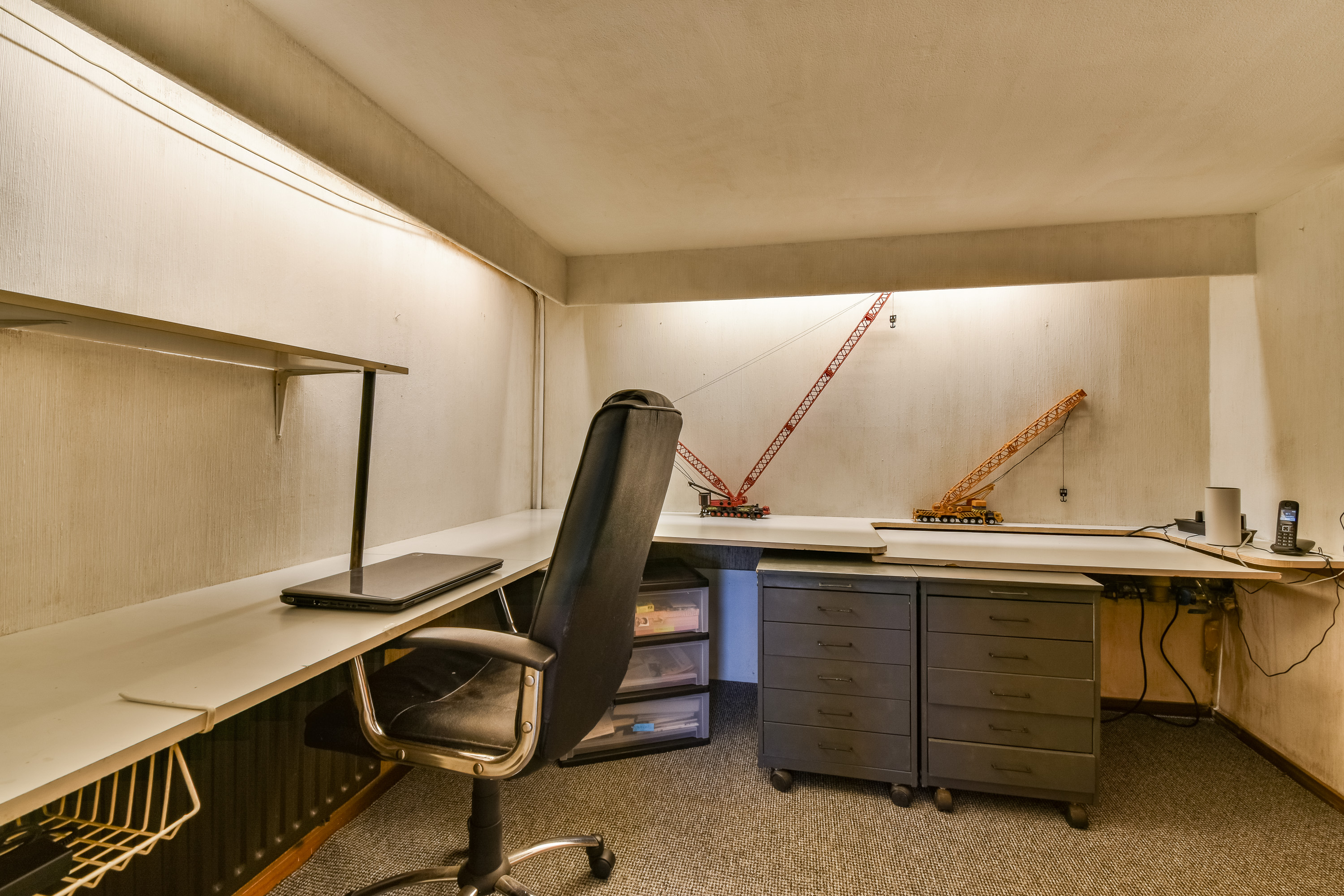 En la planta superior se distribuyen tres dormitorios, todos con armarios empotrados, y el principal se beneficia de aire acondicionado y vistas apacibles. El baño cuenta con ducha a ras de suelo, lavabo y aseo. En el nivel inferior se ubican zonas prácticas, como un lavadero amplio y trastero, con acceso directo al garaje y un despacho independiente.