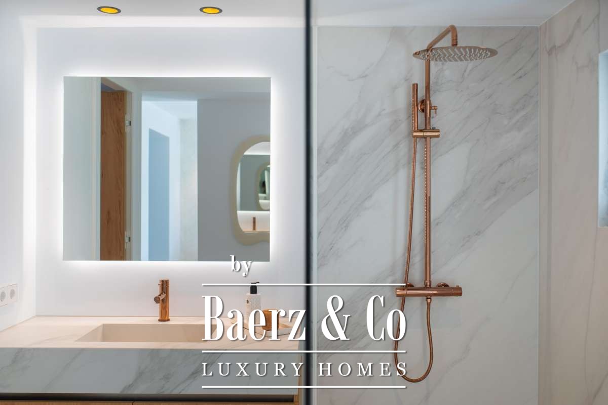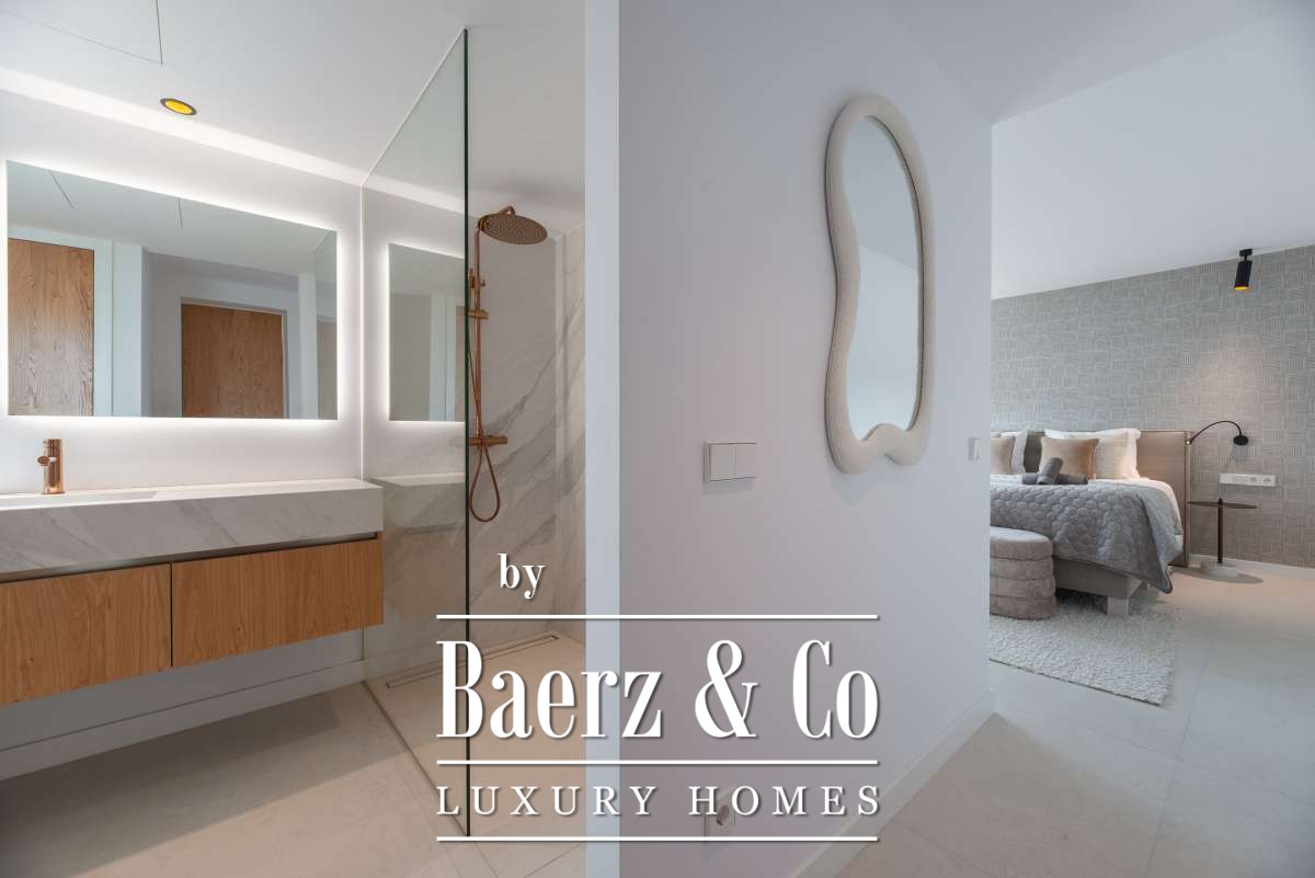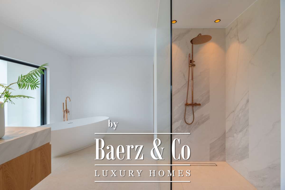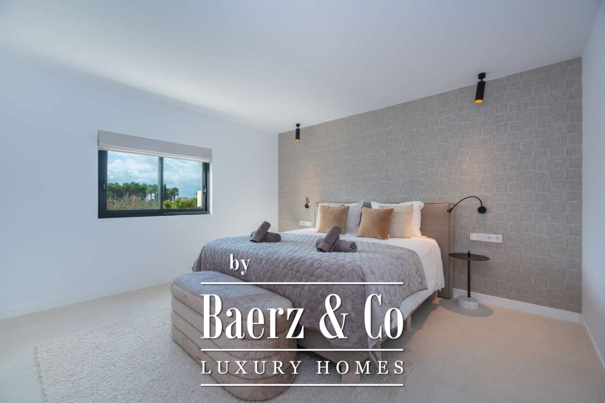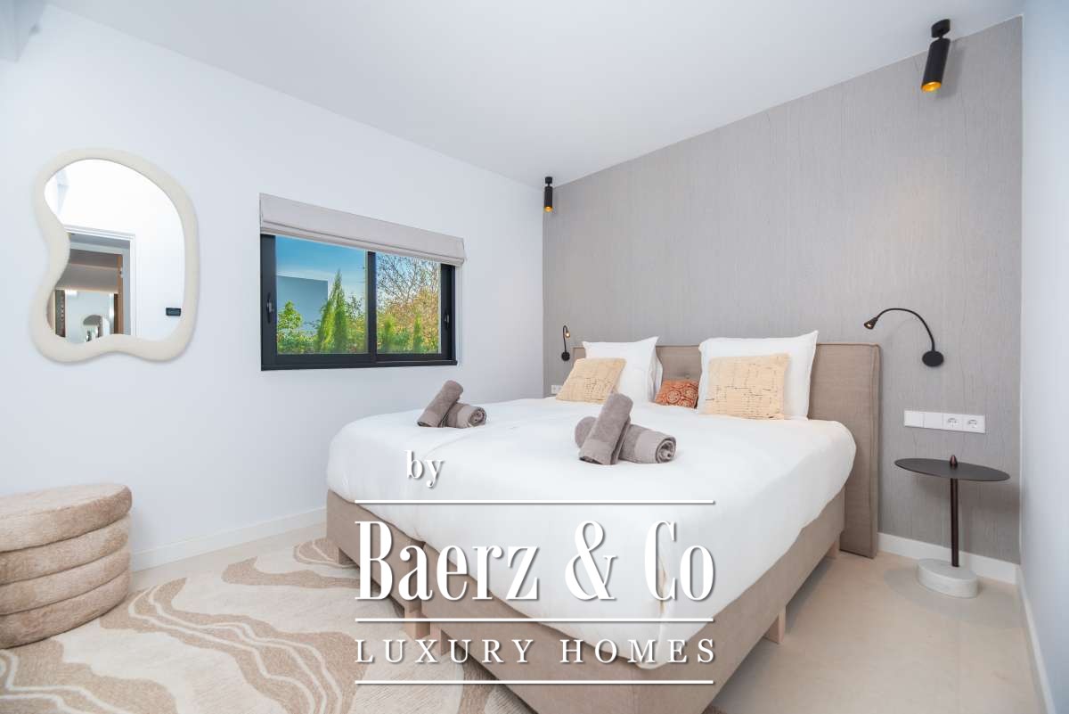 Cada uno de los cinco amplios dormitorios incluye baño en suite, acabados en mármol, grifería dorada y duchas tipo walk-in. La suite principal cuenta con bañera exenta y vistas serenas al campo. Los espacios de estar abiertos se realzan con una moderna chimenea, barra de cocina de mármol, calefacción por suelo radiante y aire acondicionado para disfrutar del máximo confort durante todo el año.