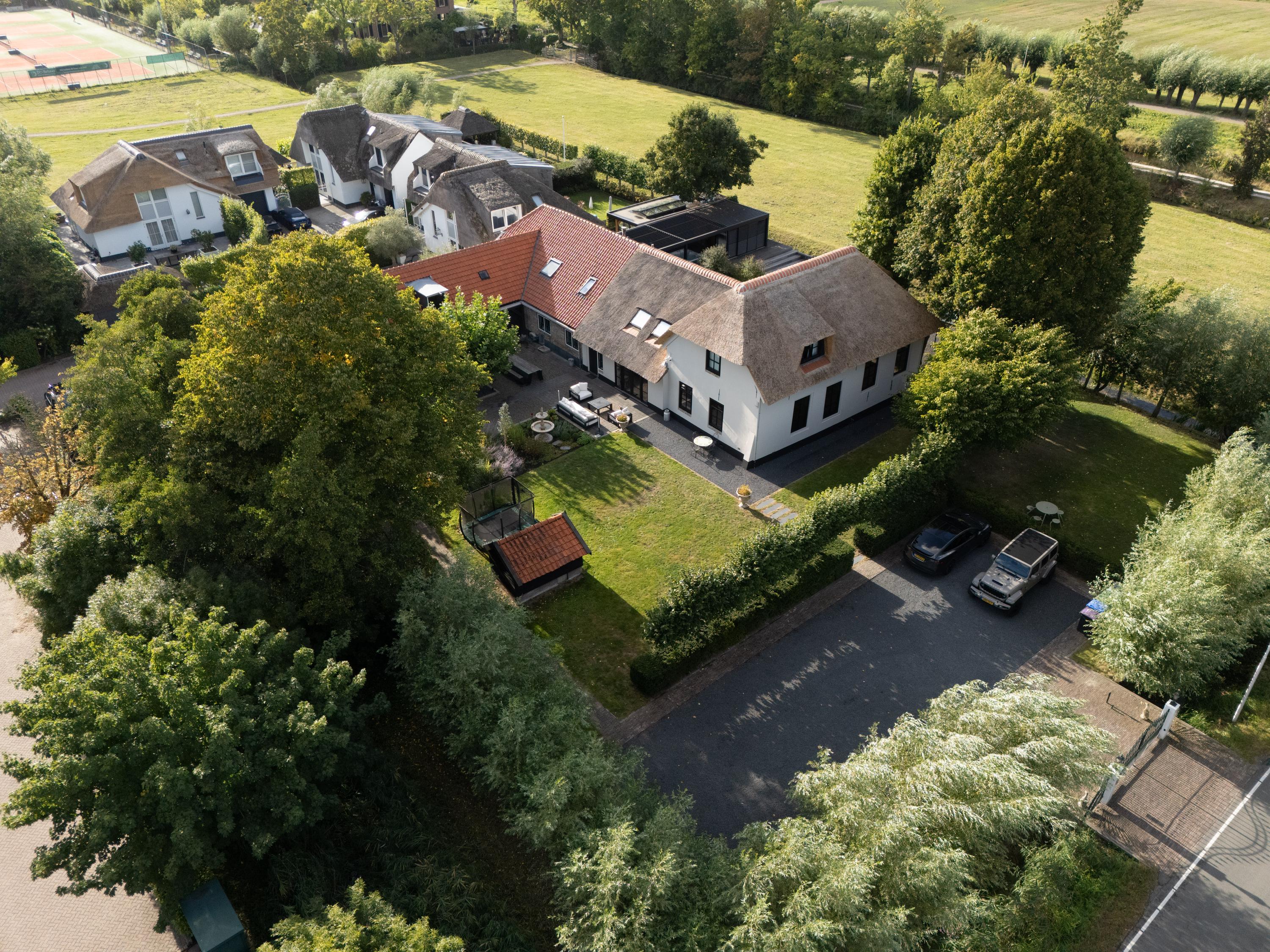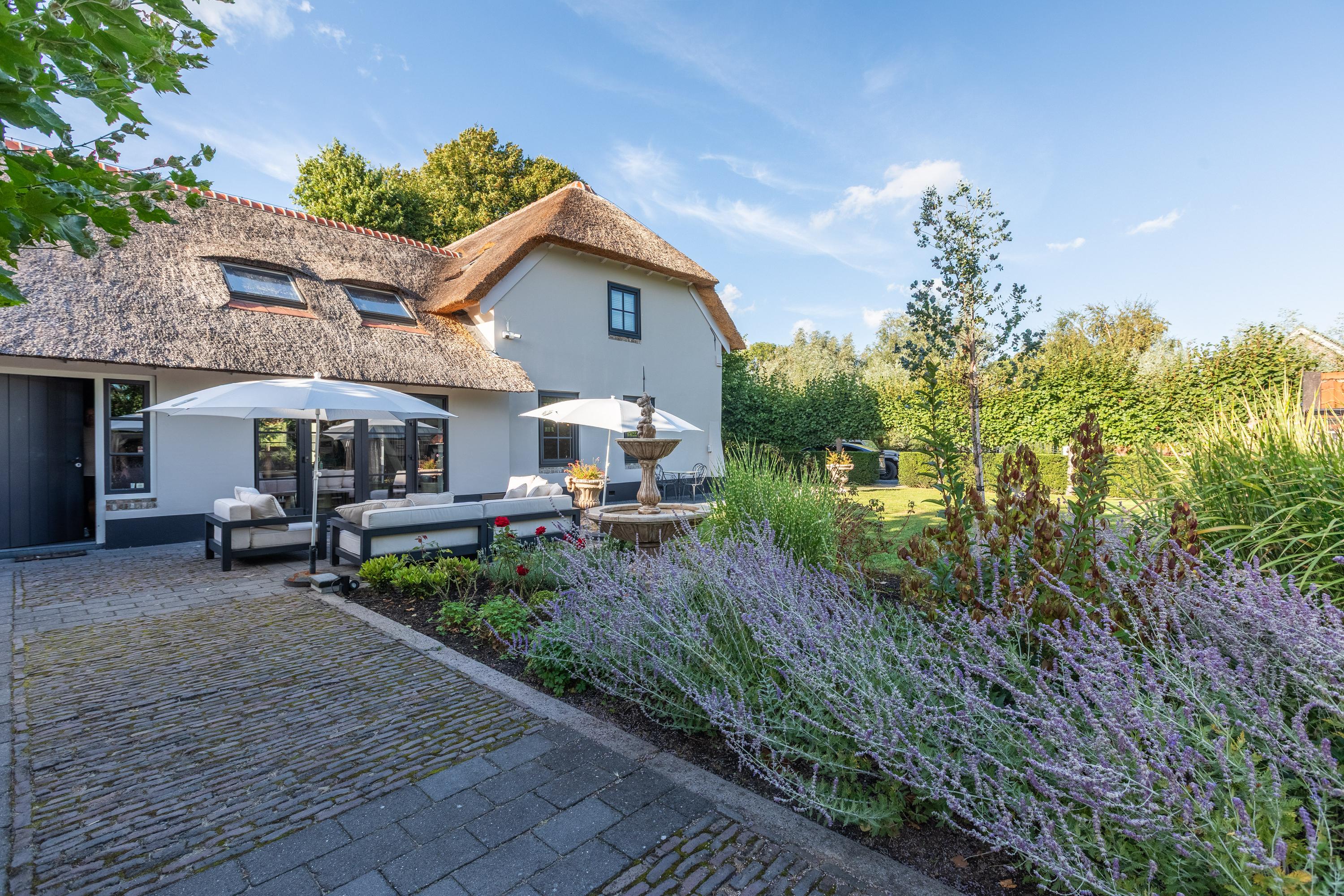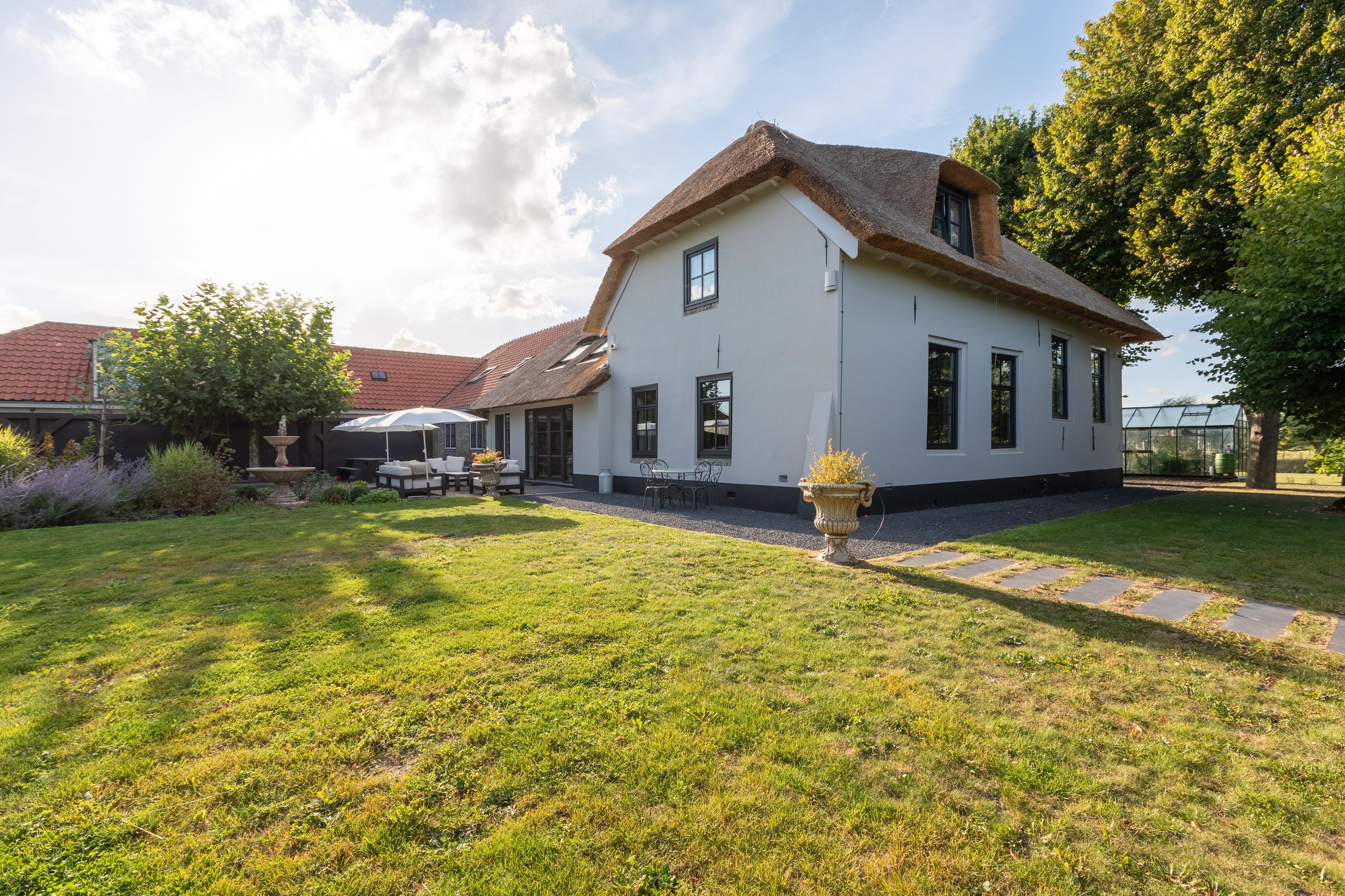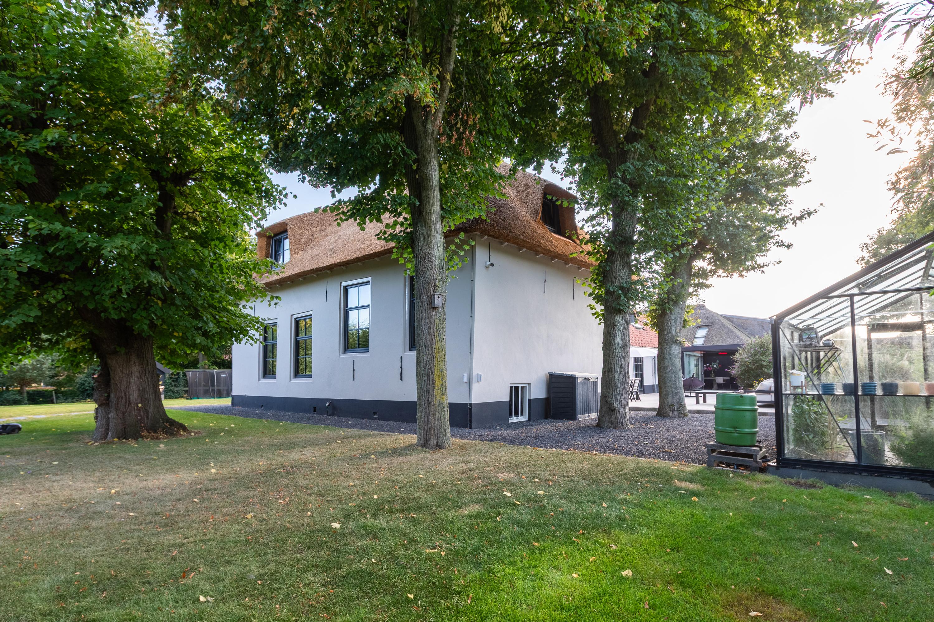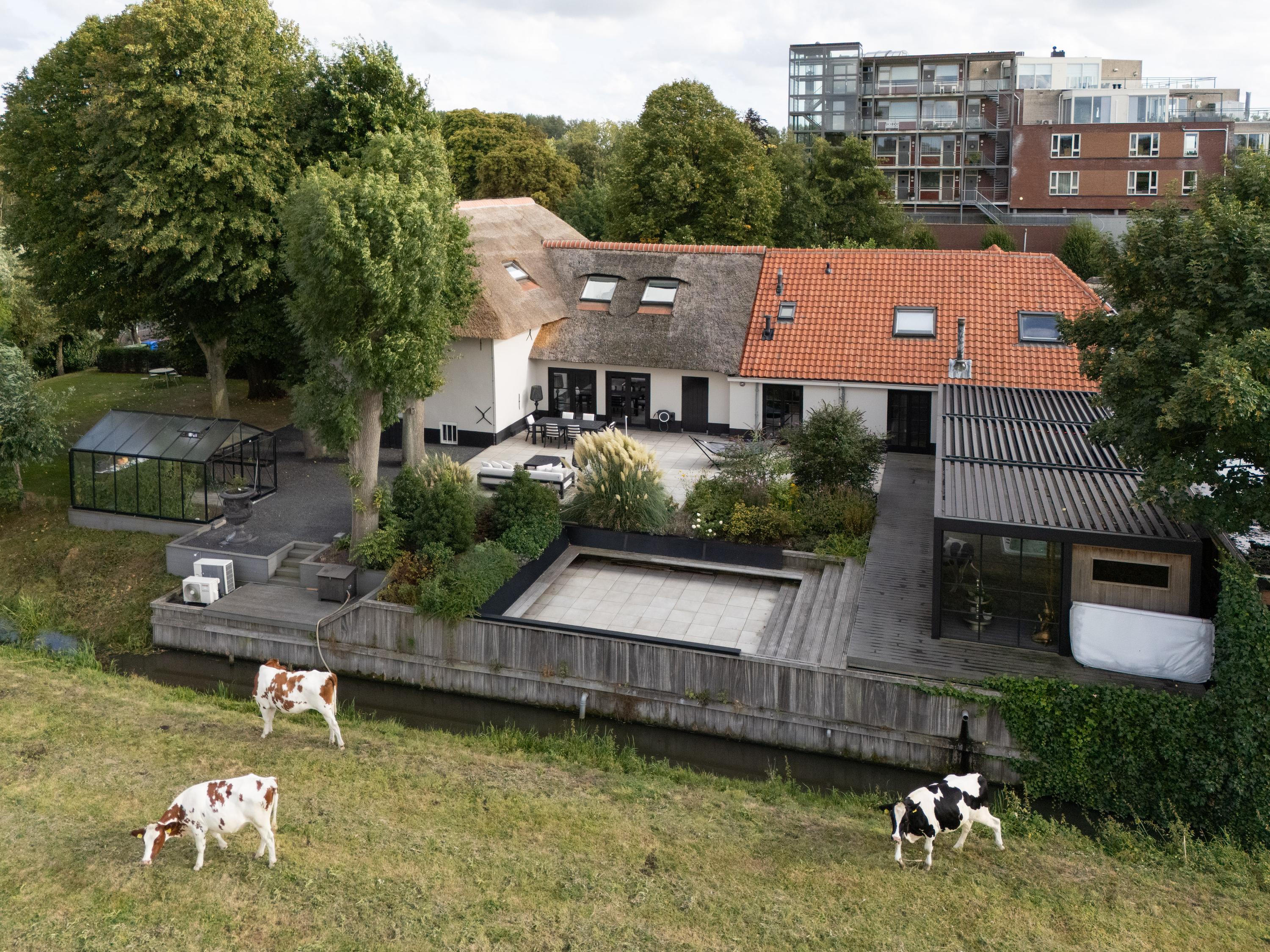 Al atravesar un portón eléctrico, el jardín revela céspedes en terrazas, borduras de plantas maduras y una zona de estar hundida, enmarcando vistas sobre los campos adyacentes de Midden-Delfland. La residencia principal ofrece amplios espacios, incluida una cocina sofisticada con isla de mármol y entresuelo, una serie de salones conectados con vigas auténticas y una sala de cine en la antigua quesería. La zona wellness invita al retiro con jacuzzi, saunas finlandesa e infrarroja, todo ello en una luminosa ampliación.