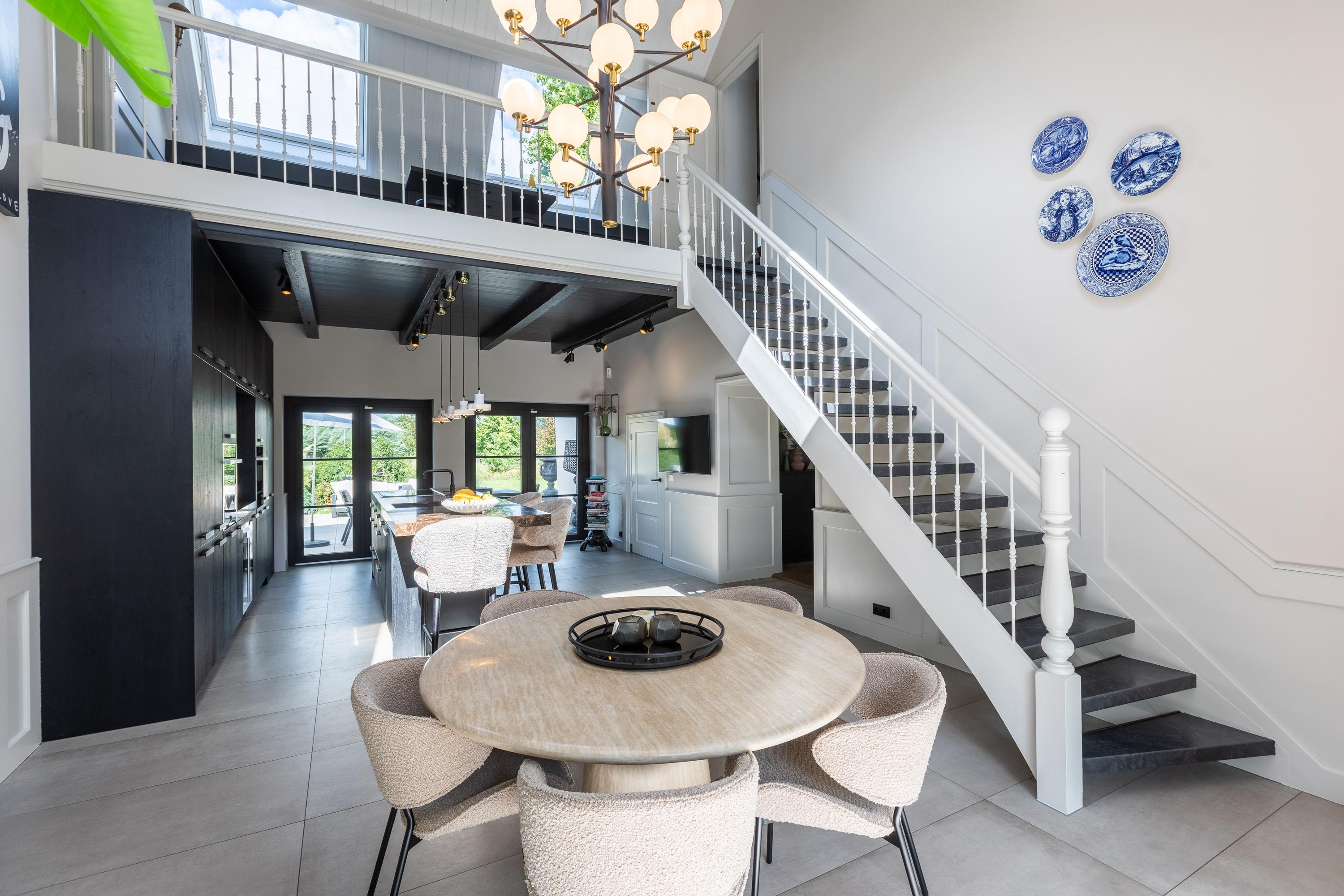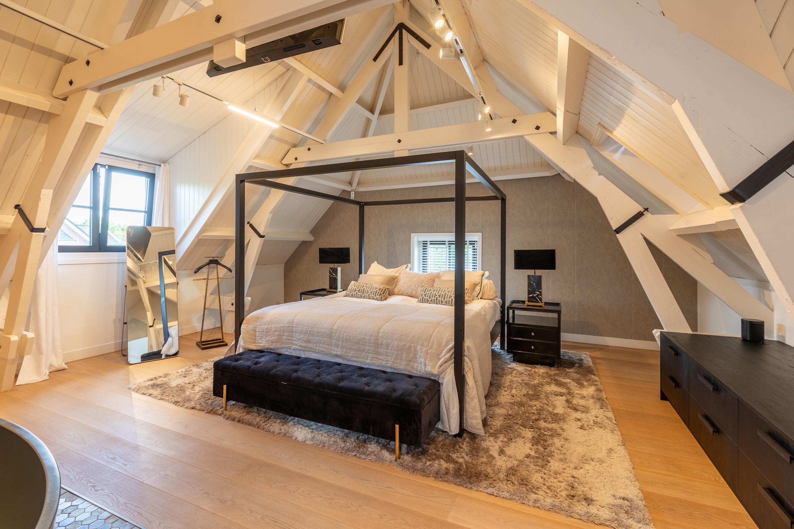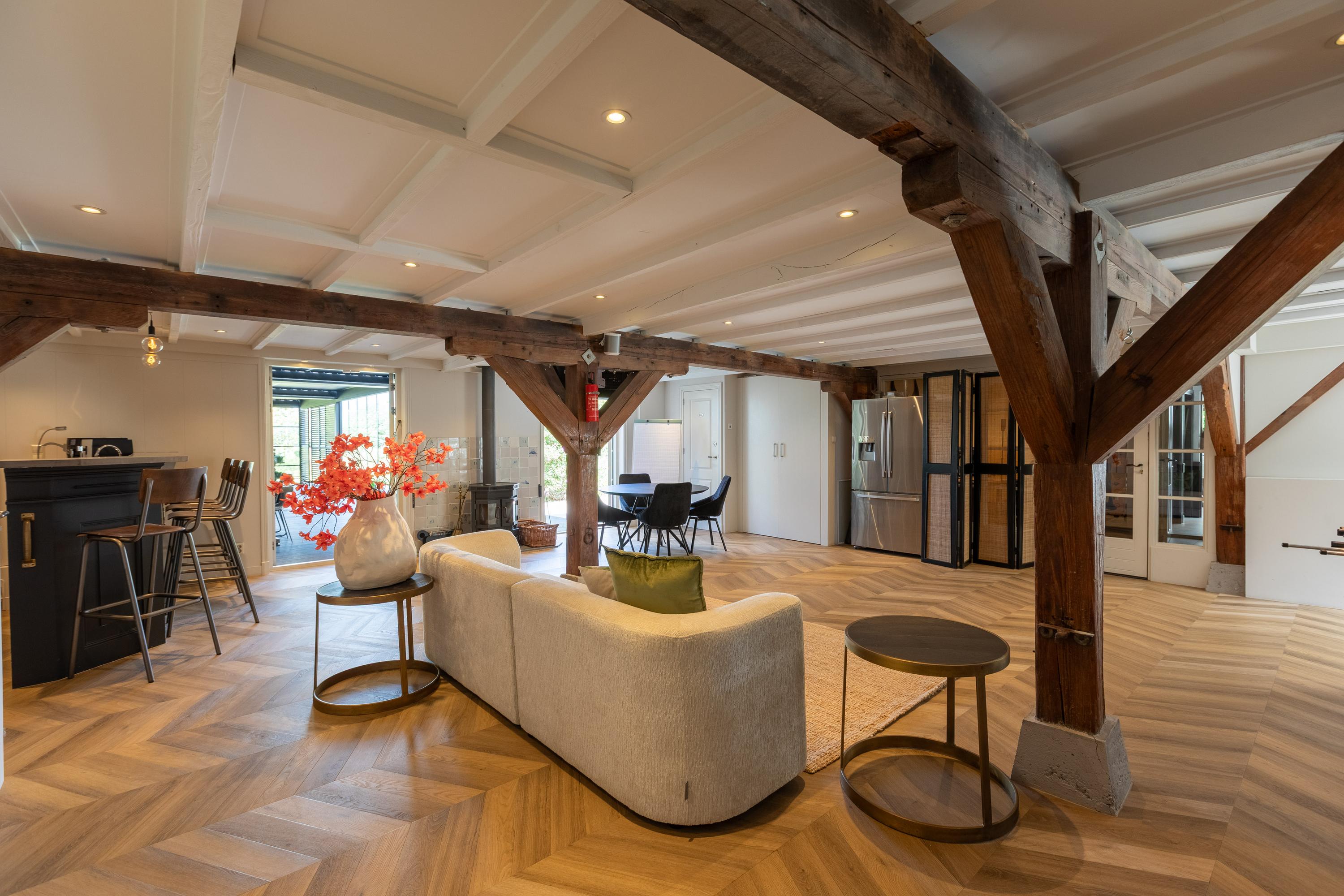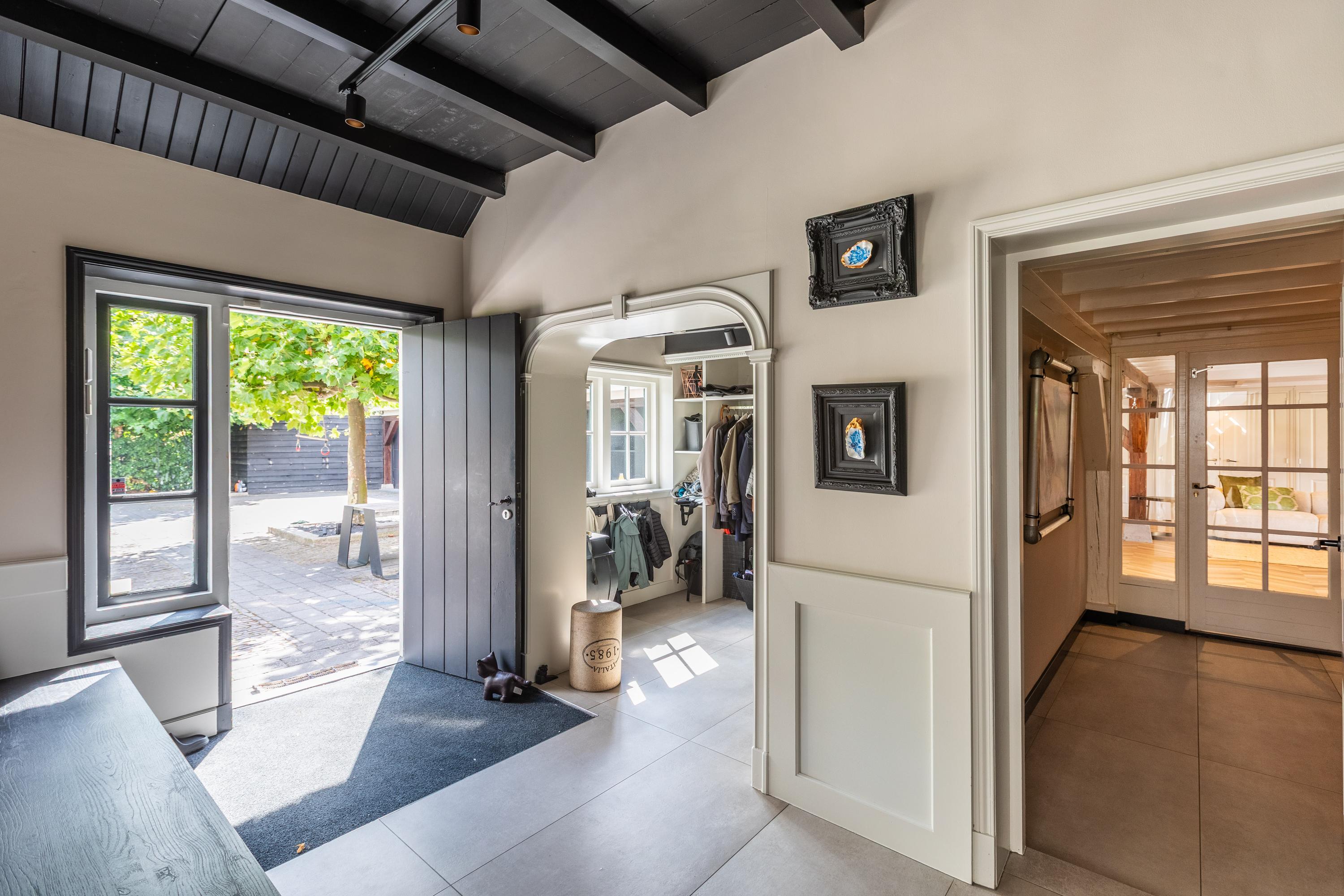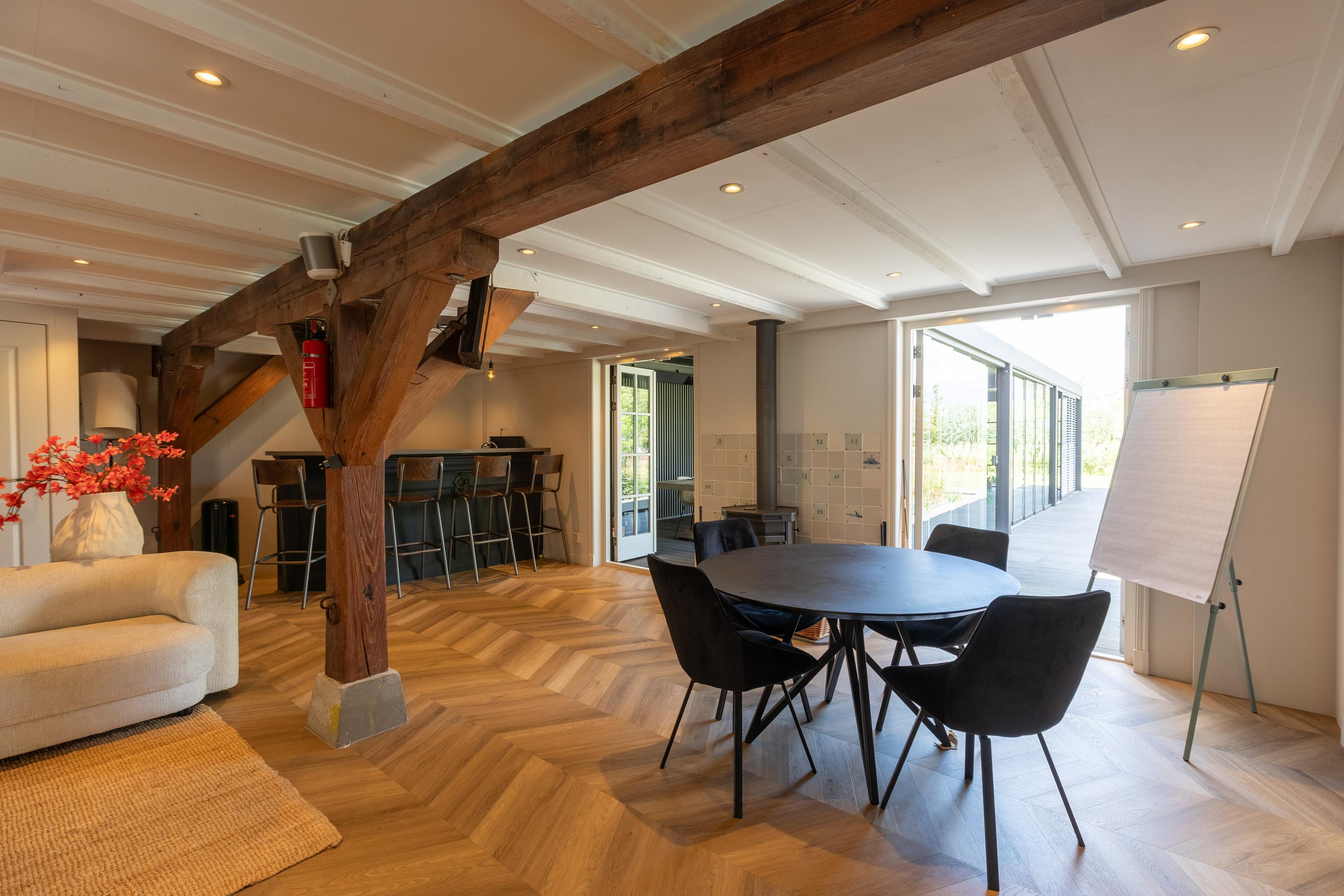 Al atravesar un portón eléctrico, el jardín revela céspedes en terrazas, borduras de plantas maduras y una zona de estar hundida, enmarcando vistas sobre los campos adyacentes de Midden-Delfland. La residencia principal ofrece amplios espacios, incluida una cocina sofisticada con isla de mármol y entresuelo, una serie de salones conectados con vigas auténticas y una sala de cine en la antigua quesería. La zona wellness invita al retiro con jacuzzi, saunas finlandesa e infrarroja, todo ello en una luminosa ampliación.