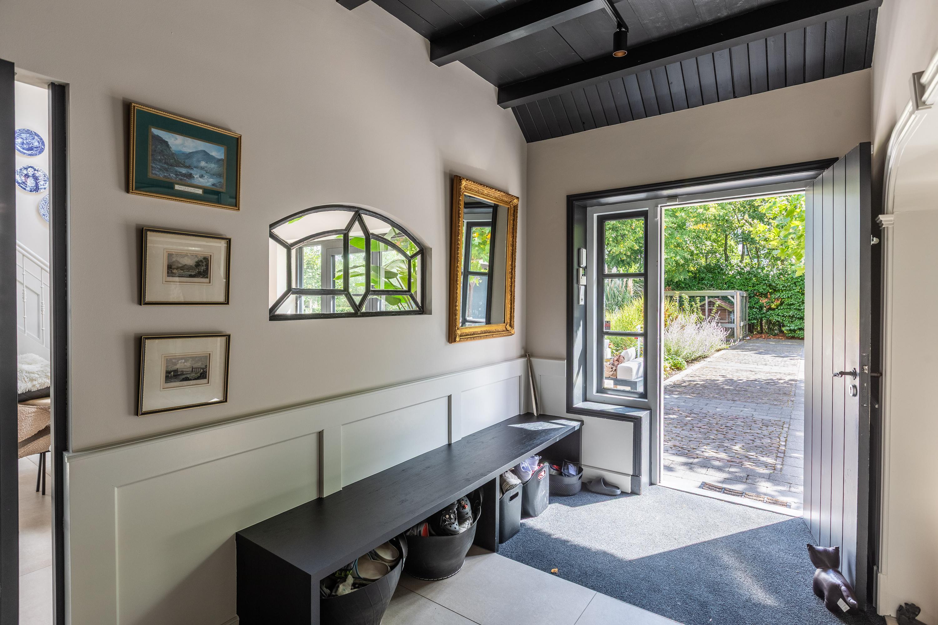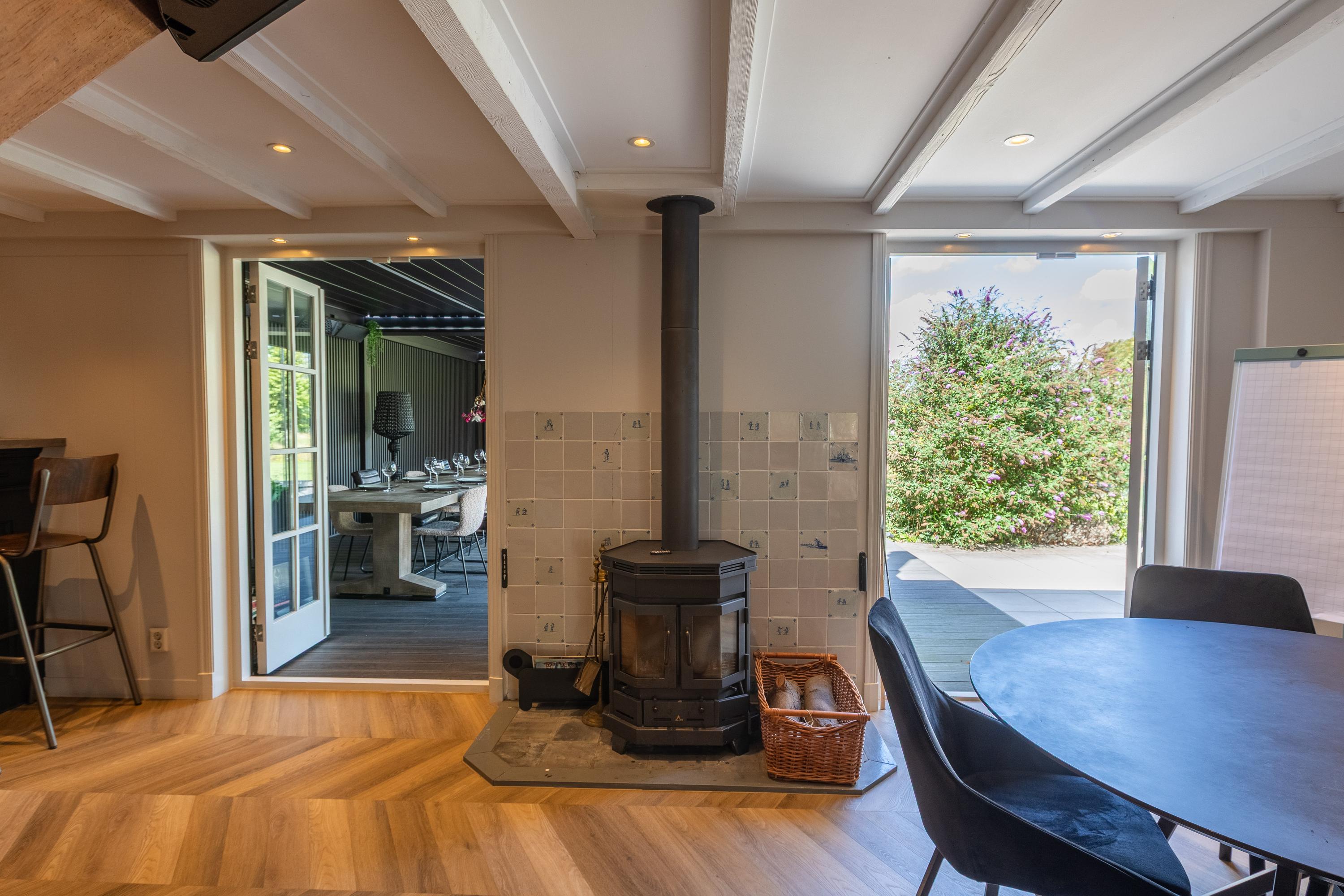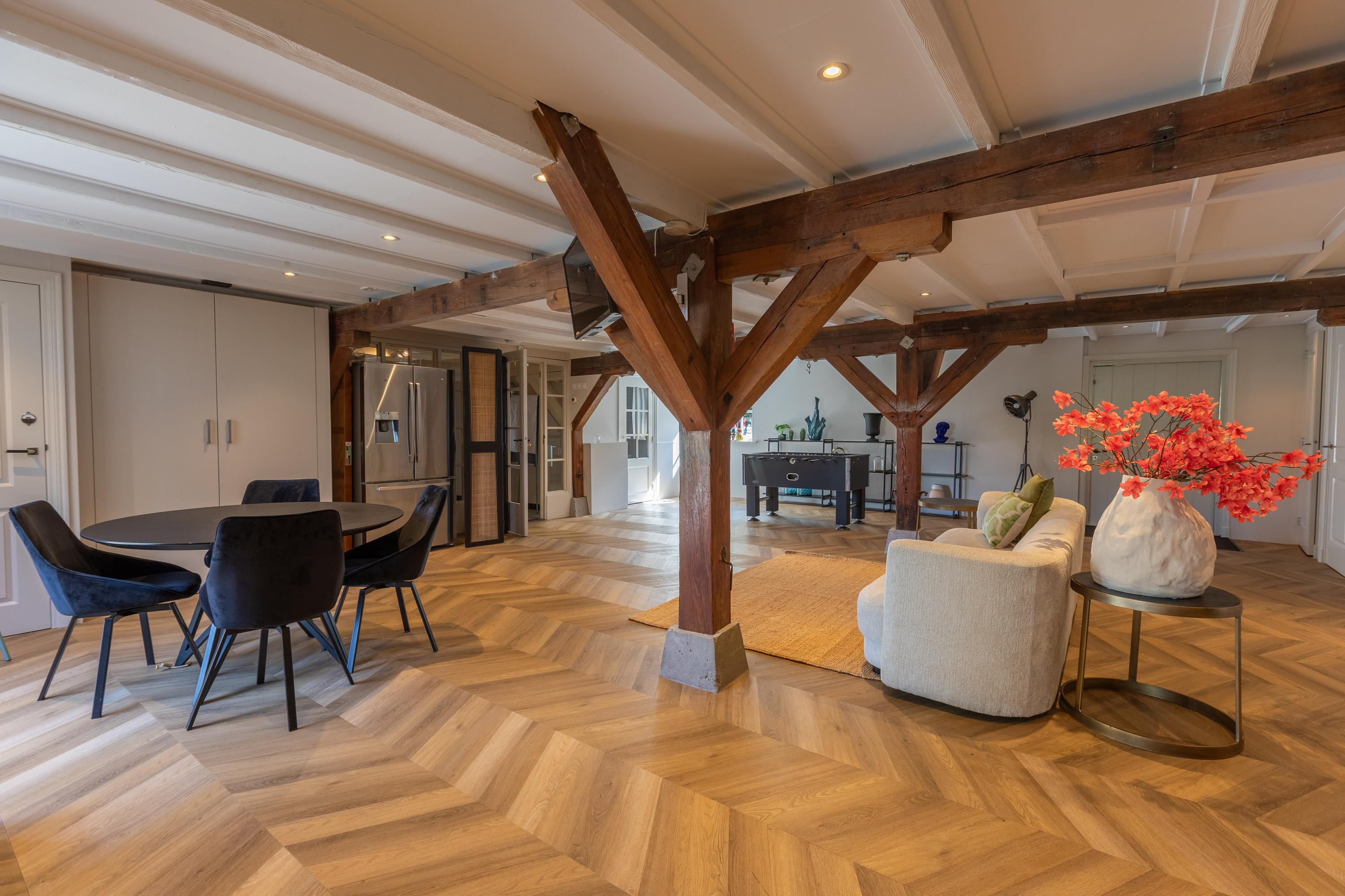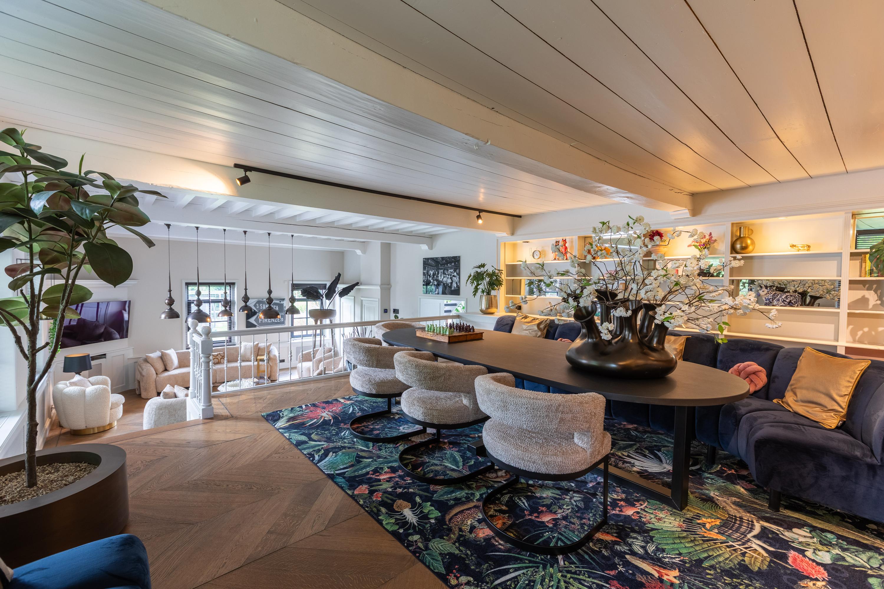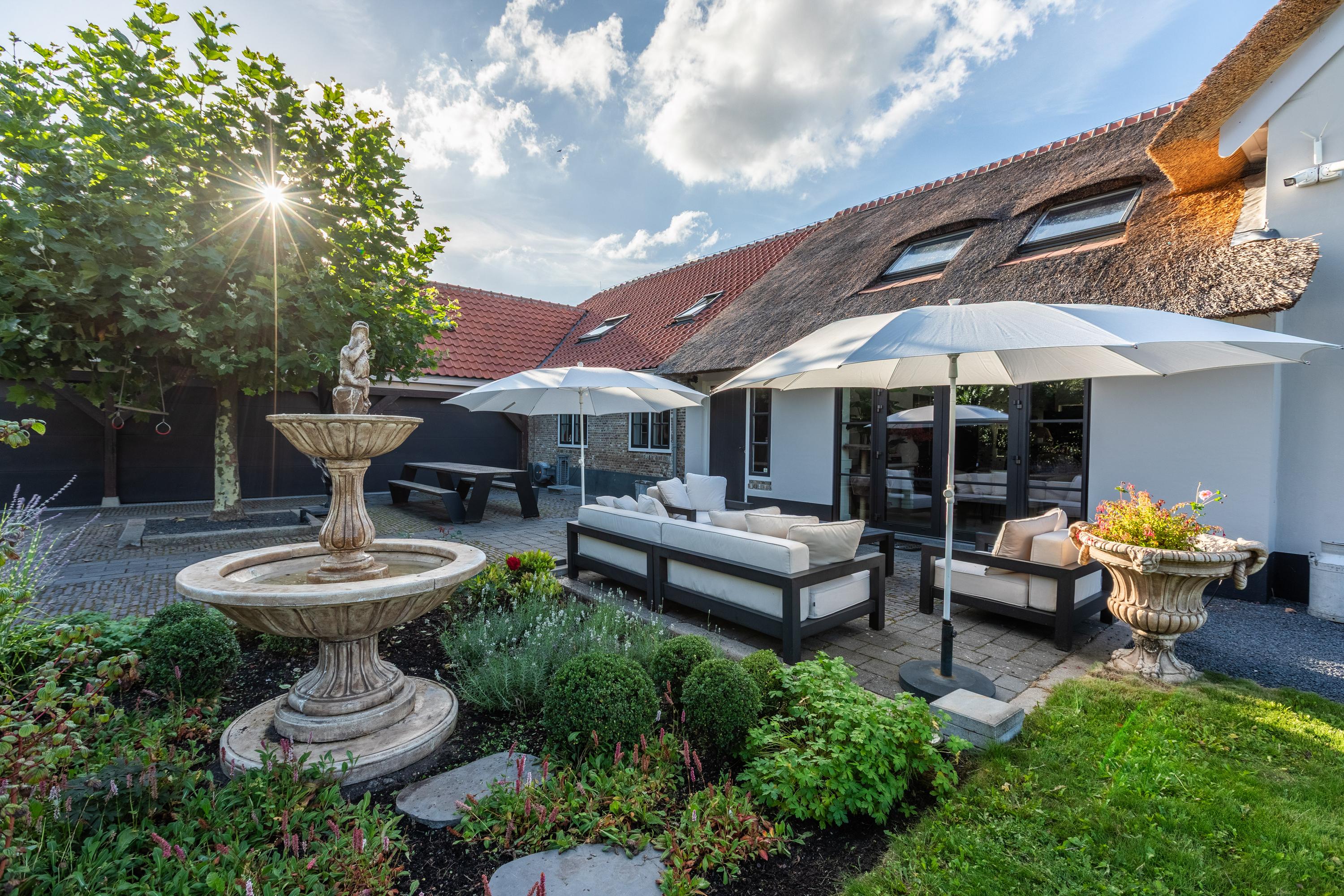 Al atravesar un portón eléctrico, el jardín revela céspedes en terrazas, borduras de plantas maduras y una zona de estar hundida, enmarcando vistas sobre los campos adyacentes de Midden-Delfland. La residencia principal ofrece amplios espacios, incluida una cocina sofisticada con isla de mármol y entresuelo, una serie de salones conectados con vigas auténticas y una sala de cine en la antigua quesería. La zona wellness invita al retiro con jacuzzi, saunas finlandesa e infrarroja, todo ello en una luminosa ampliación.