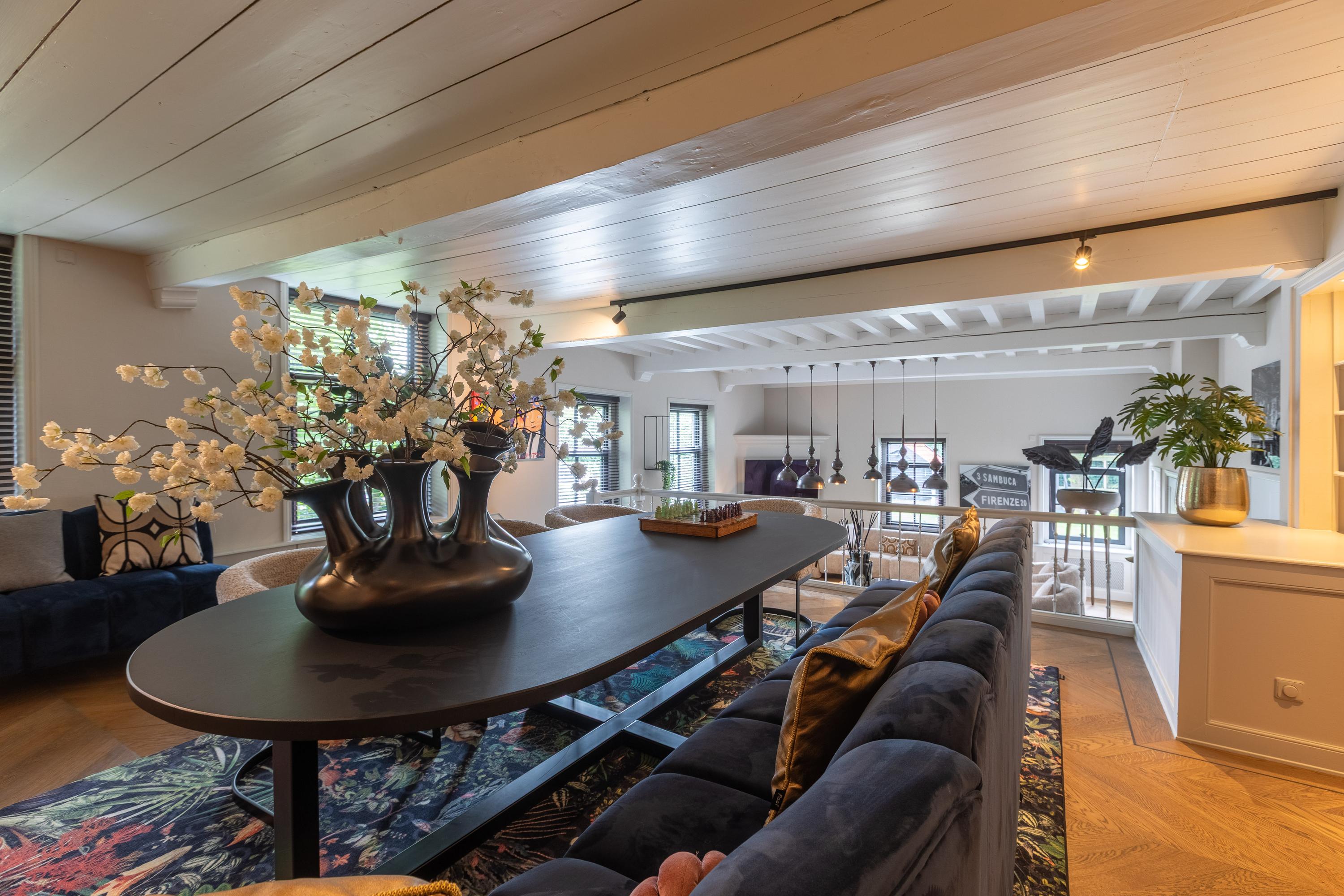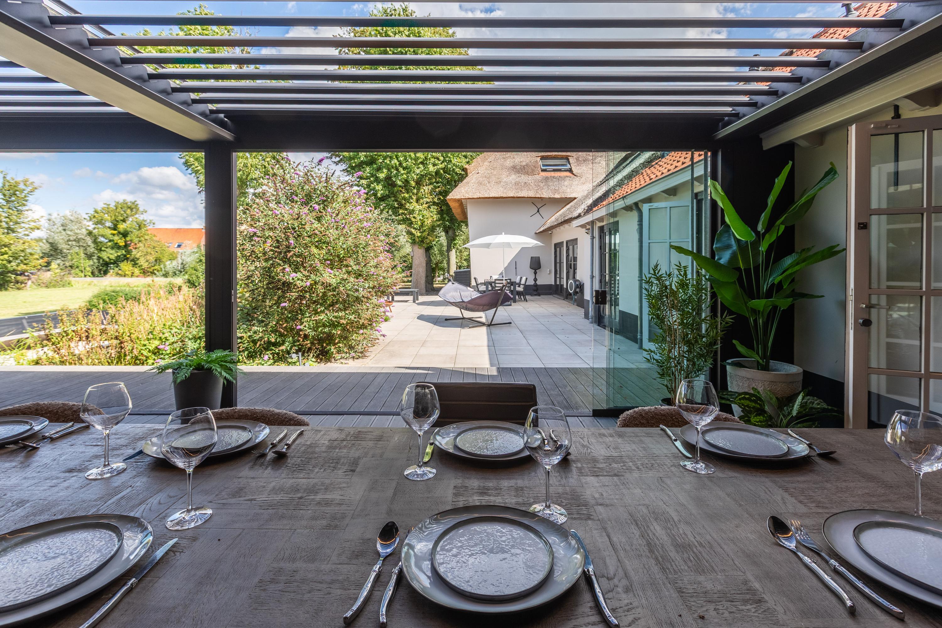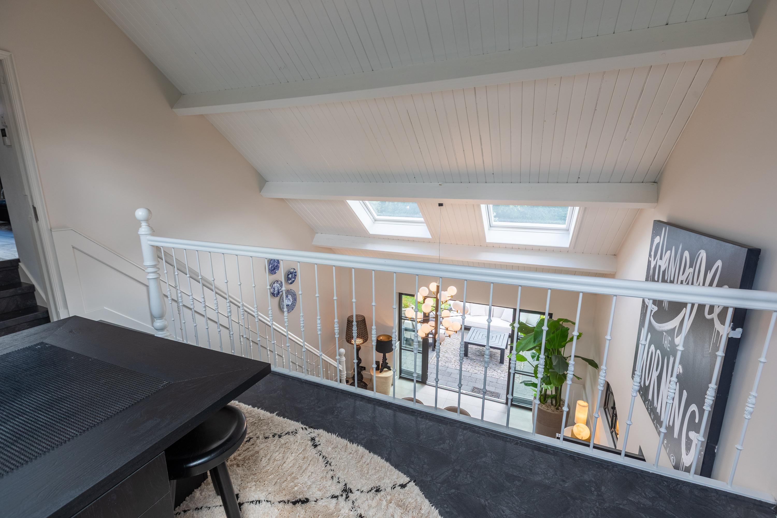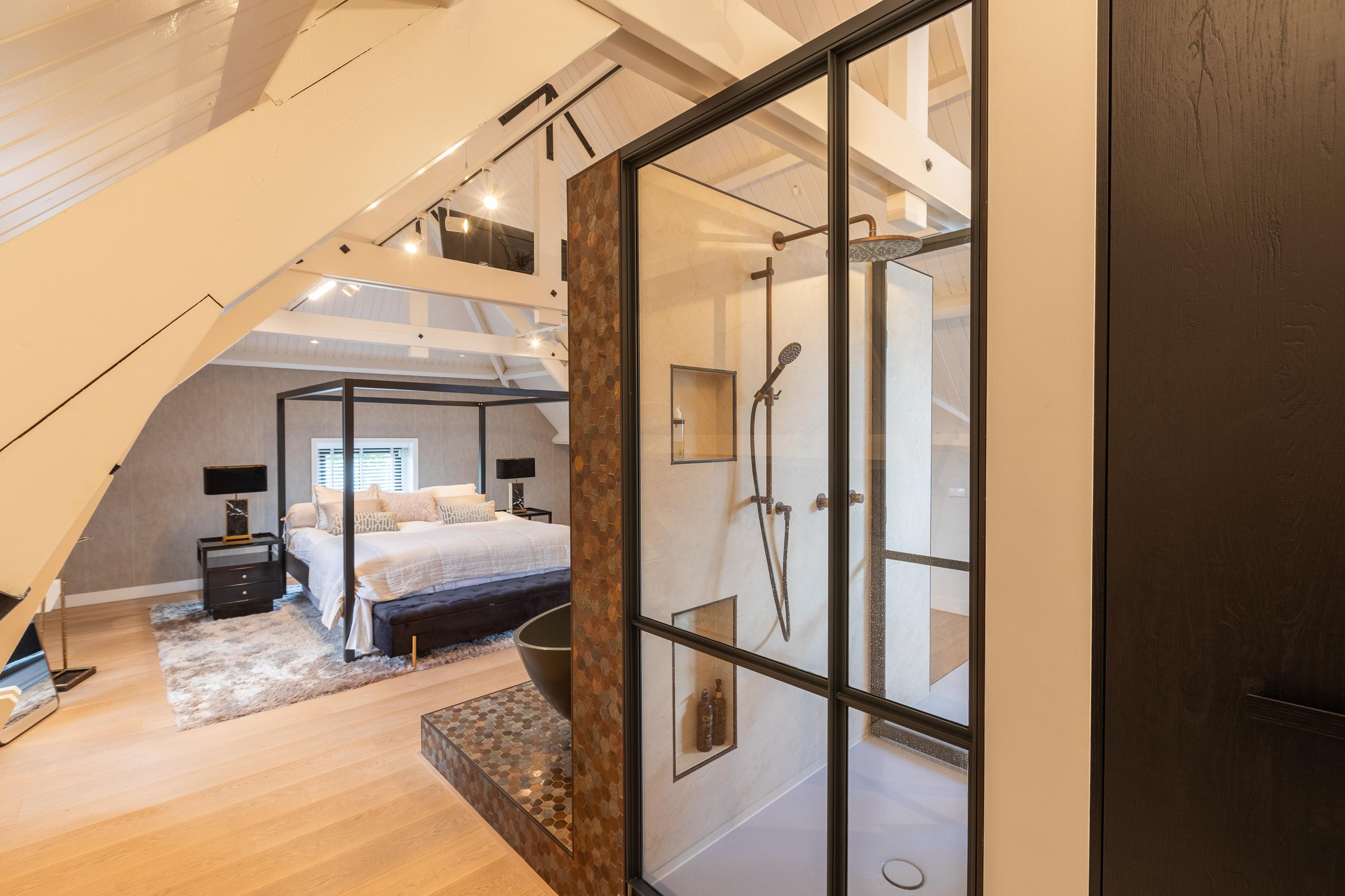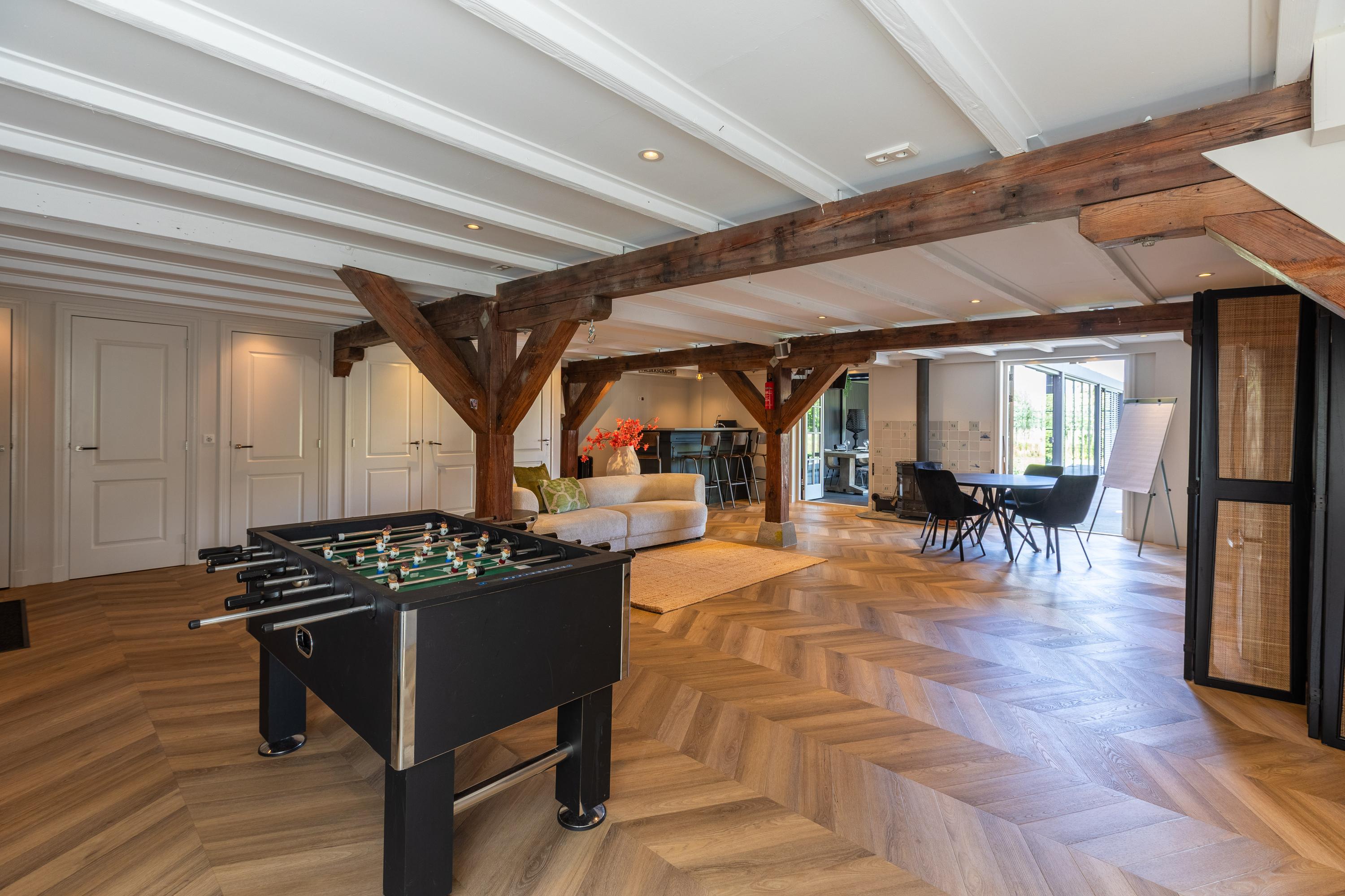 Al atravesar un portón eléctrico, el jardín revela céspedes en terrazas, borduras de plantas maduras y una zona de estar hundida, enmarcando vistas sobre los campos adyacentes de Midden-Delfland. La residencia principal ofrece amplios espacios, incluida una cocina sofisticada con isla de mármol y entresuelo, una serie de salones conectados con vigas auténticas y una sala de cine en la antigua quesería. La zona wellness invita al retiro con jacuzzi, saunas finlandesa e infrarroja, todo ello en una luminosa ampliación.