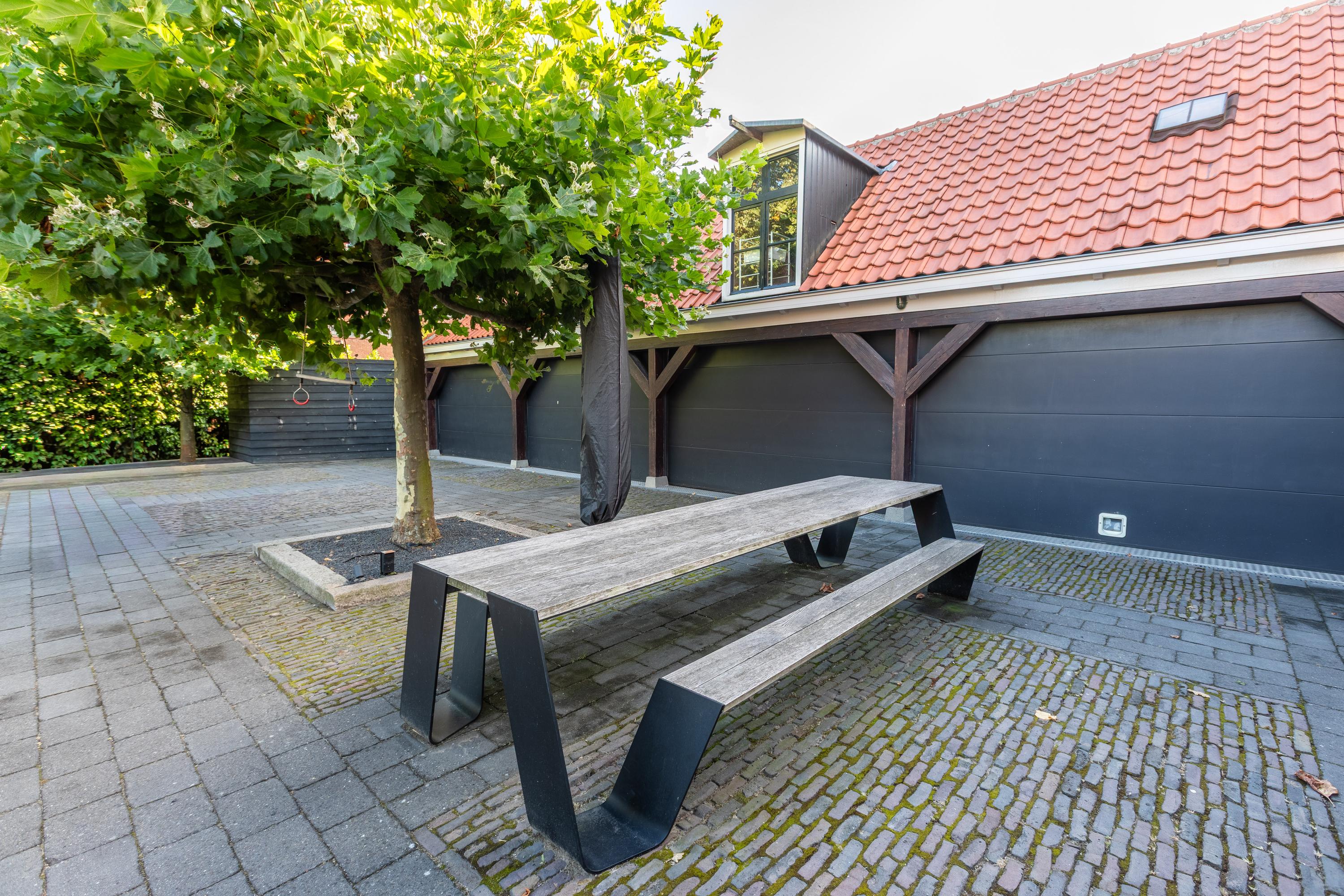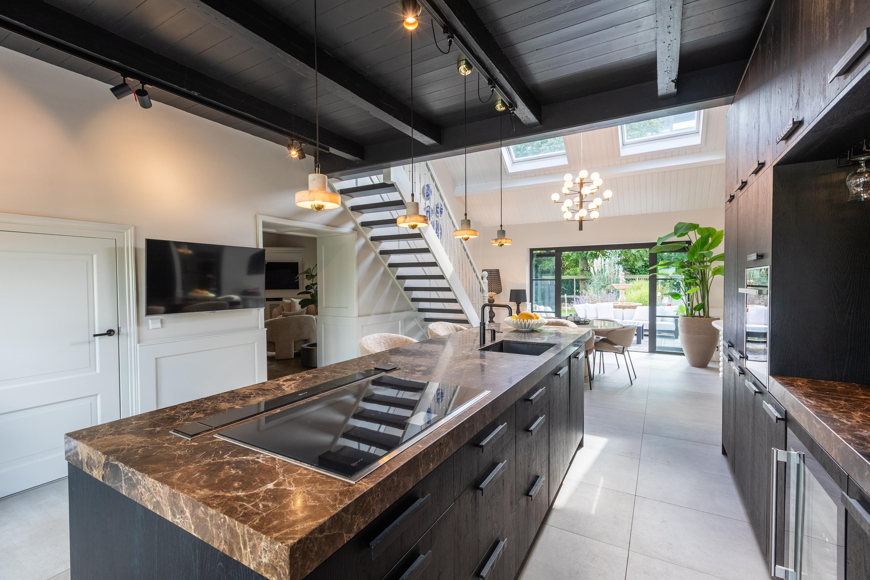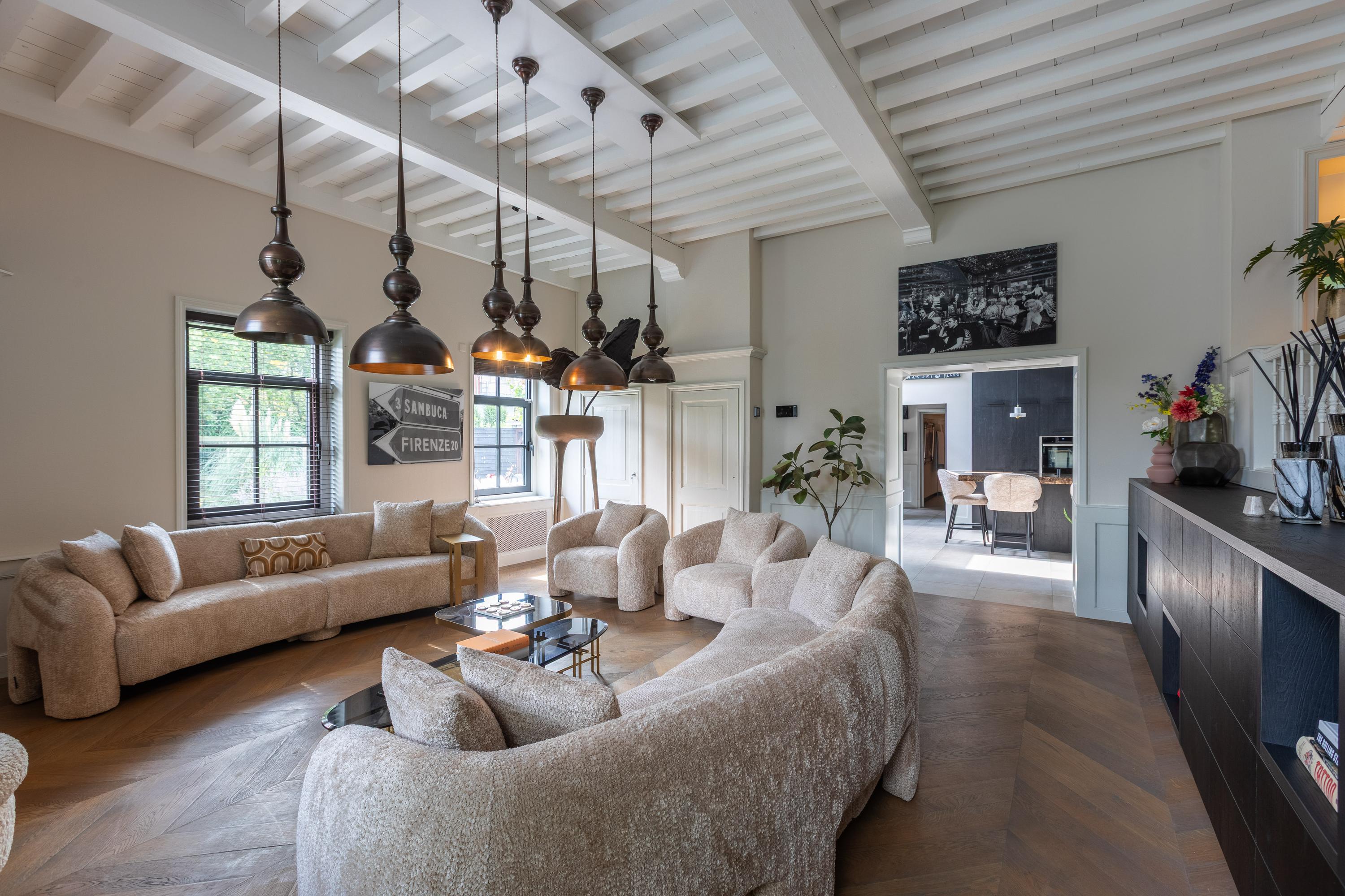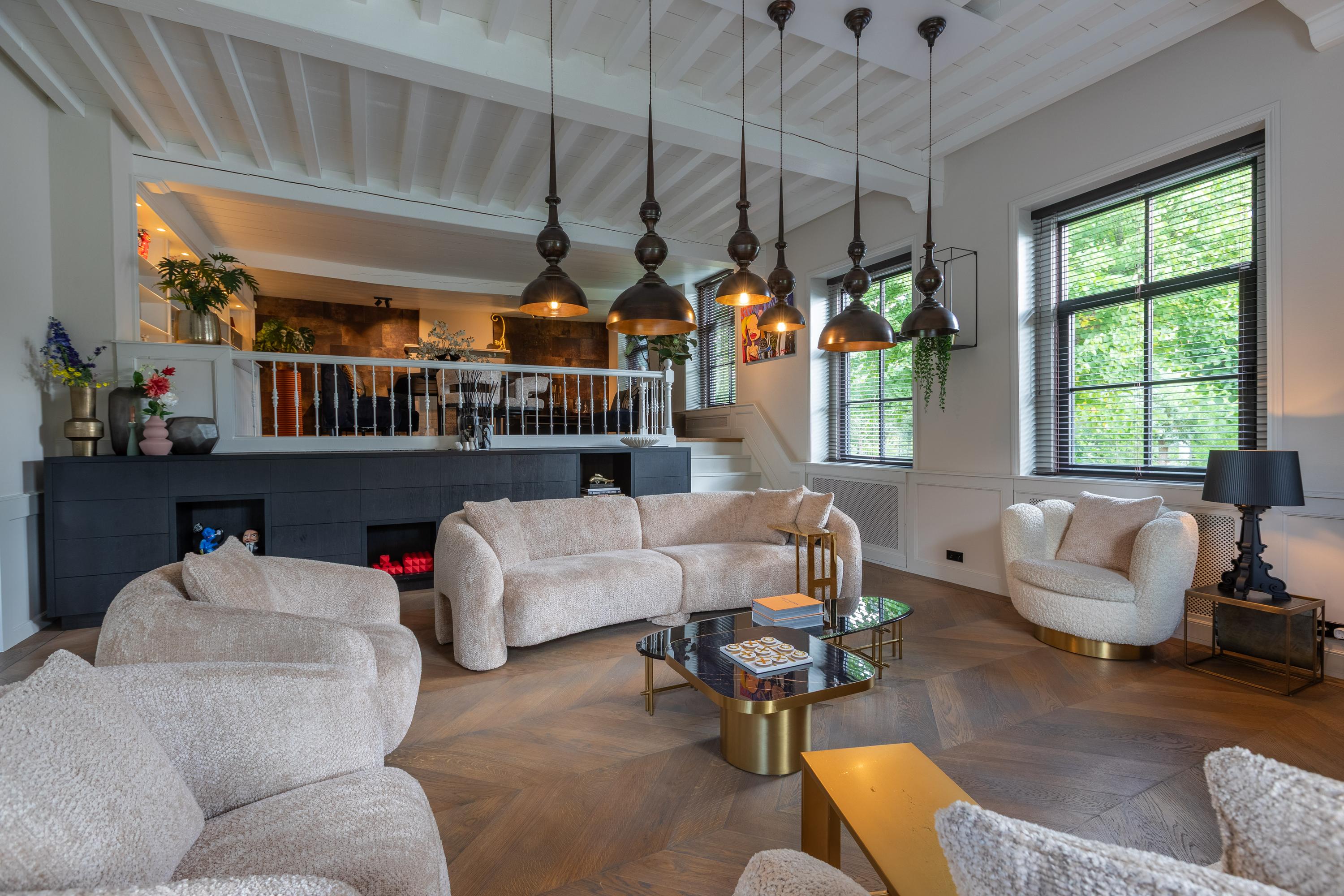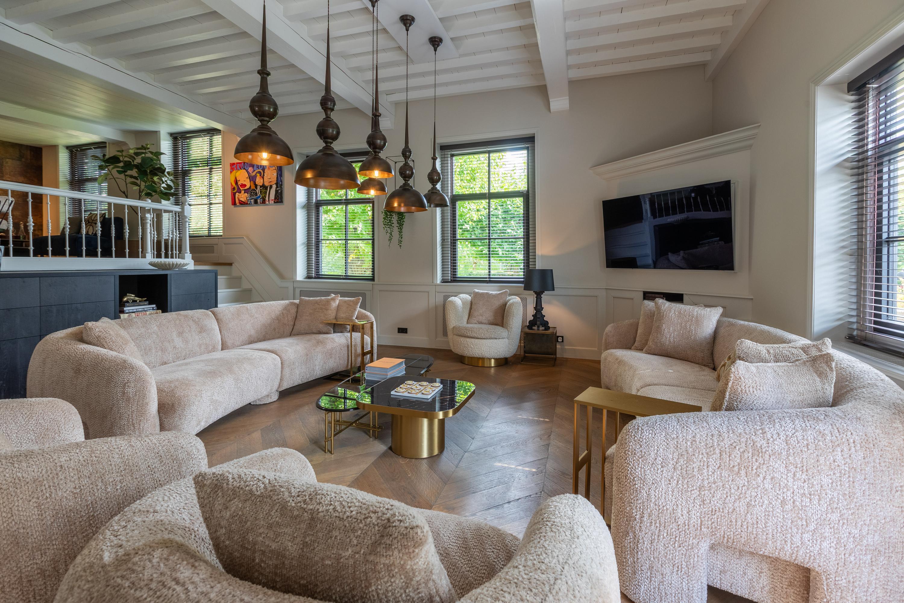 Al atravesar un portón eléctrico, el jardín revela céspedes en terrazas, borduras de plantas maduras y una zona de estar hundida, enmarcando vistas sobre los campos adyacentes de Midden-Delfland. La residencia principal ofrece amplios espacios, incluida una cocina sofisticada con isla de mármol y entresuelo, una serie de salones conectados con vigas auténticas y una sala de cine en la antigua quesería. La zona wellness invita al retiro con jacuzzi, saunas finlandesa e infrarroja, todo ello en una luminosa ampliación.