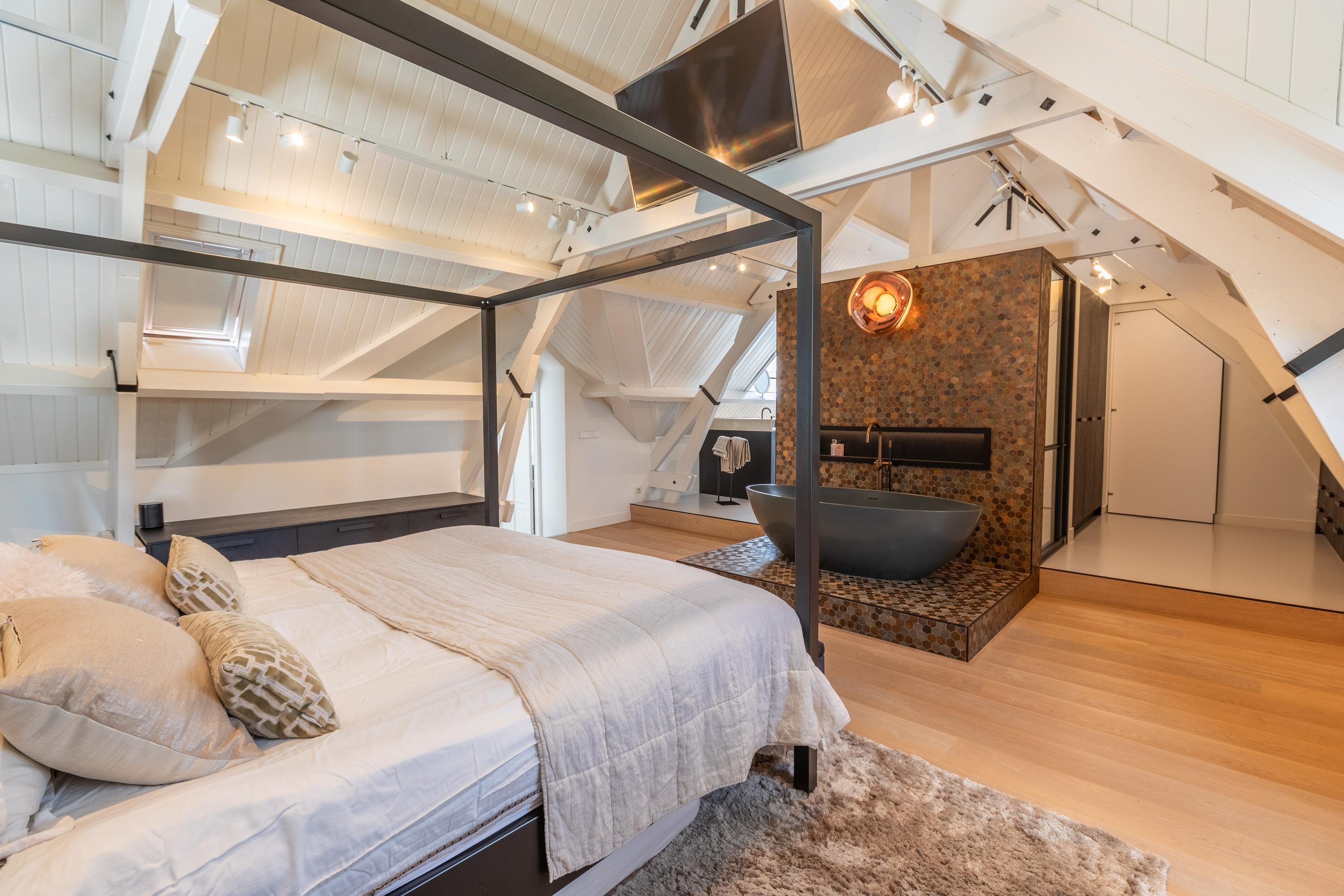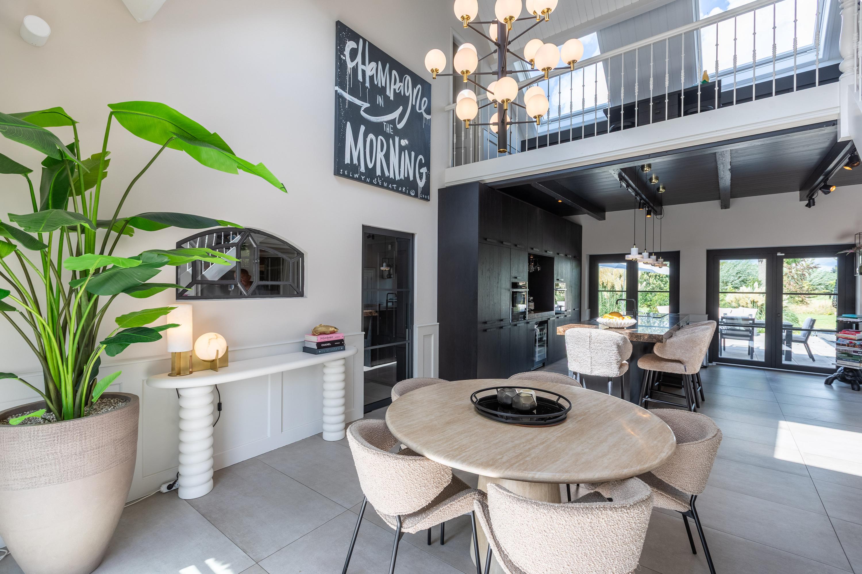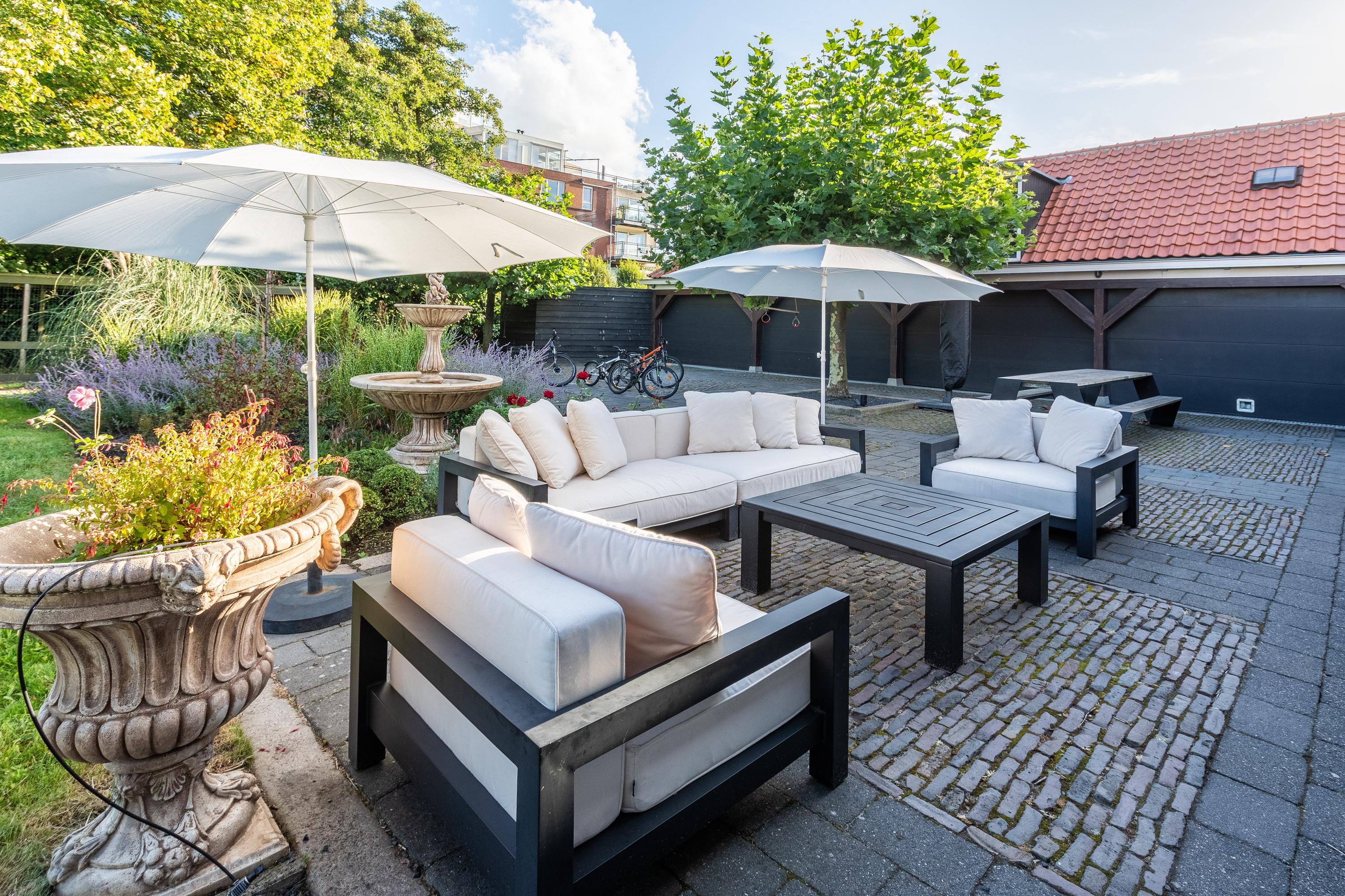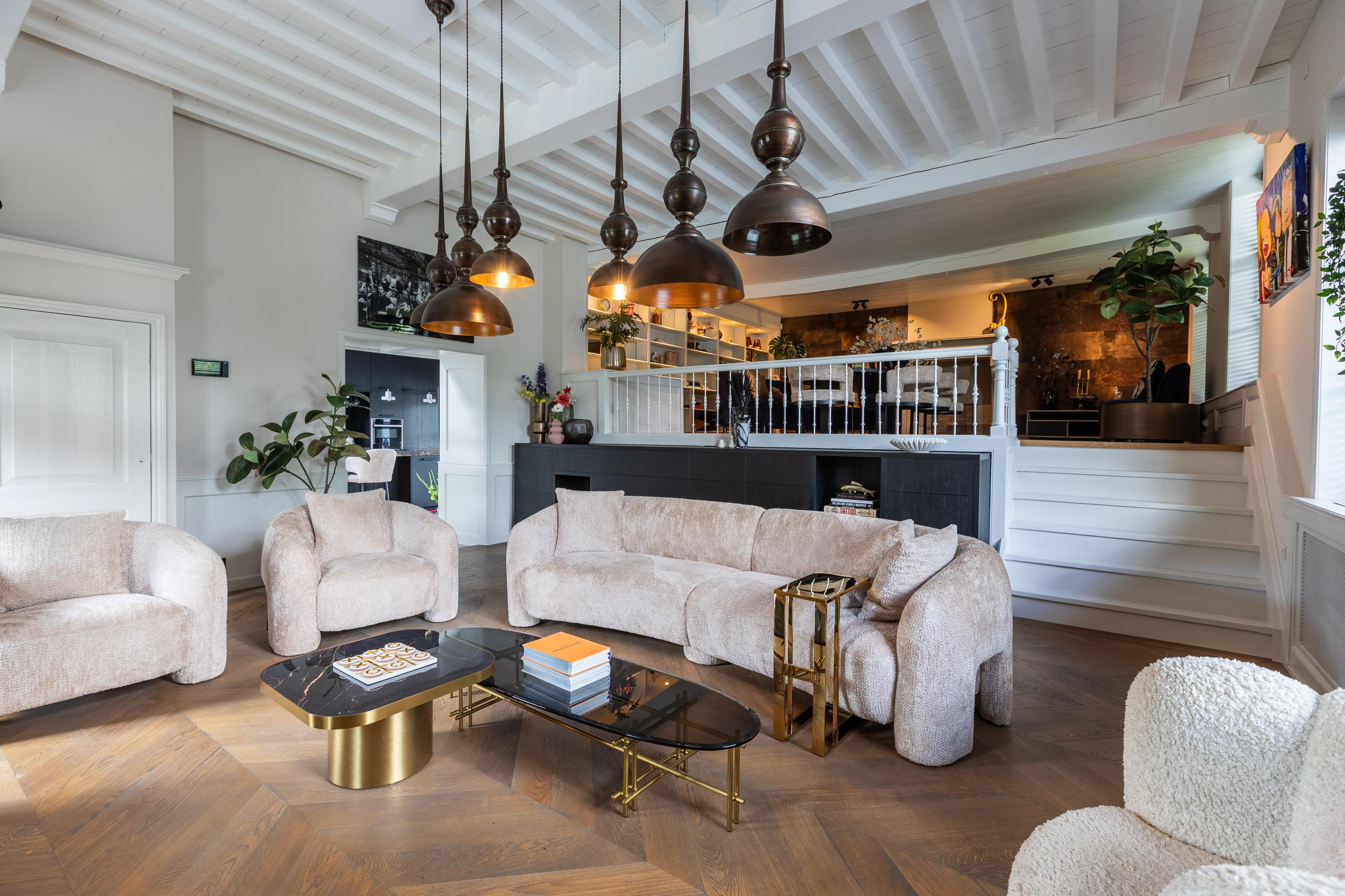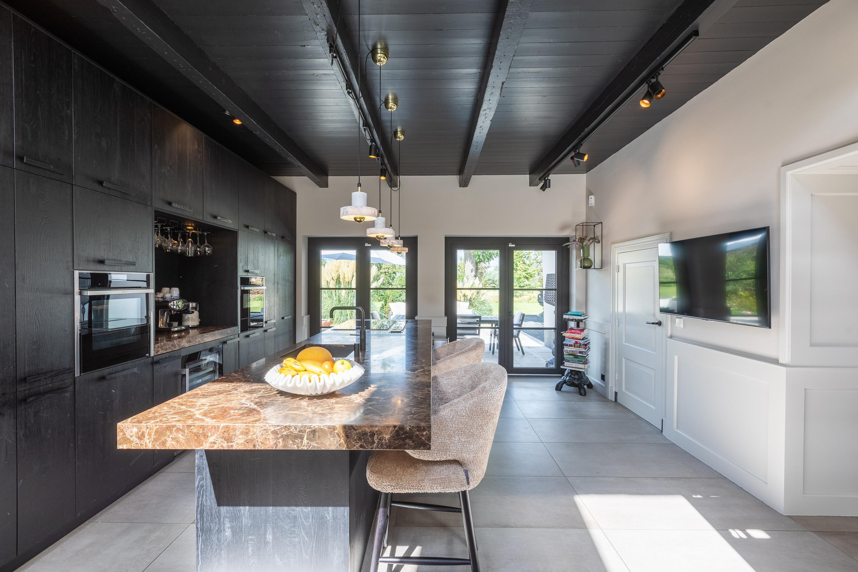 Al atravesar un portón eléctrico, el jardín revela céspedes en terrazas, borduras de plantas maduras y una zona de estar hundida, enmarcando vistas sobre los campos adyacentes de Midden-Delfland. La residencia principal ofrece amplios espacios, incluida una cocina sofisticada con isla de mármol y entresuelo, una serie de salones conectados con vigas auténticas y una sala de cine en la antigua quesería. La zona wellness invita al retiro con jacuzzi, saunas finlandesa e infrarroja, todo ello en una luminosa ampliación.