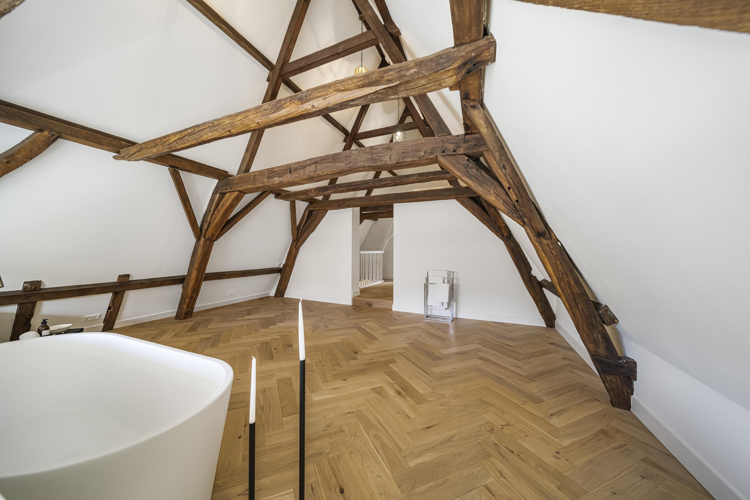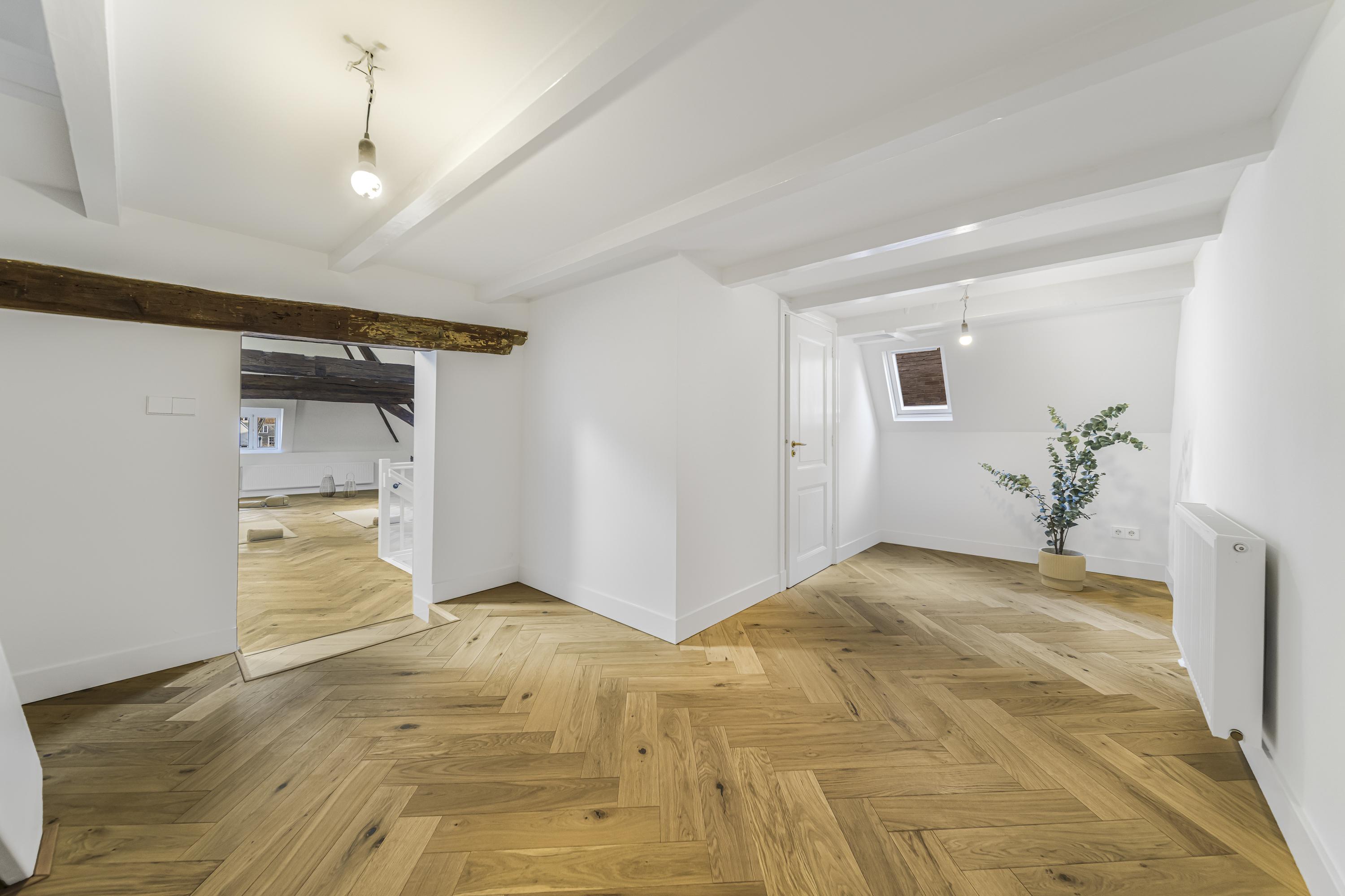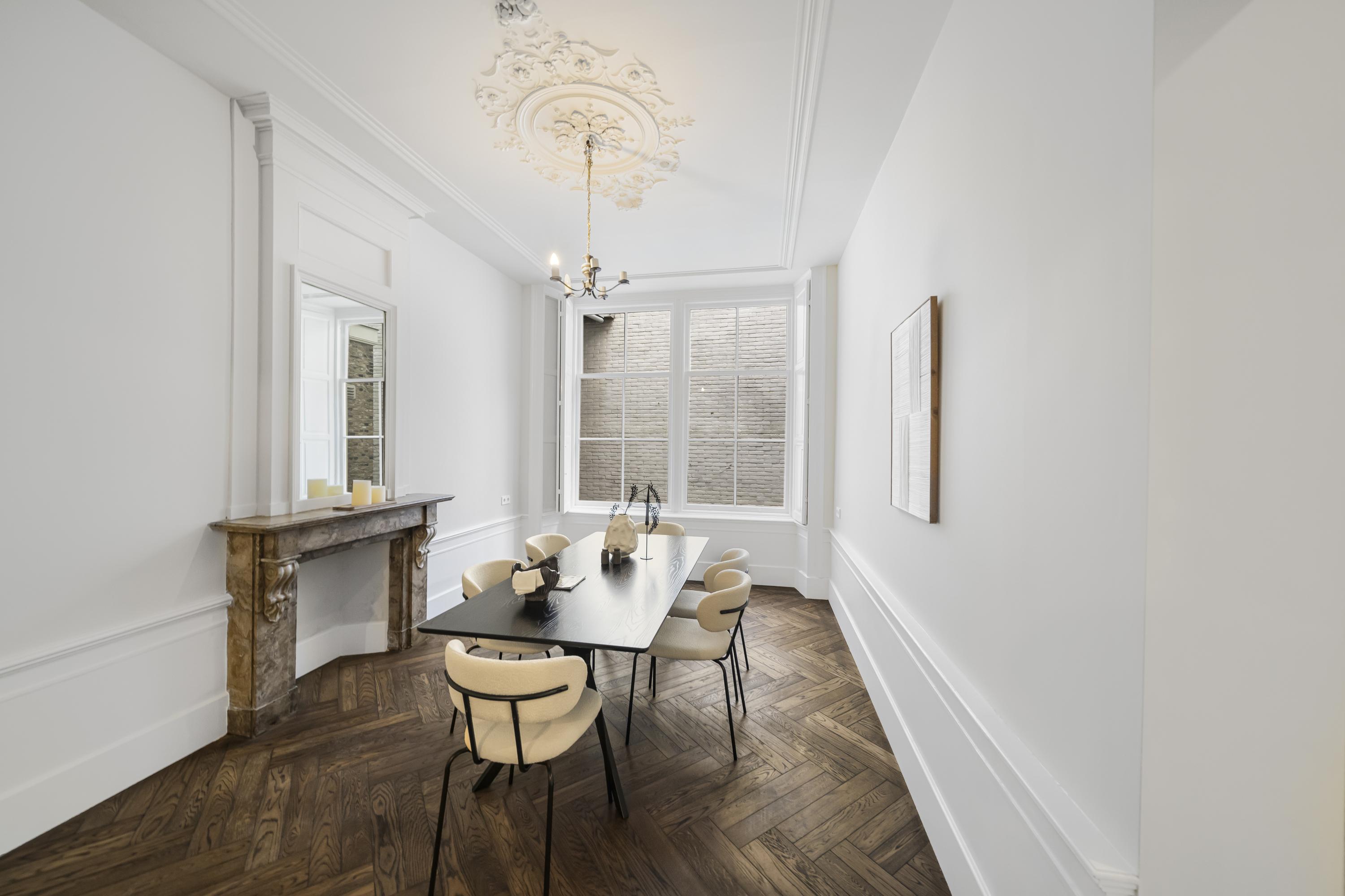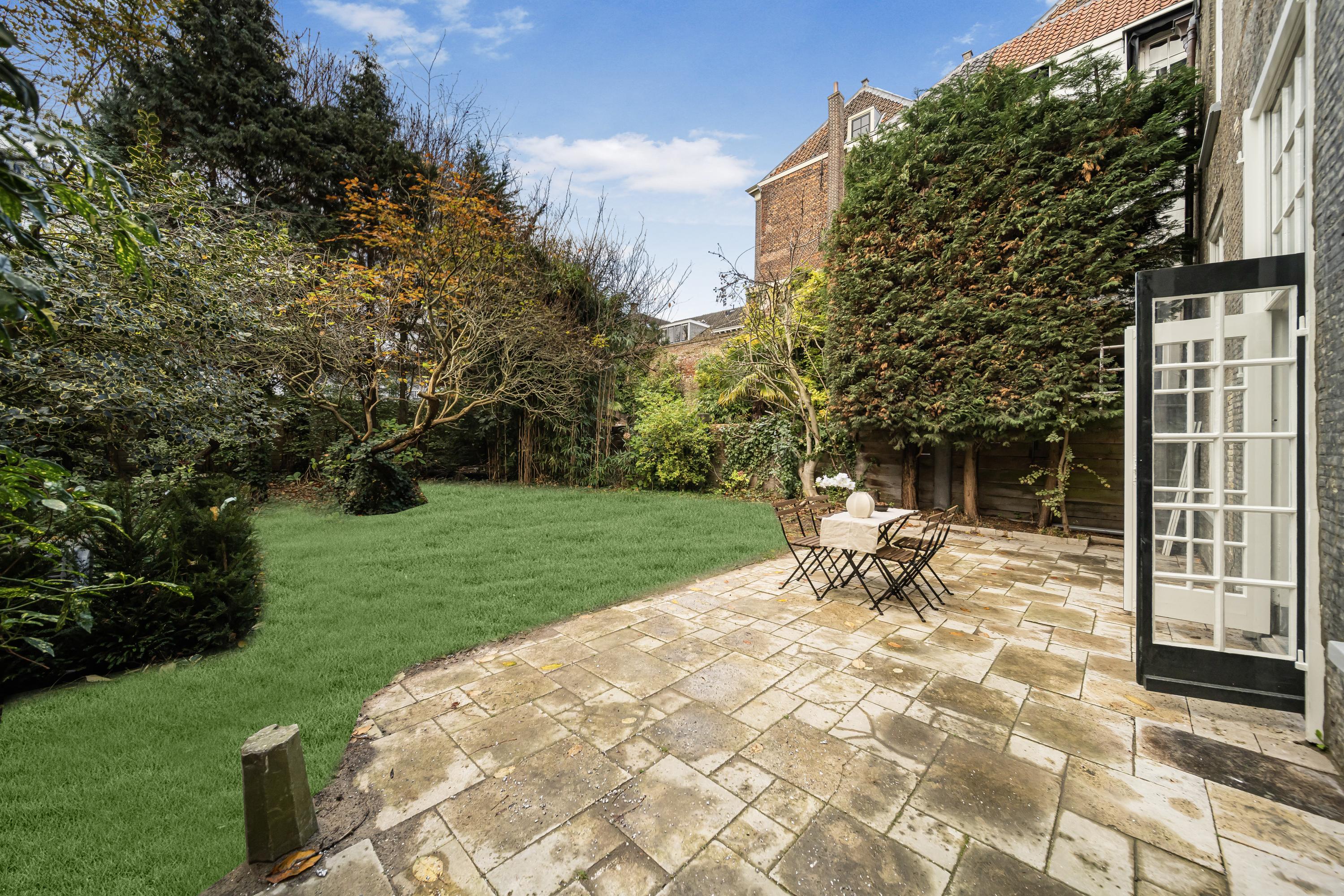 La disposición se extiende a lo largo de cuatro plantas. La planta baja presenta recibidores refinados con suelos de mármol en blanco y negro, espacios habitables y de trabajo flexibles, una luminosa sala de jardín y acceso a un jardín urbano privado en forma de L orientado al suroeste—un oasis poco común en el centro histórico de Delft. Seis dormitorios y cuatro baños distribuidos en las plantas superiores reciben abundante luz natural, además de contar con un altillo y una inspiradora estructura de techo.
