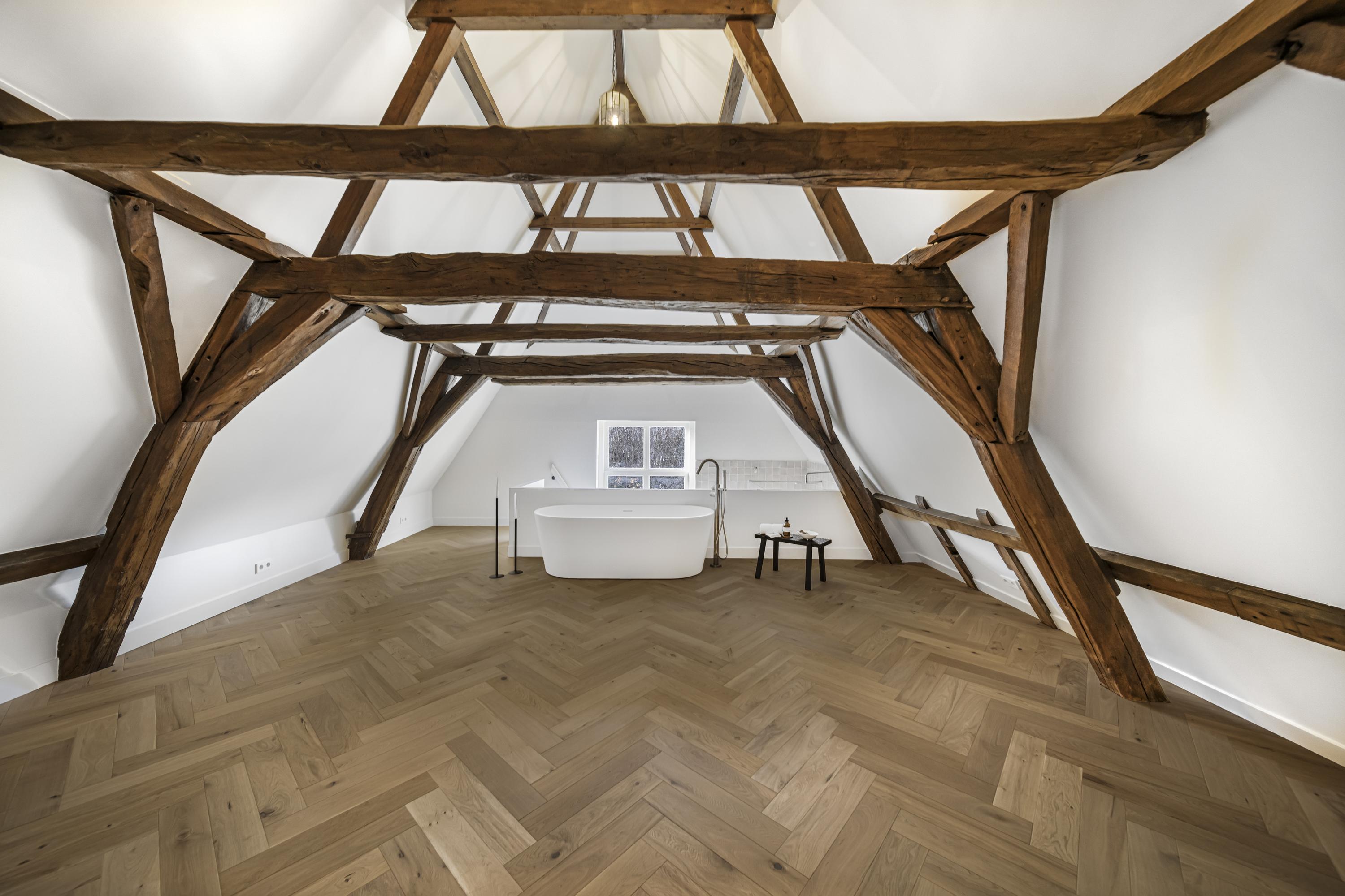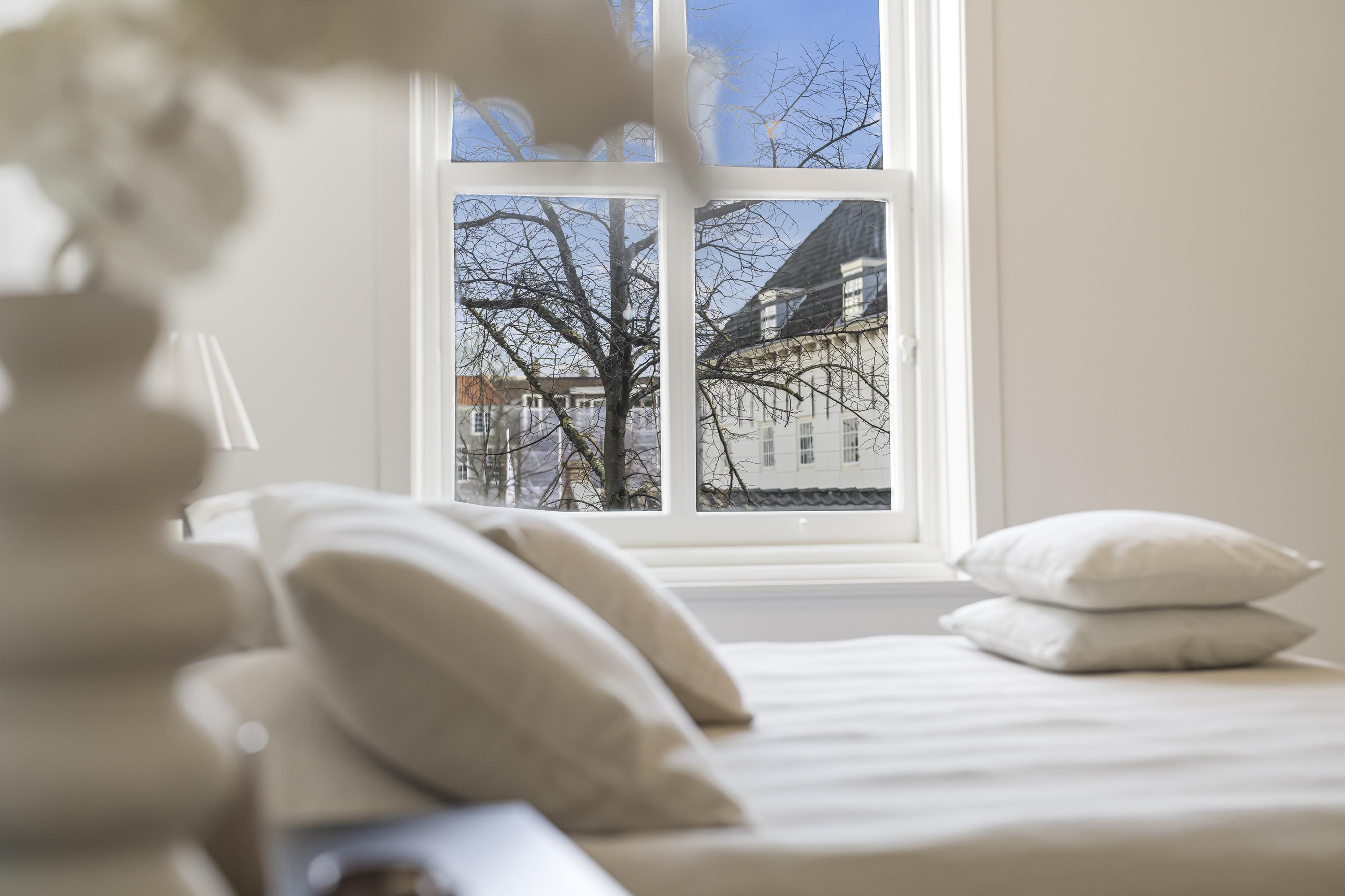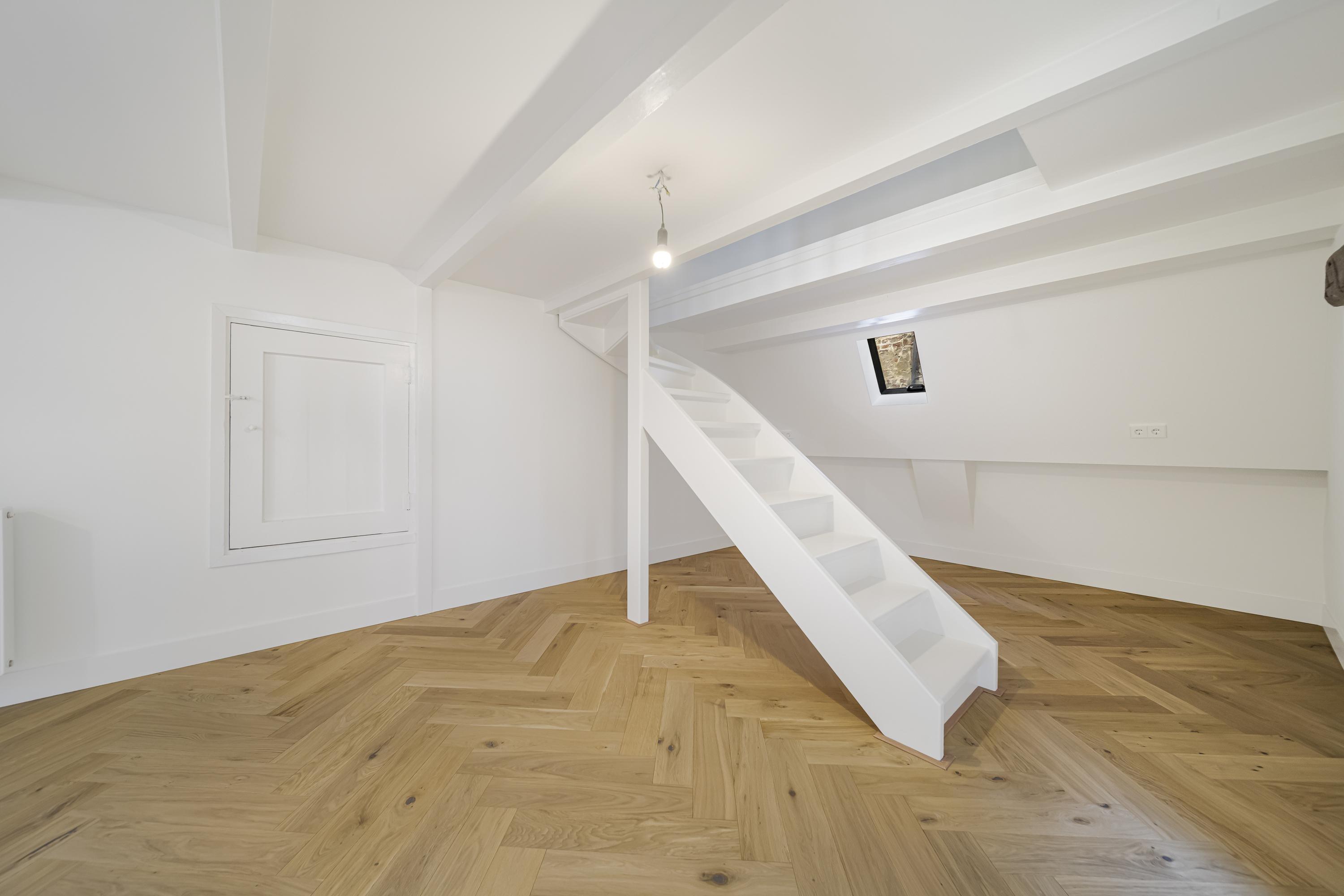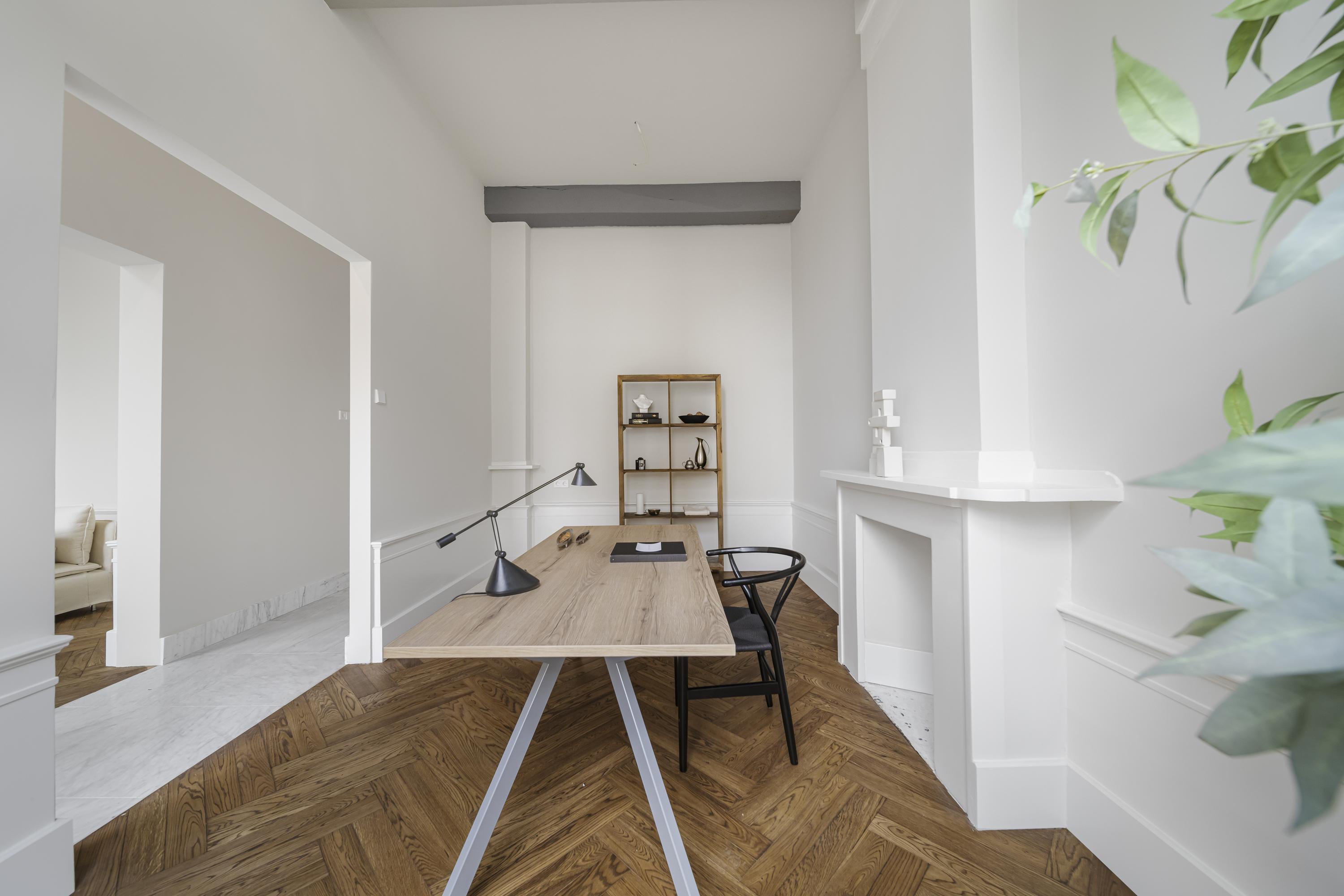 La disposición se extiende a lo largo de cuatro plantas. La planta baja presenta recibidores refinados con suelos de mármol en blanco y negro, espacios habitables y de trabajo flexibles, una luminosa sala de jardín y acceso a un jardín urbano privado en forma de L orientado al suroeste—un oasis poco común en el centro histórico de Delft. Seis dormitorios y cuatro baños distribuidos en las plantas superiores reciben abundante luz natural, además de contar con un altillo y una inspiradora estructura de techo.