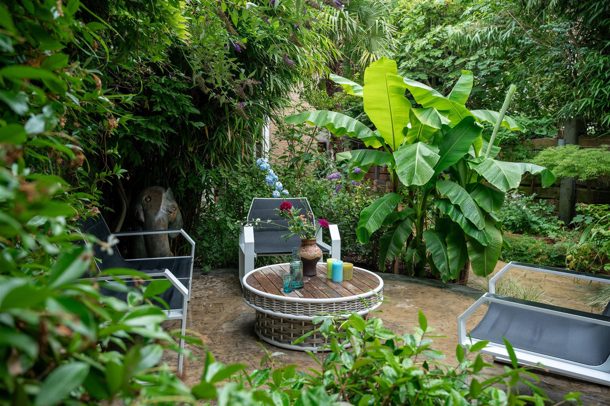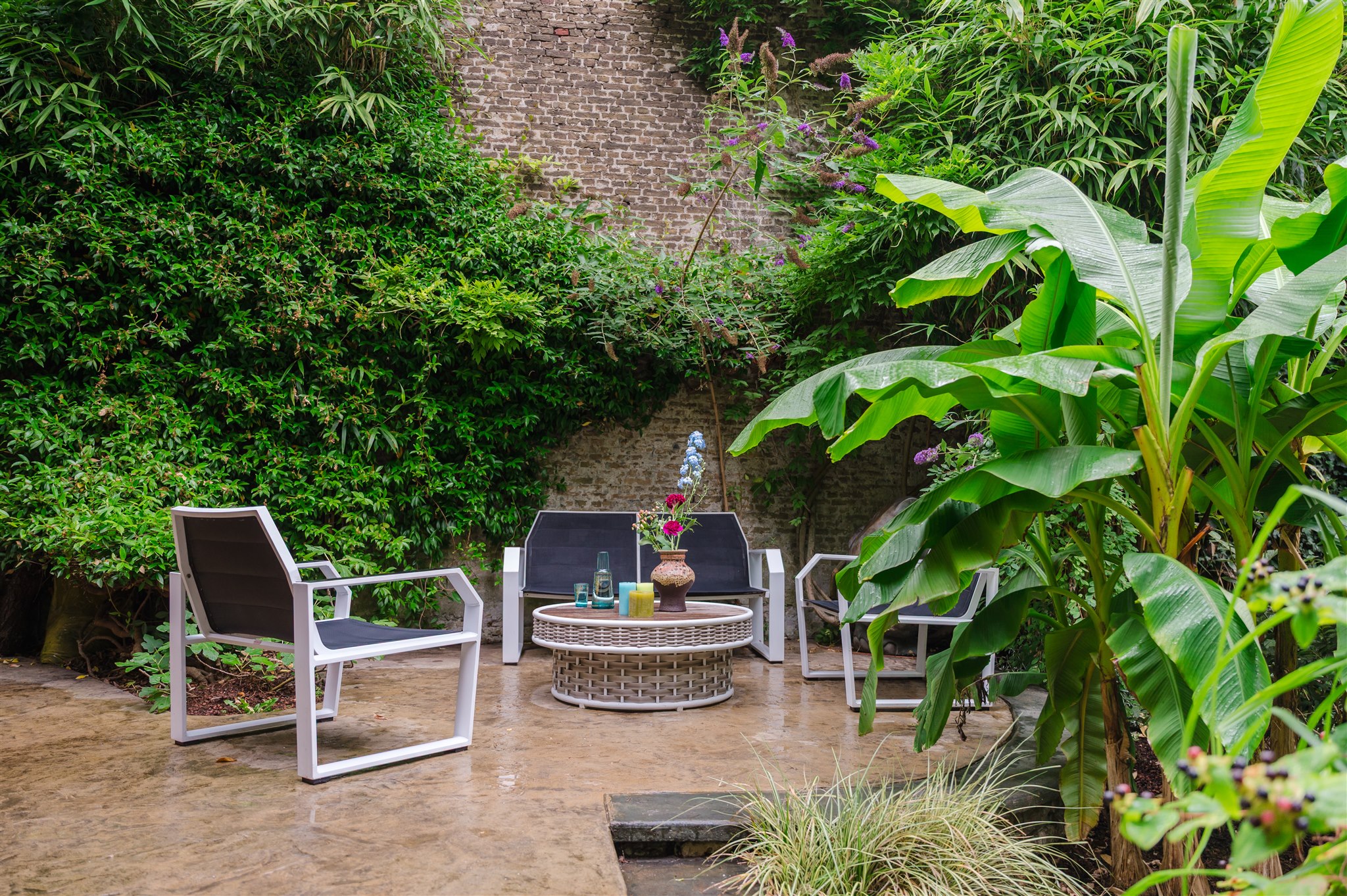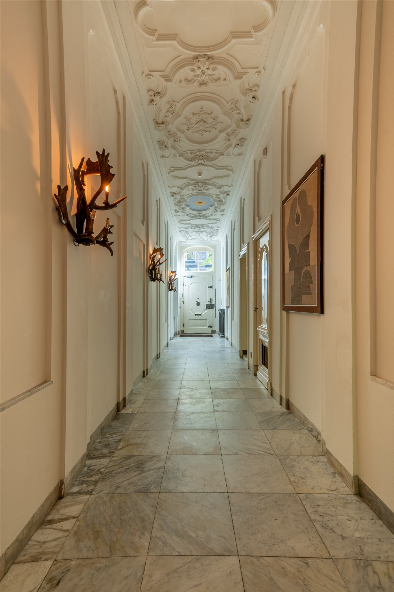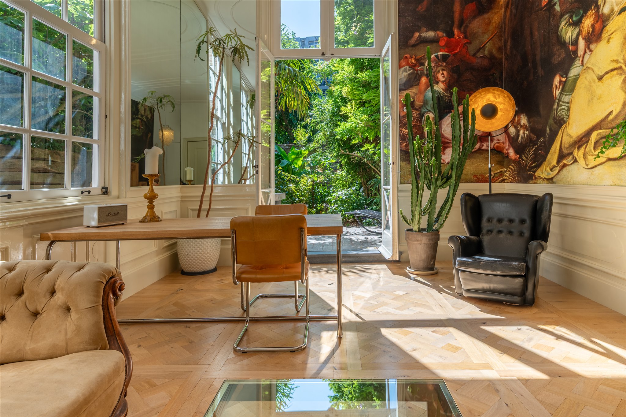 La planta baja recibe con un vestíbulo de mármol, elegantes espacios de oficina y una bodega abovedada que da paso a un jardín tropical de 100 m², con cobertizo de piedra y acceso privado y discreto a tres plazas de aparcamiento. La sala de jardín, con suelo radiante y paredes de acabado pictórico, une el interior y el exterior. La vida familiar y el entretenimiento confluyen en el amplio salón con suelos de roble y techos de cuatro metros de altura, y en la cocina Bulthaup situada en la parte trasera, equipada con electrodomésticos Gaggenau.