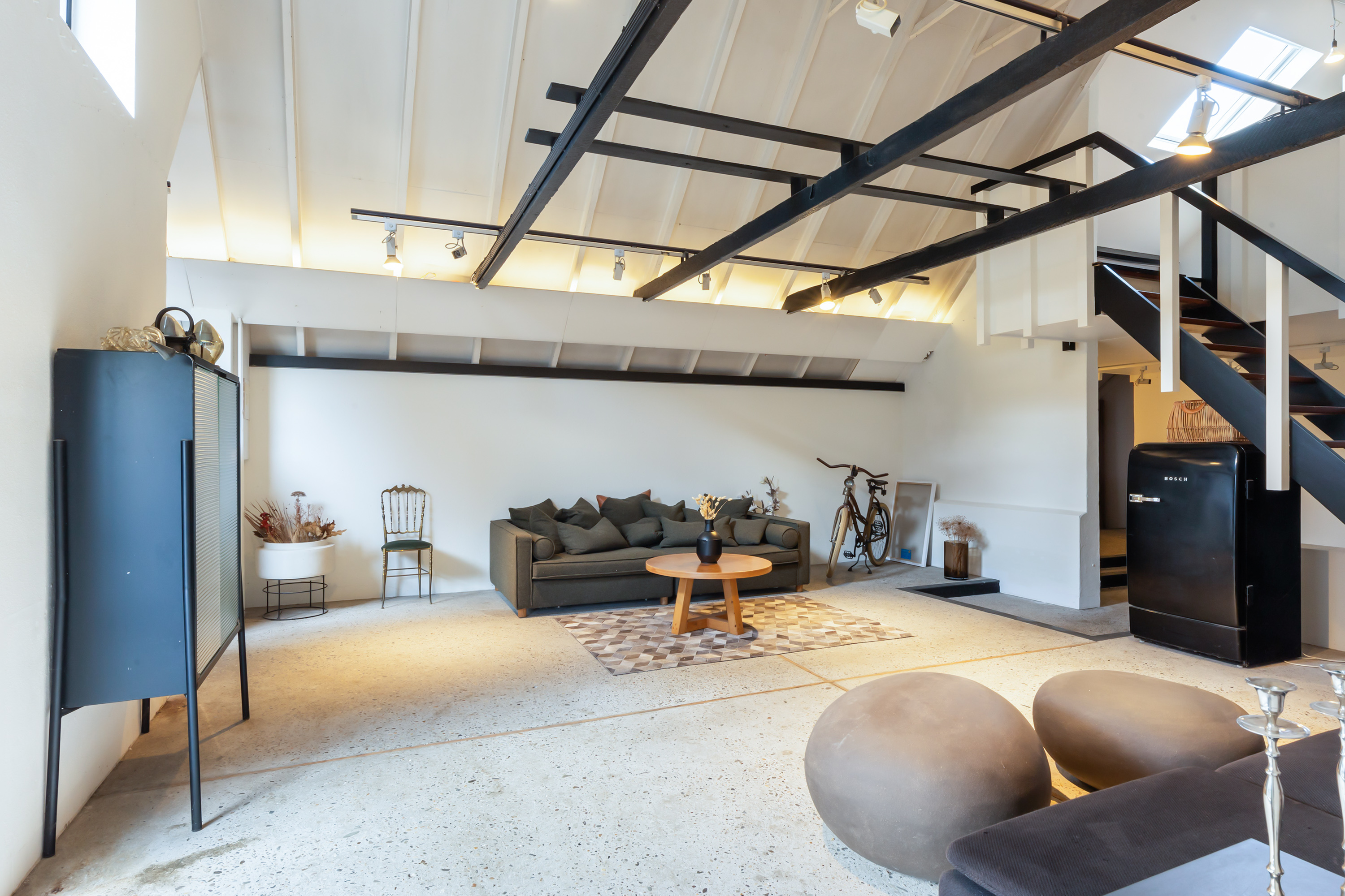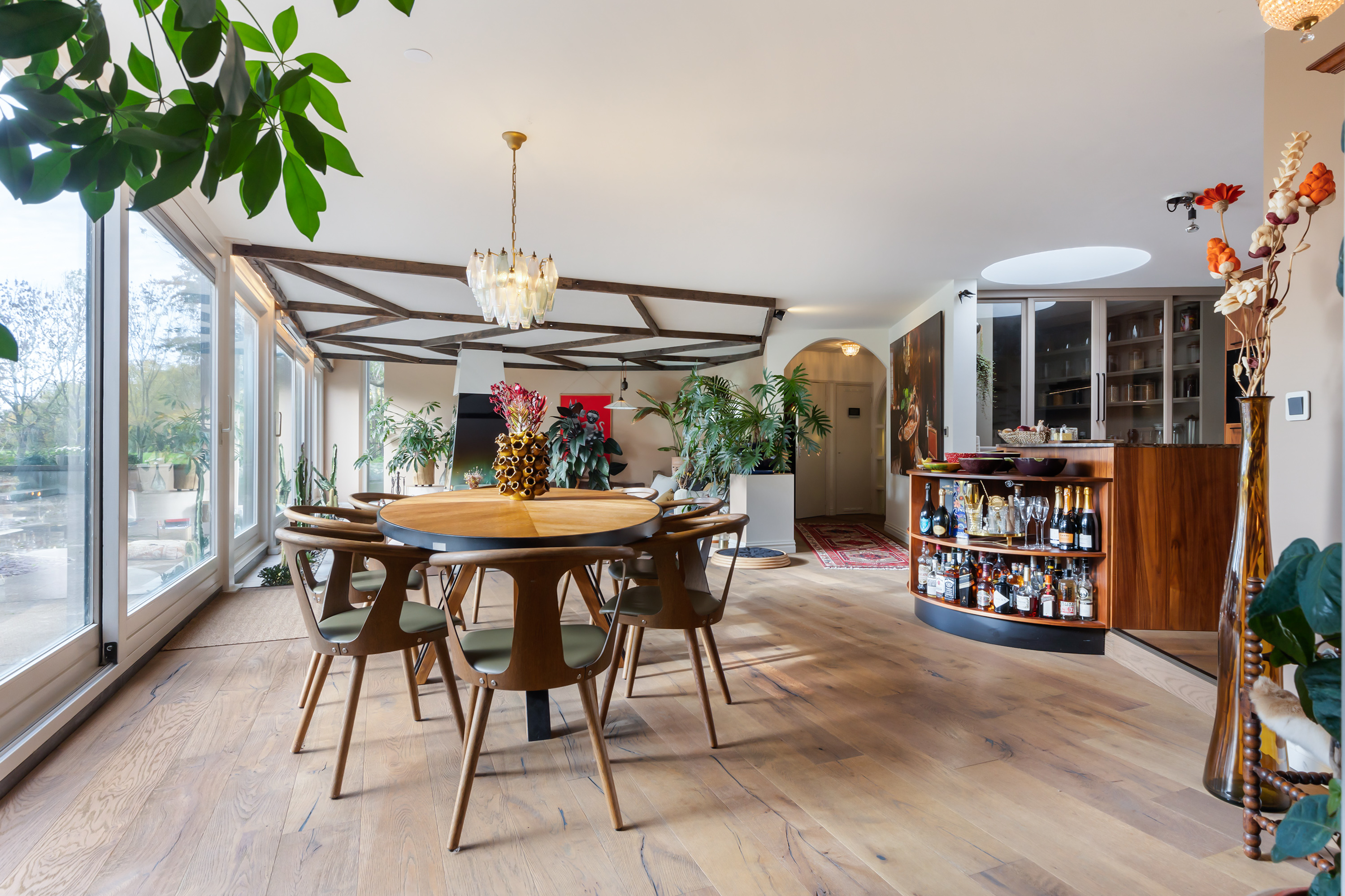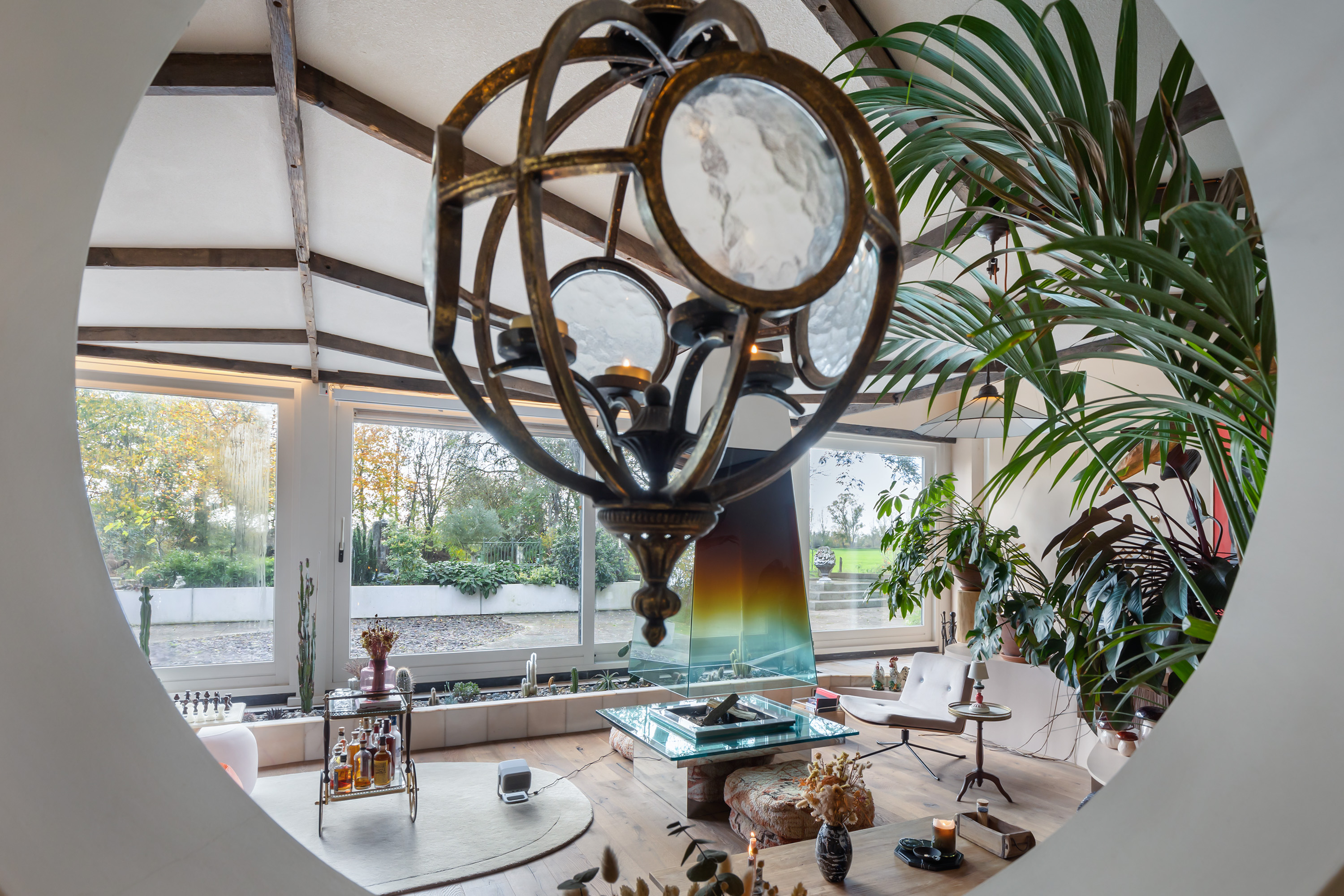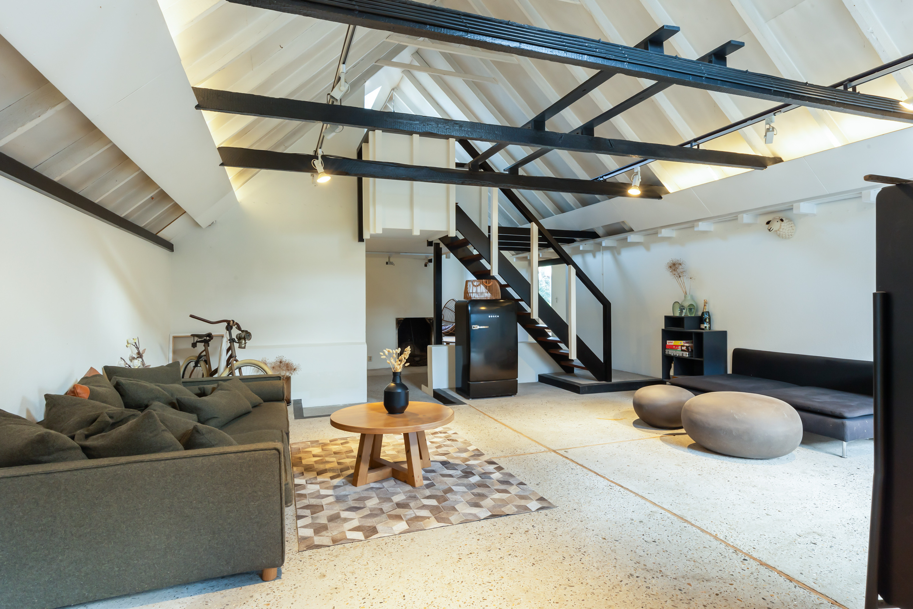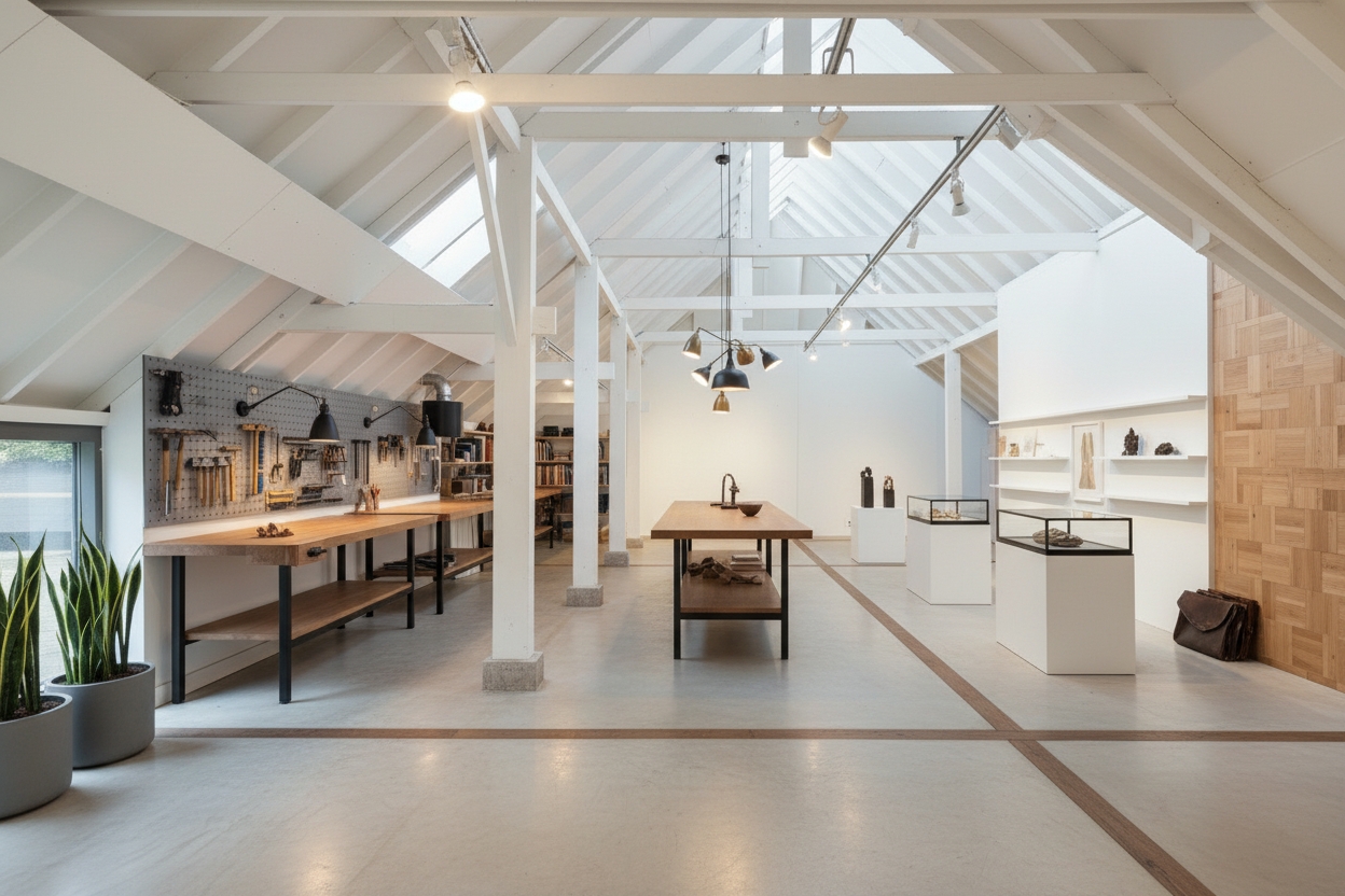 El espacio comercial adyacente ofrece aún más posibilidades para atelier, showroom o alojamiento para invitados, con vigas de madera negra y amplios ventanales que exhiben su artesanía y presencia. En el exterior, el jardín se funde con la naturaleza agrícola e incluye un pabellón, una terraza flotante y una plataforma privada, generando un refugio de intimidad. Árboles maduros y un diseño paisajístico pensado completan la sensación de serenidad.