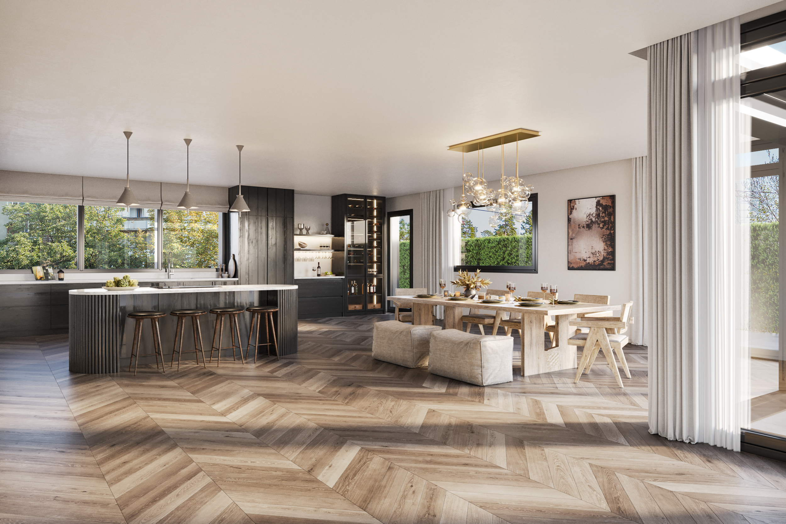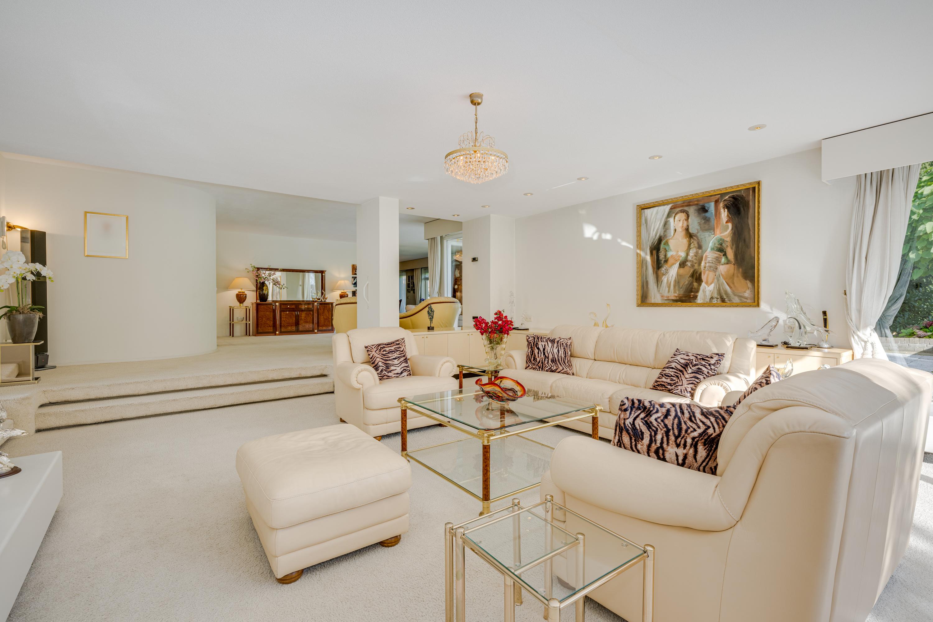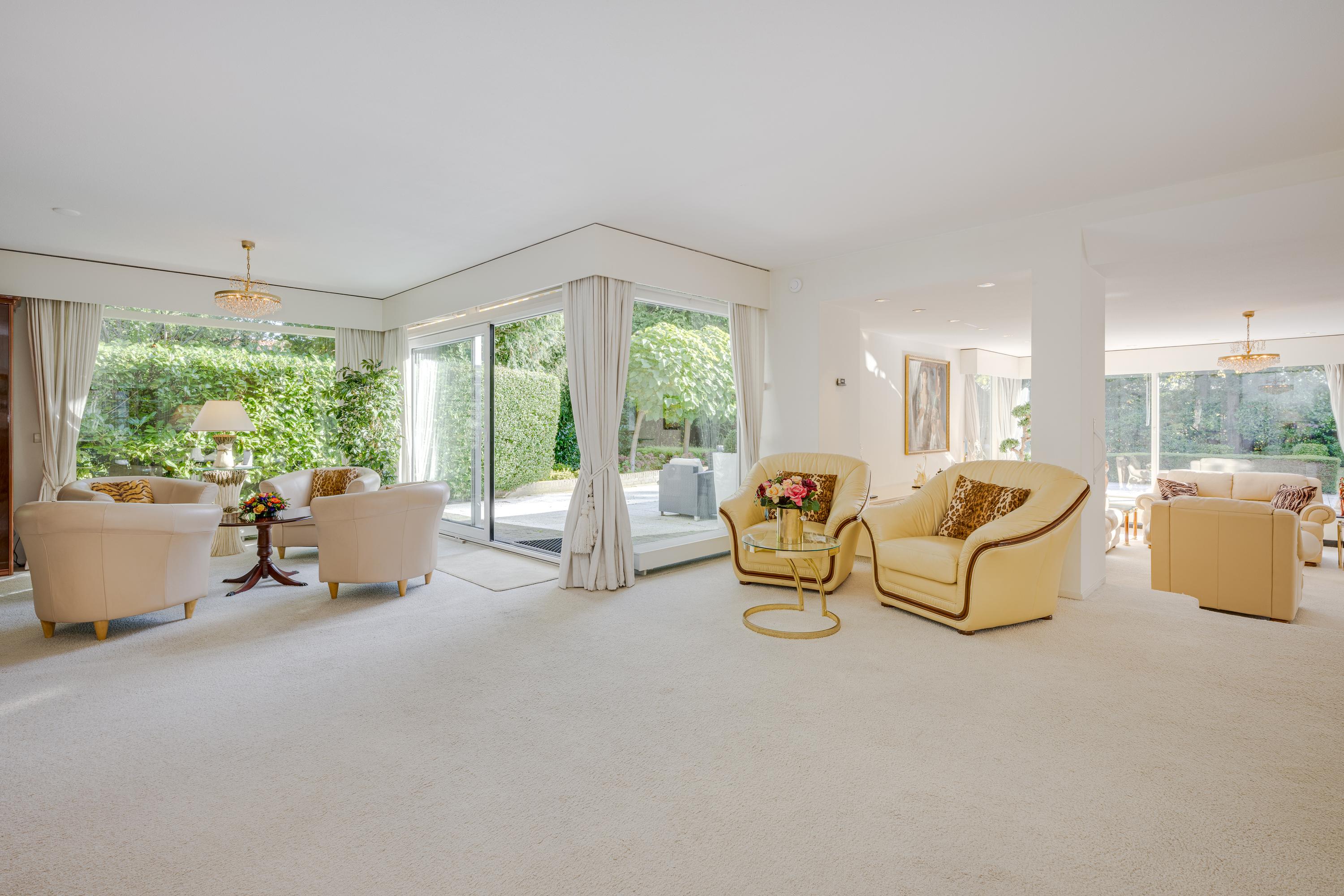 La residencia principal ofrece un amplio vestíbulo de entrada de doble altura y una imponente escalera que distribuye hacia generosos salones, comedores y salas familiares que suman más de 100 m². Los techos altos, grandes ventanales y puertas corredizas conectan cada ambiente a soleadas terrazas que rodean la vivienda, enmarcando vistas serenas de los jardines consolidados. Las comodidades modernas están integradas de forma impecable, como el control climático avanzado, ventilación mecánica, aislamiento de alta gama y sistema de sonido Bang & Olufsen, que enriquecen la calidad de vida diaria.