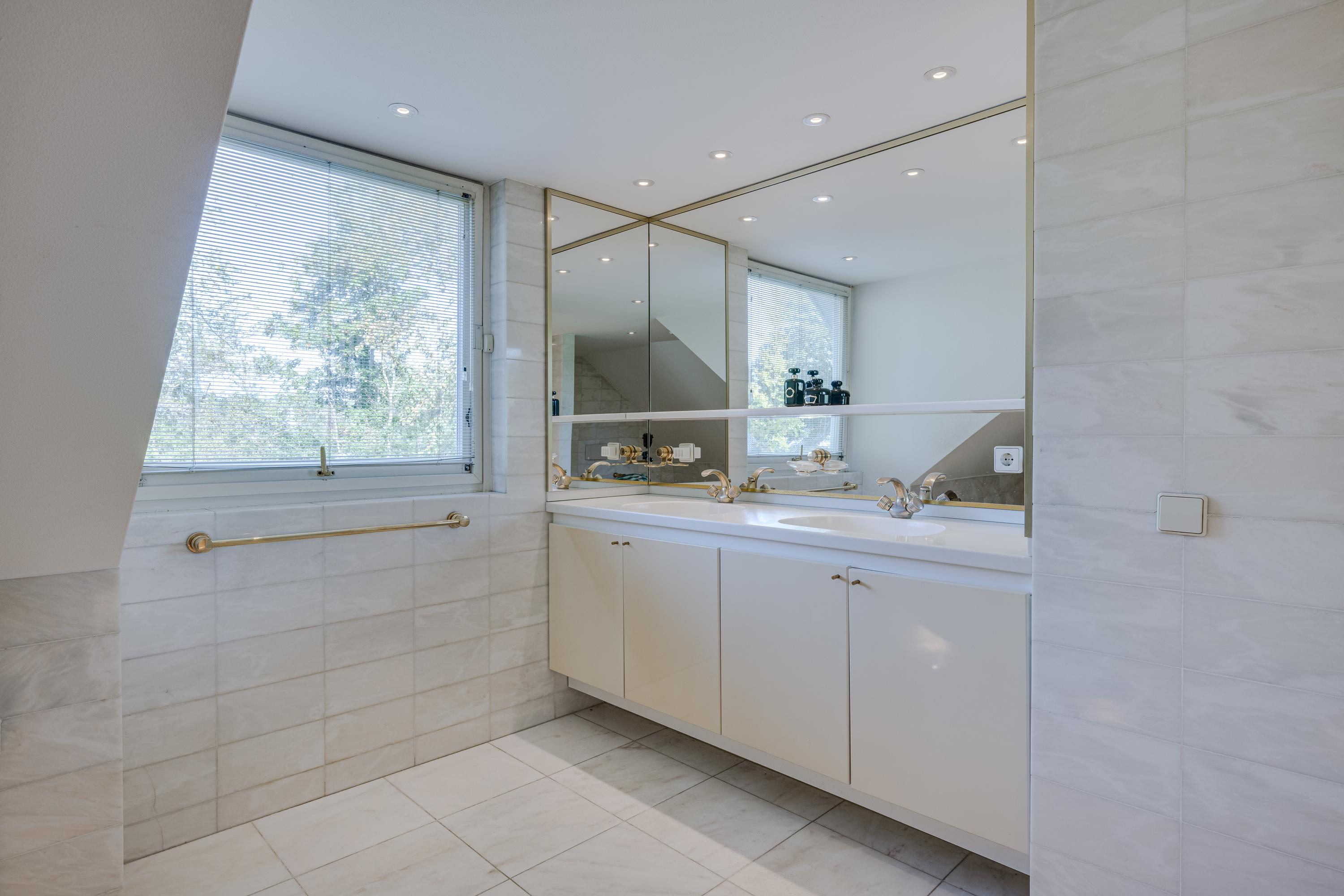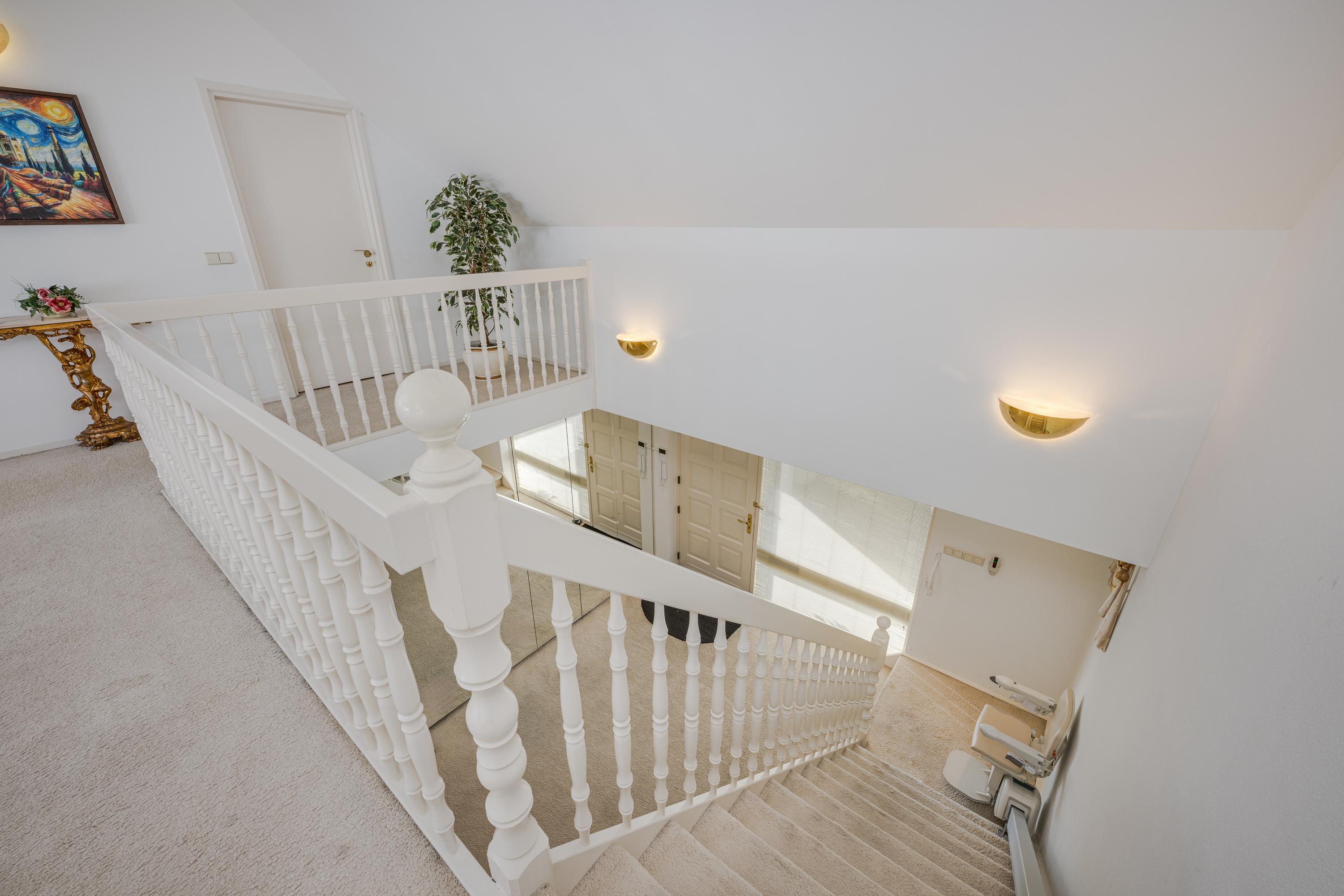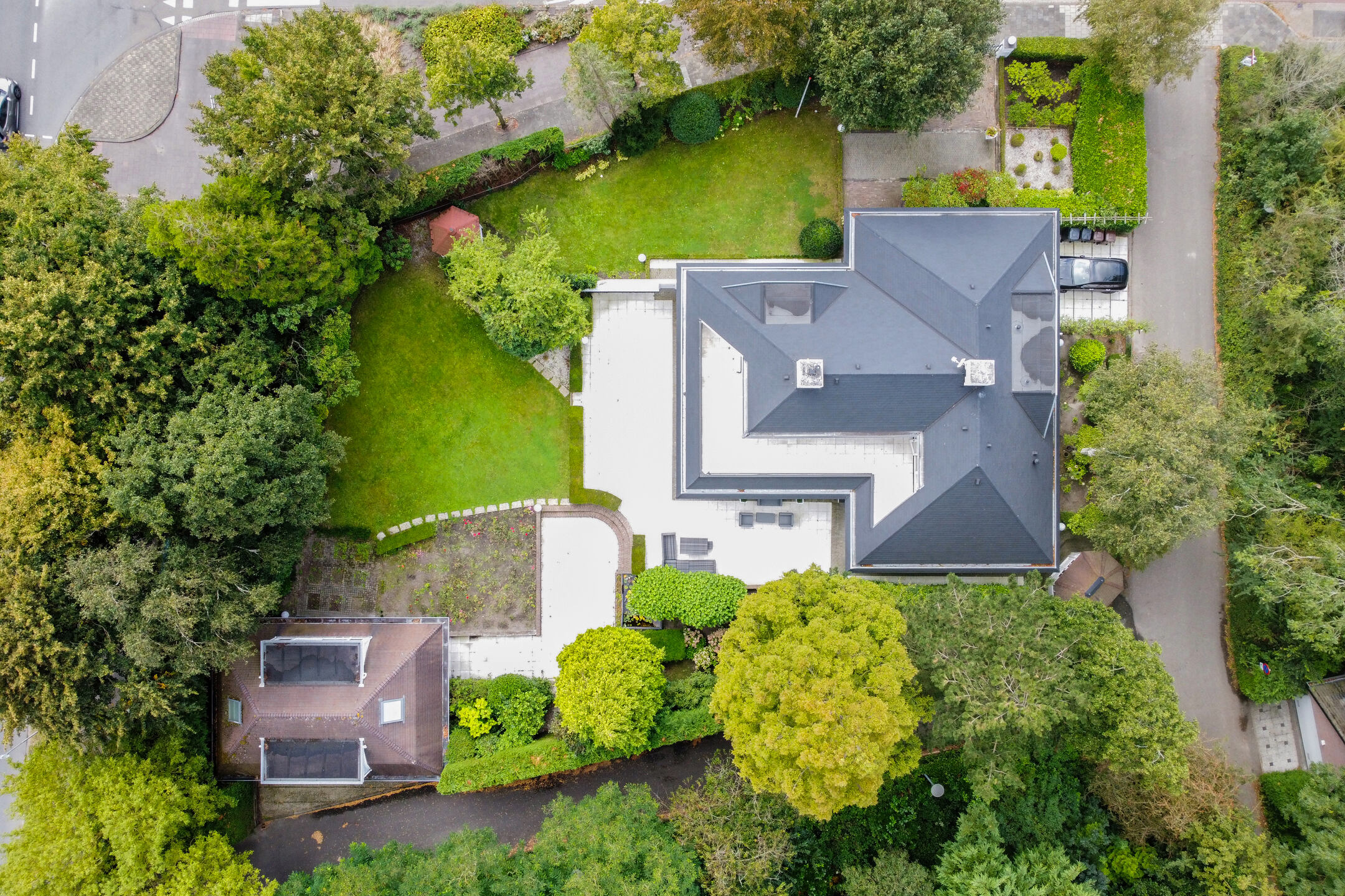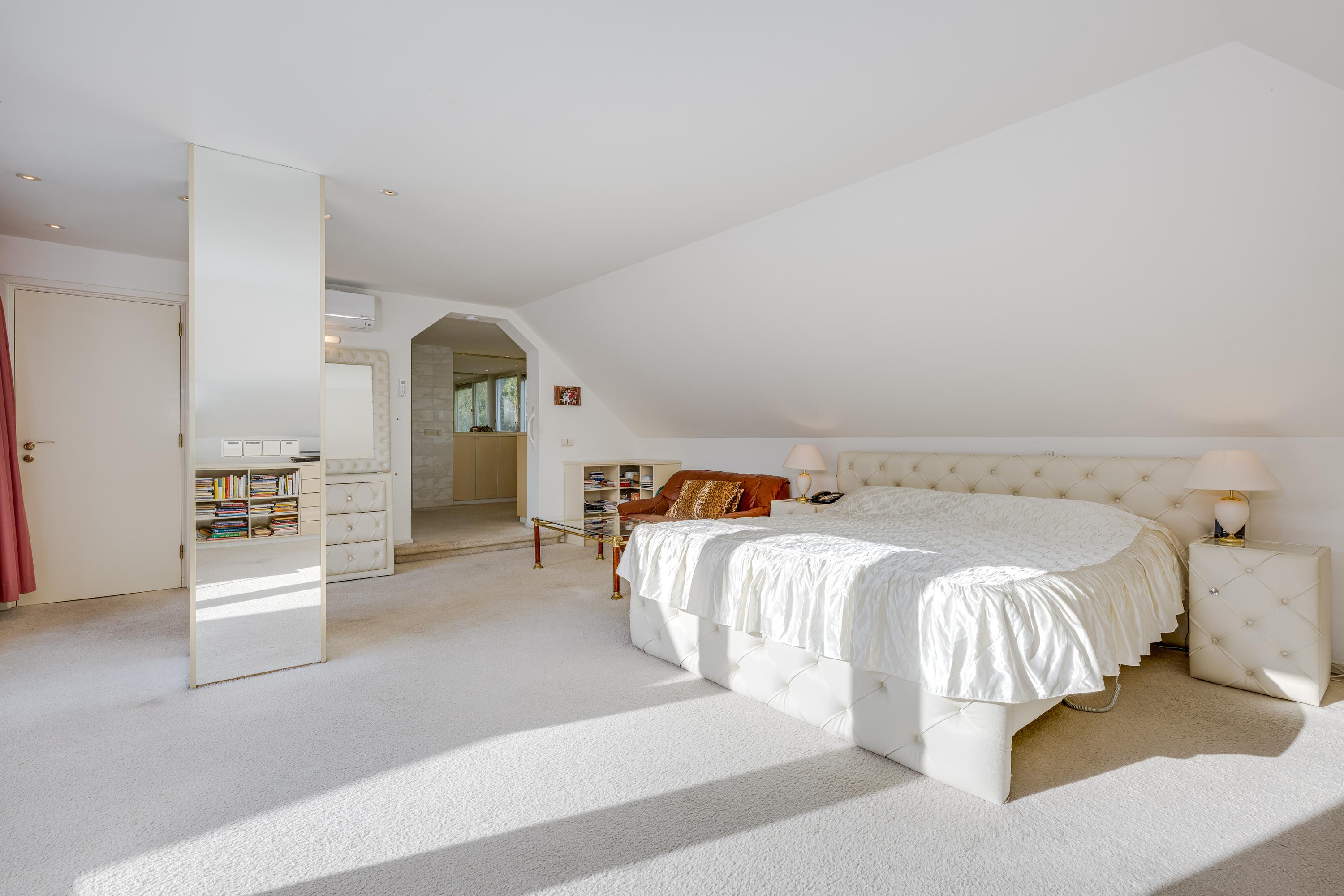 La residencia principal ofrece un amplio vestíbulo de entrada de doble altura y una imponente escalera que distribuye hacia generosos salones, comedores y salas familiares que suman más de 100 m². Los techos altos, grandes ventanales y puertas corredizas conectan cada ambiente a soleadas terrazas que rodean la vivienda, enmarcando vistas serenas de los jardines consolidados. Las comodidades modernas están integradas de forma impecable, como el control climático avanzado, ventilación mecánica, aislamiento de alta gama y sistema de sonido Bang & Olufsen, que enriquecen la calidad de vida diaria.