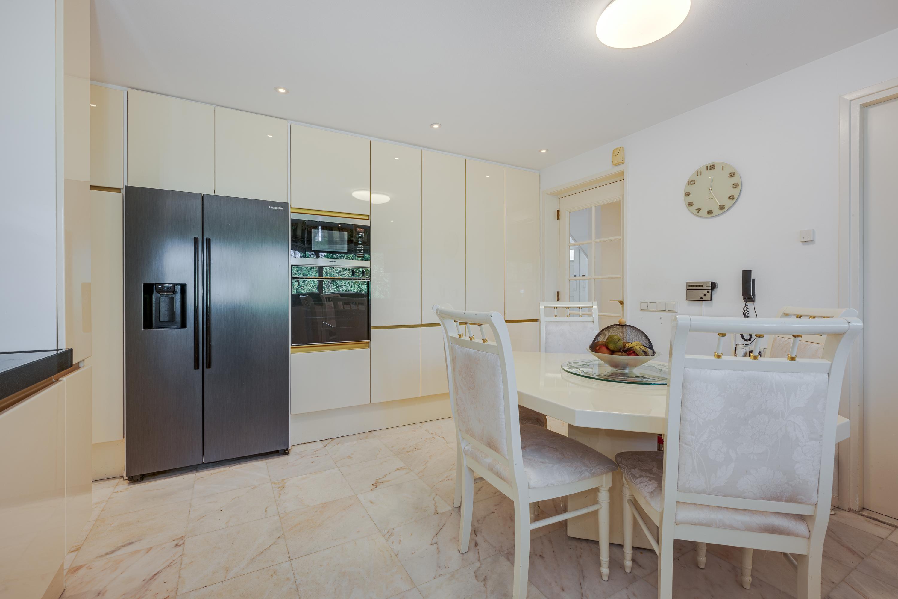 La planta baja cuenta con una cocina contemporánea equipada con electrodomésticos Miele y acceso a una entrada de servicio, además de una suite de invitados con baño privado. En la planta superior, la suite principal integra dos vestidores, un espacioso baño en suite con jacuzzi y acceso directo a una amplia terraza en la azotea. Dos dormitorios adicionales comparten acceso a otra terraza y a un baño, contribuyendo al diseño equilibrado.