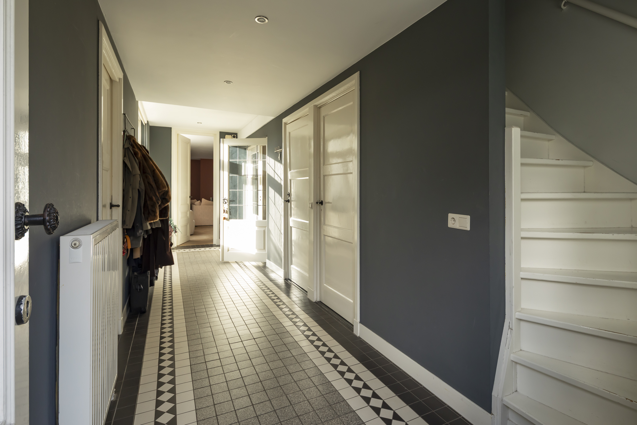Aangezien het vroeger 2 woonhuizen waren, zijn er in feite 2 voordeuren, 2 entrées en dus 2 hallen met een trapopgang naar de verdieping.