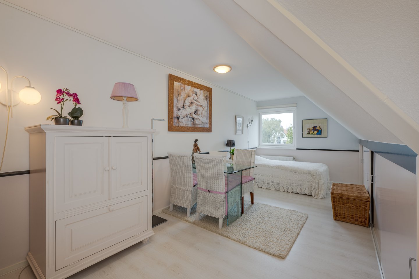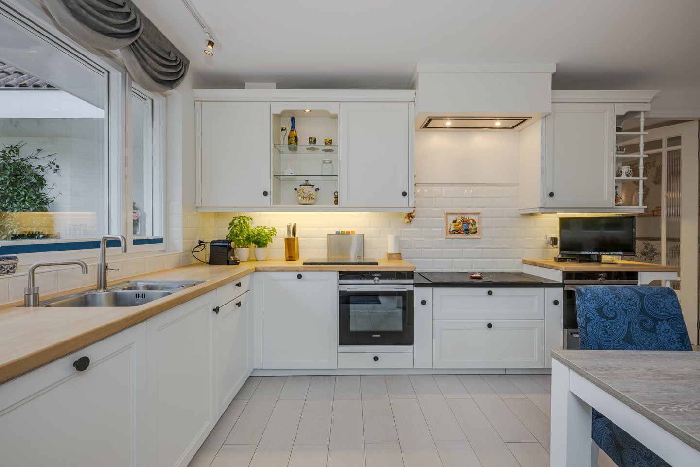 En el interior, la villa presenta un amplio vestíbulo que conduce a un luminoso salón. Los grandes ventanales y puertas francesas enmarcan las vistas al jardín y al agua, complementados por una chimenea de gas y calefacción por suelo radiante en toda la planta baja. La cocina ofrece tanto un espacio de trabajo como un punto de encuentro social, mientras que el garaje adjunto dispone de puerta eléctrica y conexiones de servicios dedicadas. En la planta superior, tres dormitorios y un baño de lujo renovado en 2022 con calefacción por suelo radiante y ducha a ras de suelo conforman la zona privada. Un vestidor y un generoso altillo de almacenamiento aportan flexibilidad, y la realización de un futuro cuarto dormitorio es totalmente viable.