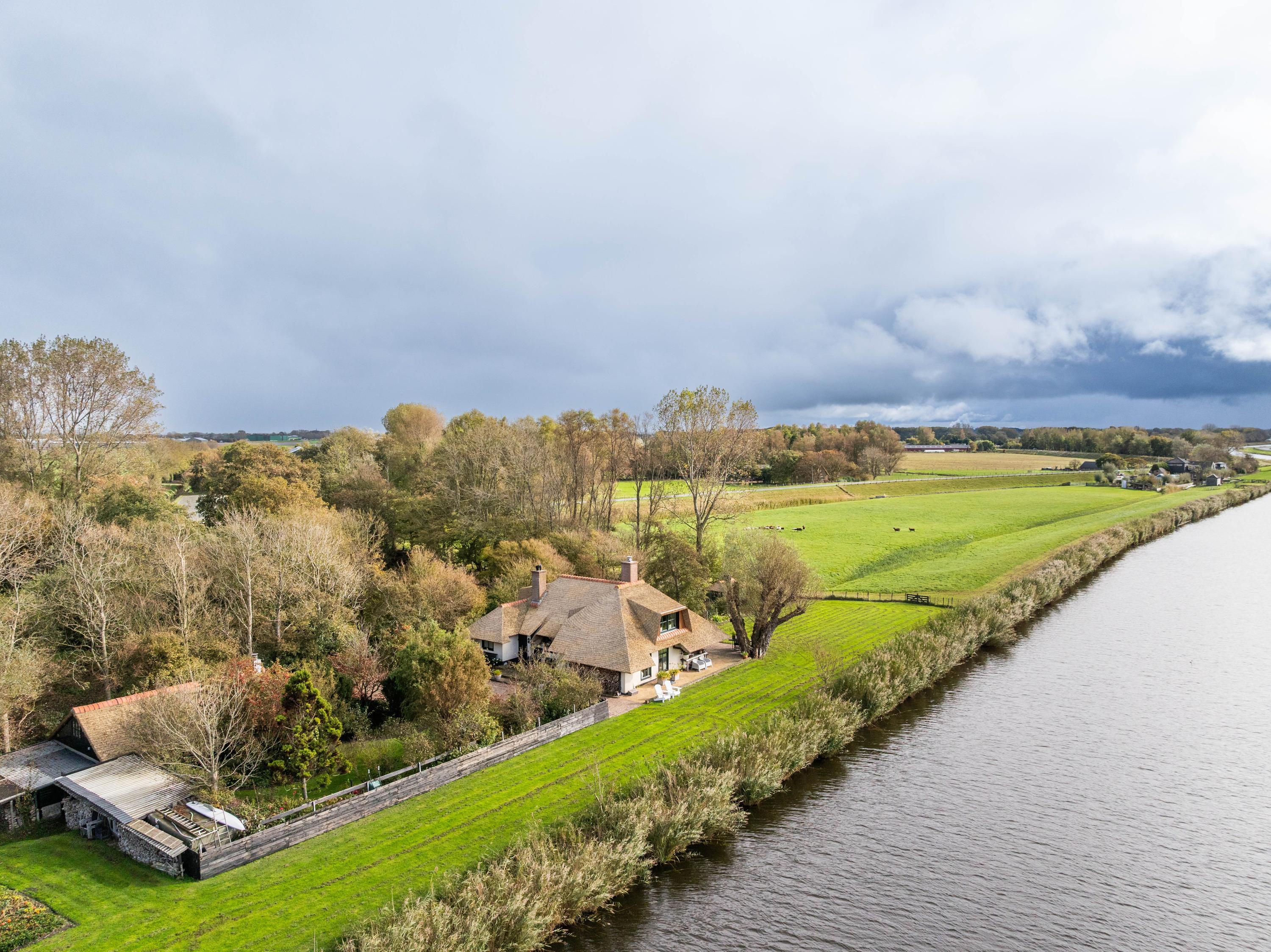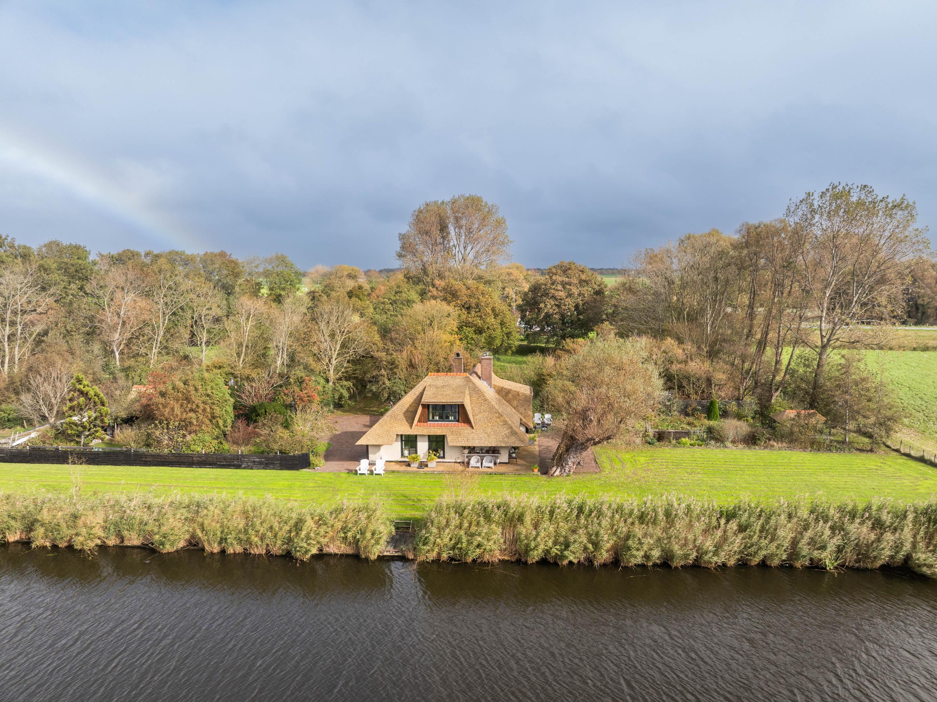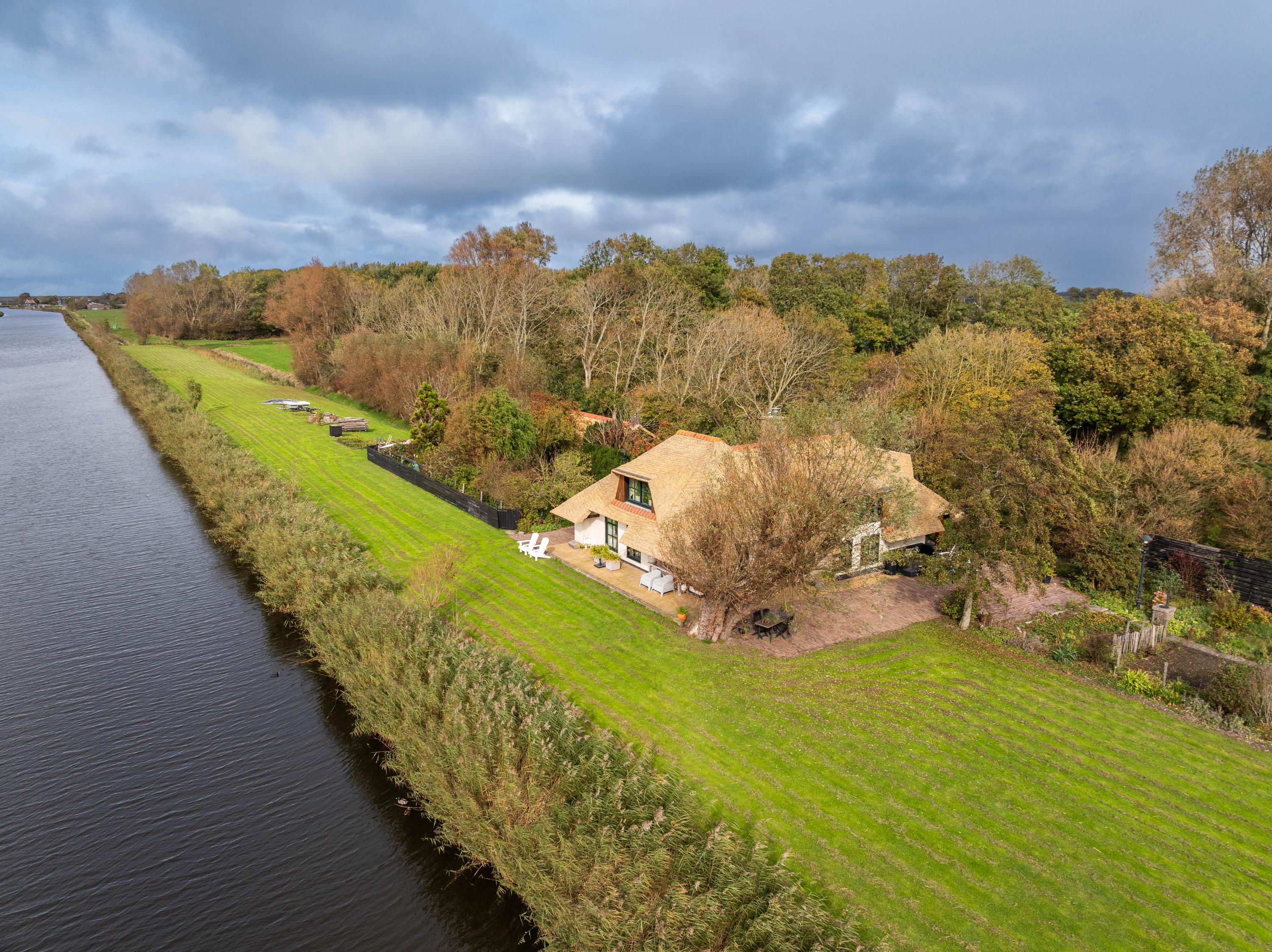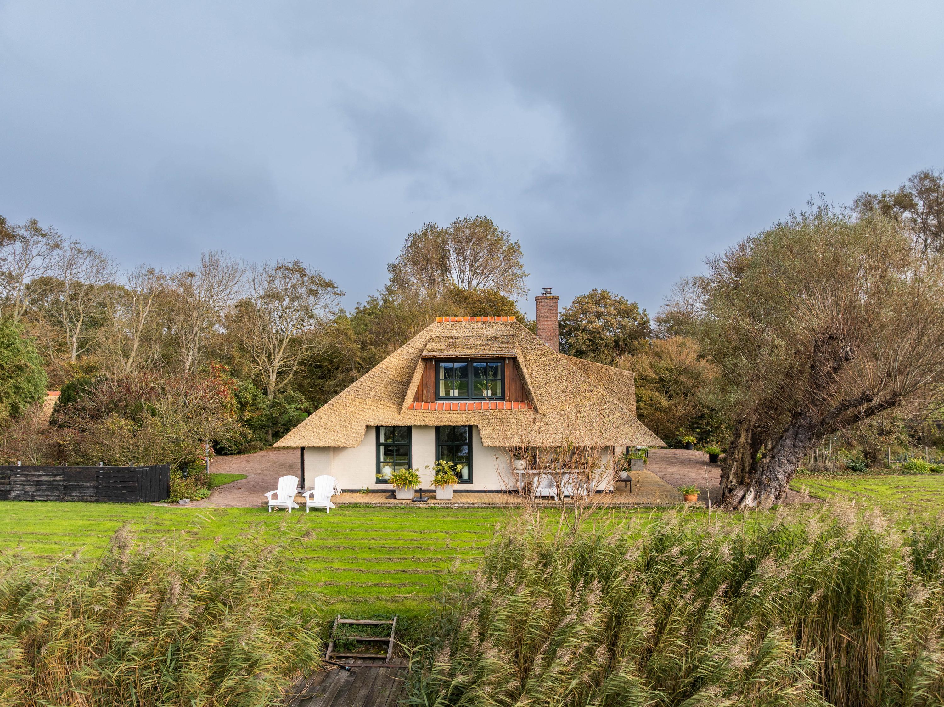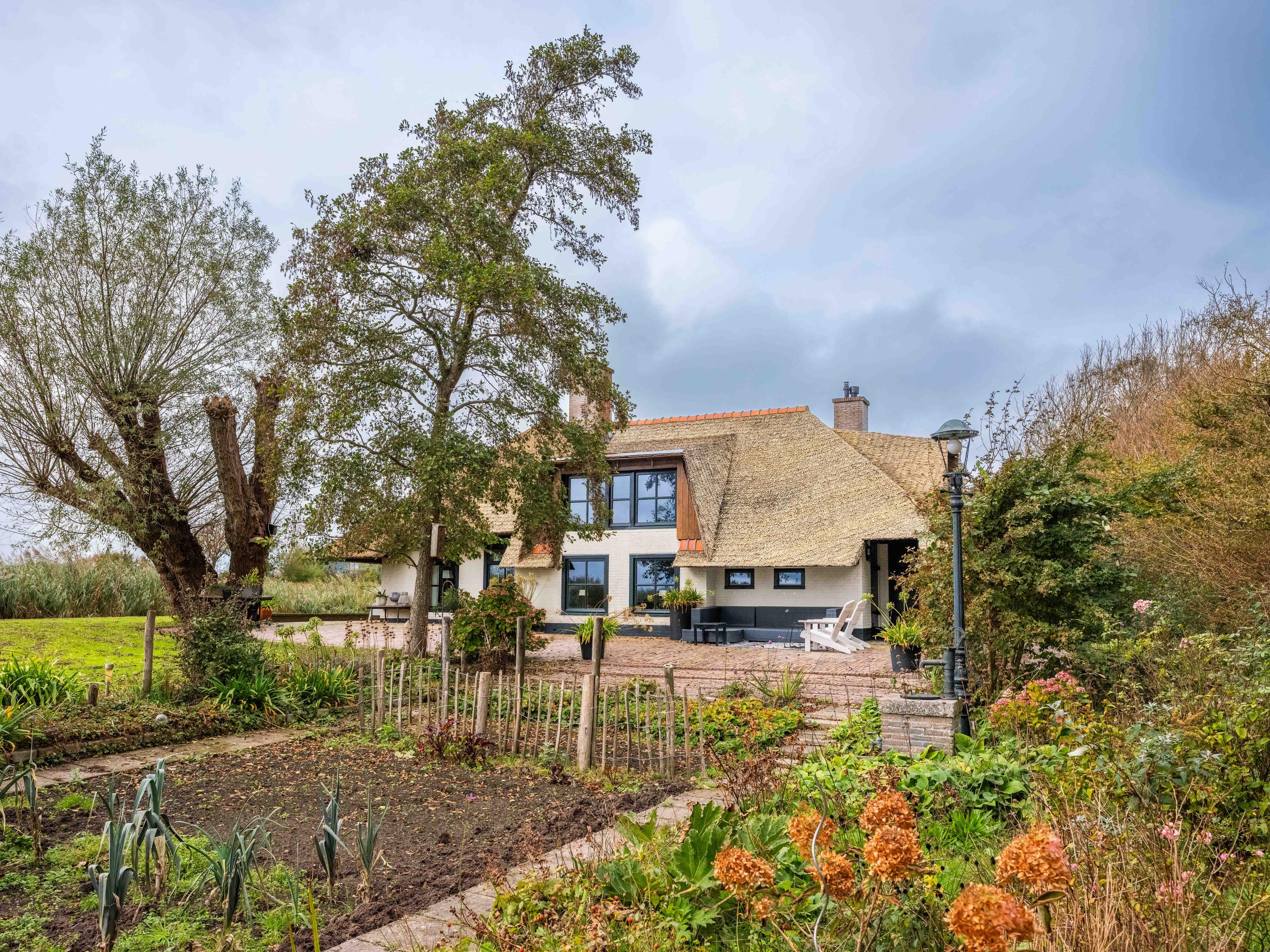 El jardín paisajístico enmarca una casa de invitados independiente con estufa de leña, cocina abierta, dormitorio y ducha privada, ofreciendo versatilidad para recibir o relajarse en privado. Varias terrazas, árboles frutales y un embarcadero privado invitan a la calma, completando la experiencia Warmenhuizen: una dirección para quienes buscan serenidad sin concesiones.