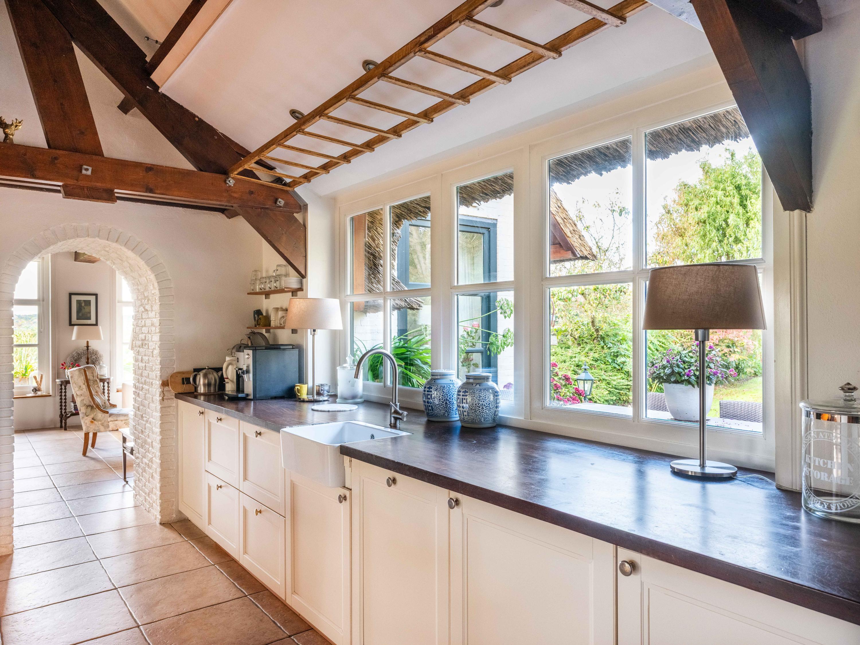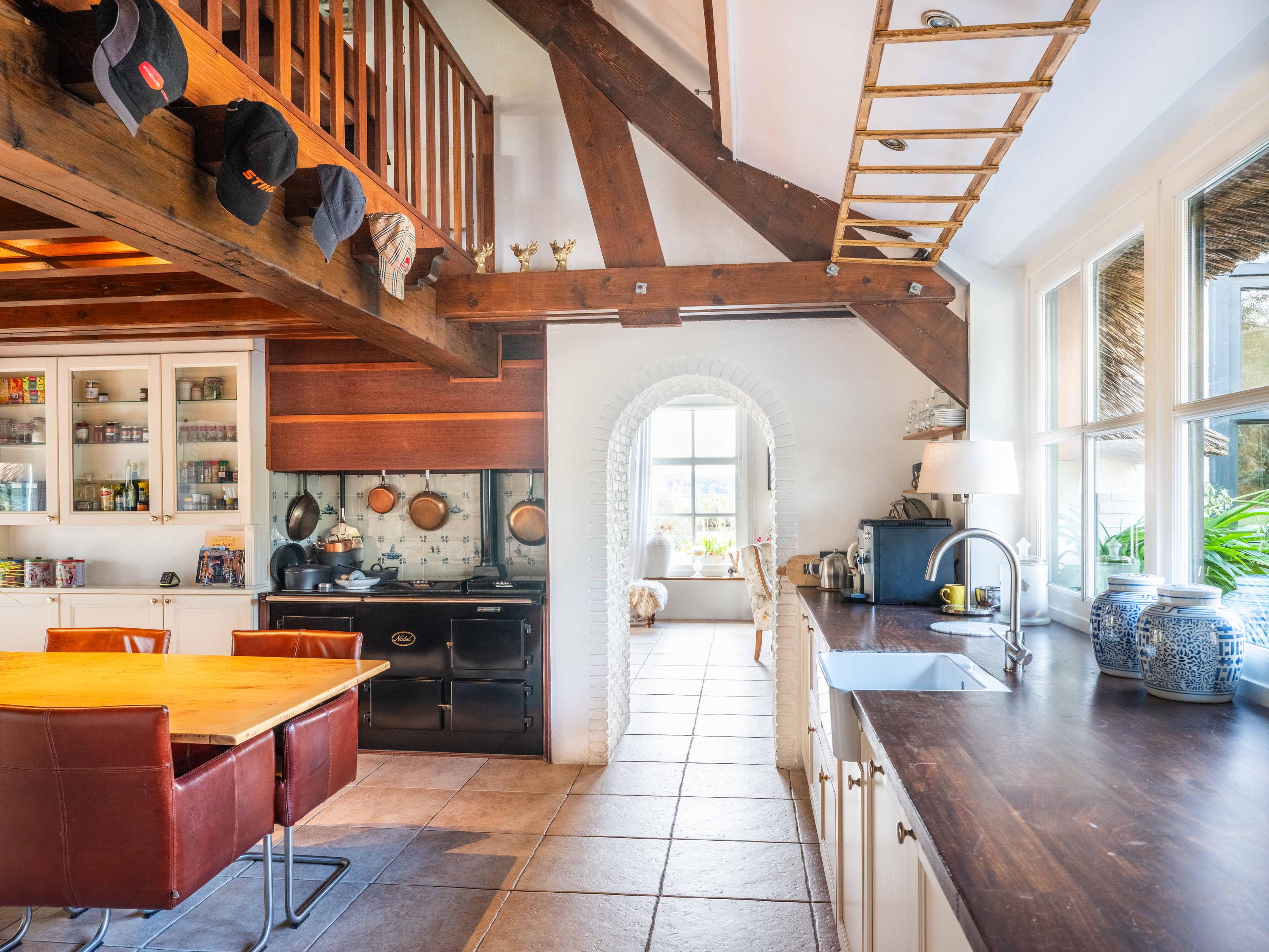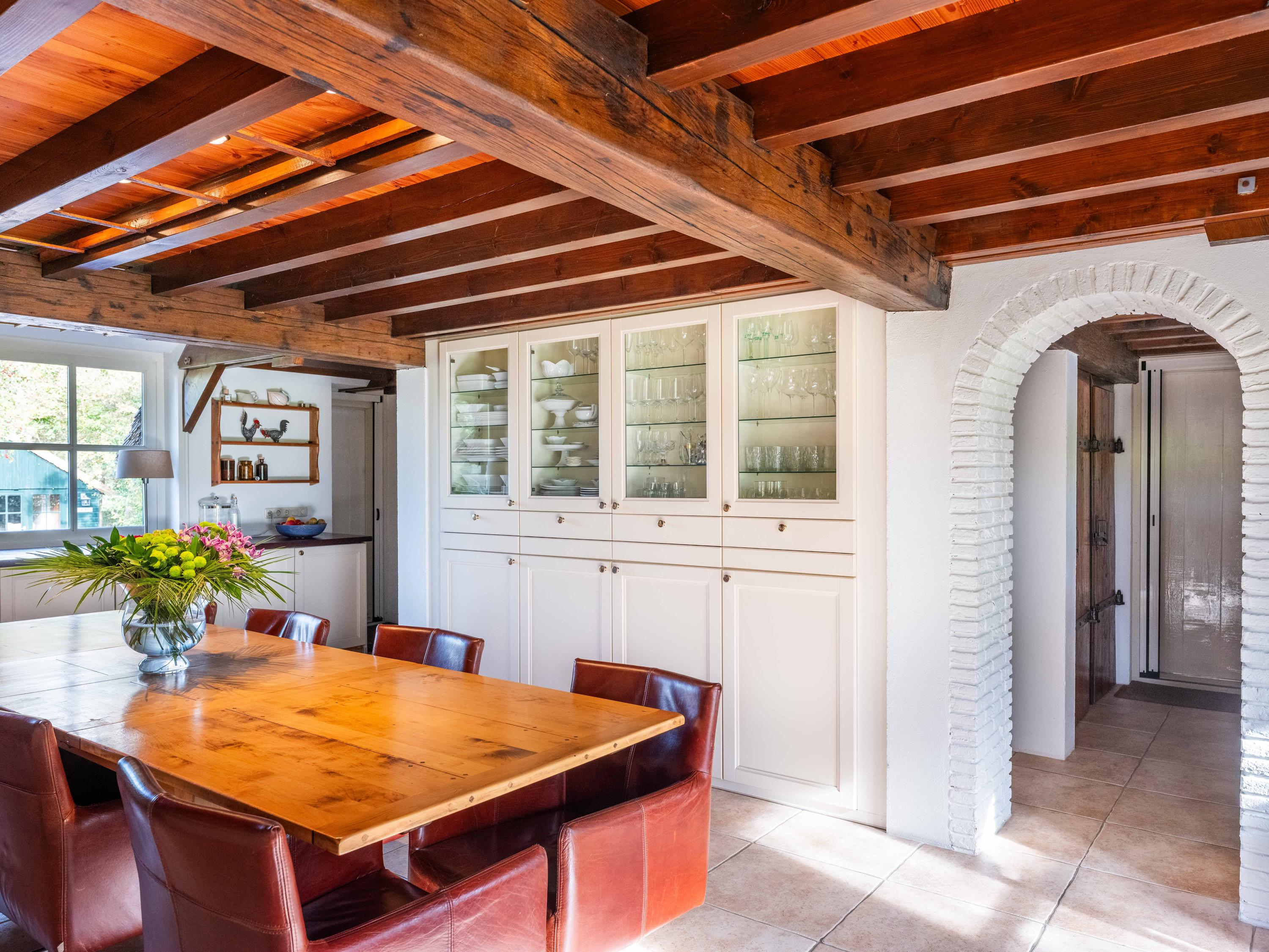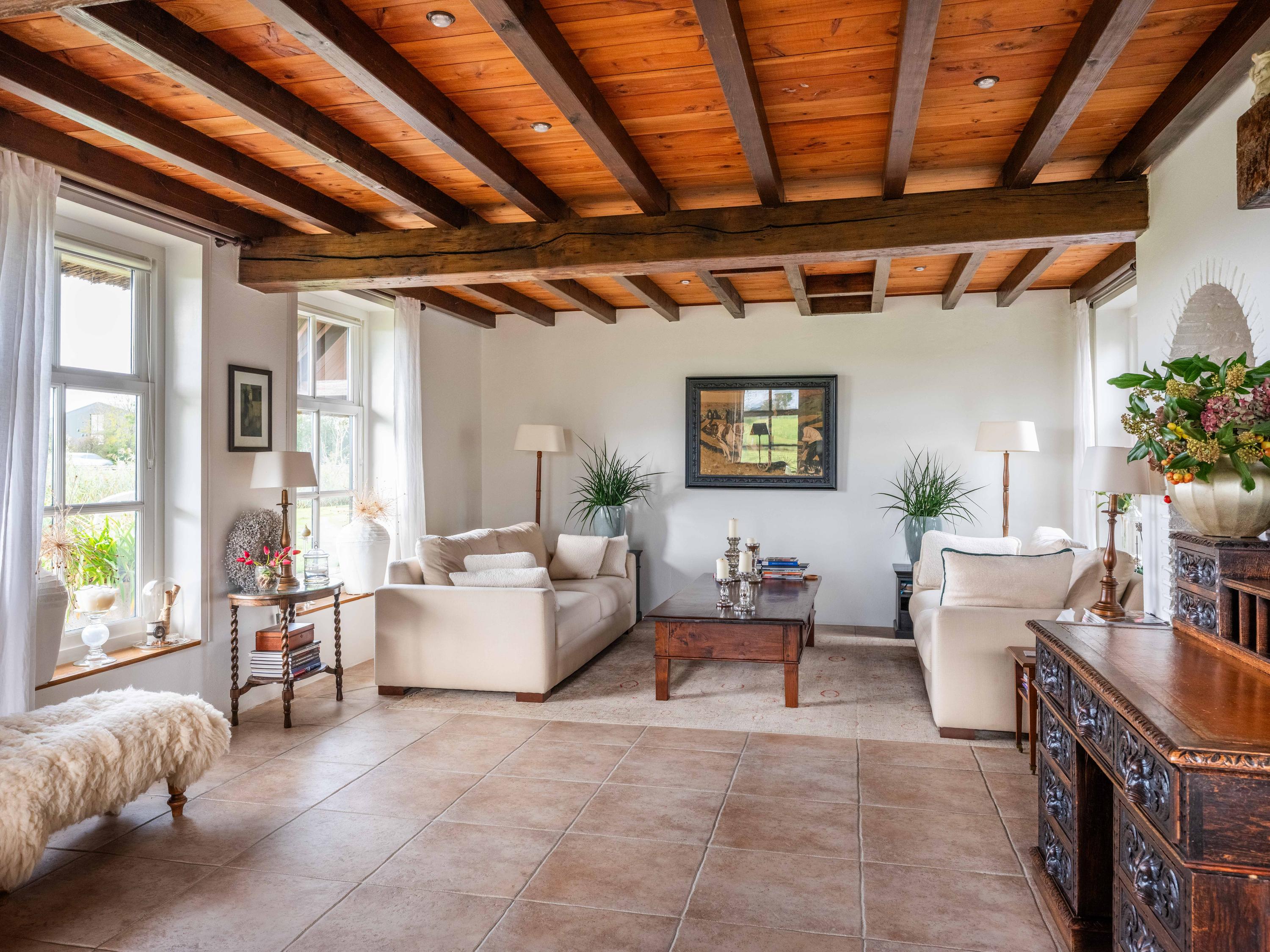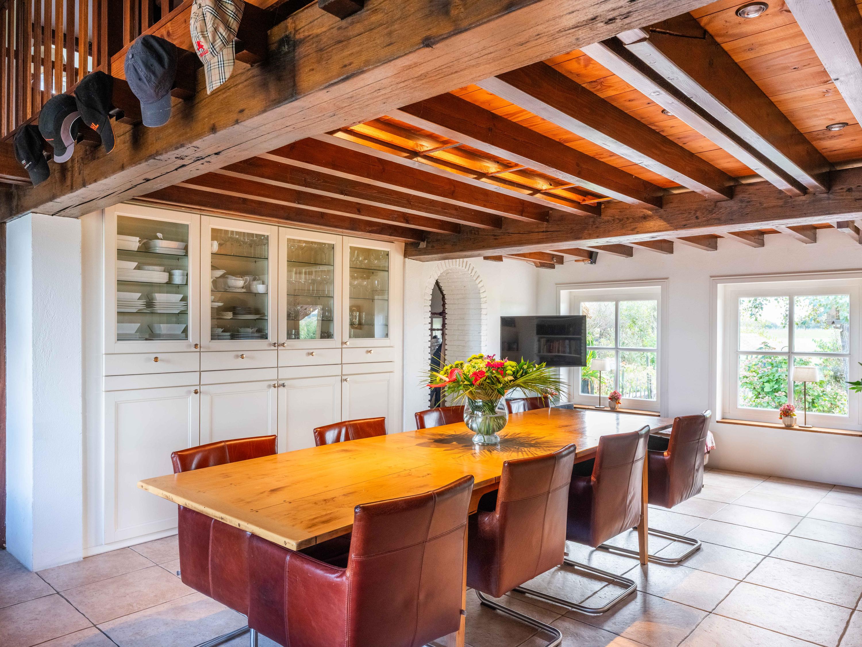 La vivienda, de 224 m², fusiona el estilo campestre con comodidades contemporáneas. El aislamiento integral, la calificación energética A, la calefacción por suelo radiante y el techo de paja sintética garantizan confort durante todo el año. El recibidor da la bienvenida con guardarropa y trastero, abriendo paso a una luminosa zona de comedor y cocina abierta. Materiales auténticos—techos con vigas, armarios empotrados y cocina inglesa—distinguen la espaciosa cocina, funcional y acogedora, que fluye hacia el generoso salón, donde la luz natural realza el agua y el jardín, coronando el espacio una estufa de leña.