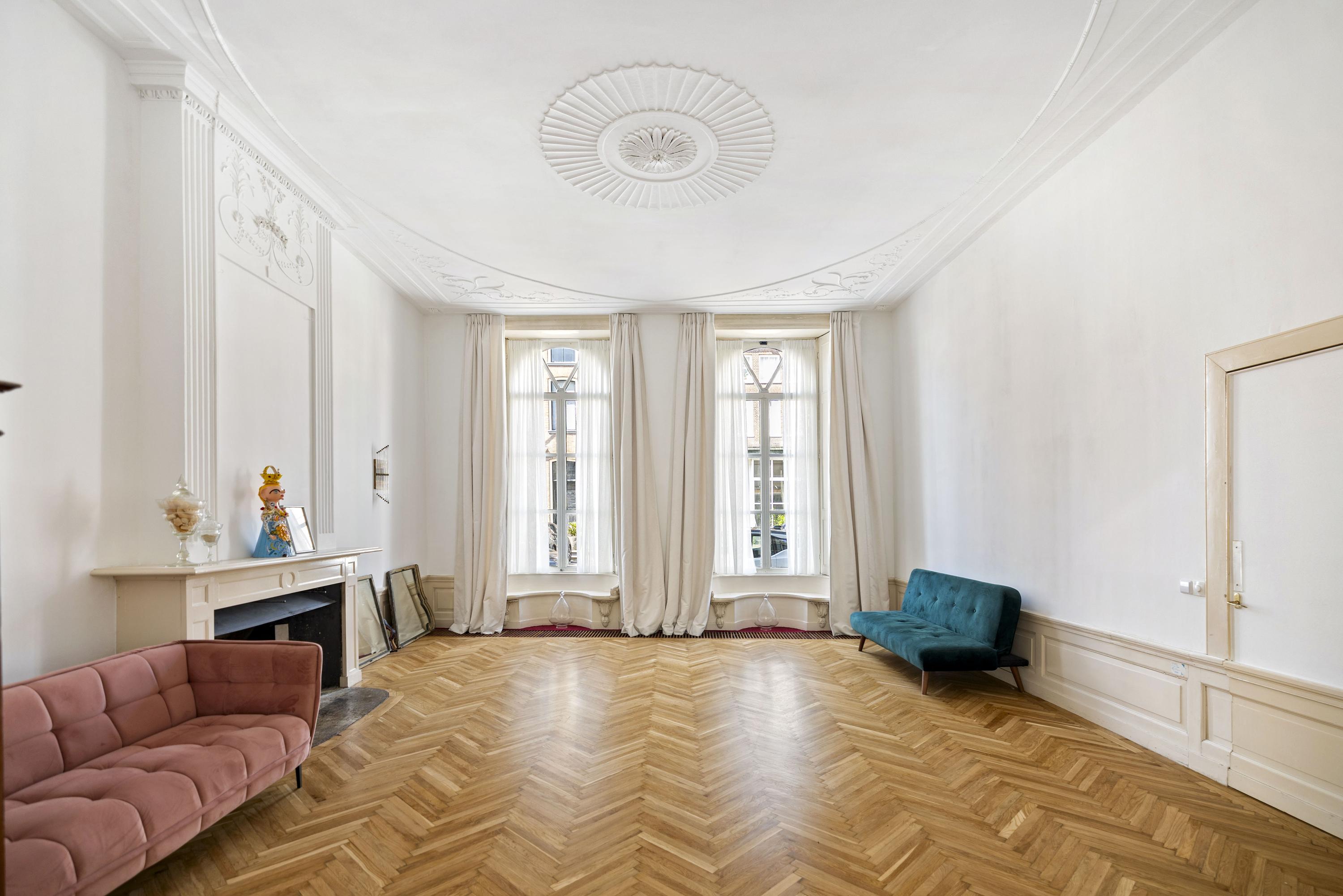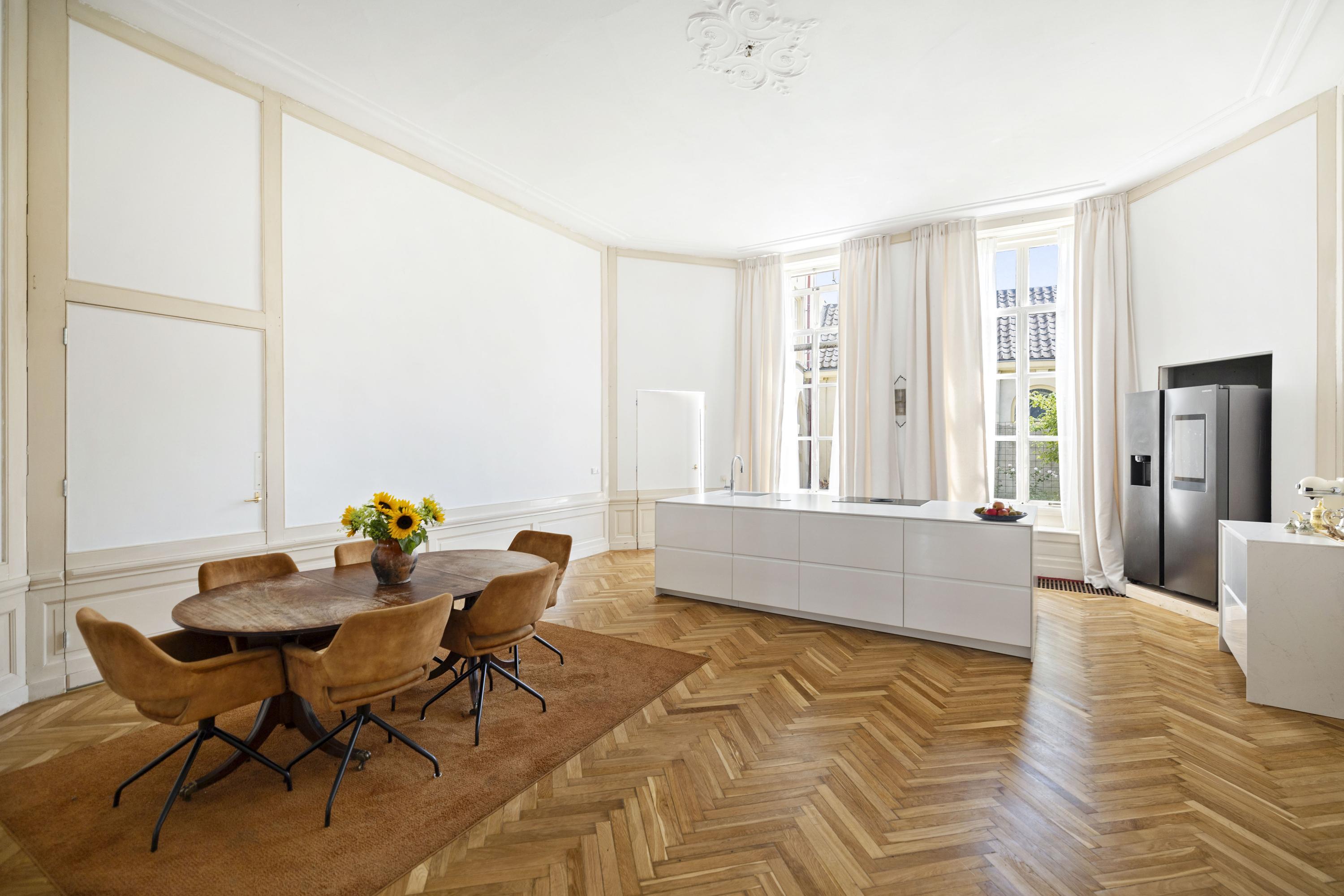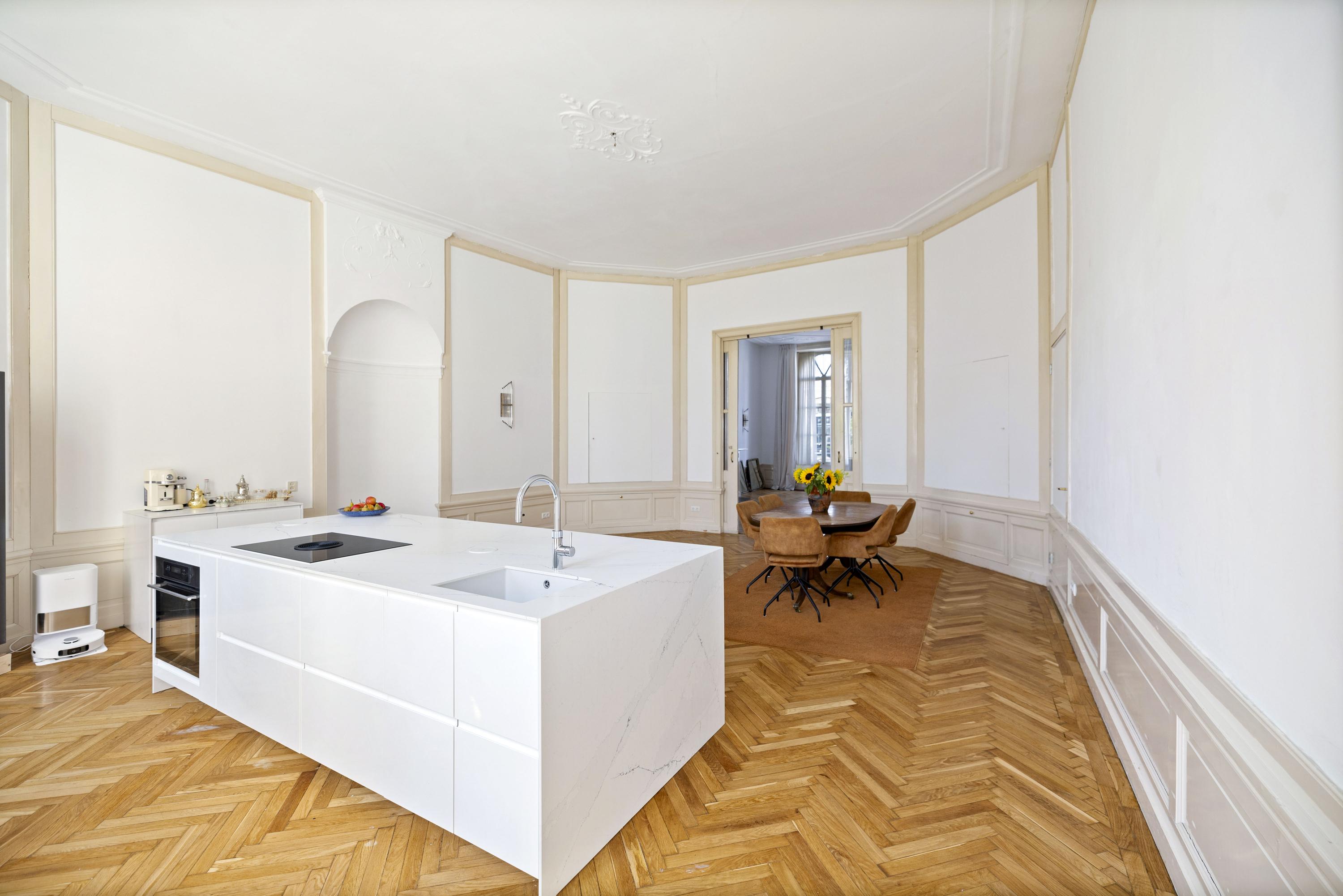 Cruzando la entrada doble clásica, el vestíbulo da la bienvenida con su suelo de mármol y abundante luz natural. Una zona de estar y cocina combinada de casi 100 m² ancla la planta principal. El salón, de 43 m², presenta bancos de ventana originales y una chimenea ornamental de época, mientras que los suelos de roble en espiga aportan calidez y elegancia. La cocina está equipada con muebles blancos sin tiradores, electrodomésticos de alta gama, incluyendo una placa de inducción con extractor integrado y un gran frigorífico-congelador.