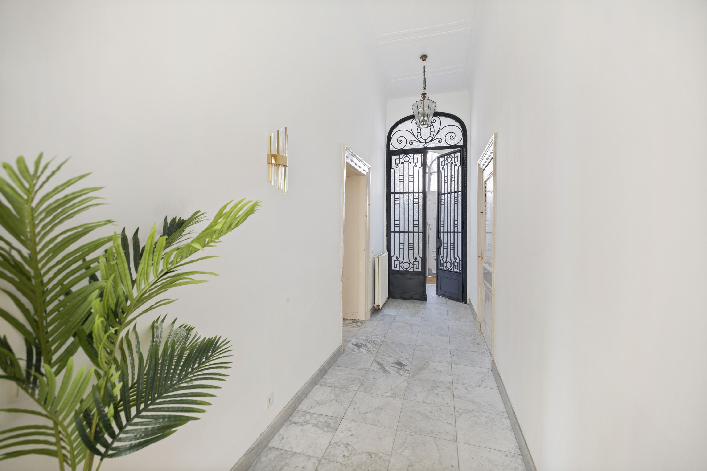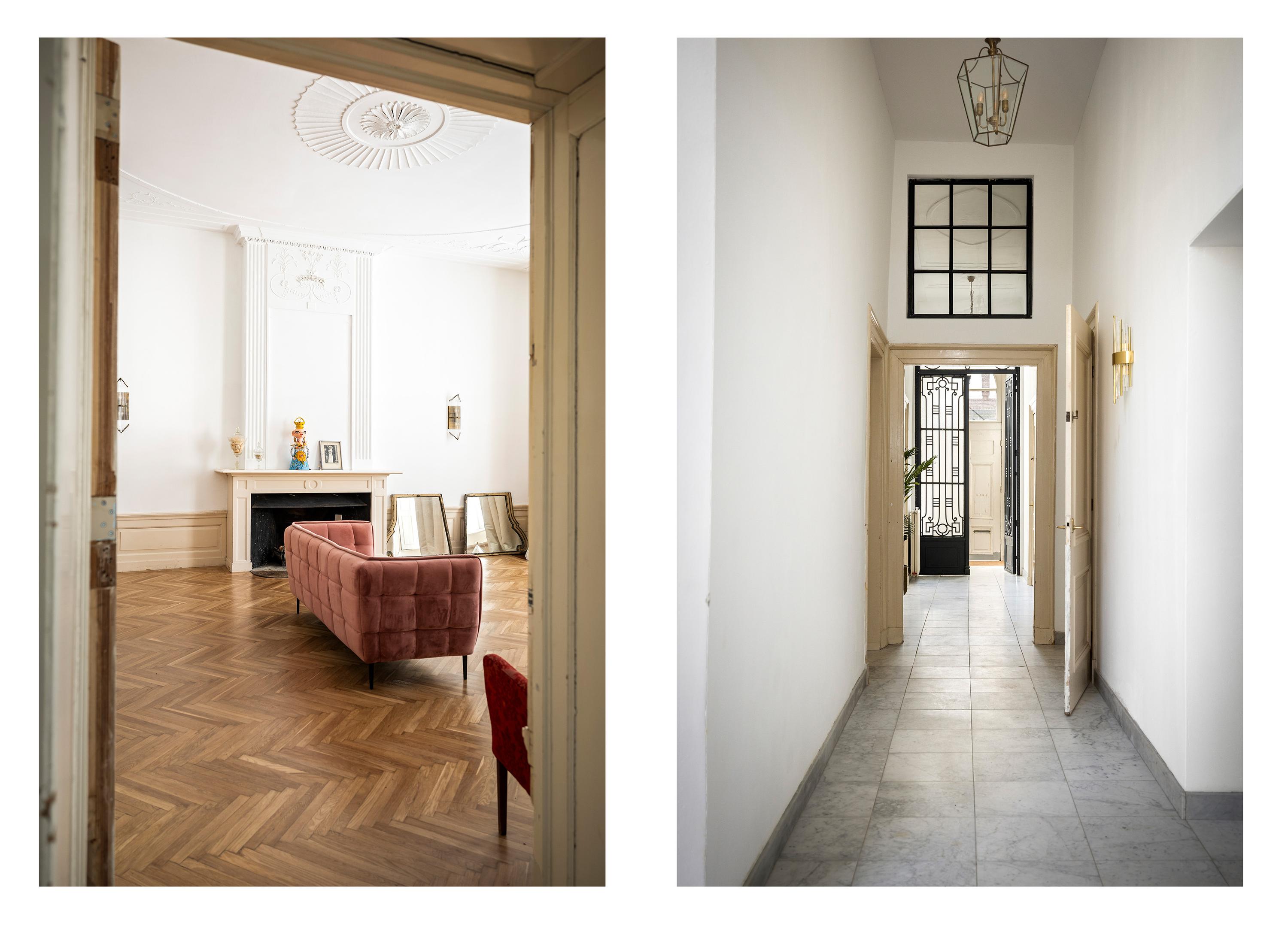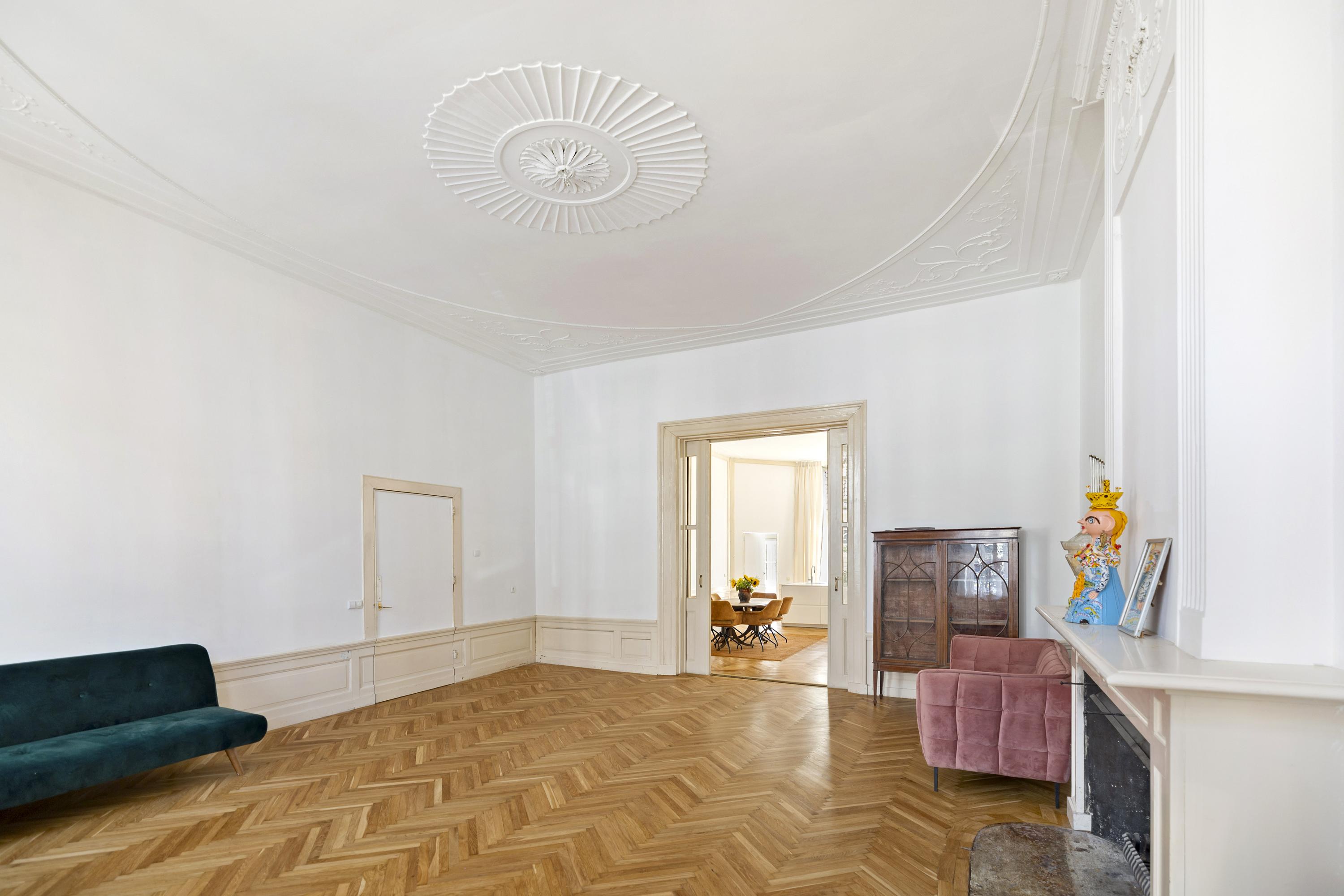 Cruzando la entrada doble clásica, el vestíbulo da la bienvenida con su suelo de mármol y abundante luz natural. Una zona de estar y cocina combinada de casi 100 m² ancla la planta principal. El salón, de 43 m², presenta bancos de ventana originales y una chimenea ornamental de época, mientras que los suelos de roble en espiga aportan calidez y elegancia. La cocina está equipada con muebles blancos sin tiradores, electrodomésticos de alta gama, incluyendo una placa de inducción con extractor integrado y un gran frigorífico-congelador.