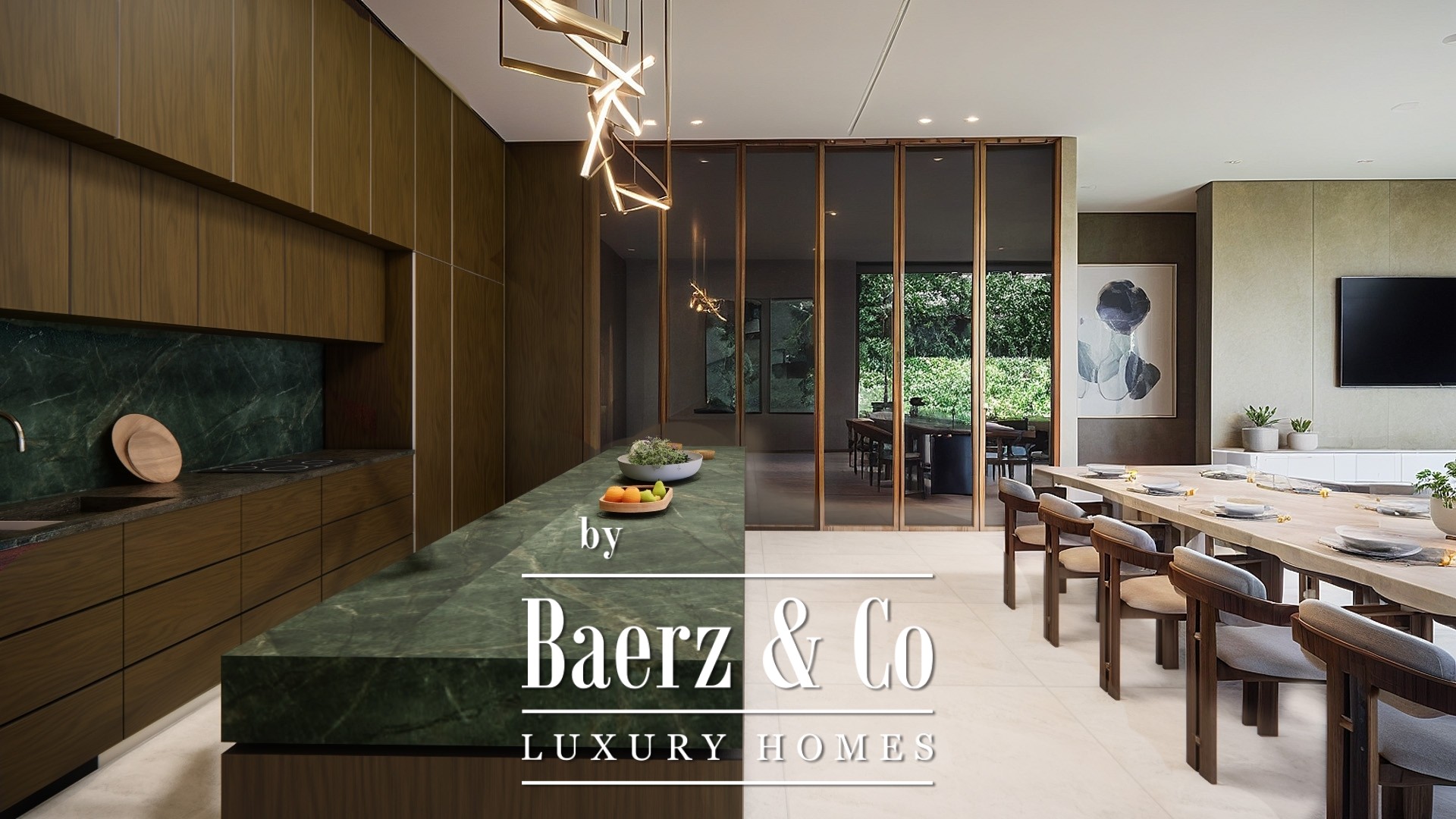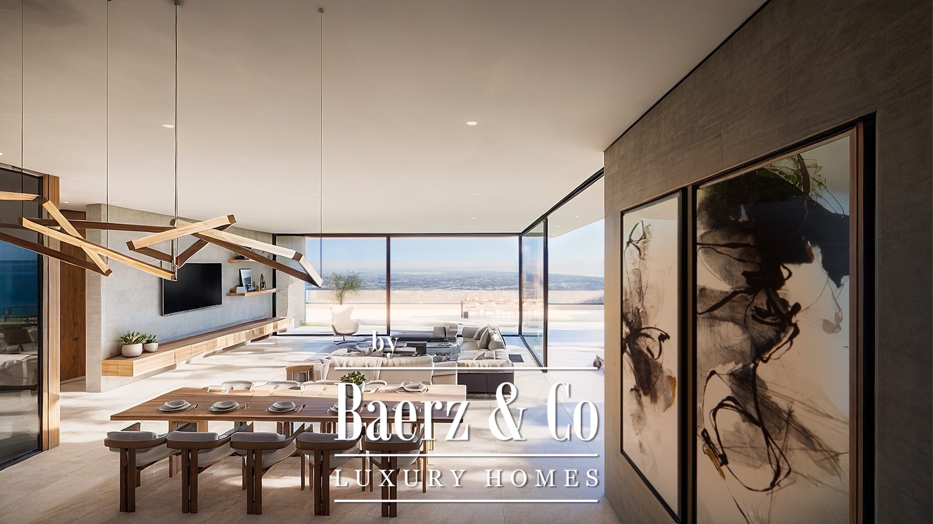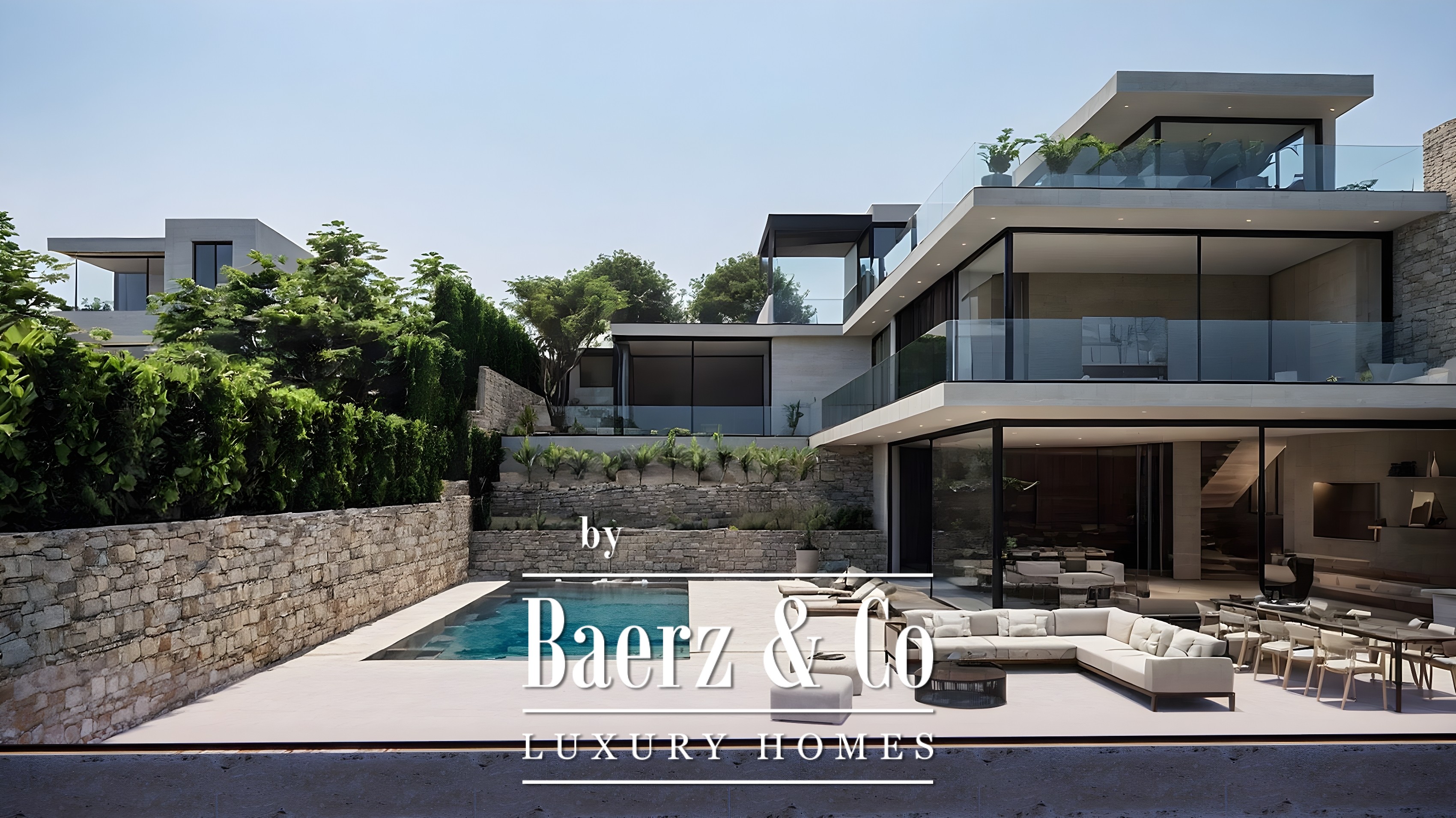 La demeure se déploie sur quatre niveaux, avec un garage de 120 m² pouvant accueillir six véhicules, une salle technique et un ascenseur desservant chaque étage. Le rez-de-chaussée propose un espace de vie et de réception baigné de lumière face à la mer, une cuisine moderne ouverte, ainsi qu’une transition fluide vers un vaste jardin et une piscine, conçus pour la détente ou des moments conviviaux en plein air. Une suite avec dressing et salle de bain privative, ainsi qu’une salle d’eau invités, complètent ce niveau.