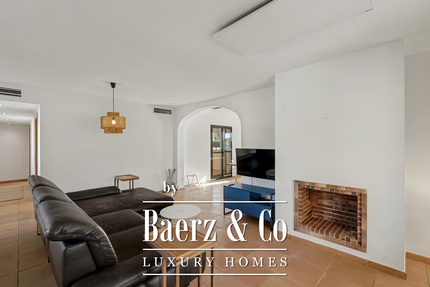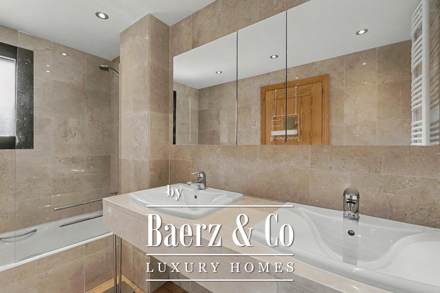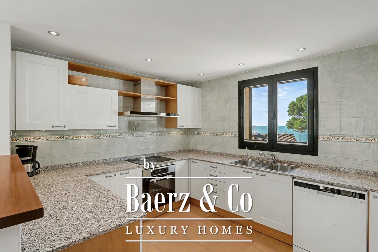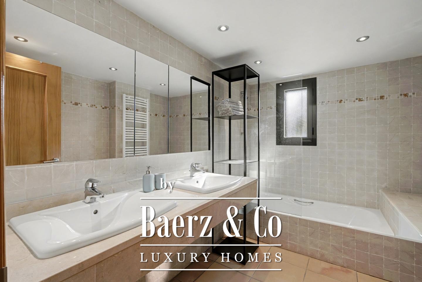 La chambre principale bénéficie d’une salle de bains privative, tandis que la chambre d’amis et la seconde salle de bains indépendante préservent confort et sérénité. Accédez à la terrasse privée sur le toit par l’escalier de la tour pour profiter du soleil toute la journée et de vues panoramiques sur la baie. Climatisation, système d’alarme et parking commun garantissent confort et sécurité.