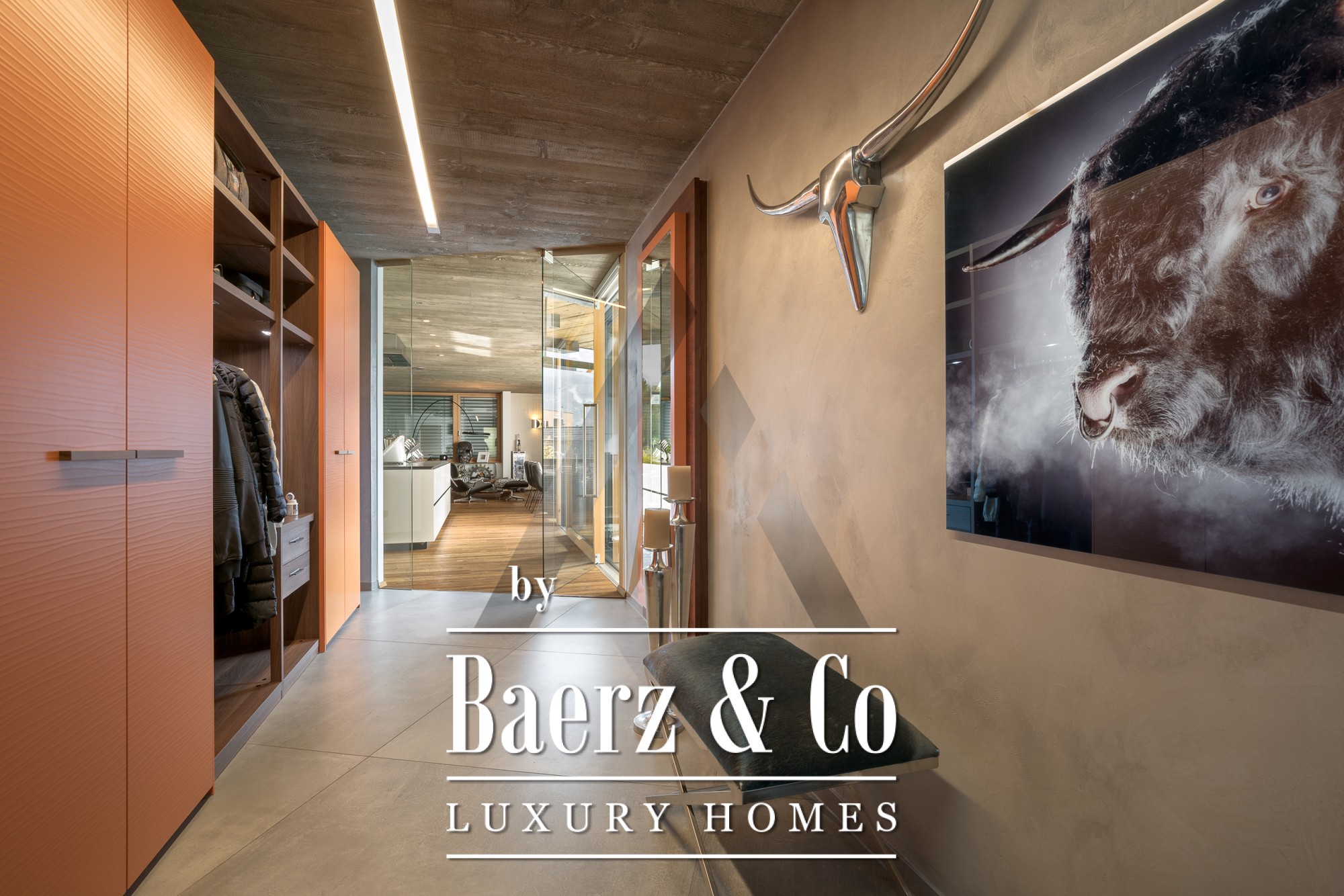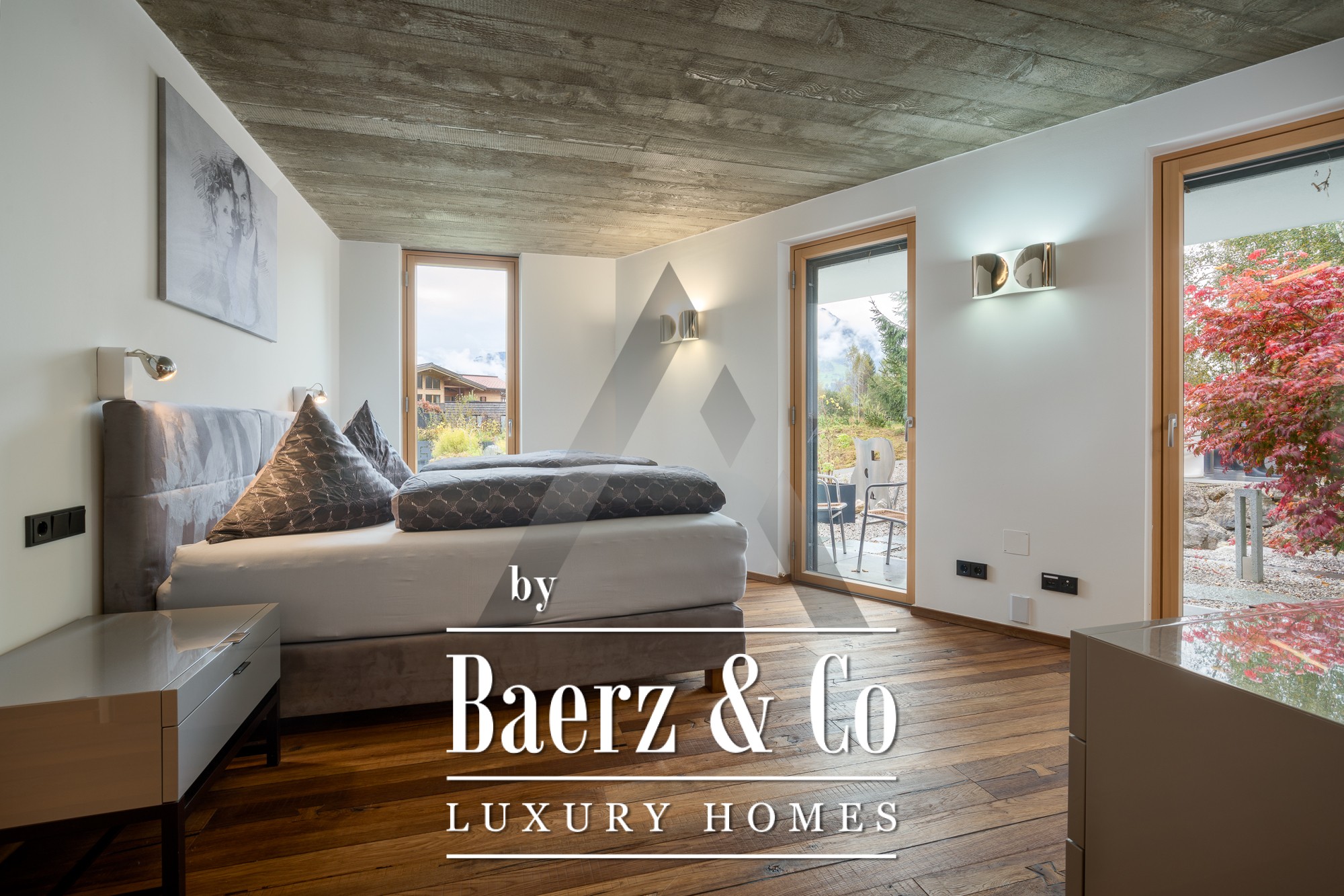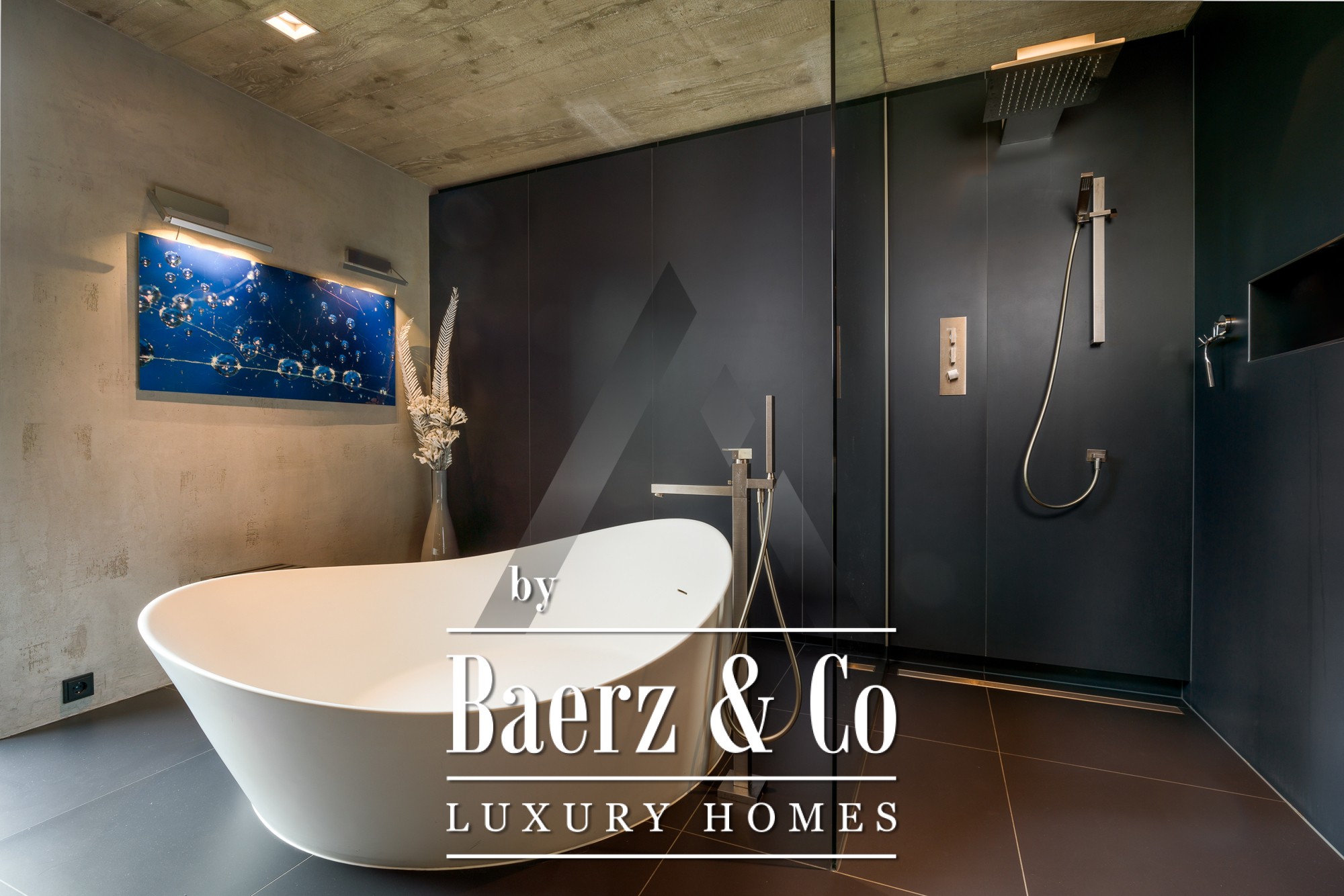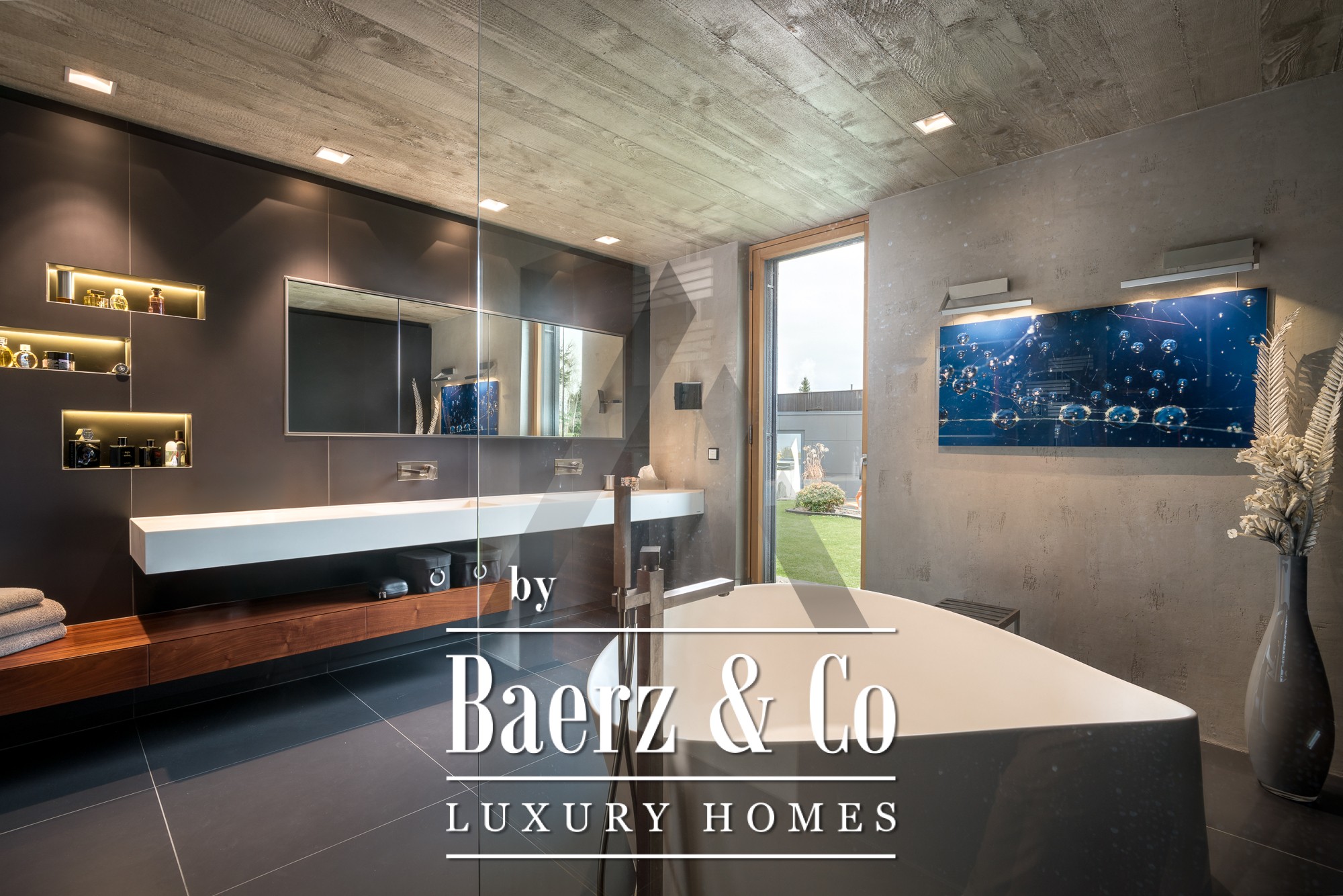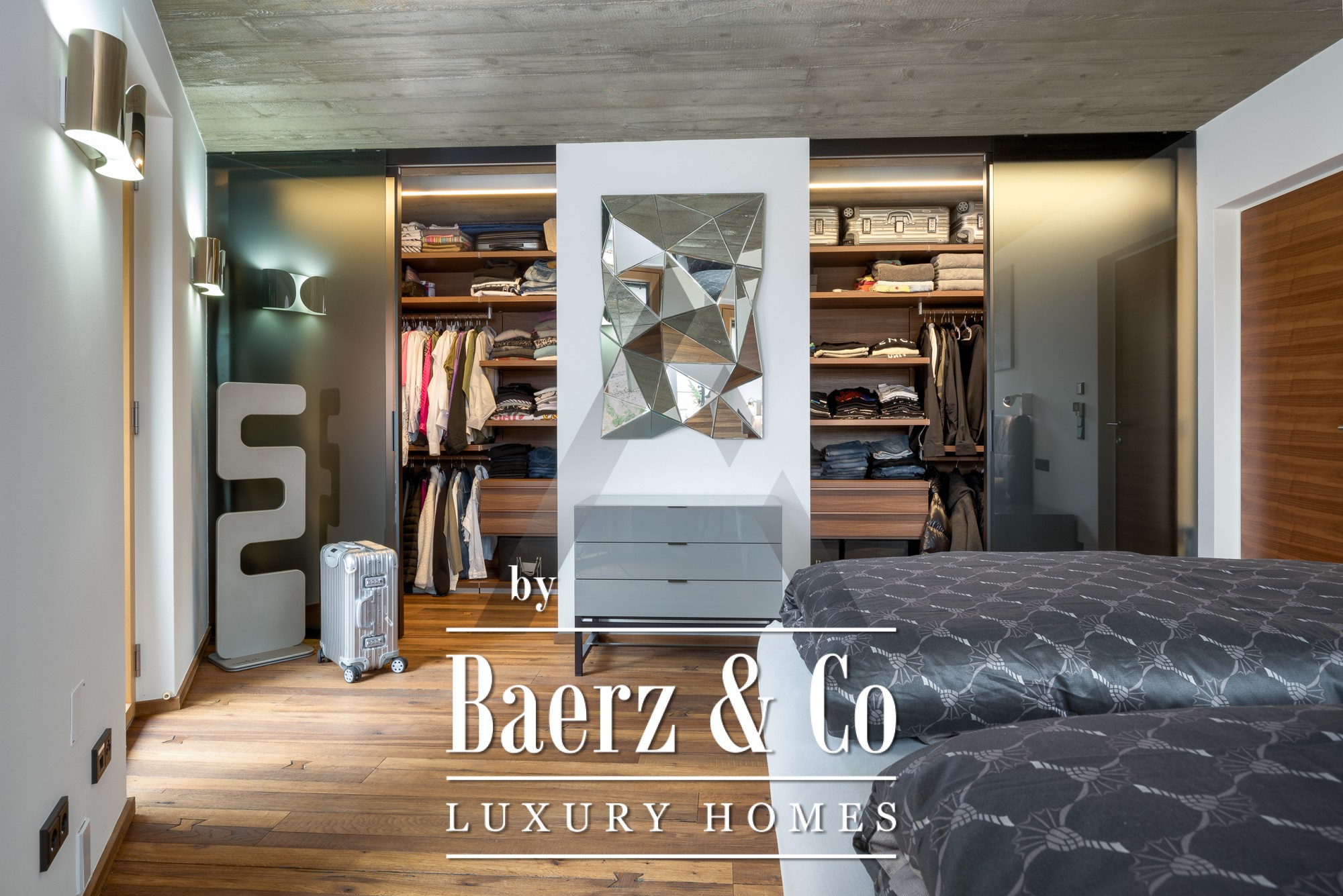 À l’intérieur, les plafonds en béton apparent et le parquet en chêne récupéré insufflent une élégance discrète. Le rez-de-chaussée à aire ouverte constitue le cœur de la maison : de larges baies vitrées baignent de lumière les espaces de vie, de repas et la cuisine Miele haut de gamme. Ce niveau accueille une suite parentale avec dressing, une chambre d’enfant, de vastes salles de bains et des espaces de rangement optimisés. À l’étage, un appartement indépendant comprend deux chambres, un séjour avec cheminée et une terrasse toit ouvrant sur l’horizon alpin. L’étage est complété par une salle de fitness de 18 m², entièrement climatisée et accessible depuis sa propre terrasse.