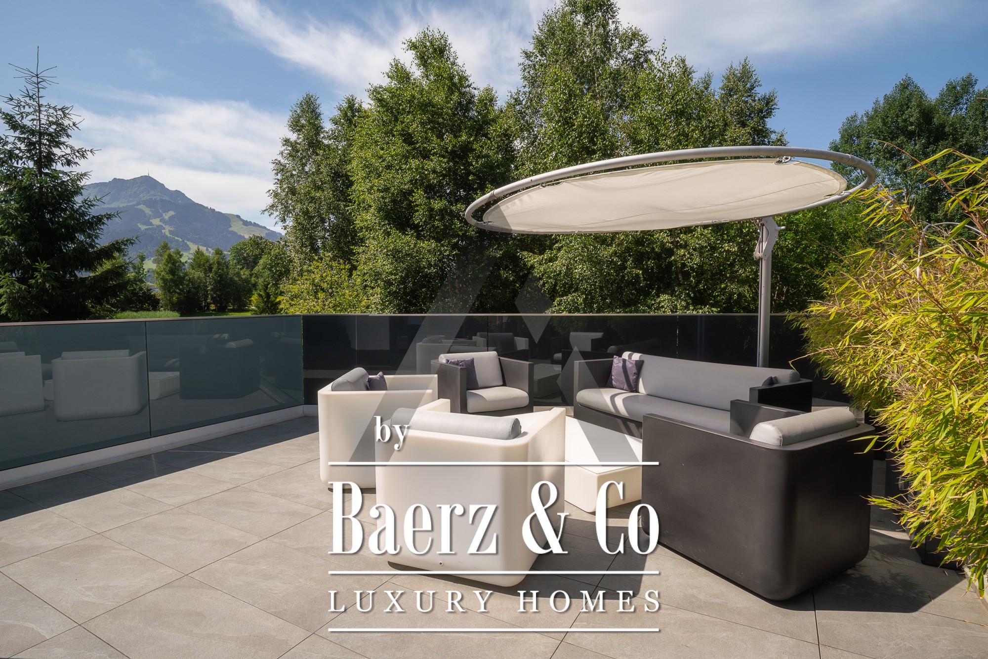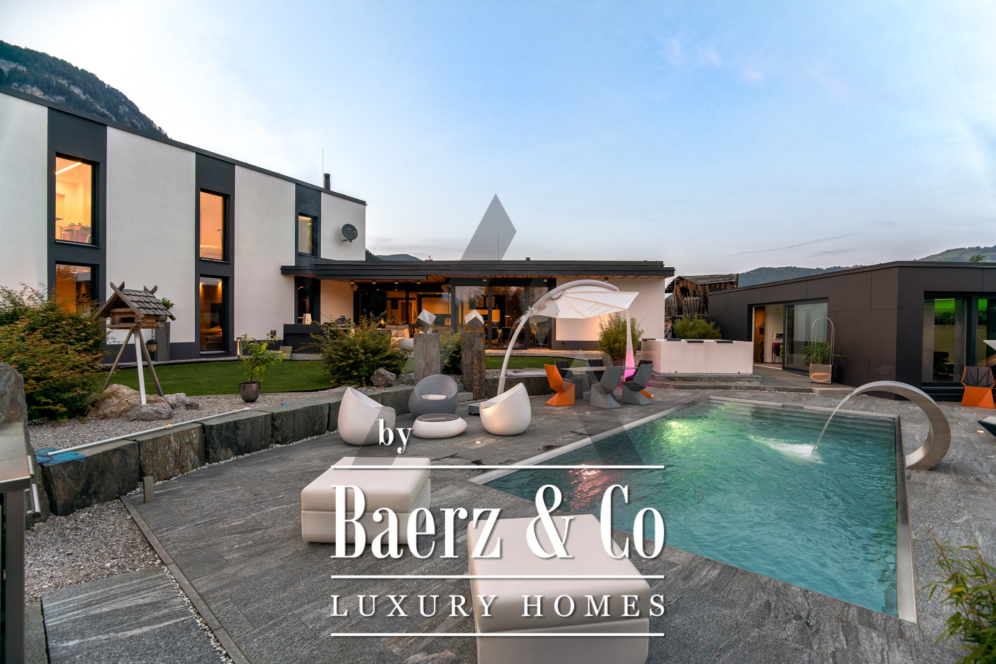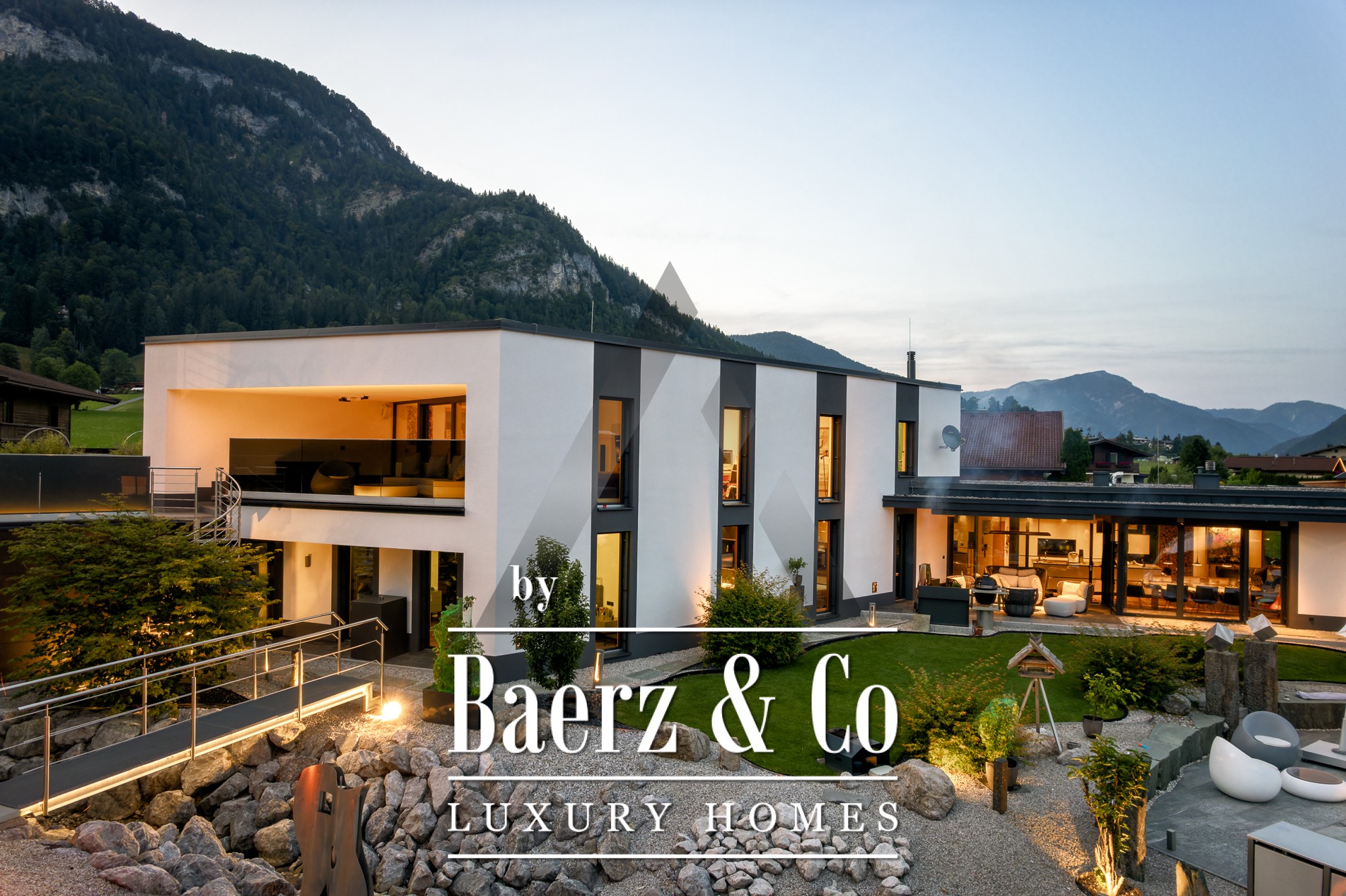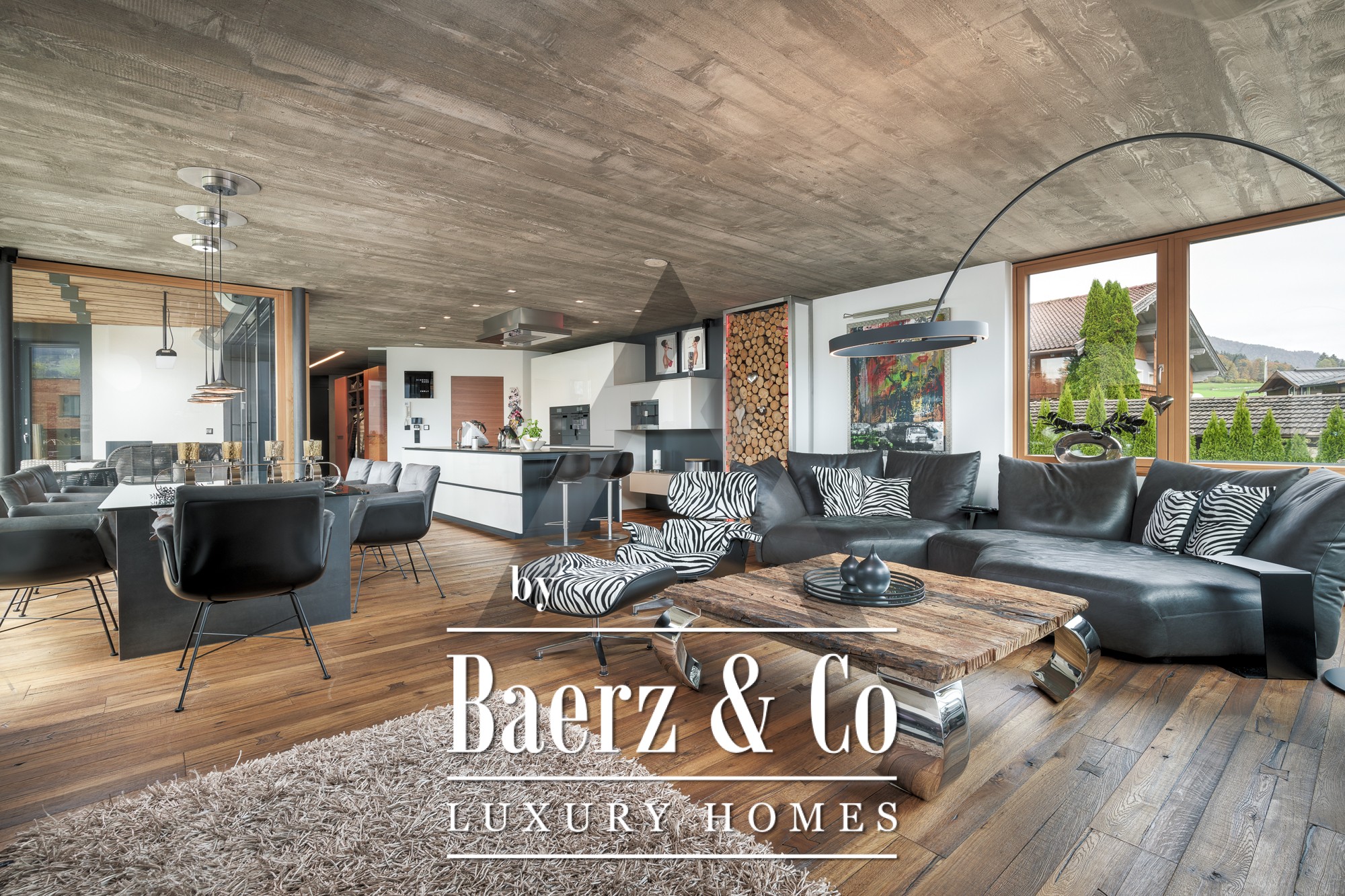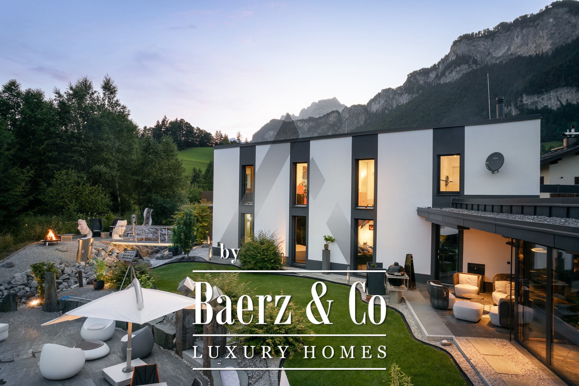 À l’intérieur, les plafonds en béton apparent et le parquet en chêne récupéré insufflent une élégance discrète. Le rez-de-chaussée à aire ouverte constitue le cœur de la maison : de larges baies vitrées baignent de lumière les espaces de vie, de repas et la cuisine Miele haut de gamme. Ce niveau accueille une suite parentale avec dressing, une chambre d’enfant, de vastes salles de bains et des espaces de rangement optimisés. À l’étage, un appartement indépendant comprend deux chambres, un séjour avec cheminée et une terrasse toit ouvrant sur l’horizon alpin. L’étage est complété par une salle de fitness de 18 m², entièrement climatisée et accessible depuis sa propre terrasse.