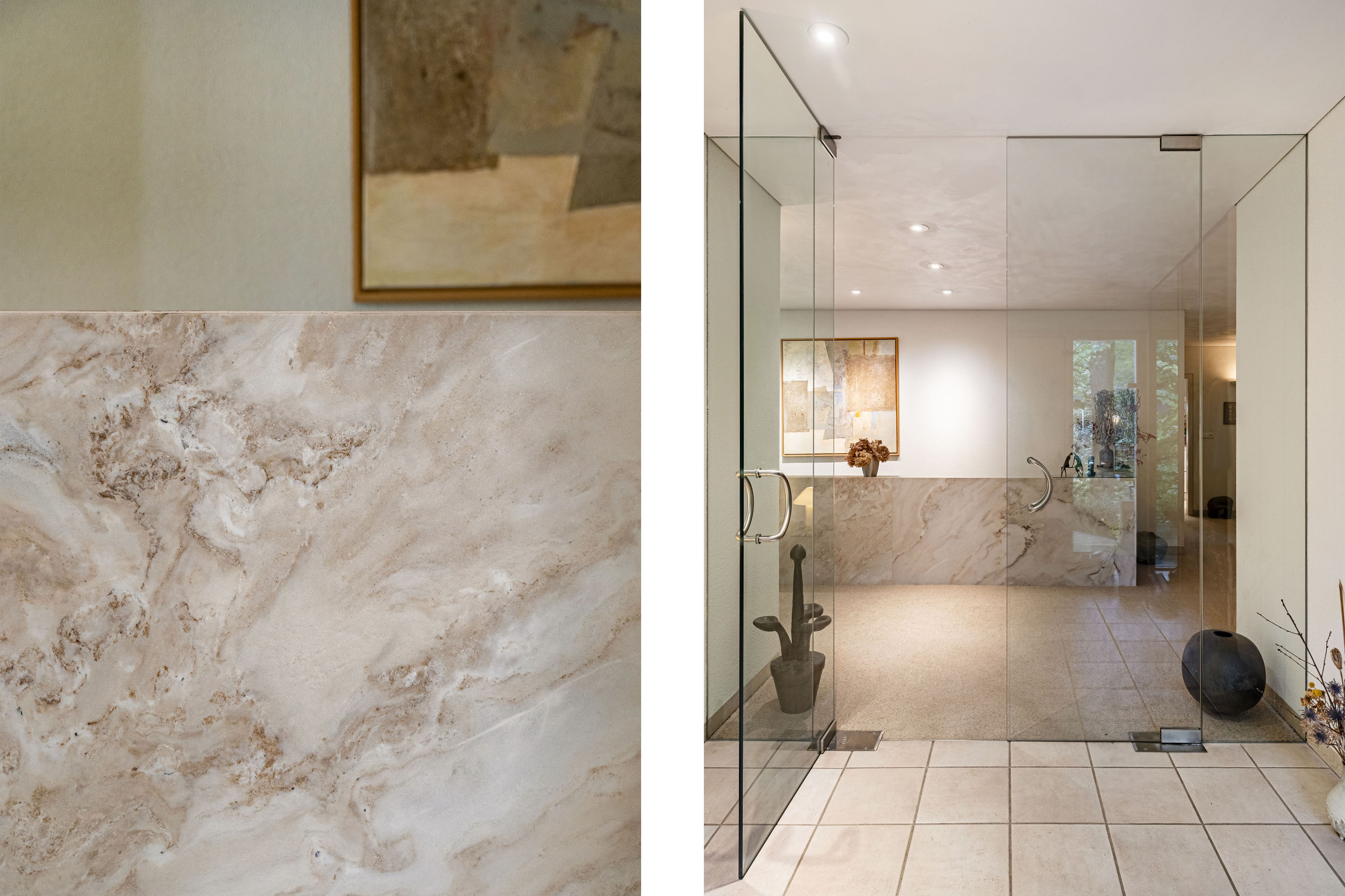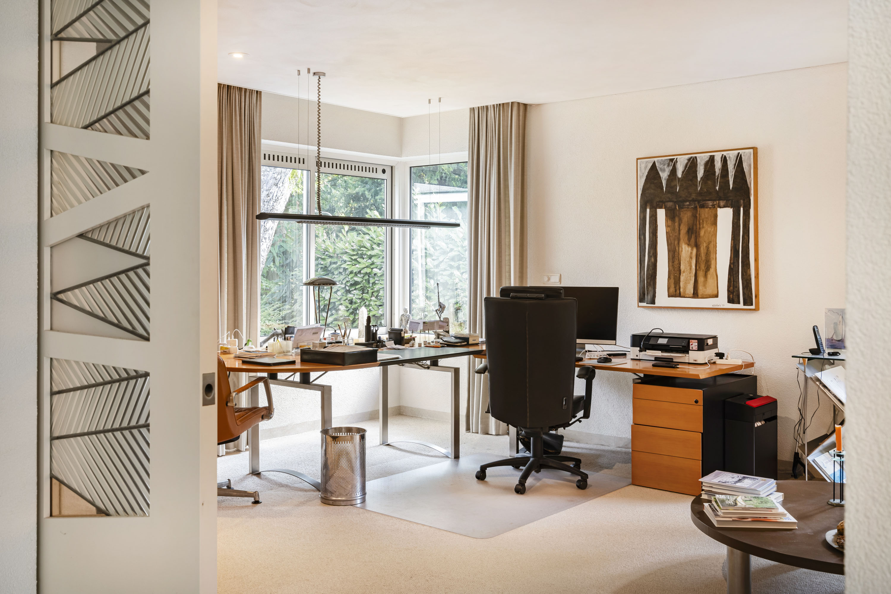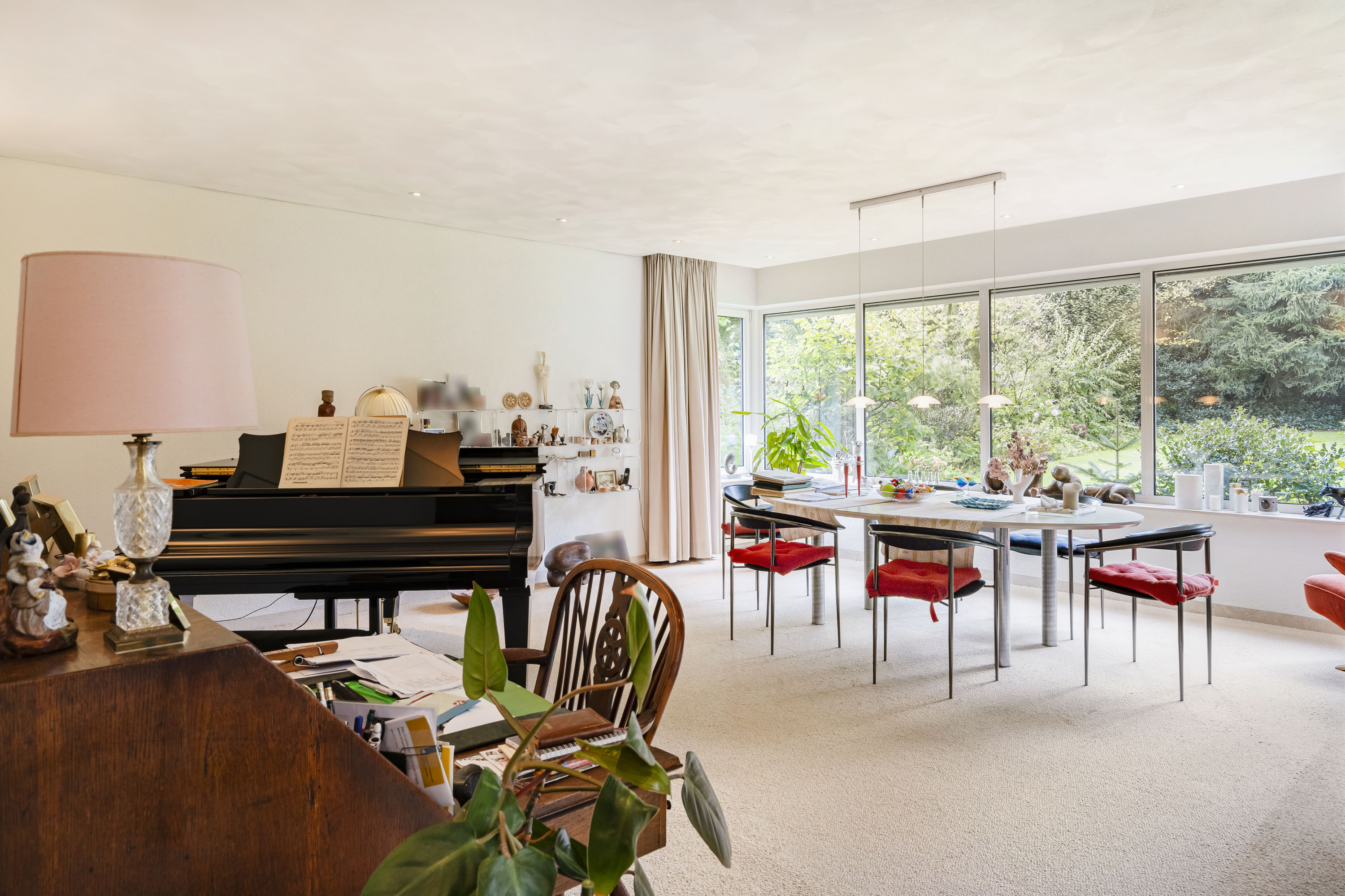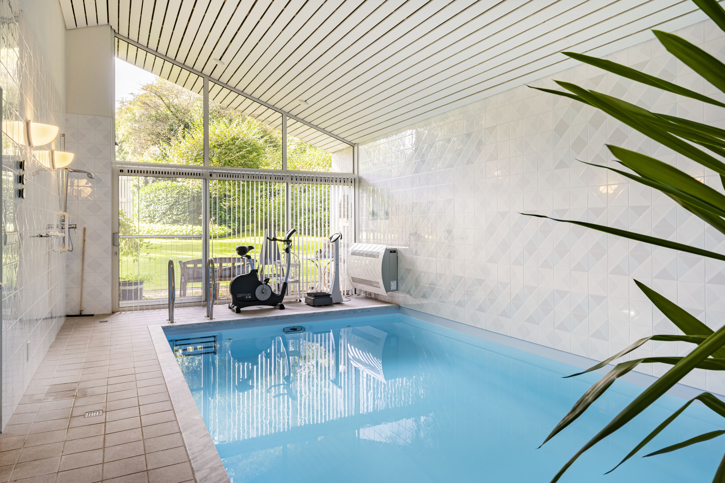 La disposition intelligente comprend un grand salon, une salle à manger tournée vers le jardin, un bureau ainsi qu’une cuisine ouverte attenante à une buanderie équipée d’un monte-plat discret. De belles portes coulissantes permettent l’équilibre idéal entre ouverture et intimité. La piscine intérieure, dotée d’un système de nage à contre-courant et de portes vitrées donnant accès au jardin, incarne le bien-être à domicile. La suite parentale dispose de la climatisation et d’un accès direct au jardin, tandis que deux salles de bains sont équipées d’une baignoire et d’une douche.