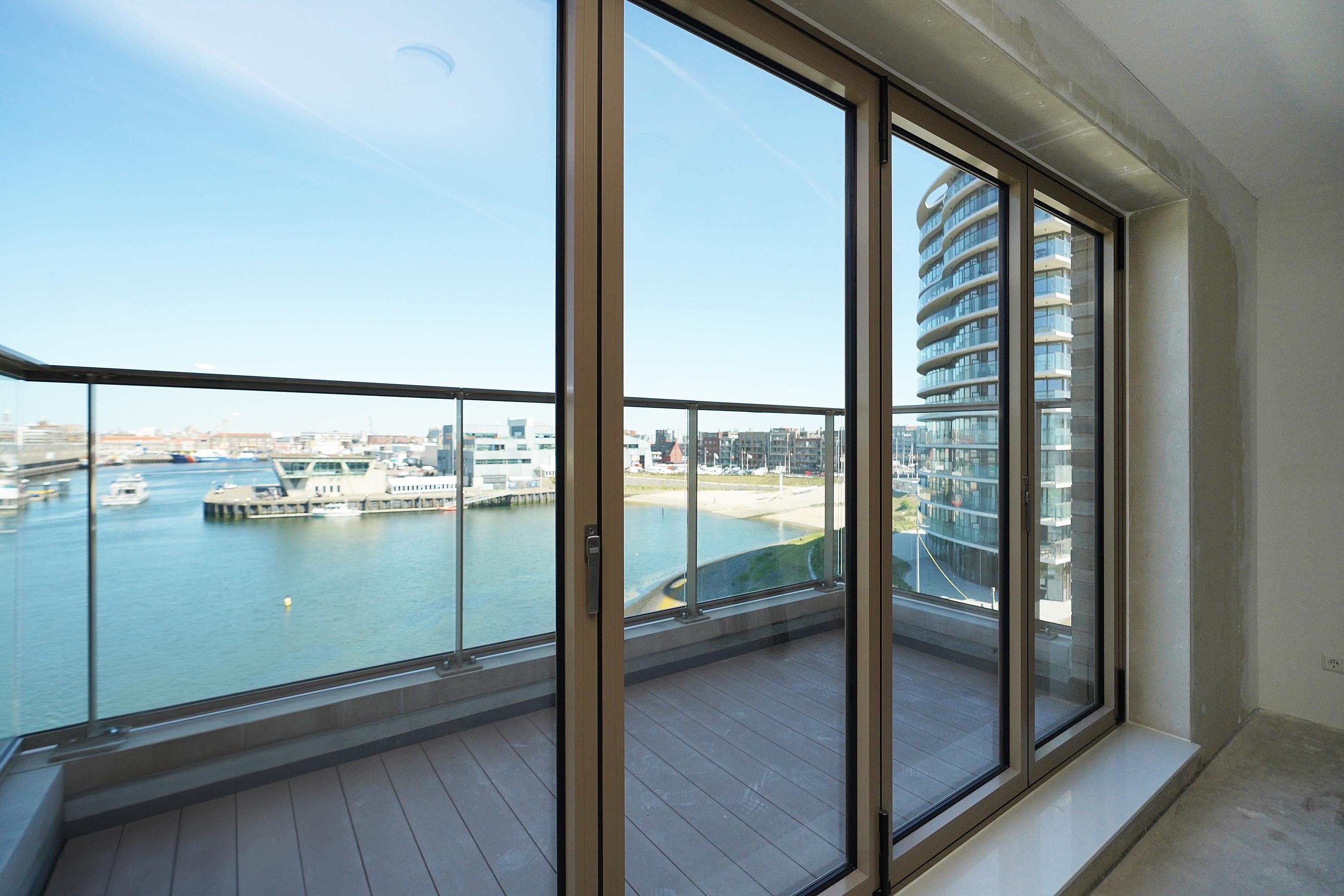 entree, hal, modern toilet, moderne badkamer met inloopdouche, wastafel met wastafelmeubel en handdoekradiator (sanitair Duravit) inpandige technische ruimte / berging met warmtepomp, ventilatiesysteem en wasmachine-/drogeraansluiting, De royale woonkamer aan de havenzijde zorgt met de grote raampartijen en de vouw/schuifwand naar het balkon voor een fenomenaal uitzicht. Vanuit de woonkamer en het balkon heeft u uitzicht op de haven van Scheveningen en de zee, een levendig uitzicht dat nooit gaat vervelen door de aan- en afvarende vissersboten en plezierjachten en de vele watersporters.