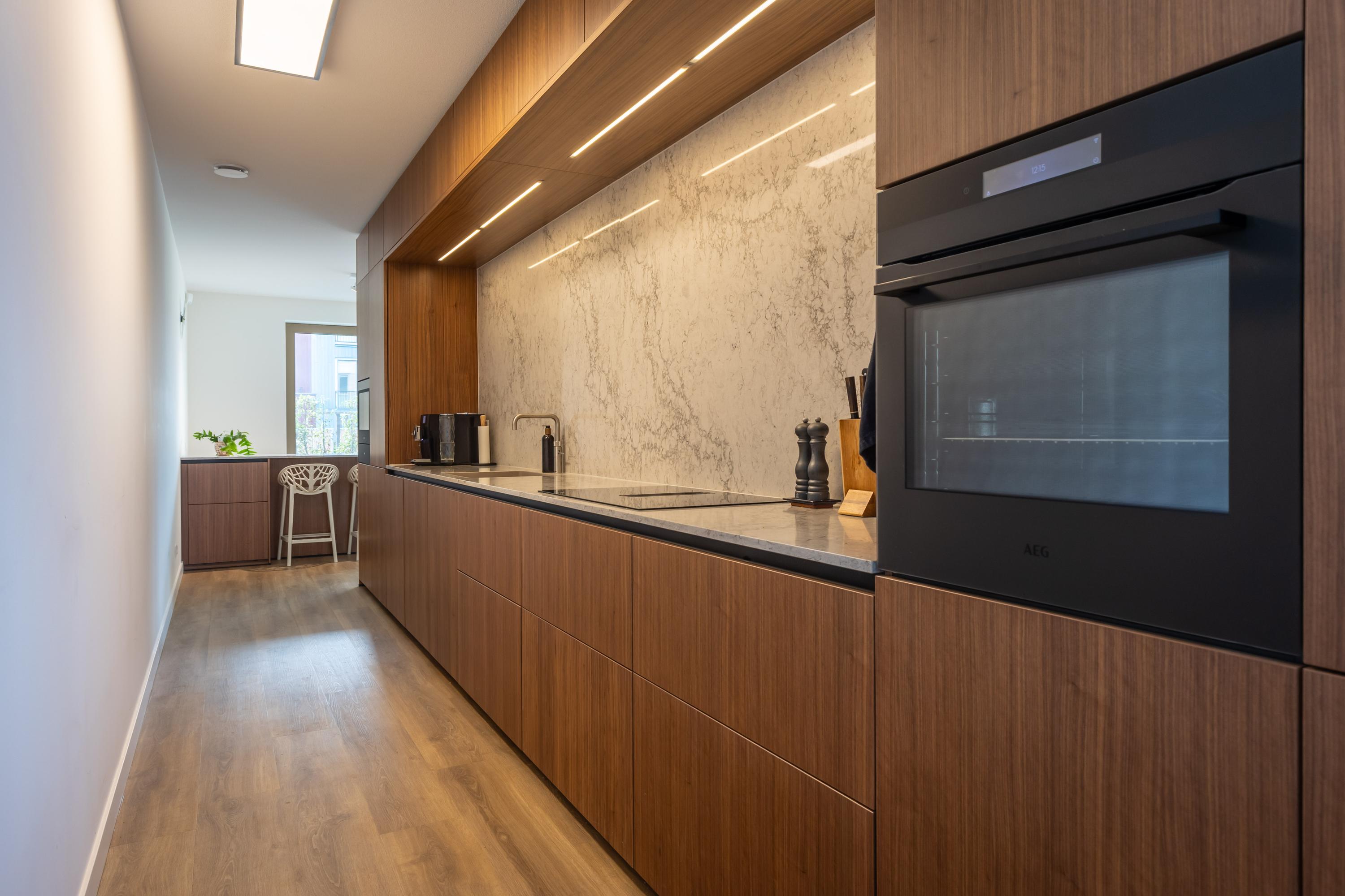 Tussen de living en de eetkamer ligt de indrukwekkende 7,20 meter lange keukenopstelling van NEXT-125. Een keuken die zich moeiteloos kan meten met high-end interieurdesign. De hoge kasten zijn uitgerust met een wijnklimaatkast, warmhoudlade, combi-oven, koel-/vriescombinatie. De brede inductiekookplaat met geïntegreerde afzuiging, de stille vaatwasser en de Quooker-kraan maken de uitrusting compleet. De fronten zijn uitgevoerd in warm walnoothout en het werkblad en de achterwand zijn afgewerkt met luxe composiet in een marmerdesign met doorlopend aderpatroon. Een stijl die rust, luxe en tijdloosheid uitstraalt.