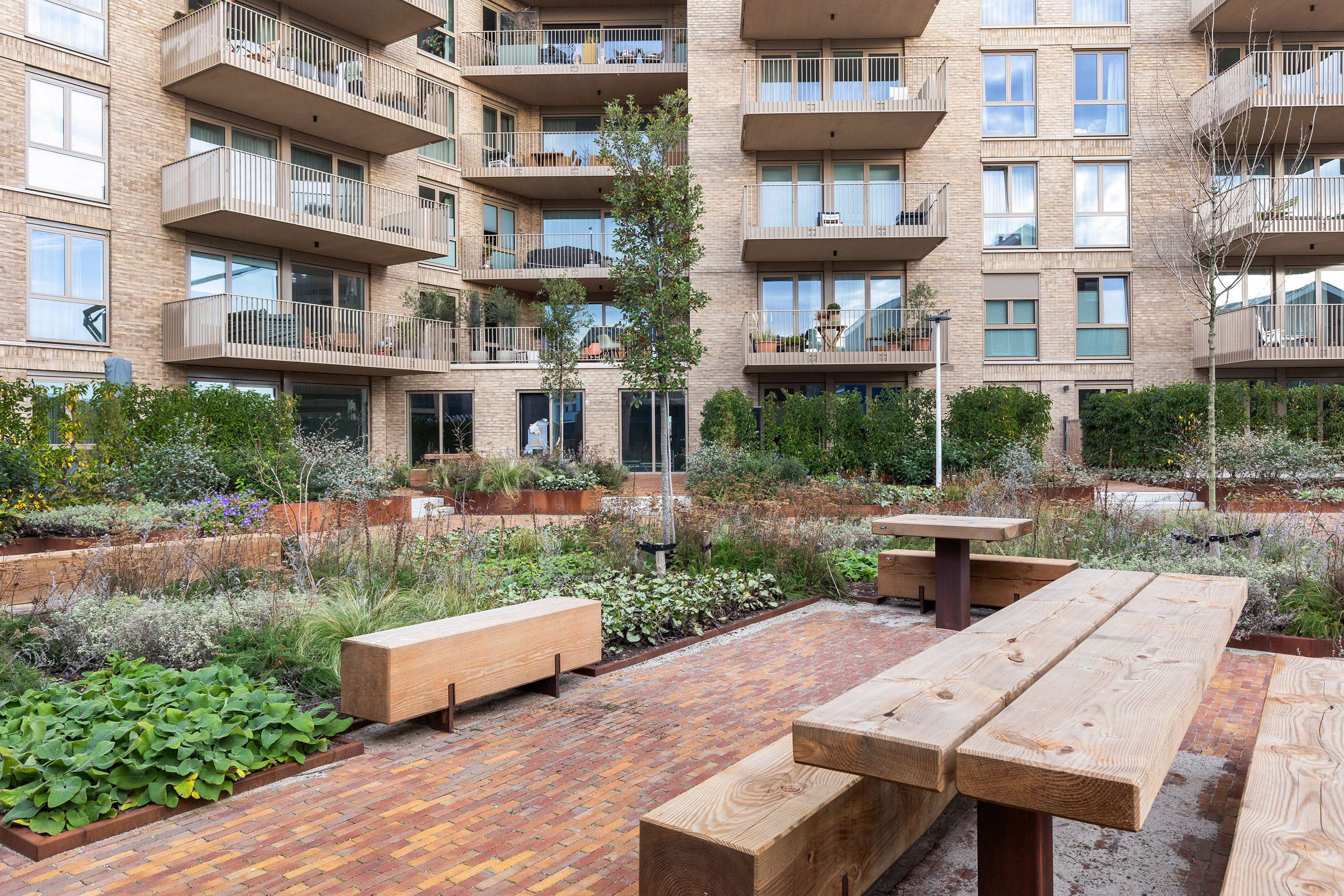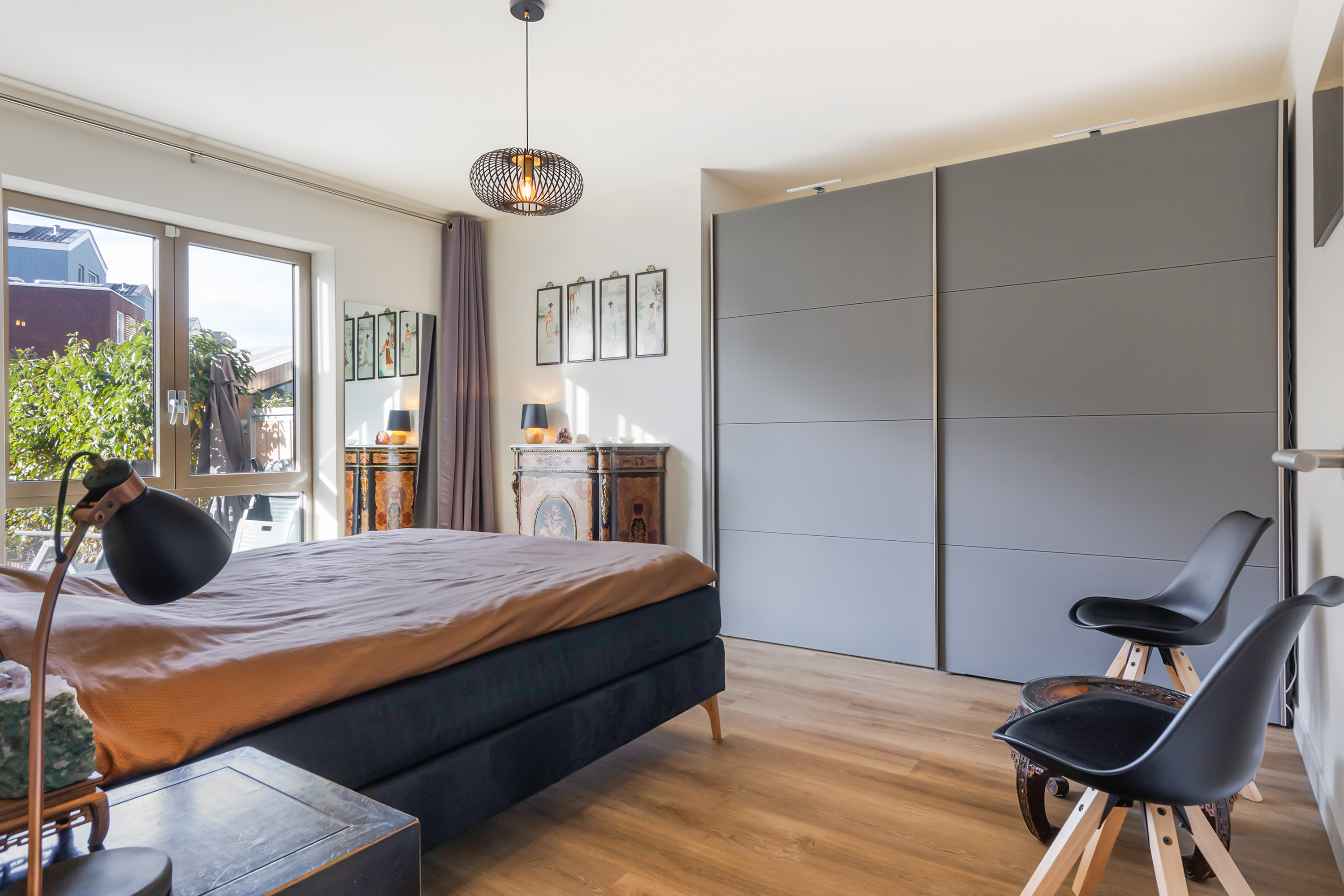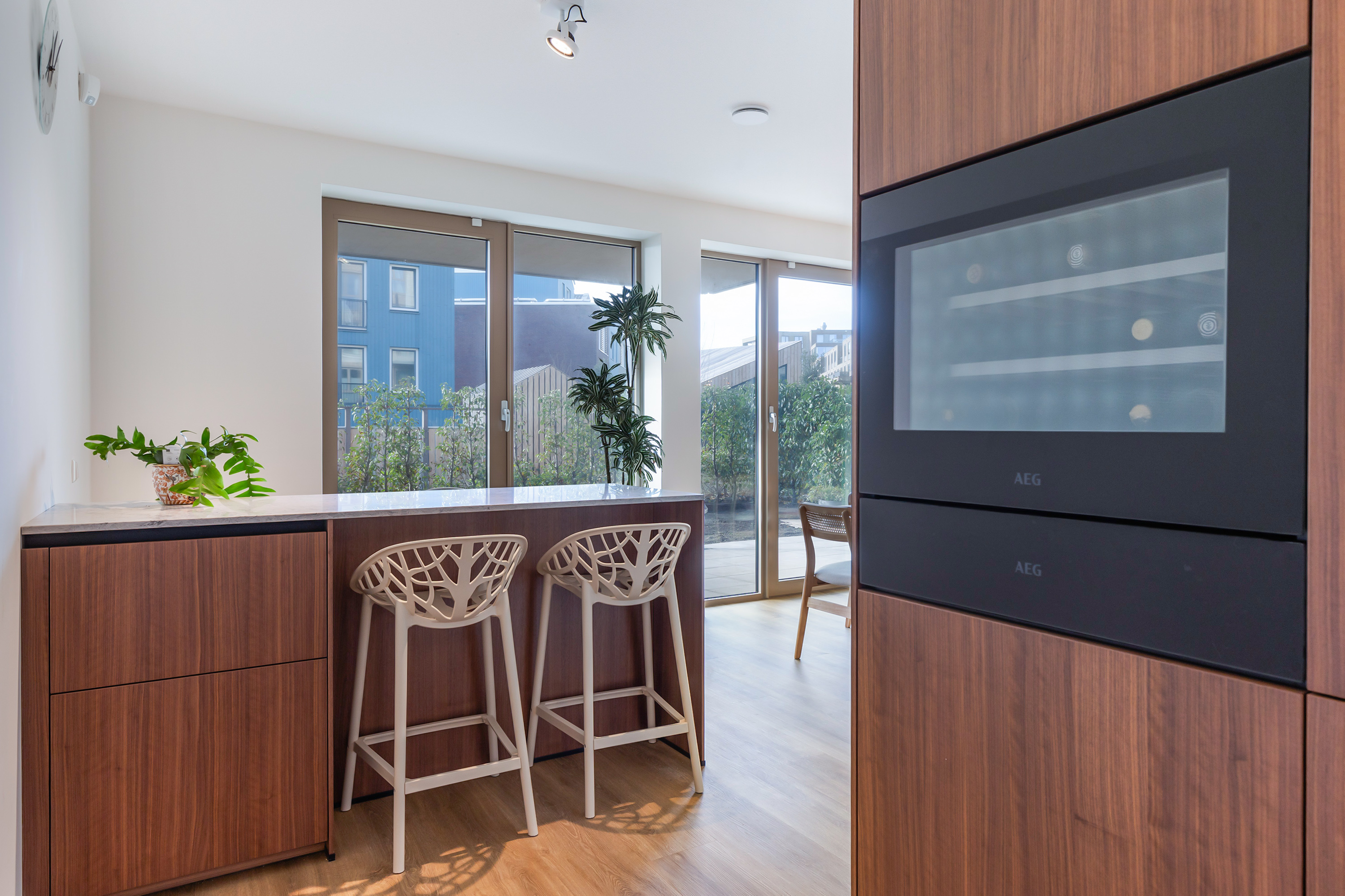 De twee openslaande deuren in de eetkamer geven toegang tot het zonneterras en de eigen tuin, ideaal voor een ochtendkoffie of zomeravond met vrienden. De tuin grenst aan de gezamenlijke binnentuin en biedt een groene beleving die je zelden vindt bij een appartement.