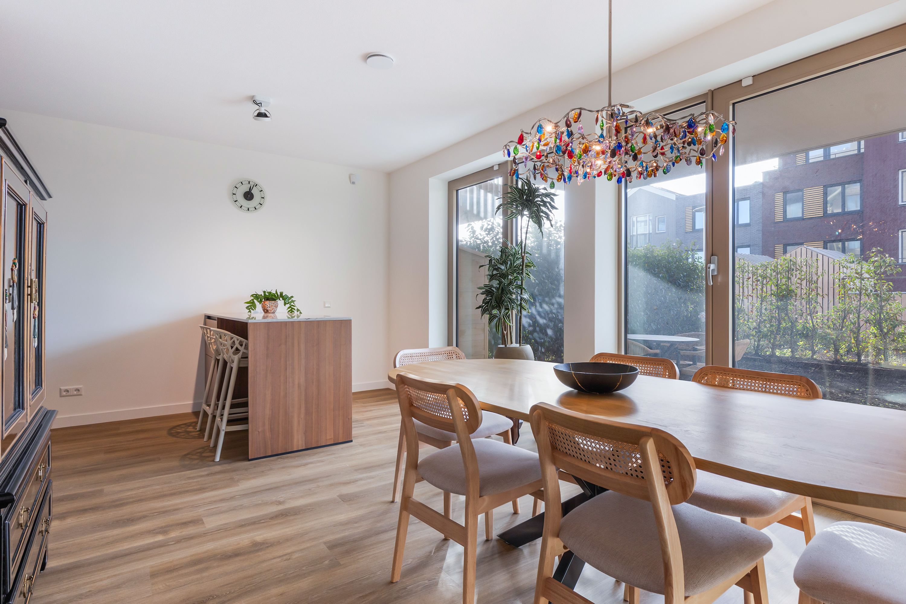 In de eetkamer staat een bijpassend keukeneiland met bergruimte en een bar voor twee barkrukken. Deze ruimte nodigt uit tot lange diners, gezellige avonden met gasten of een sfeervol ontbijt met zicht op de tuin. Dankzij de royale afmetingen past hier moeiteloos een grote eettafel.