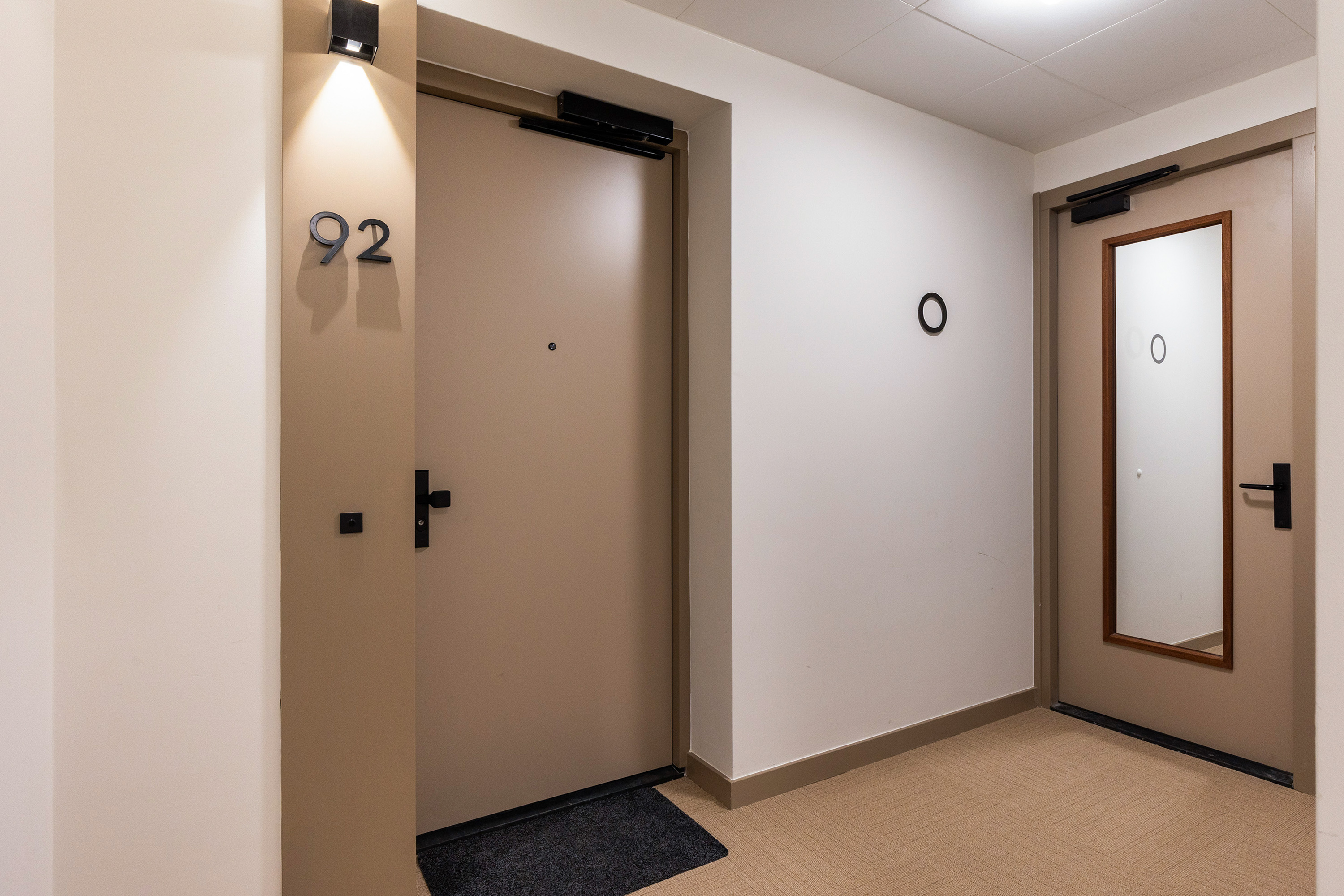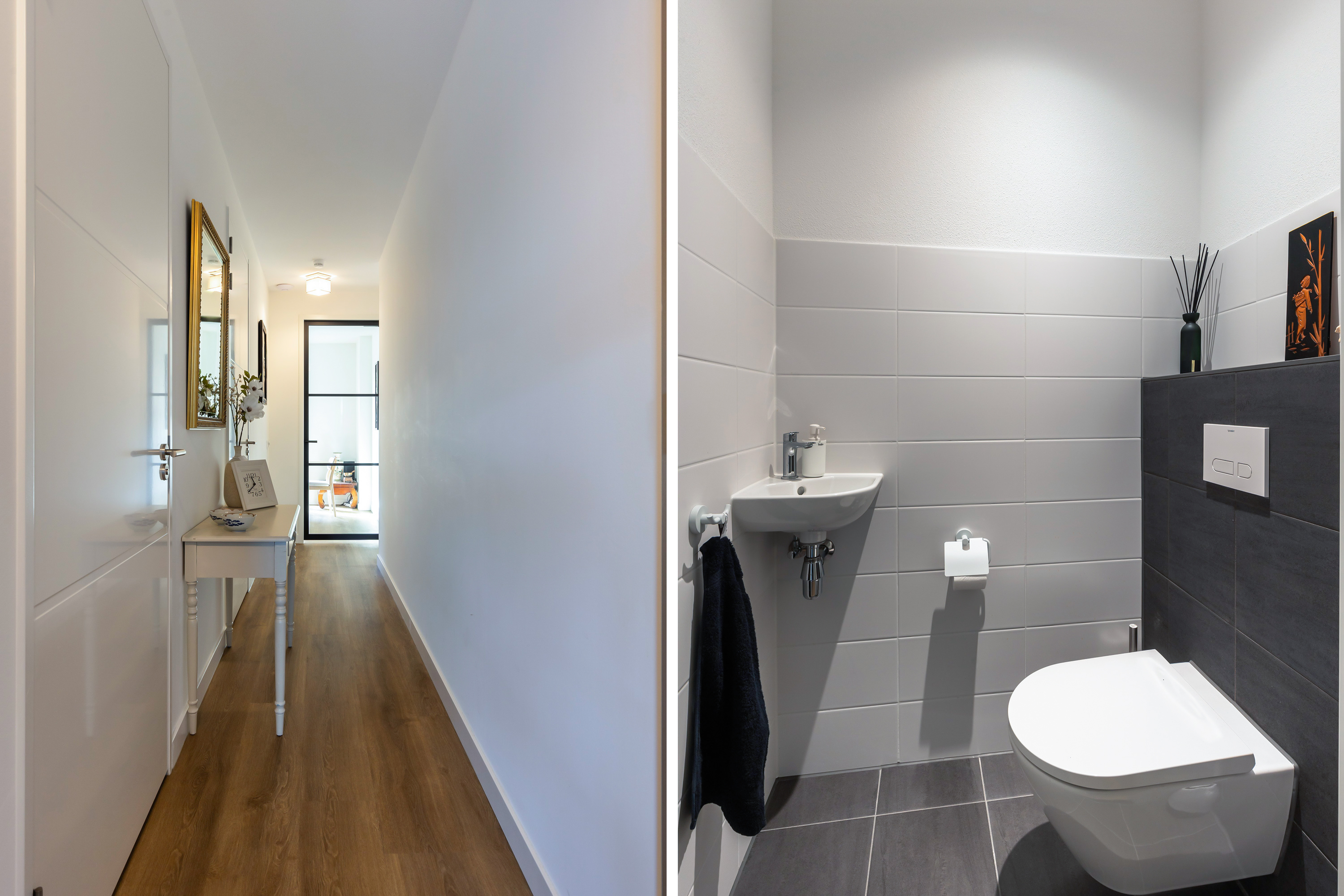 De leefruimtes liggen rondom de centrale hal, van waaruit de berging, het toilet, de badkamer en de hoofdslaapkamer met kastenwand toegankelijk zijn. De tweede slaapkamer ligt aan de voorzijde naast de woonkamer en is ingericht als werk- en logeerkamer. Twee deuren met glas verbinden de living en de eetkamer op elegante wijze met de hal, waardoor de ruimtes licht, open en uitnodigend aanvoelen.