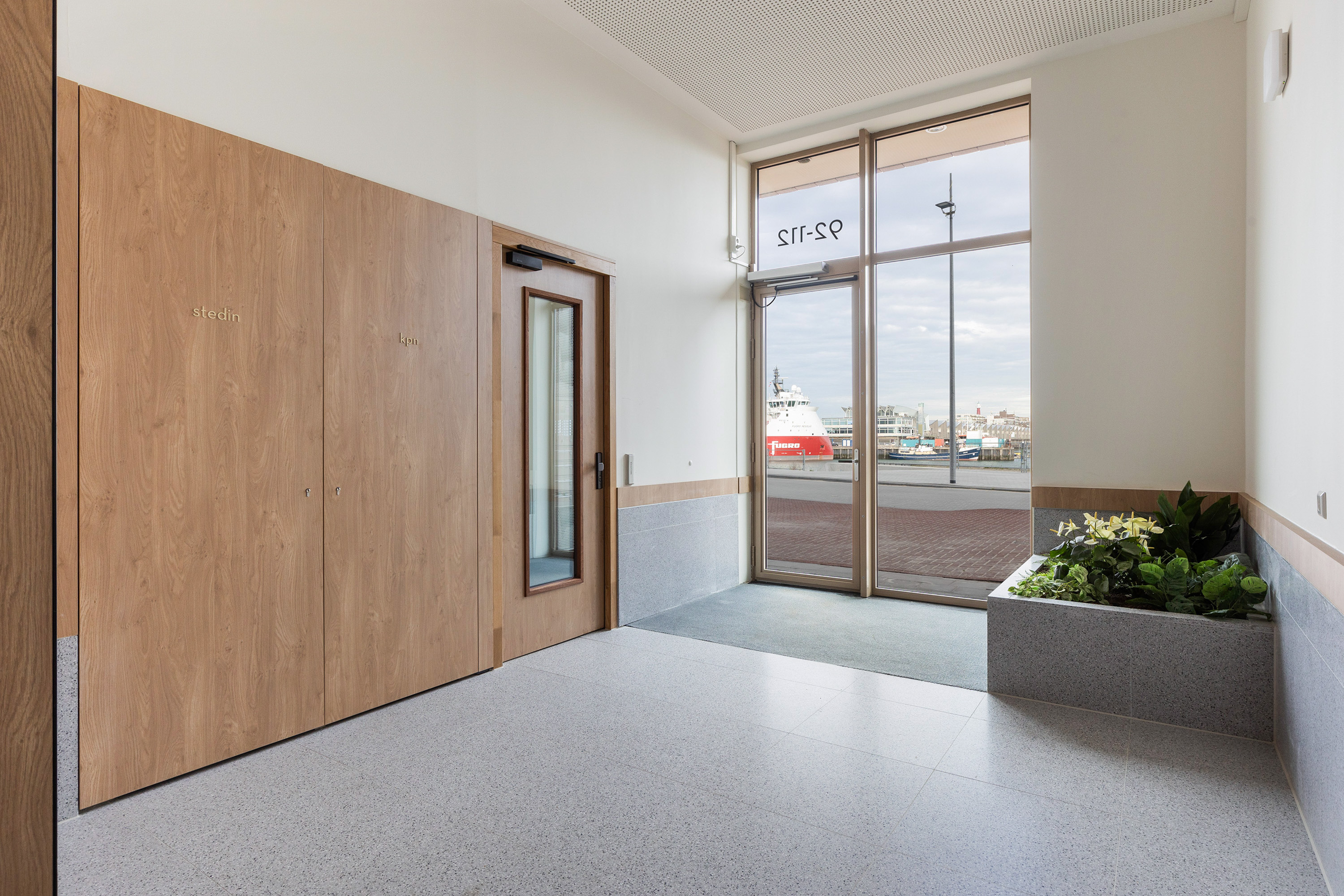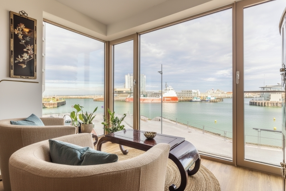 De living met hoekerker voorzien van Franse balkons is gericht op de haven en de zee. Door de hoekligging en het royale glasoppervlak ontstaat een panoramisch uitzicht dat de hele dag door verandert. De living biedt royale mogelijkheden voor een comfortabele loungeopstelling, bijvoorbeeld een grote hoekbank gecombineerd met een paar heerlijke fauteuils met rondom de erkerramen. Het uitzicht vormt daarbij het levende kunstwerk dat de ruimte continu sfeer geeft.