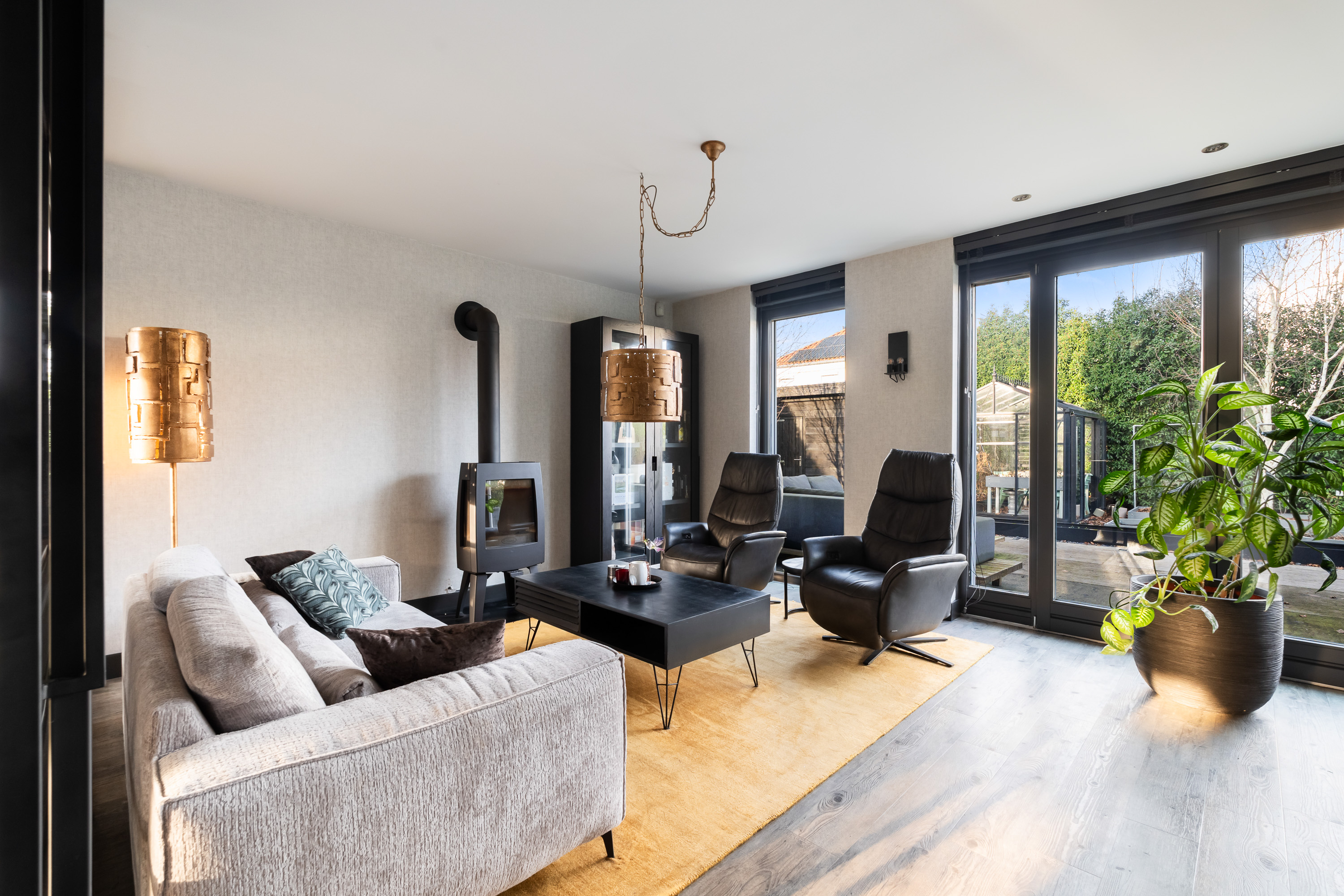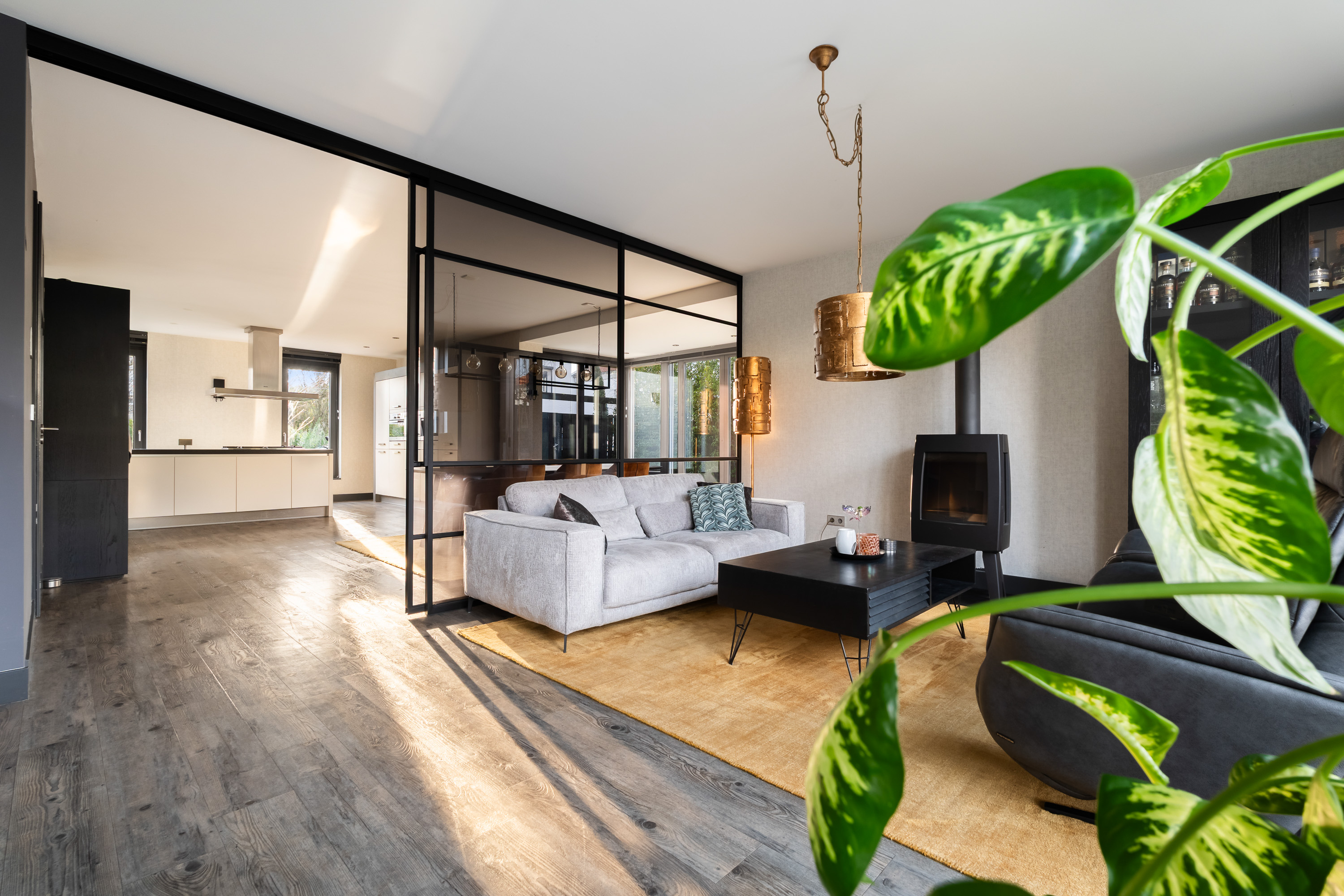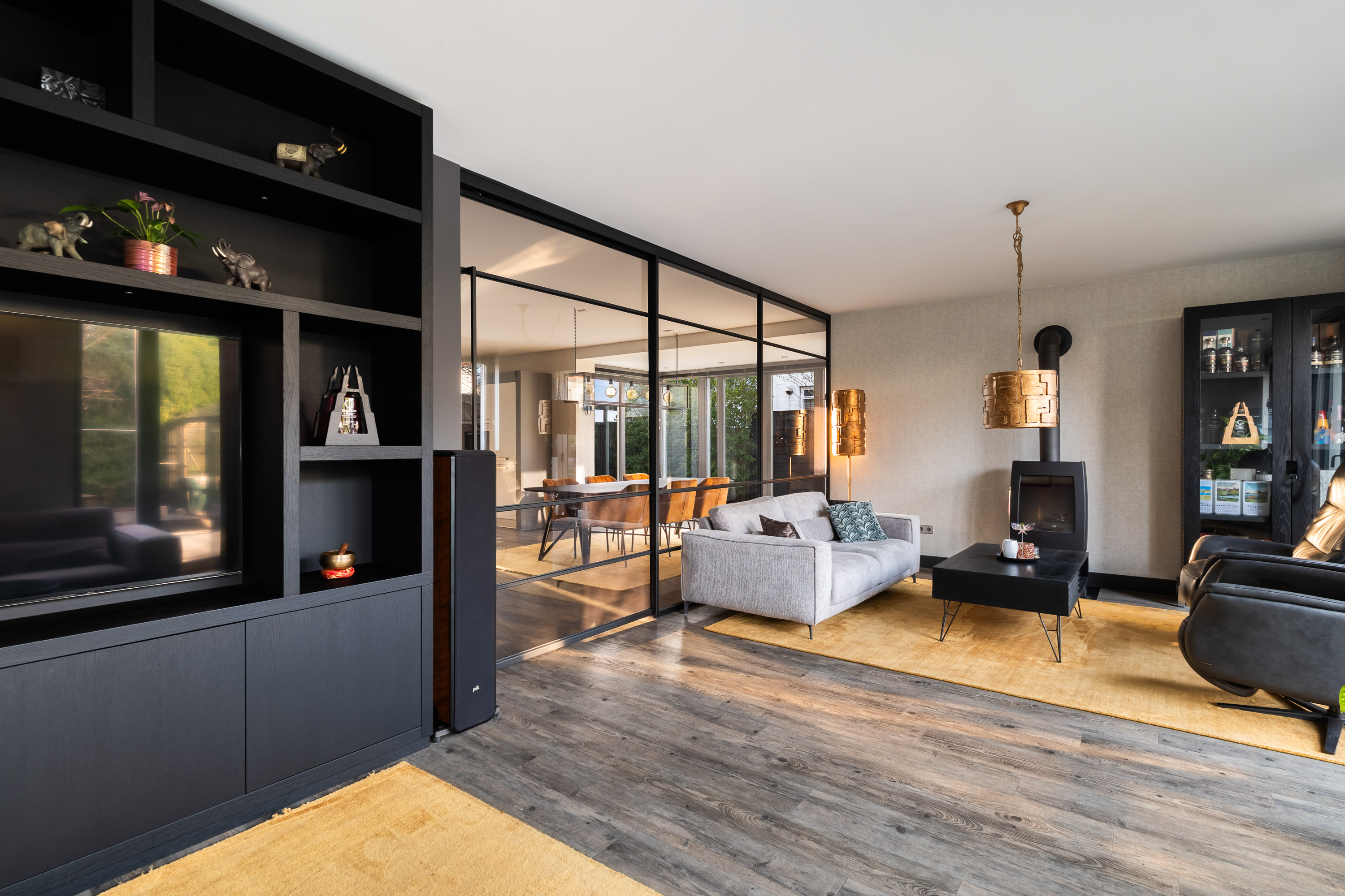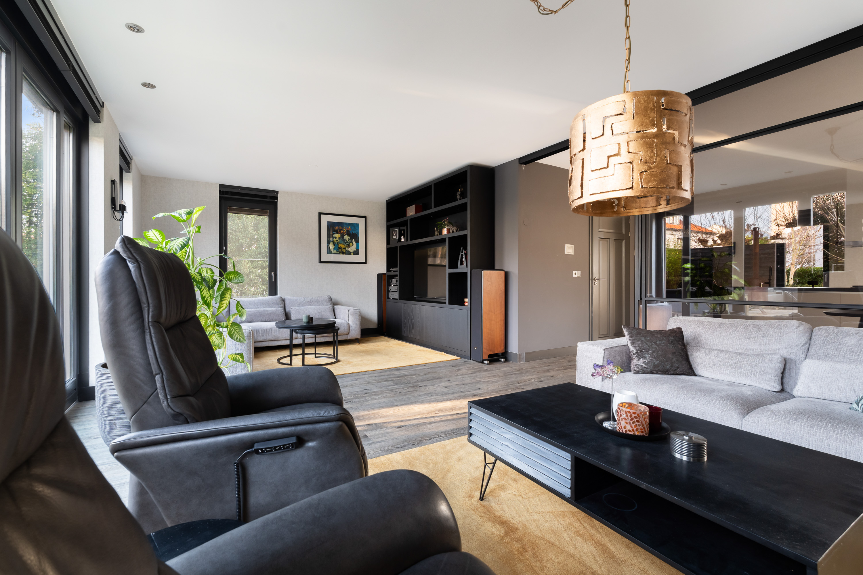 De woonkamer is royaal opgezet en heerlijk licht. Een absolute eyecatcher is de glazen schuifwand met gerookt glas, waarmee de woonkamer op stijlvolle wijze wordt gescheiden van de tv- en leeskamer. Deze wand biedt extra privacy zonder afbreuk te doen aan het open karakter van de leefruimte.