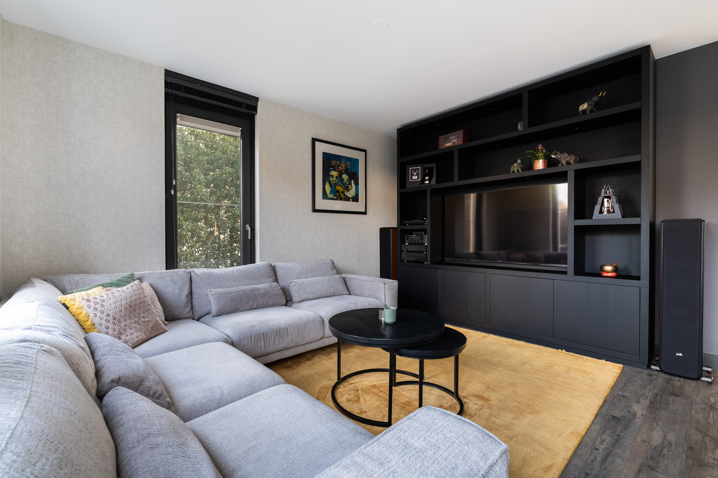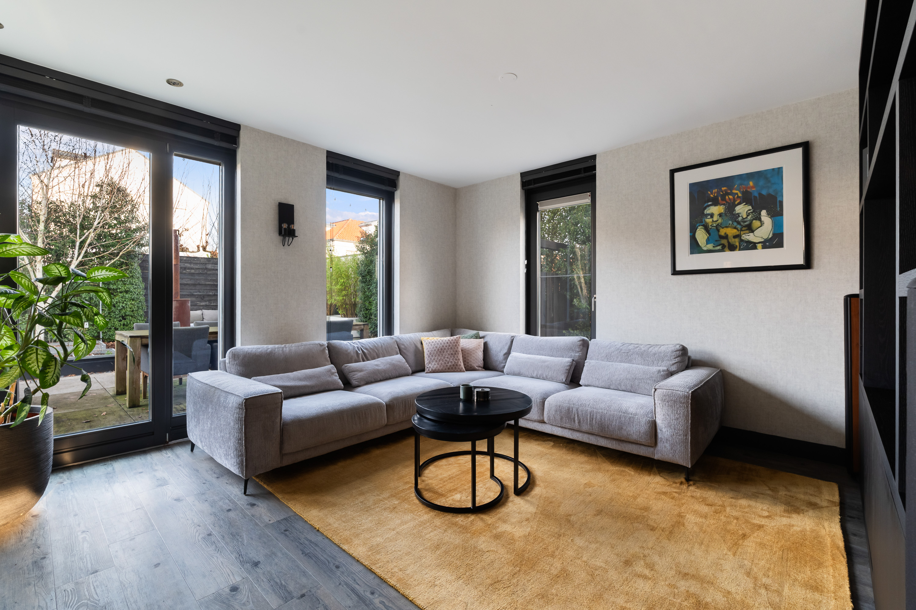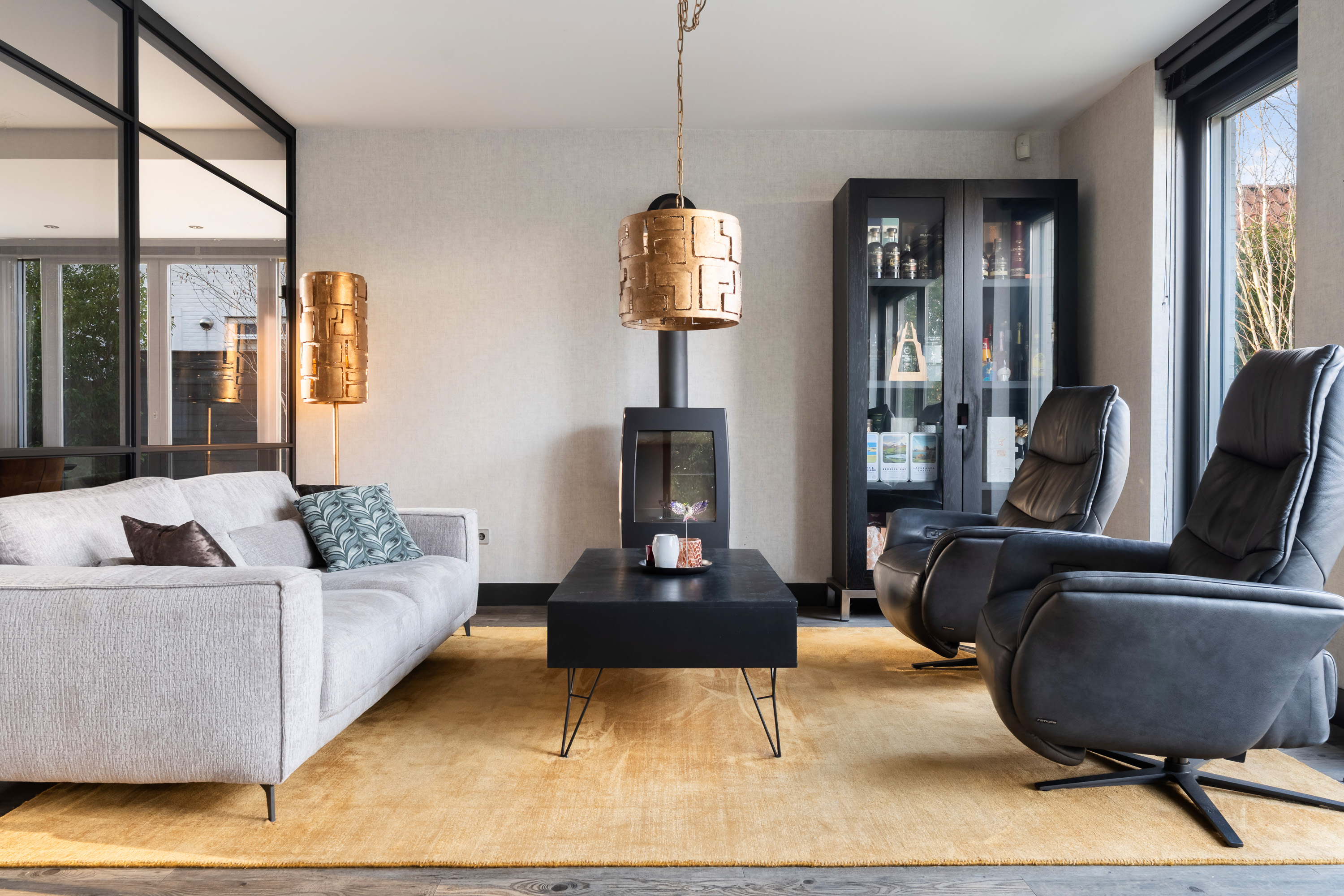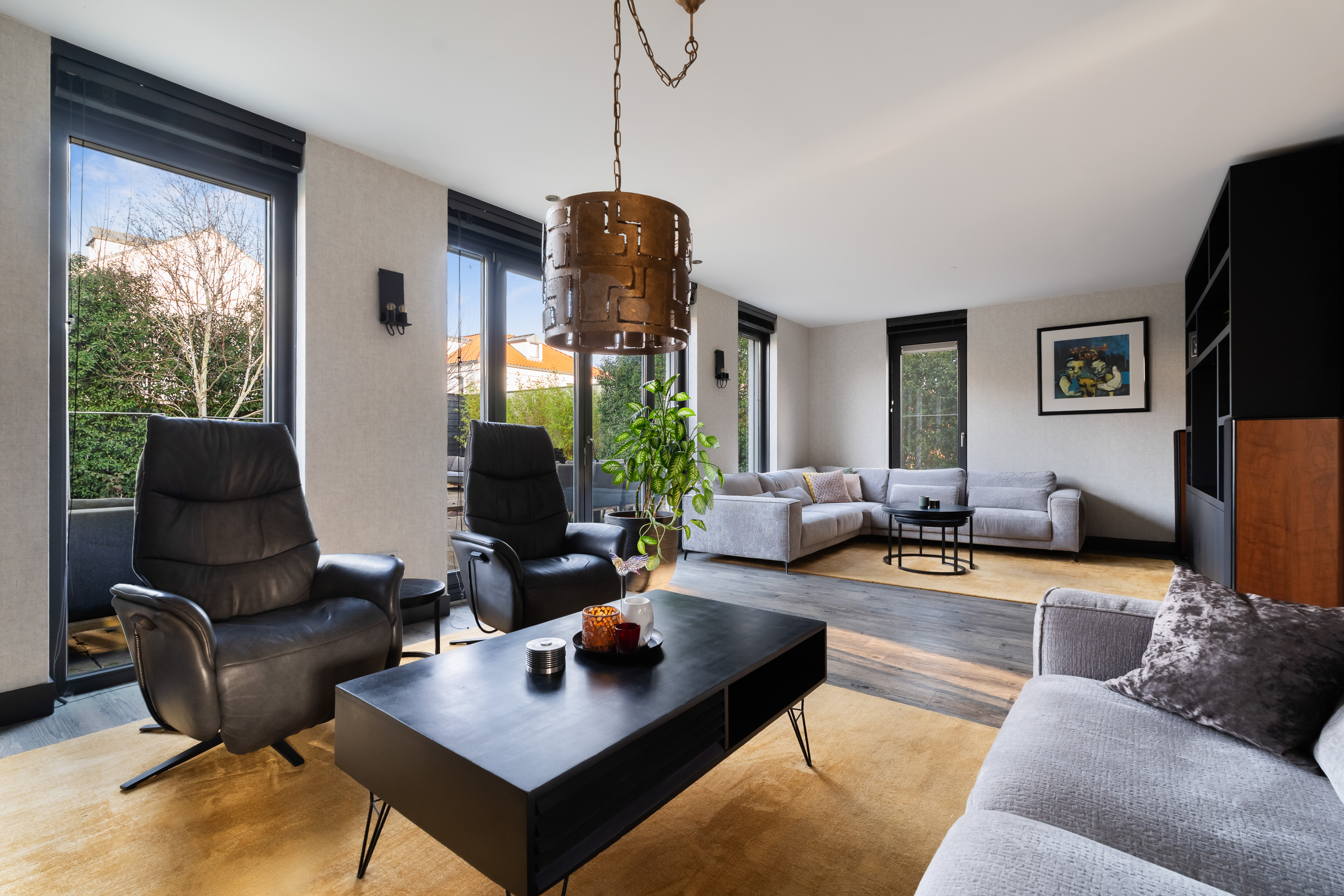 De woonkamer is royaal opgezet en heerlijk licht. Een absolute eyecatcher is de glazen schuifwand met gerookt glas, waarmee de woonkamer op stijlvolle wijze wordt gescheiden van de tv- en leeskamer. Deze wand biedt extra privacy zonder afbreuk te doen aan het open karakter van de leefruimte.