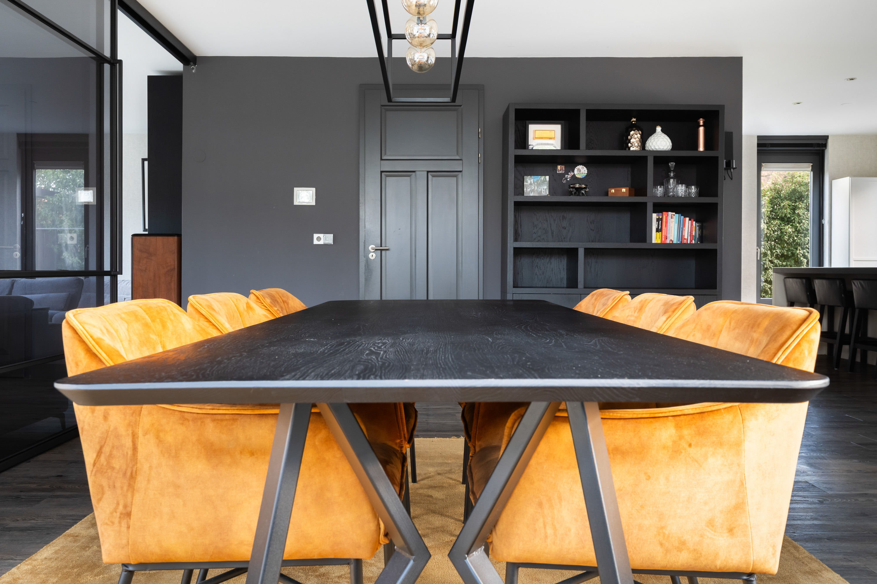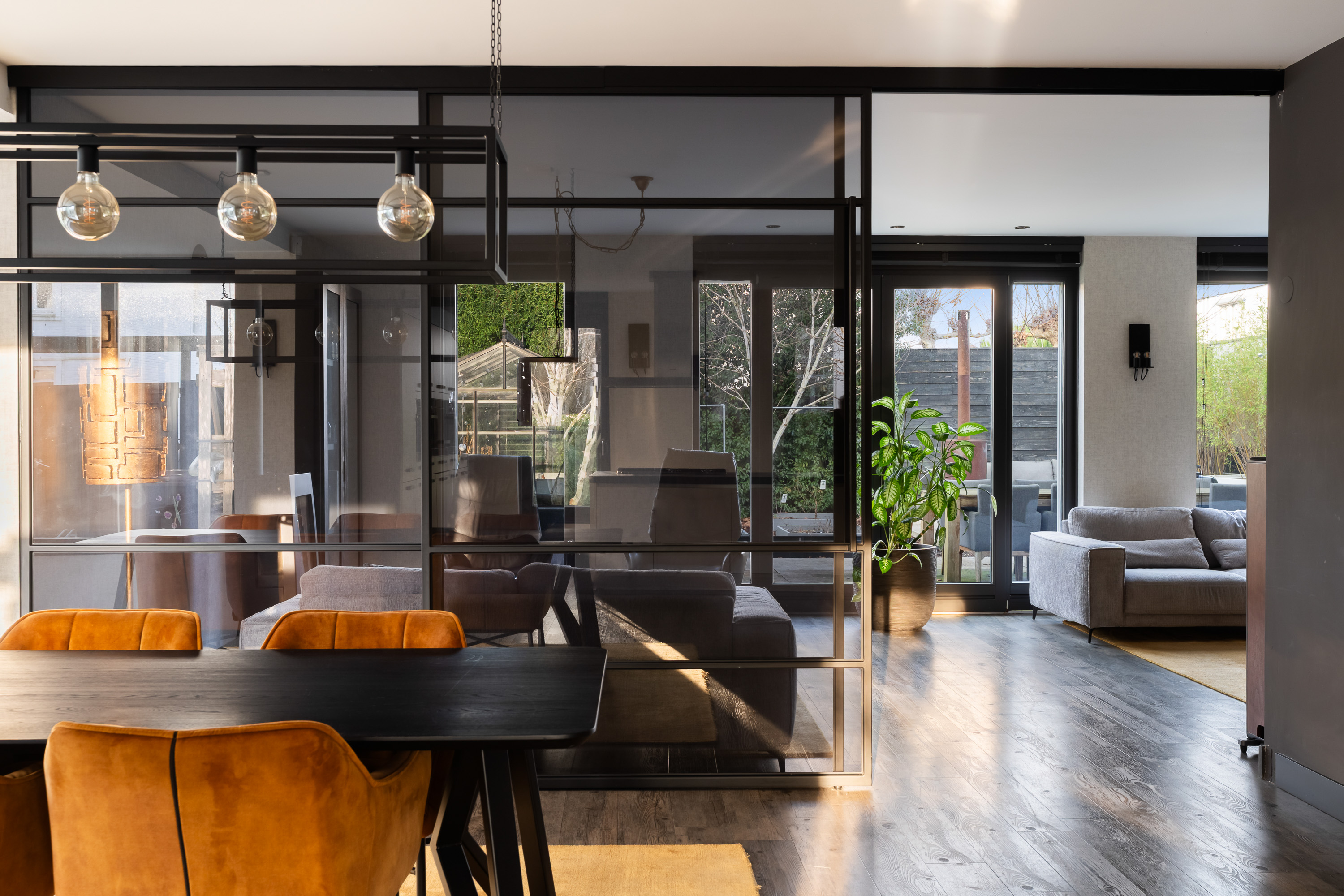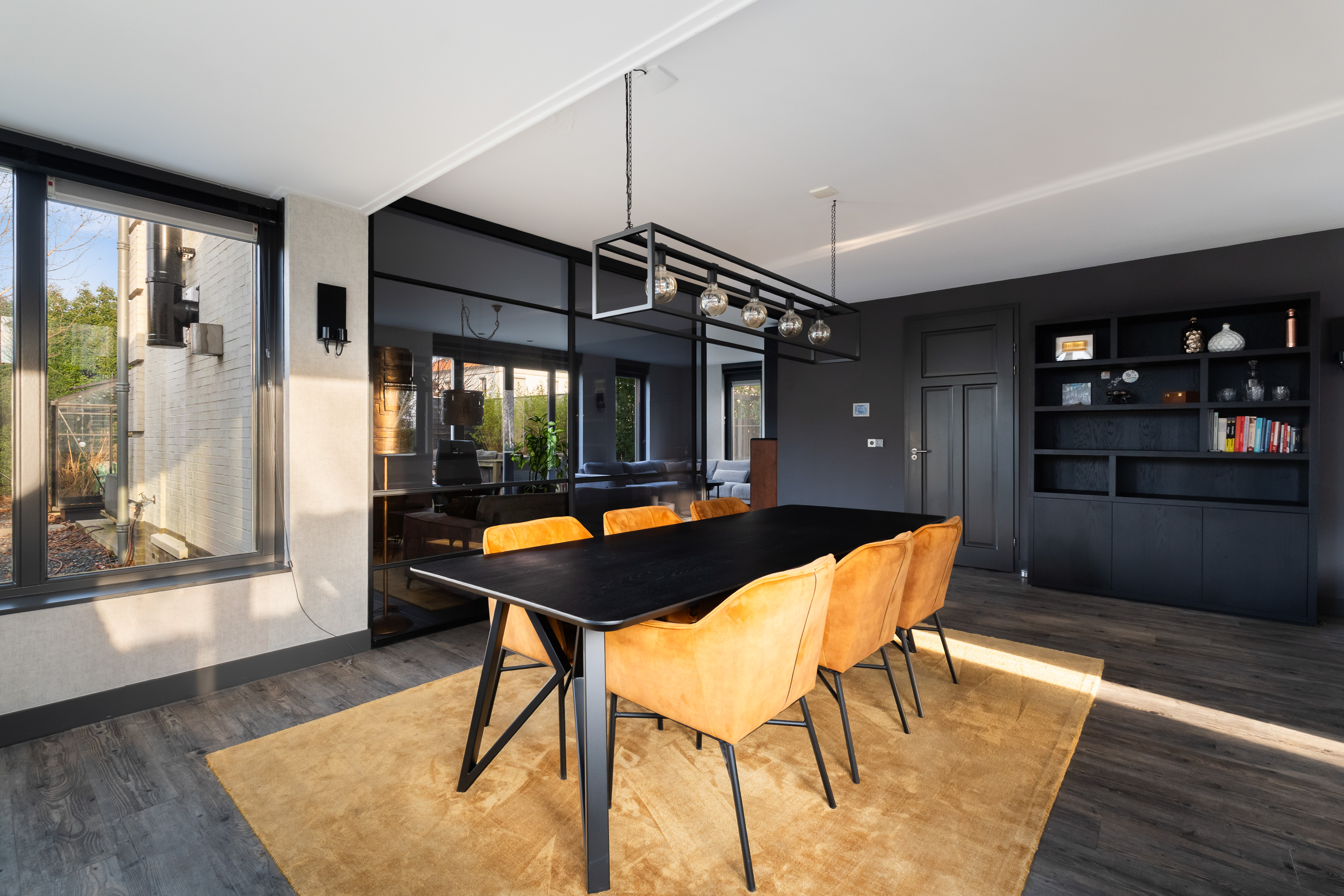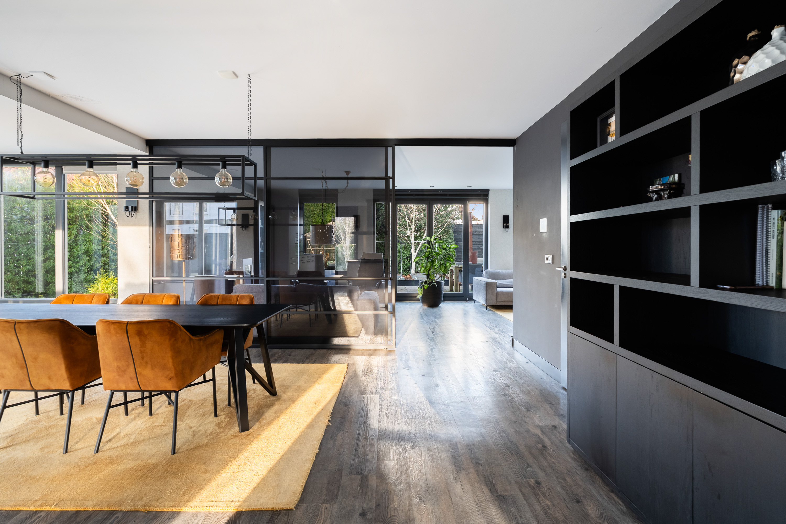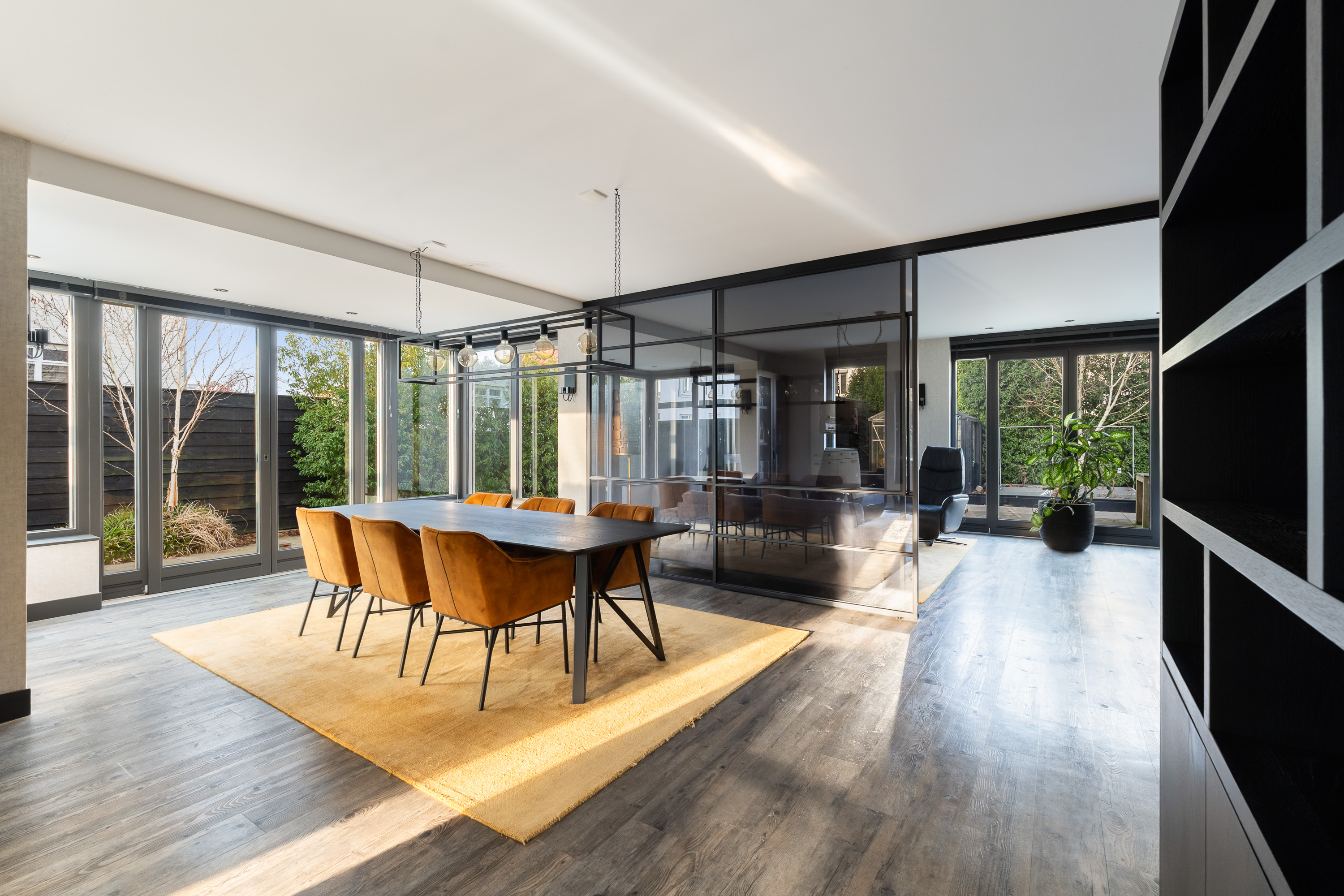 - Glazen schuifwand met gerookt glas tussen woon- en leeskamer