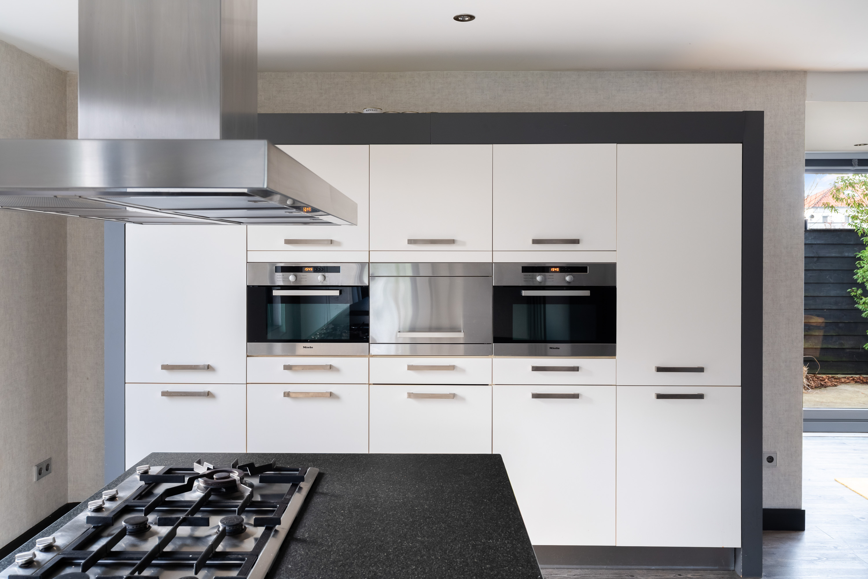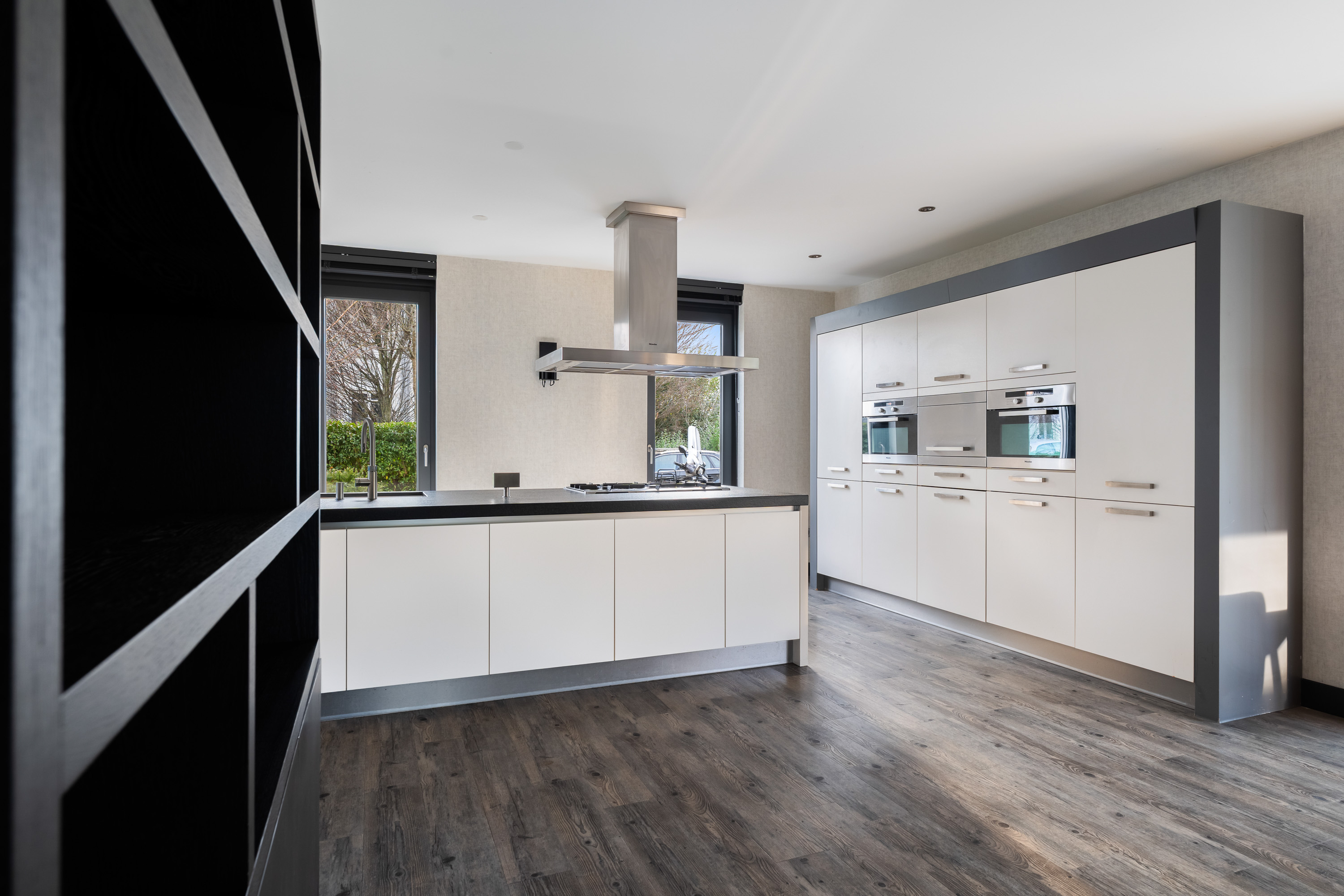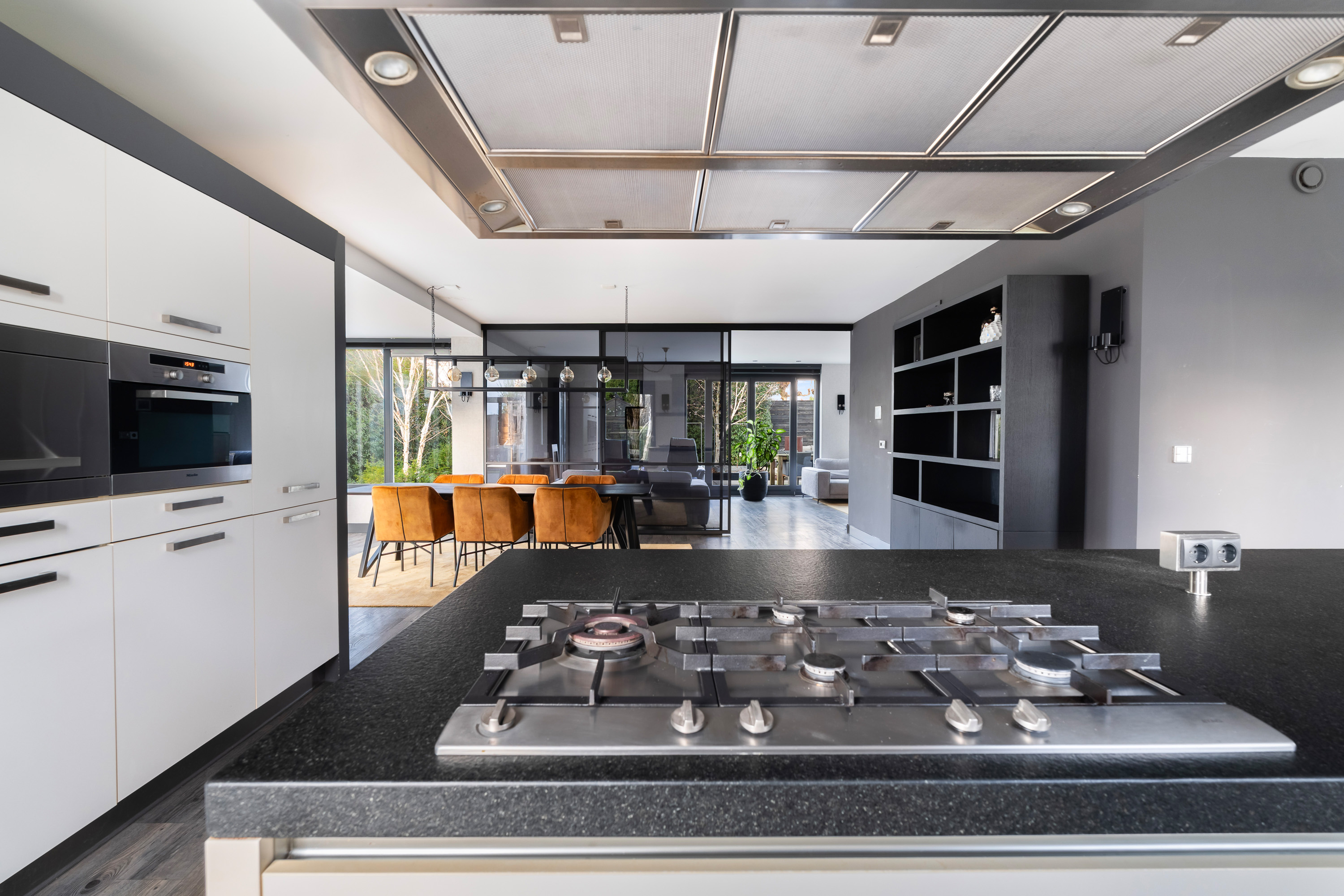 De luxe woonkeuken vormt het hart van de woning. Het grote kook- en ziteiland met uniek werkblad nodigt uit tot uitgebreid koken, gezellige ontbijtjes en lange avonden tafelen. De keuken is uitgerust met hoogwaardige Miele-inbouwapparatuur, waaronder twee combi-ovens, een stoomoven, een 5-pits gasfornuis met wokbrander, een vaatwasser en twee koel-vriescombinaties.