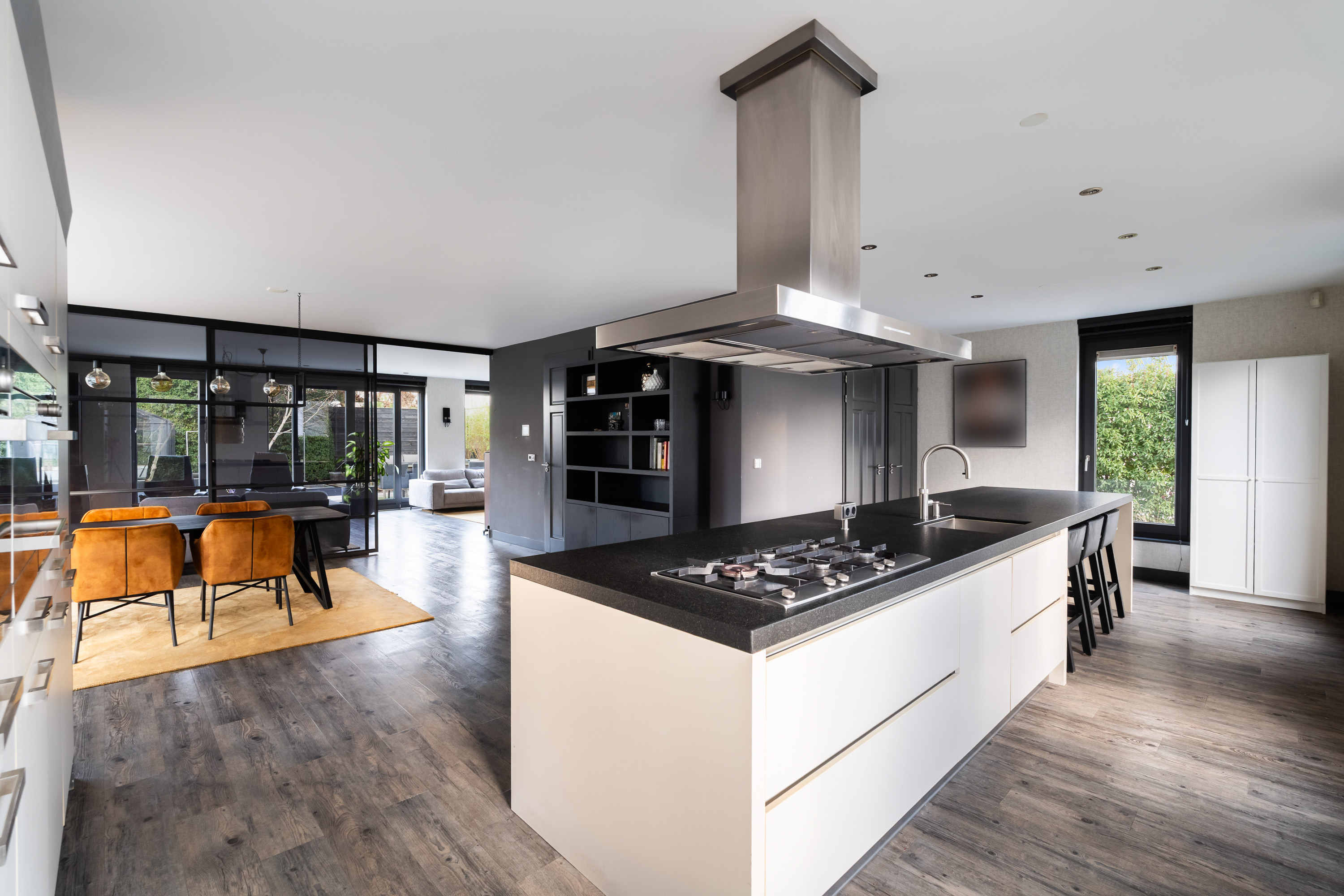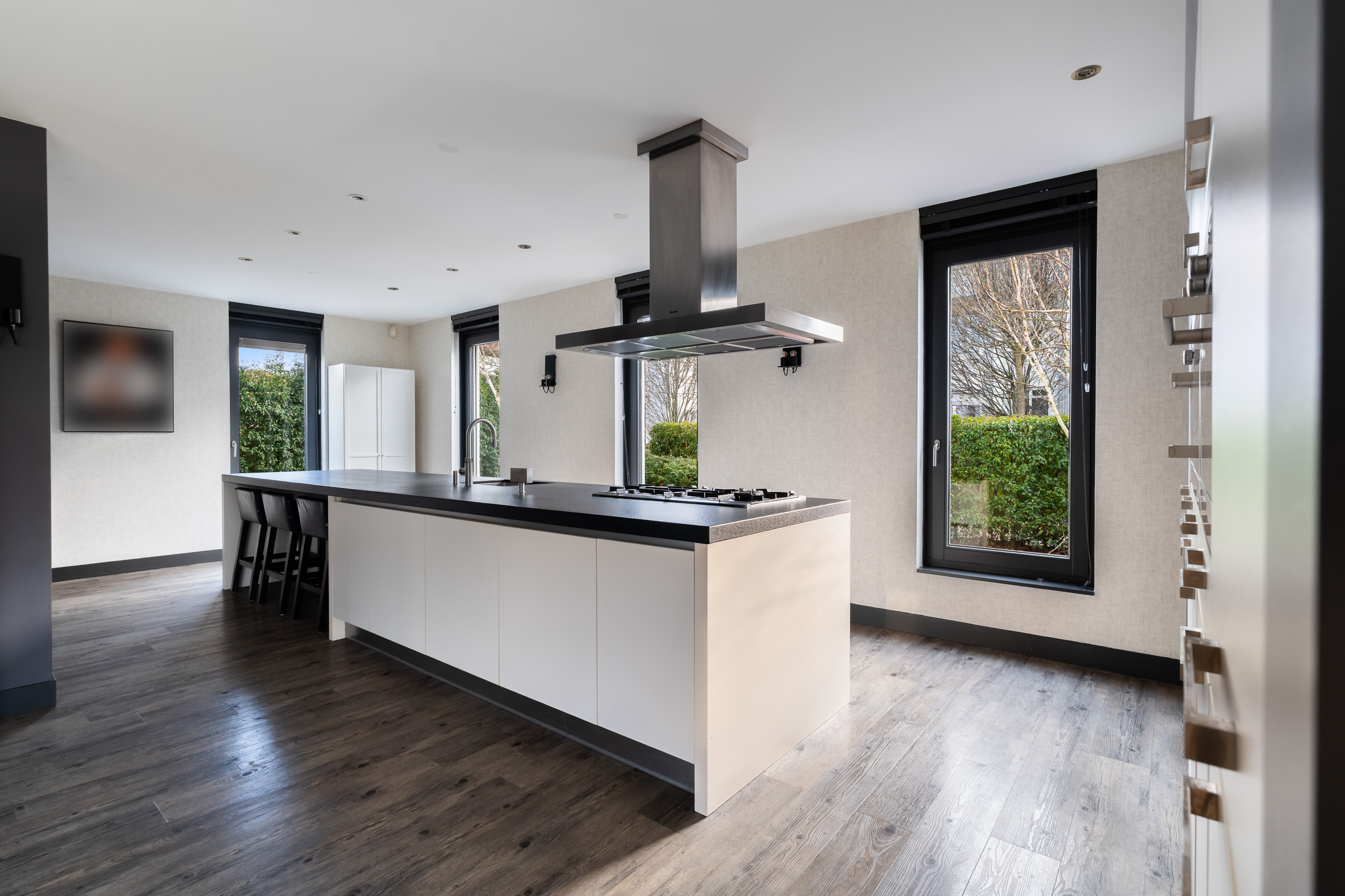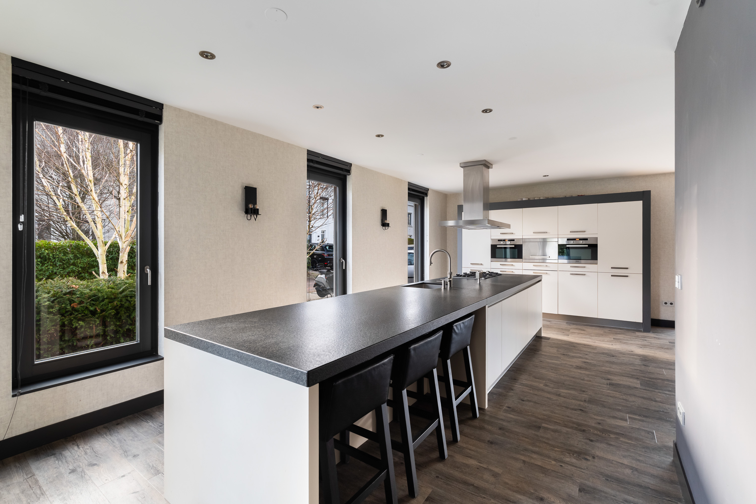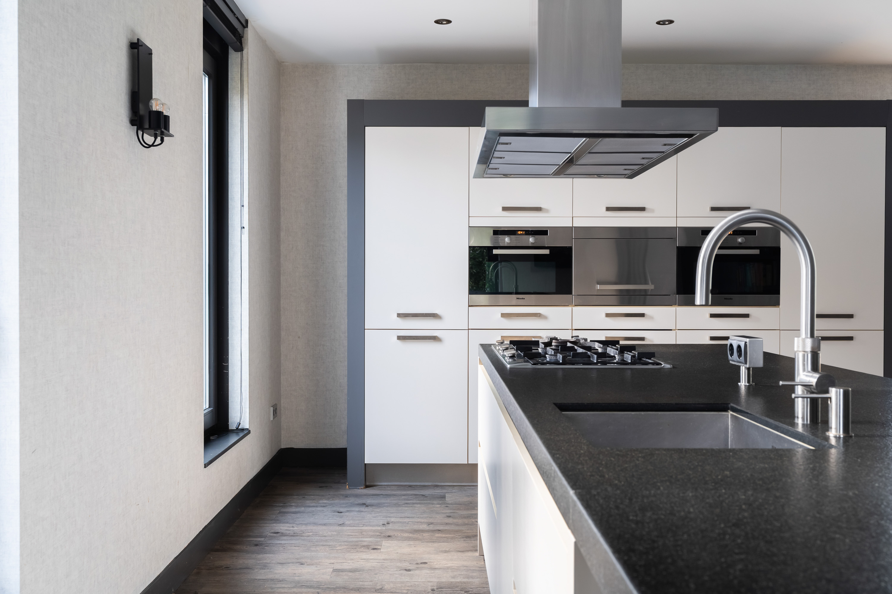 De luxe woonkeuken vormt het hart van de woning. Het grote kook- en ziteiland met uniek werkblad nodigt uit tot uitgebreid koken, gezellige ontbijtjes en lange avonden tafelen. De keuken is uitgerust met hoogwaardige Miele-inbouwapparatuur, waaronder twee combi-ovens, een stoomoven, een 5-pits gasfornuis met wokbrander, een vaatwasser en twee koel-vriescombinaties.