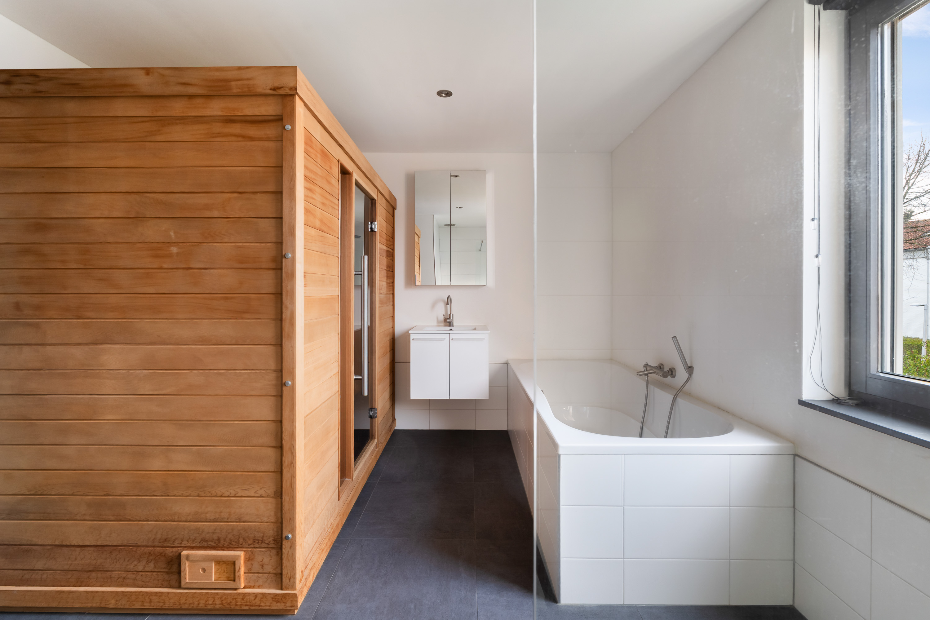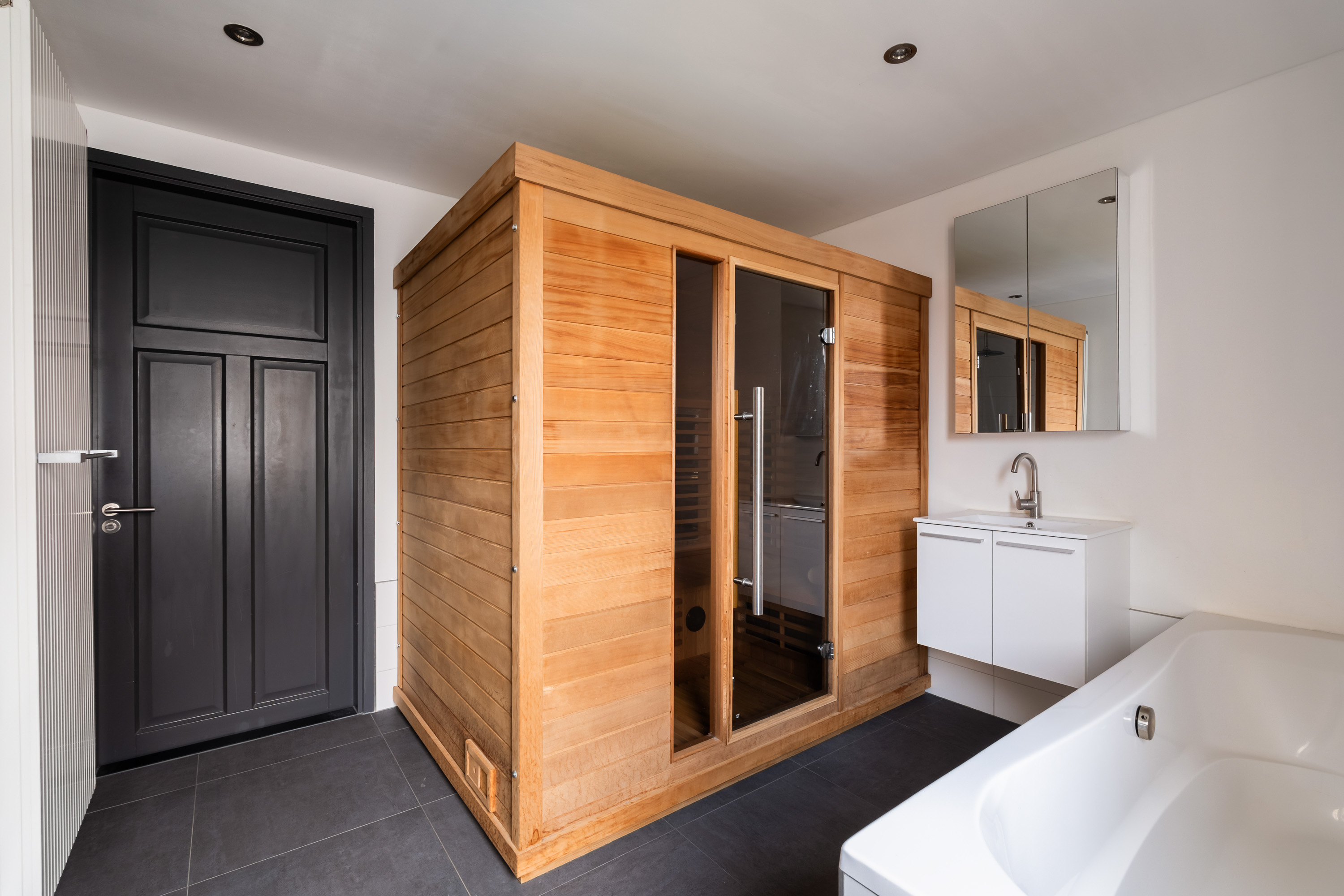 De badkamer is uitgevoerd als een luxe wellnessruimte. Je beschikt hier over een ligbad, een ruime inloopdouche met regendouche, een grote Finse sauna met infraroodfunctie en een wastafelmeubel met spiegelkast en extra opbergruimte. Een heerlijke plek om volledig tot rust te komen.